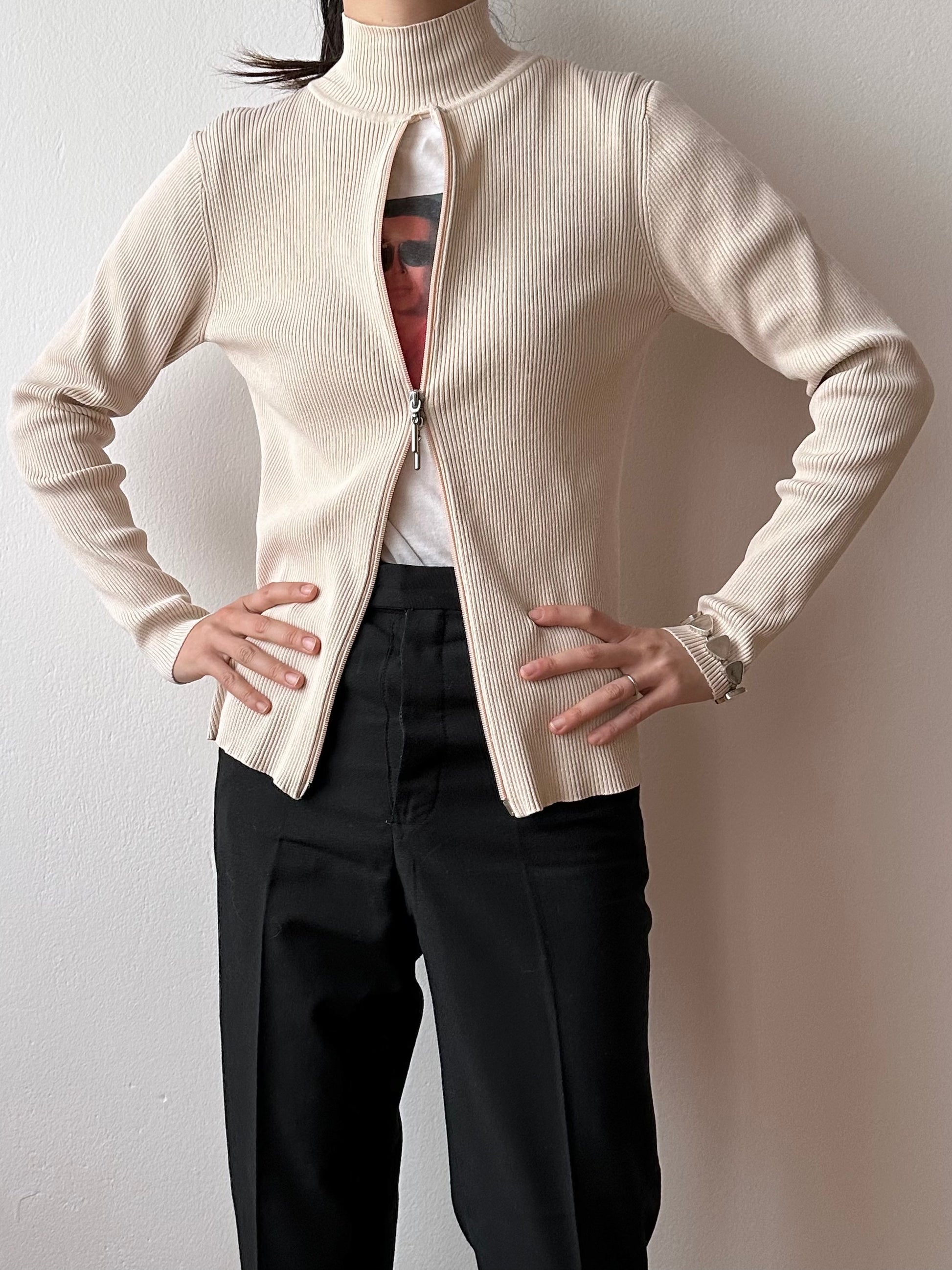 上から下から開くジップが可愛いスタンドカラーのカットソー。
