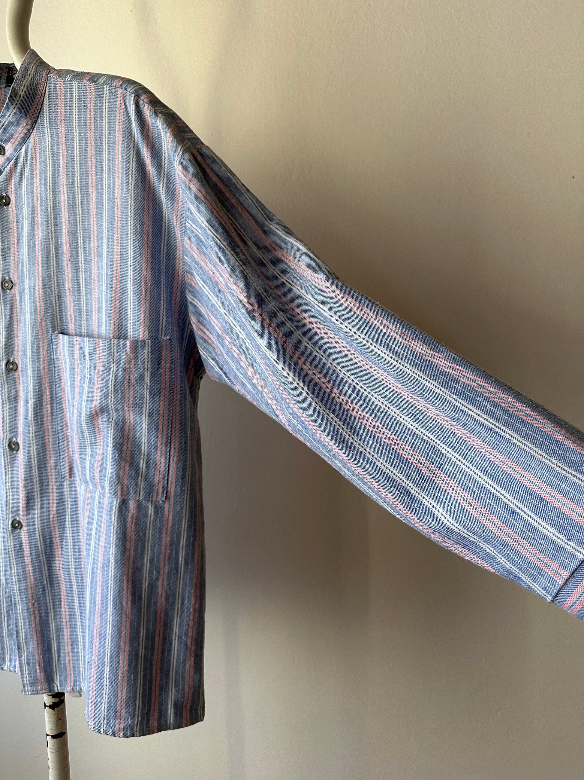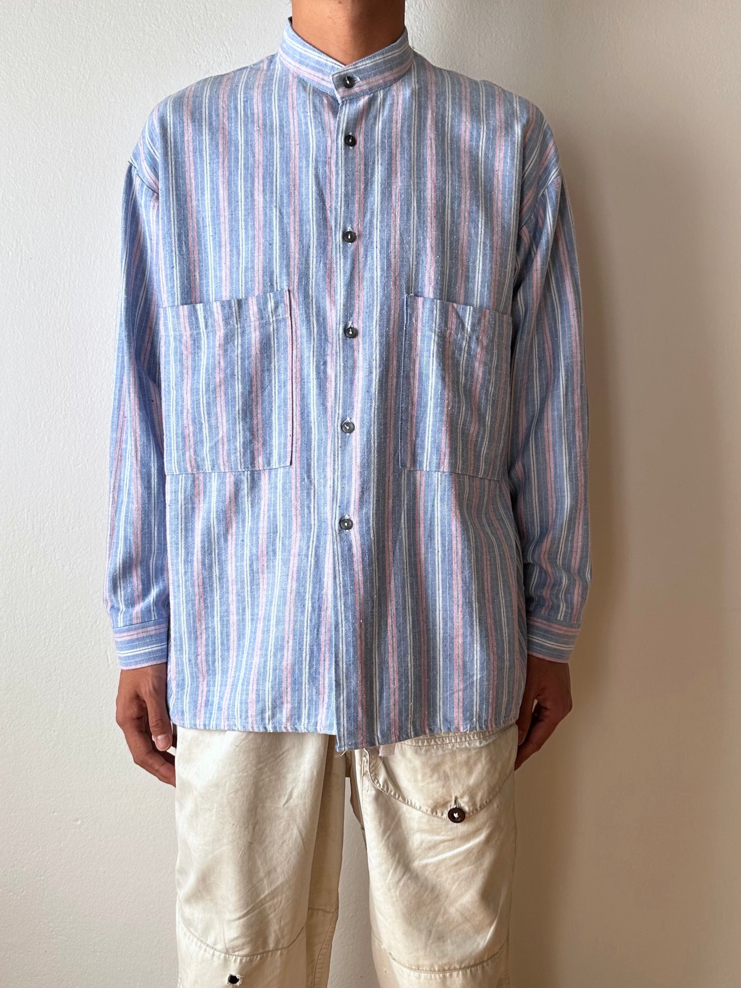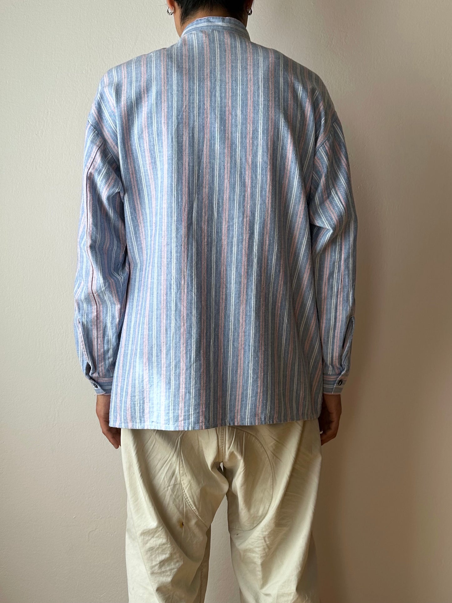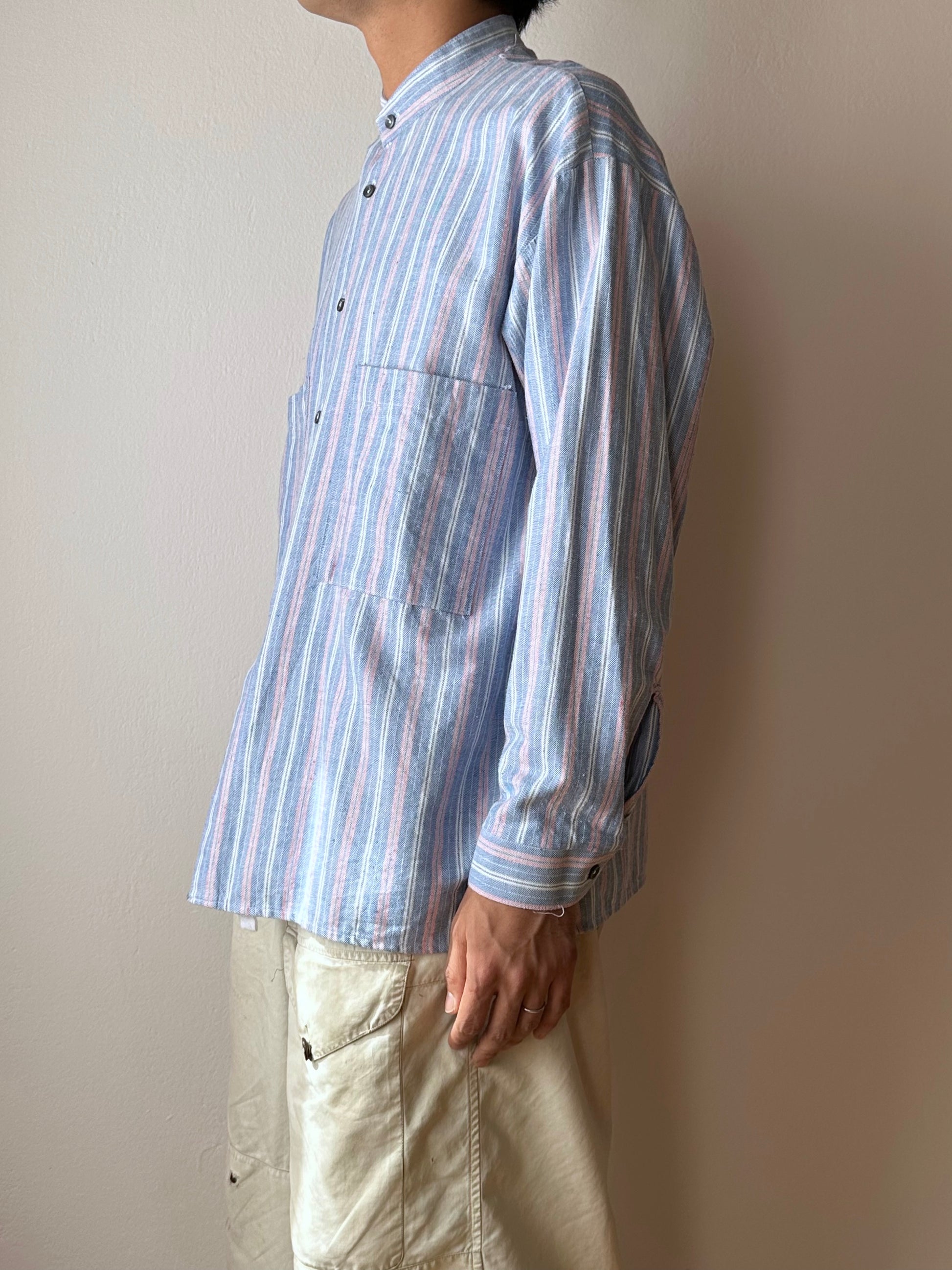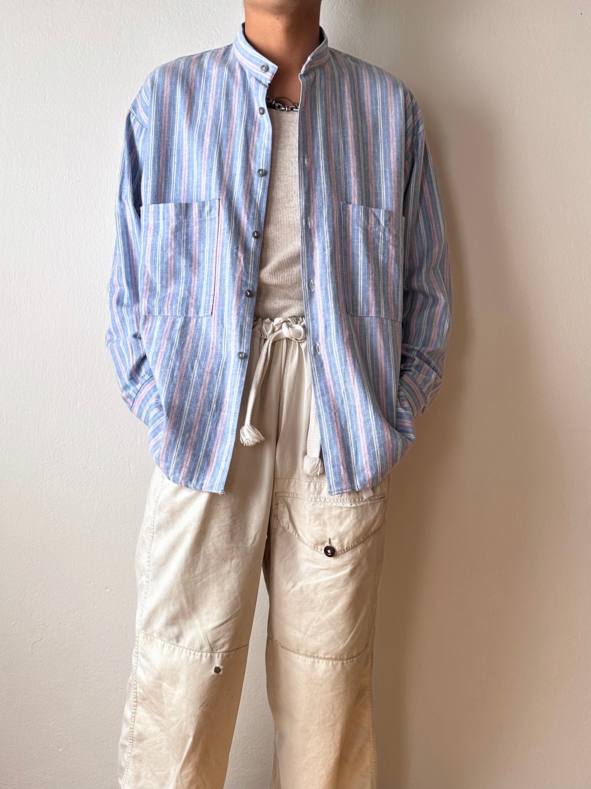 ノーカラーの身幅大きめのシャツ。