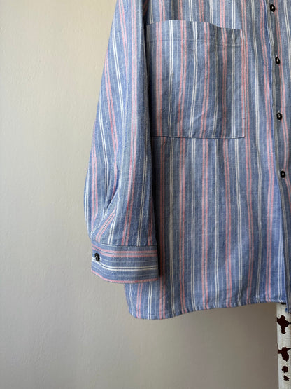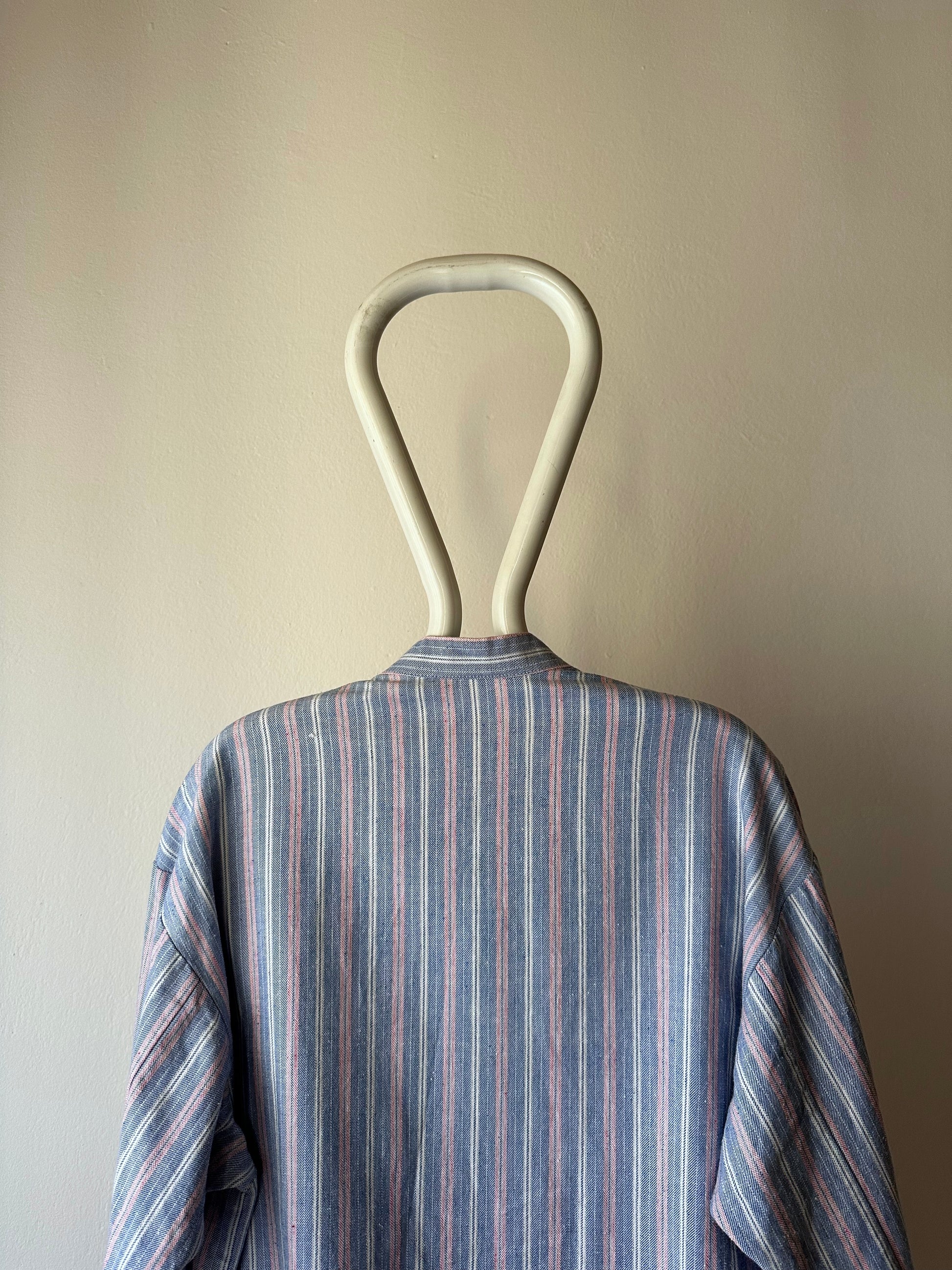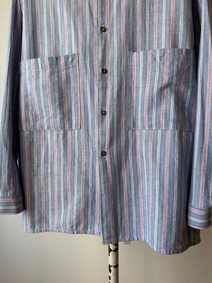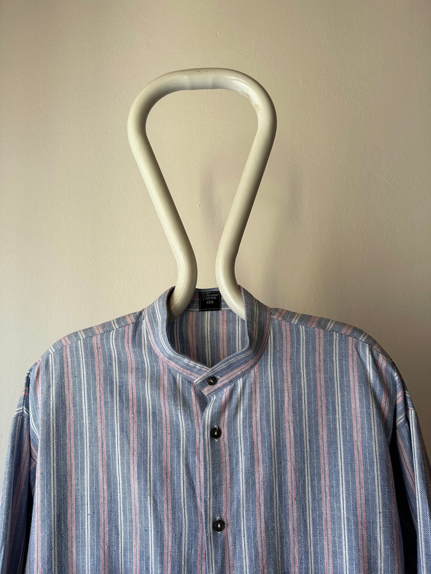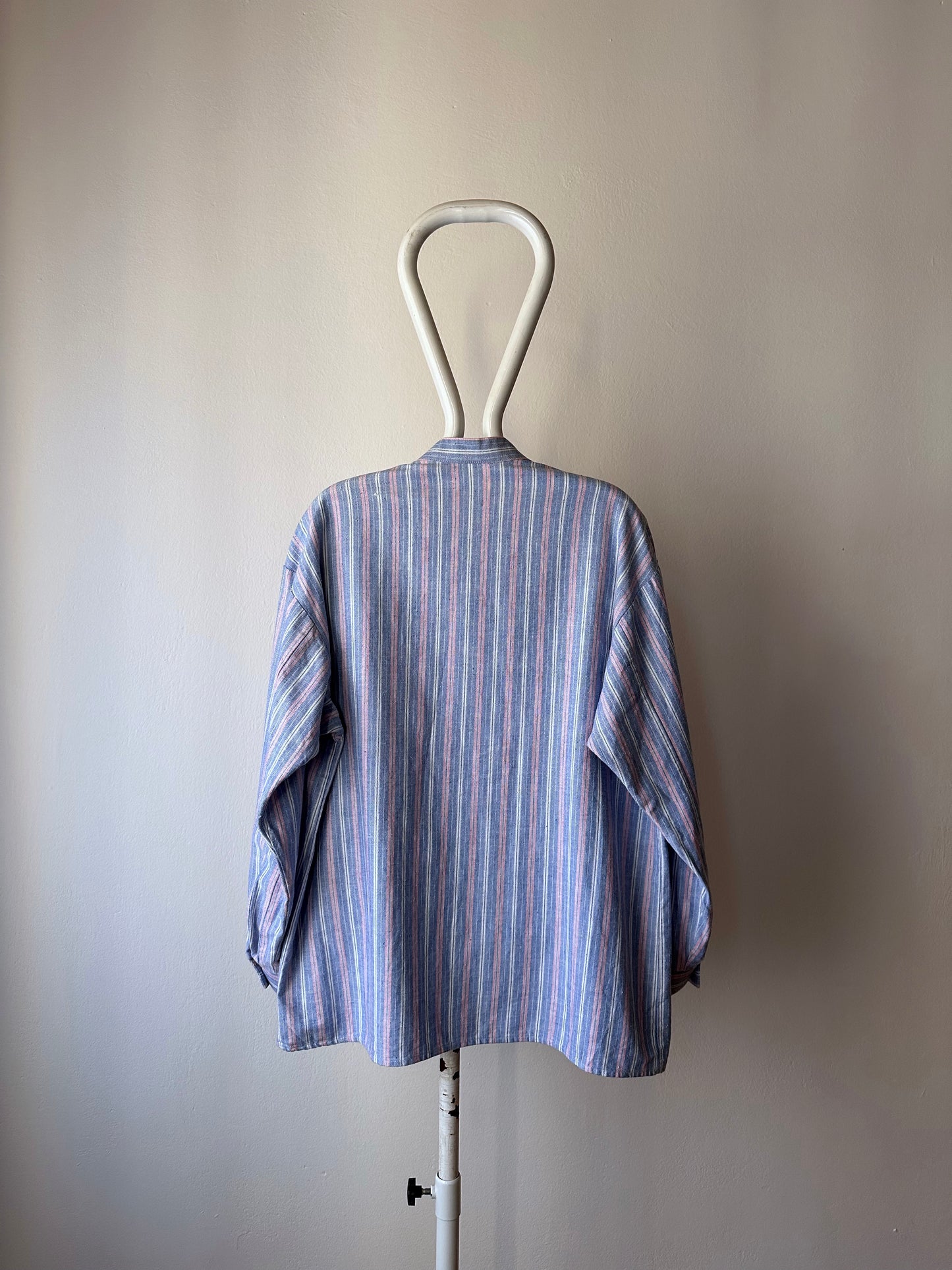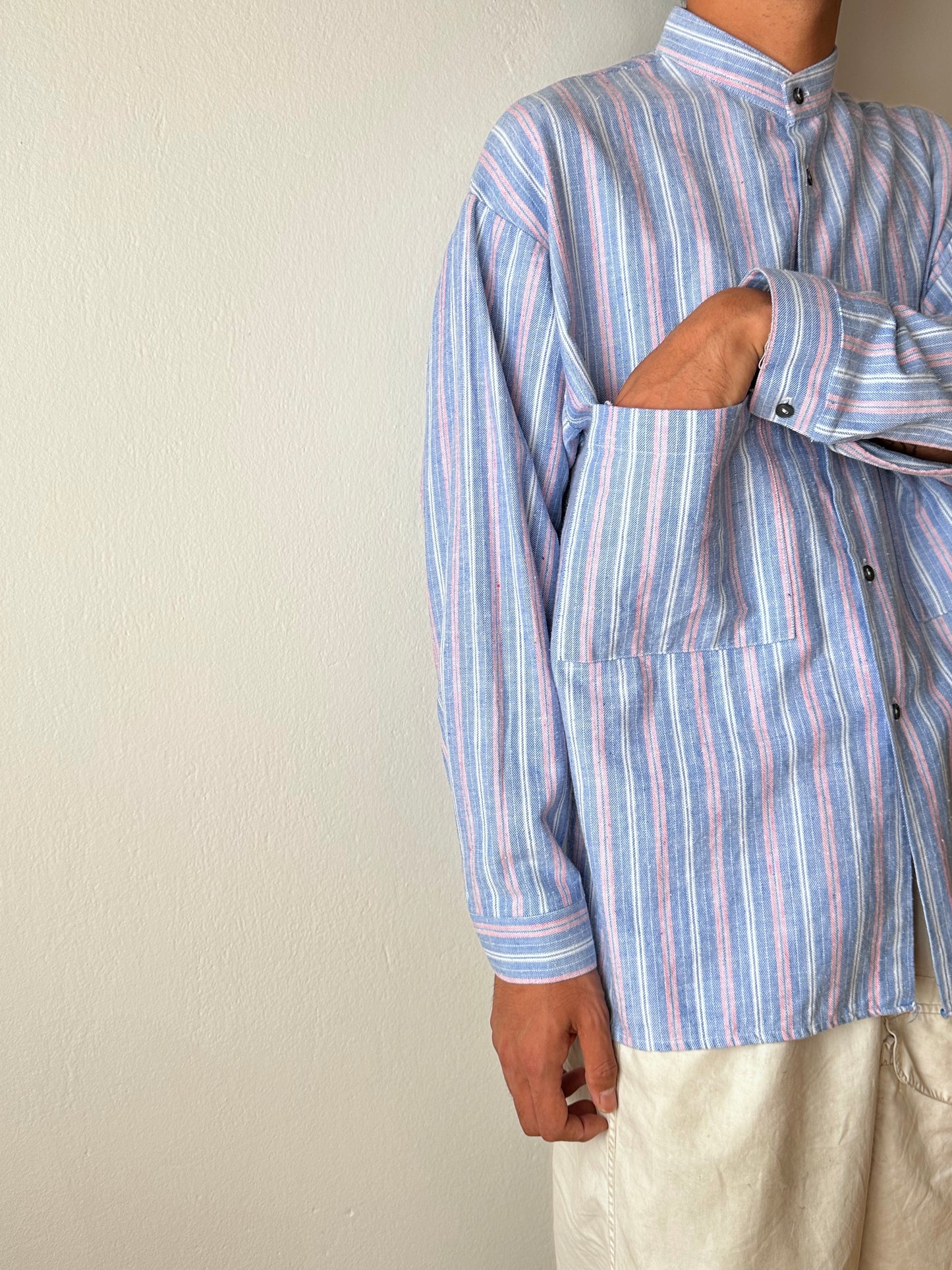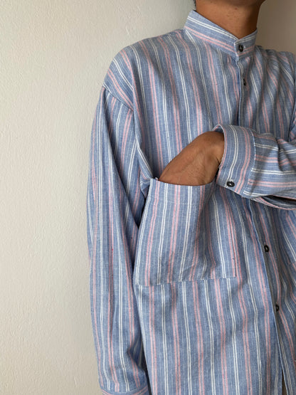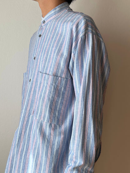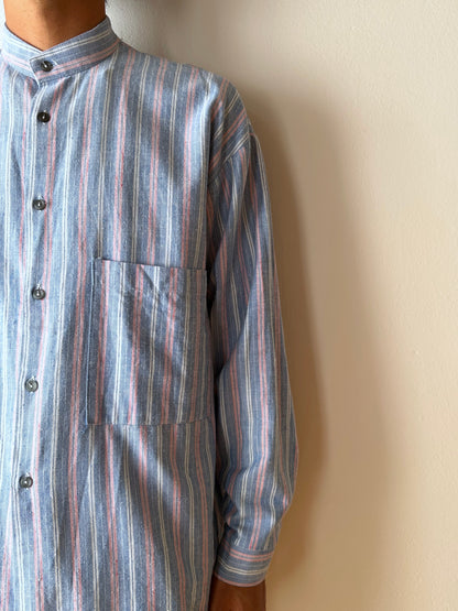 ノーカラーの身幅大きめのシャツ。