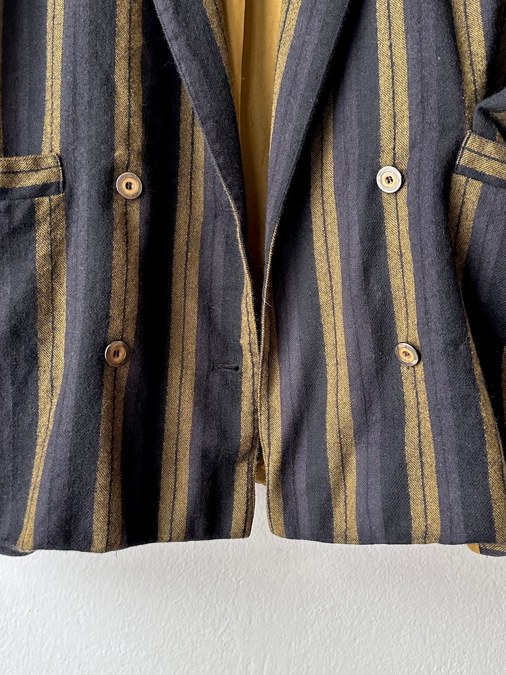 ブラックとオーカーの渋いカラーのストライプ、、格好良い生地〜