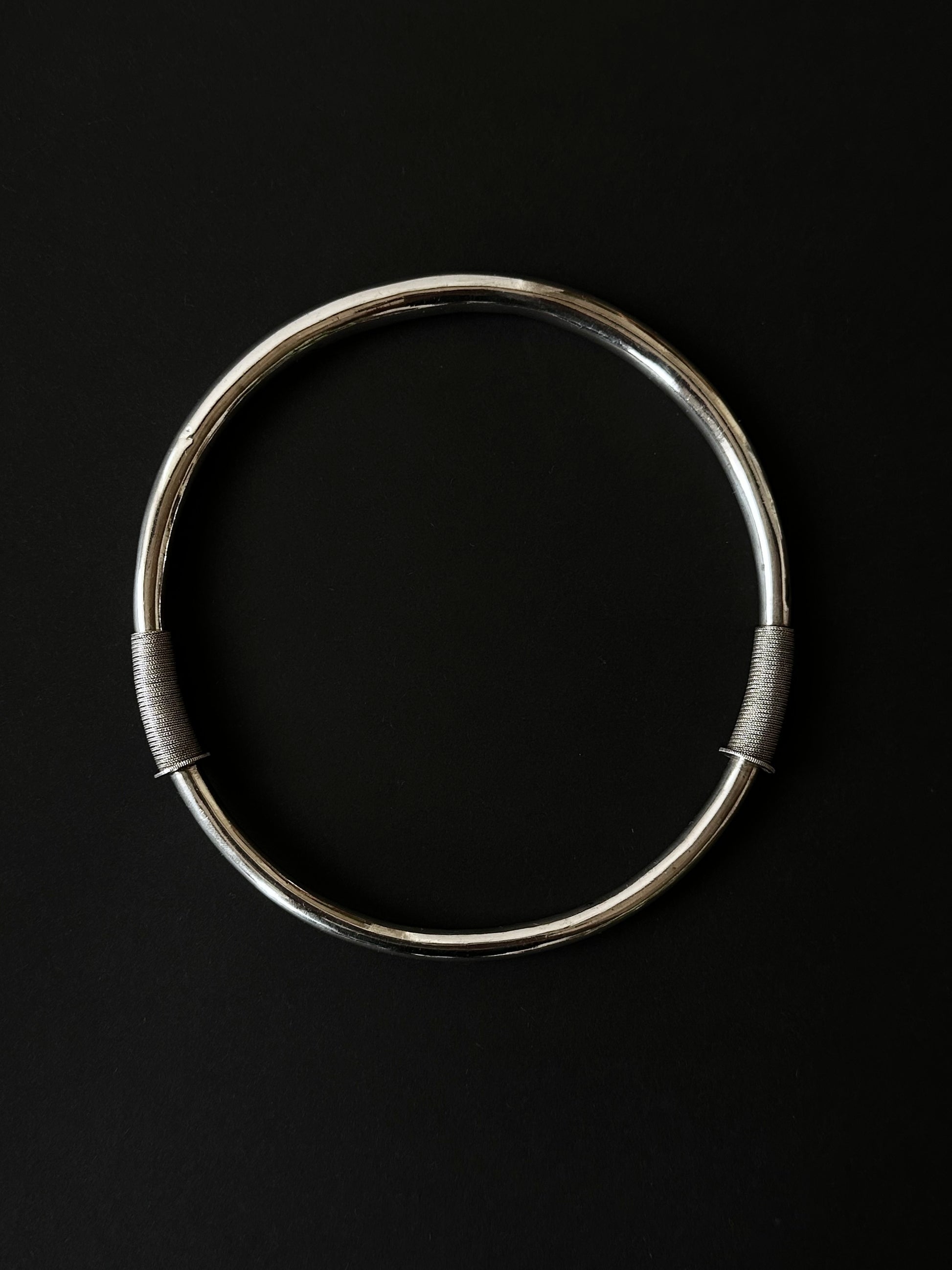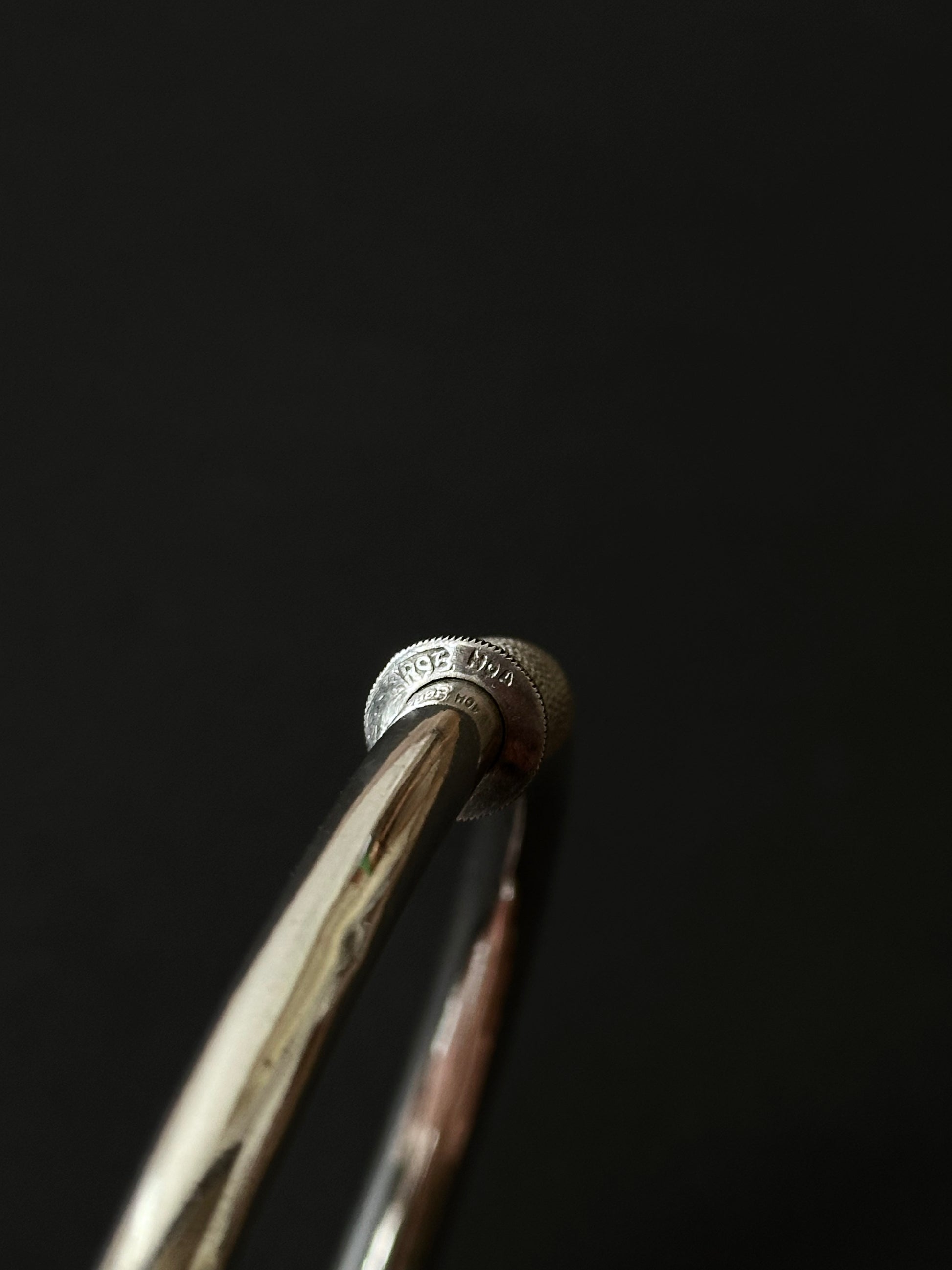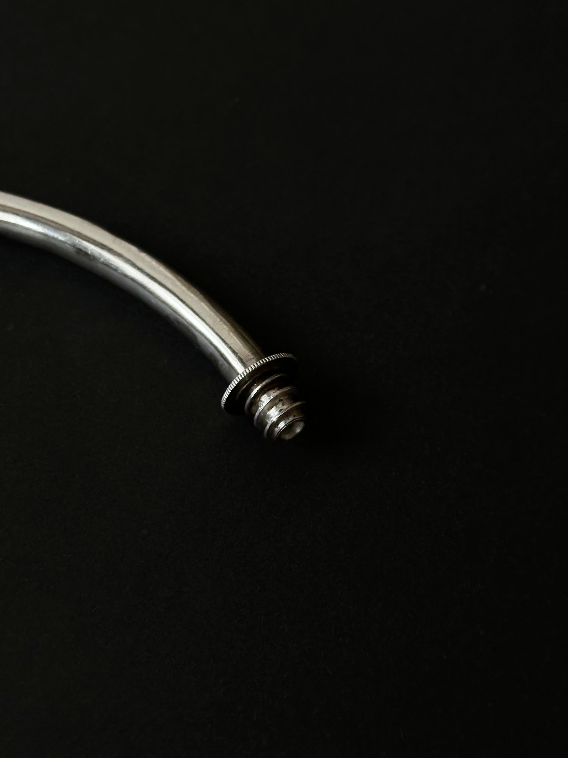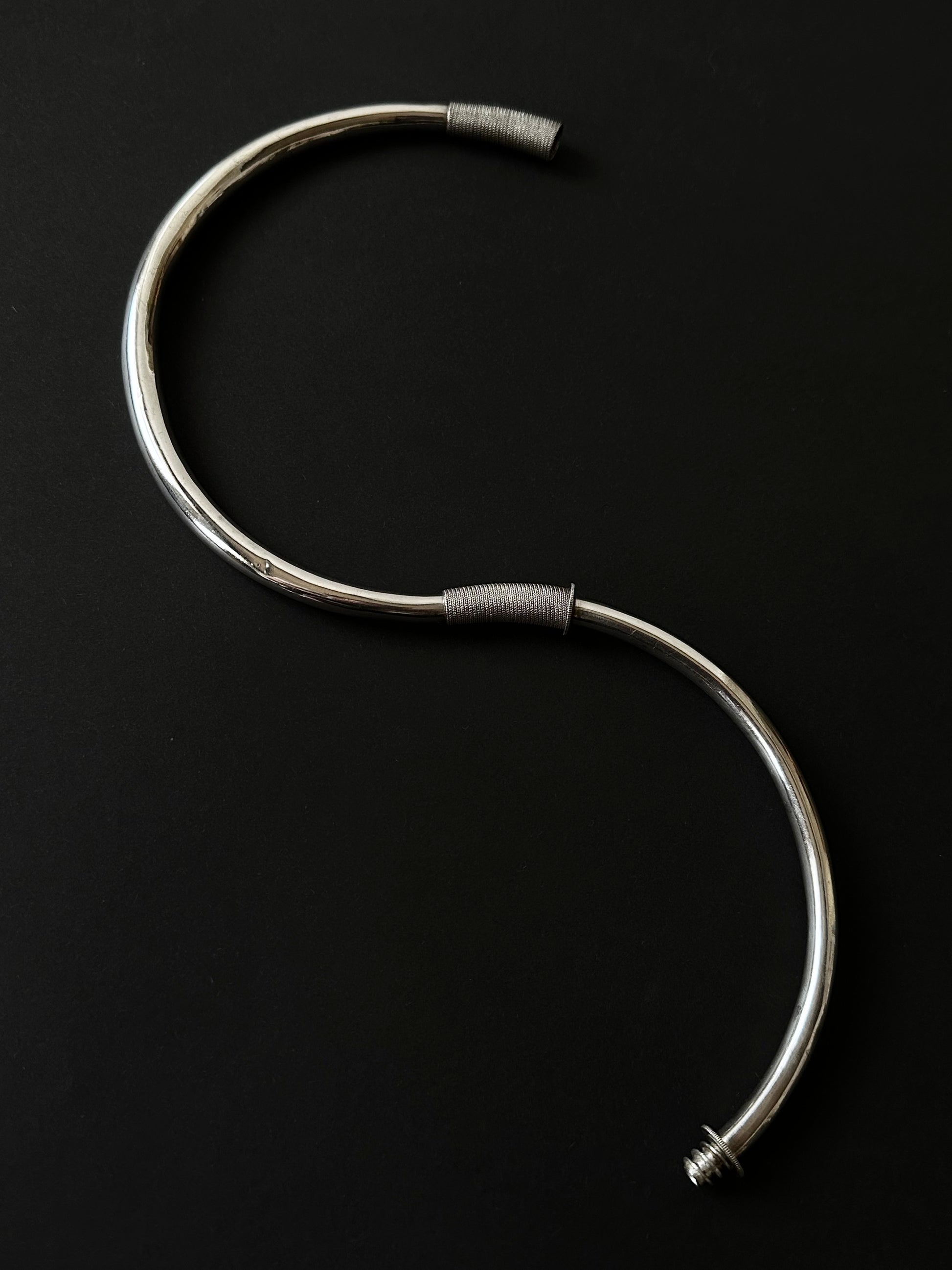 中空のチューブ型のシルバーを曲げ、両端にメッシュが巻かれたようなディテール。