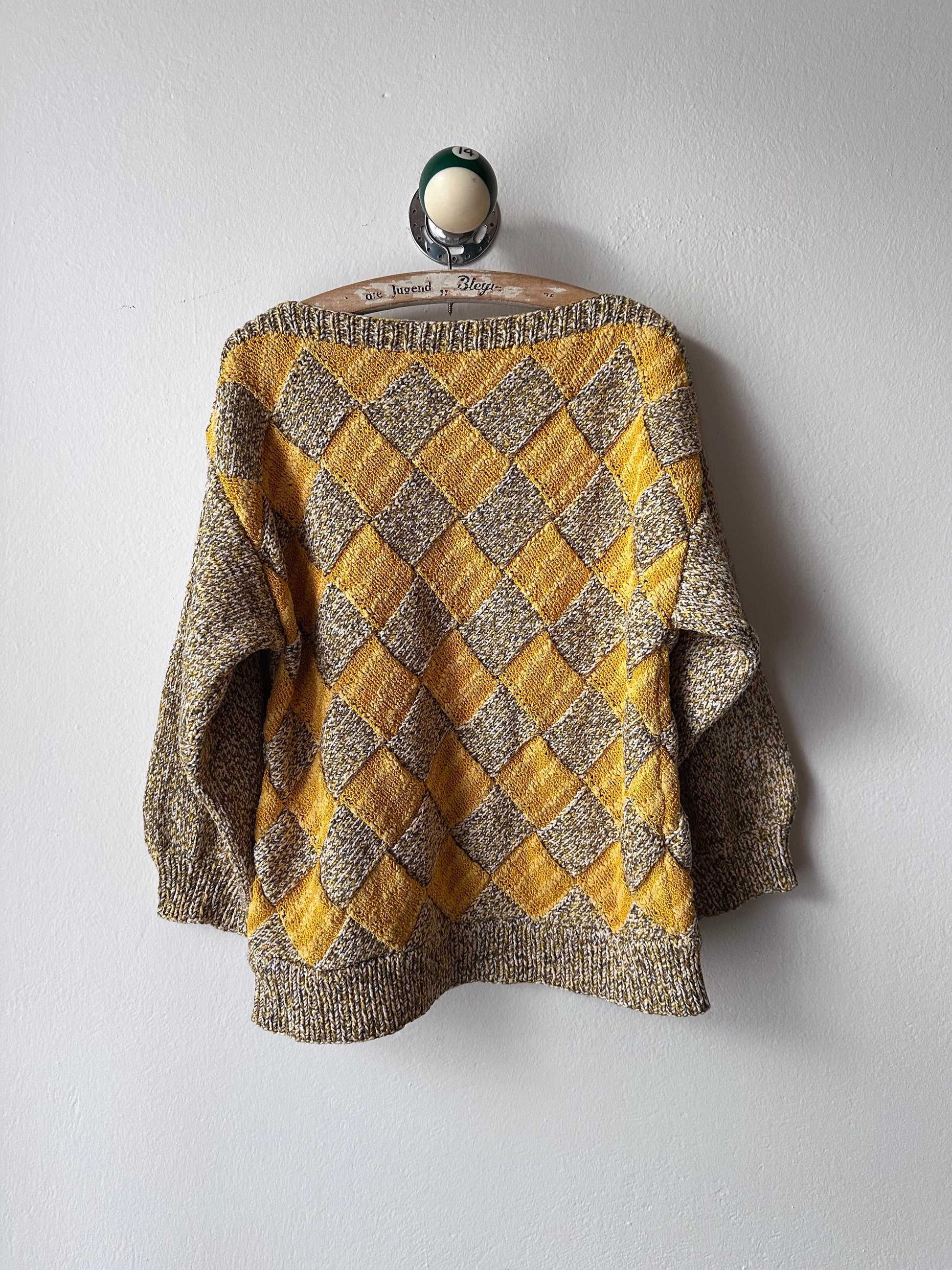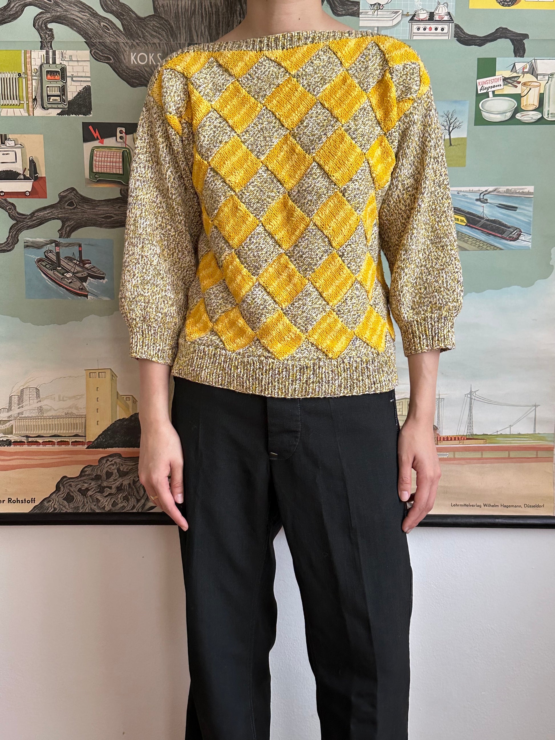 グレーイッシュなメランジニットと、それ自体もボーダー模様のような黄色のニット。それぞれが本当にかわいいのにそれが組み合わさって最高。