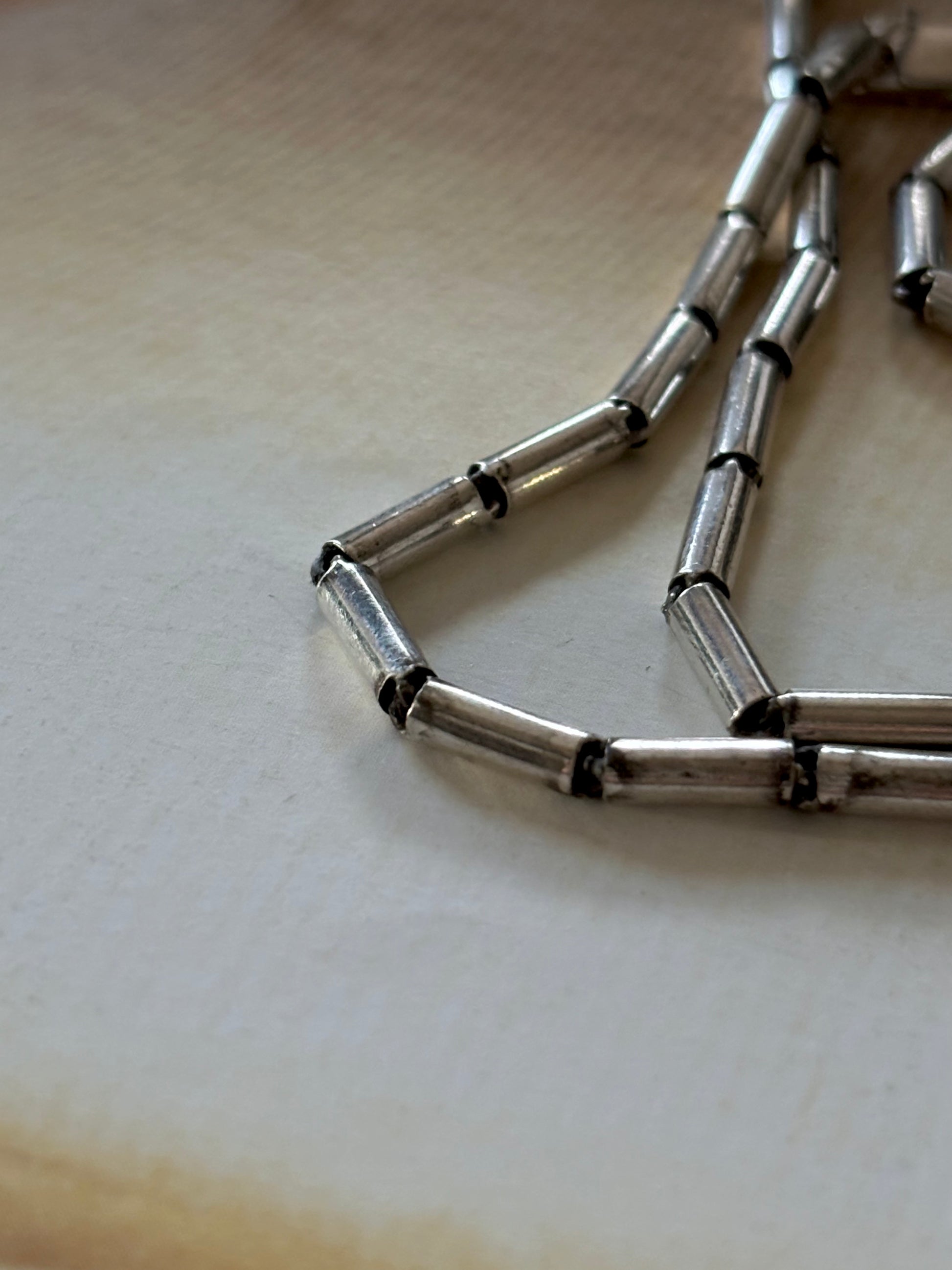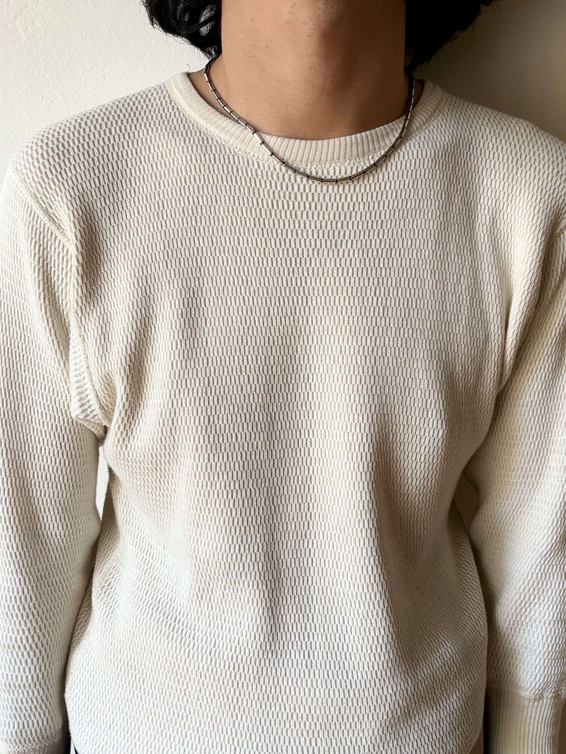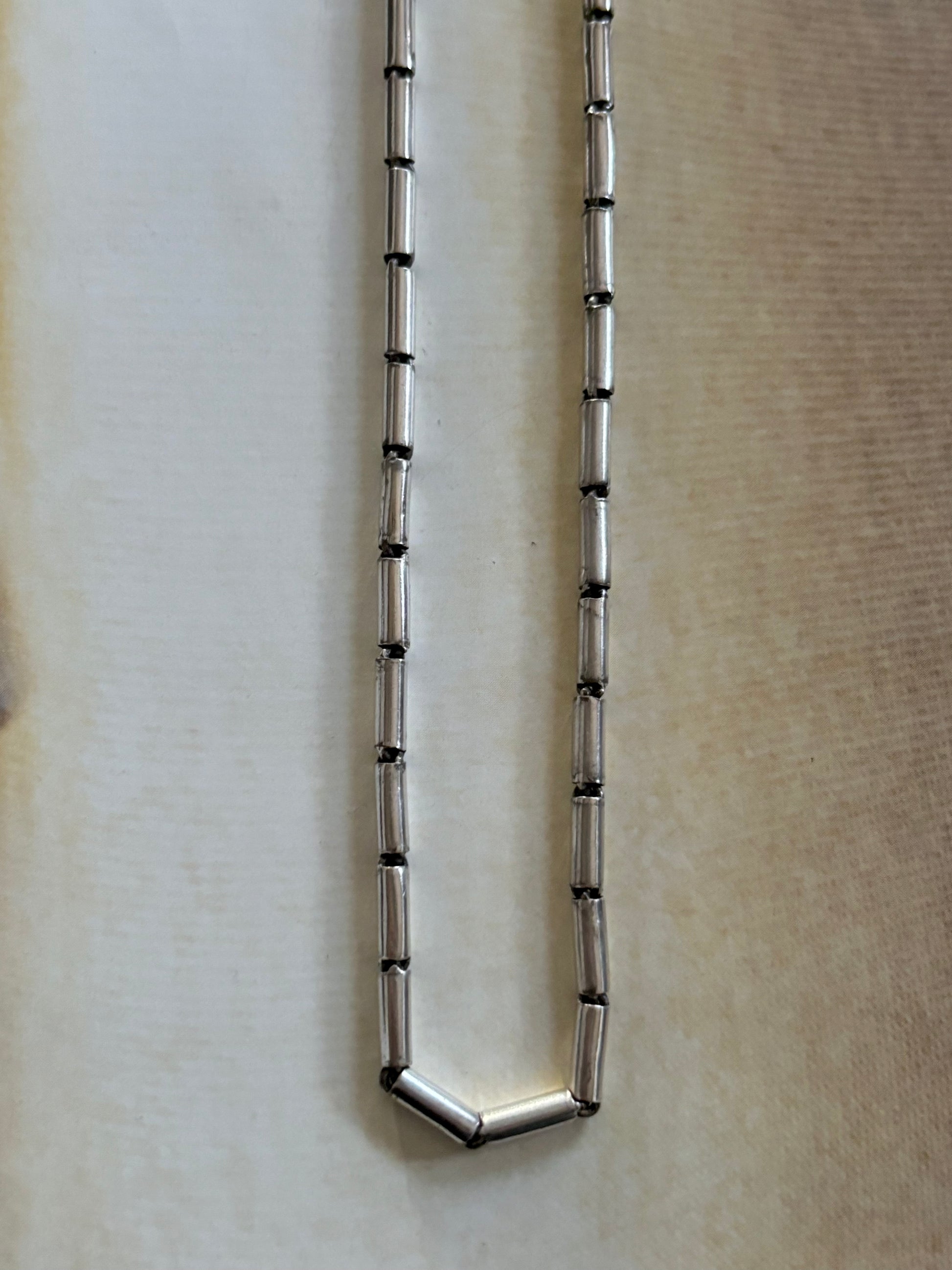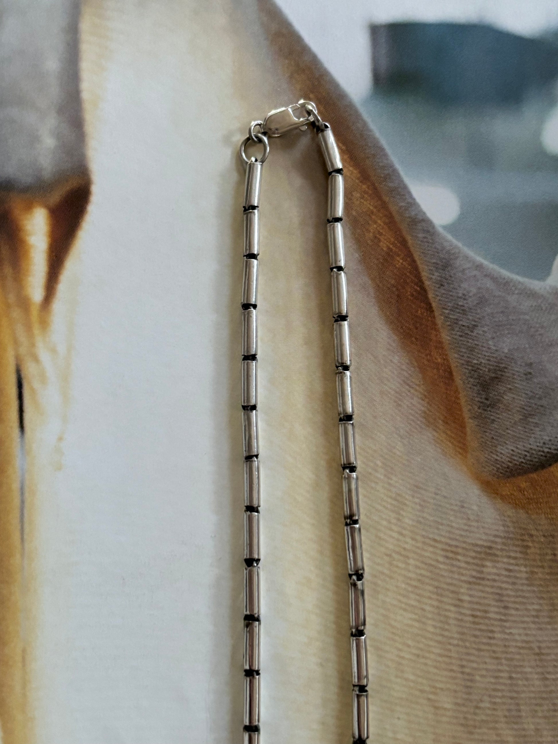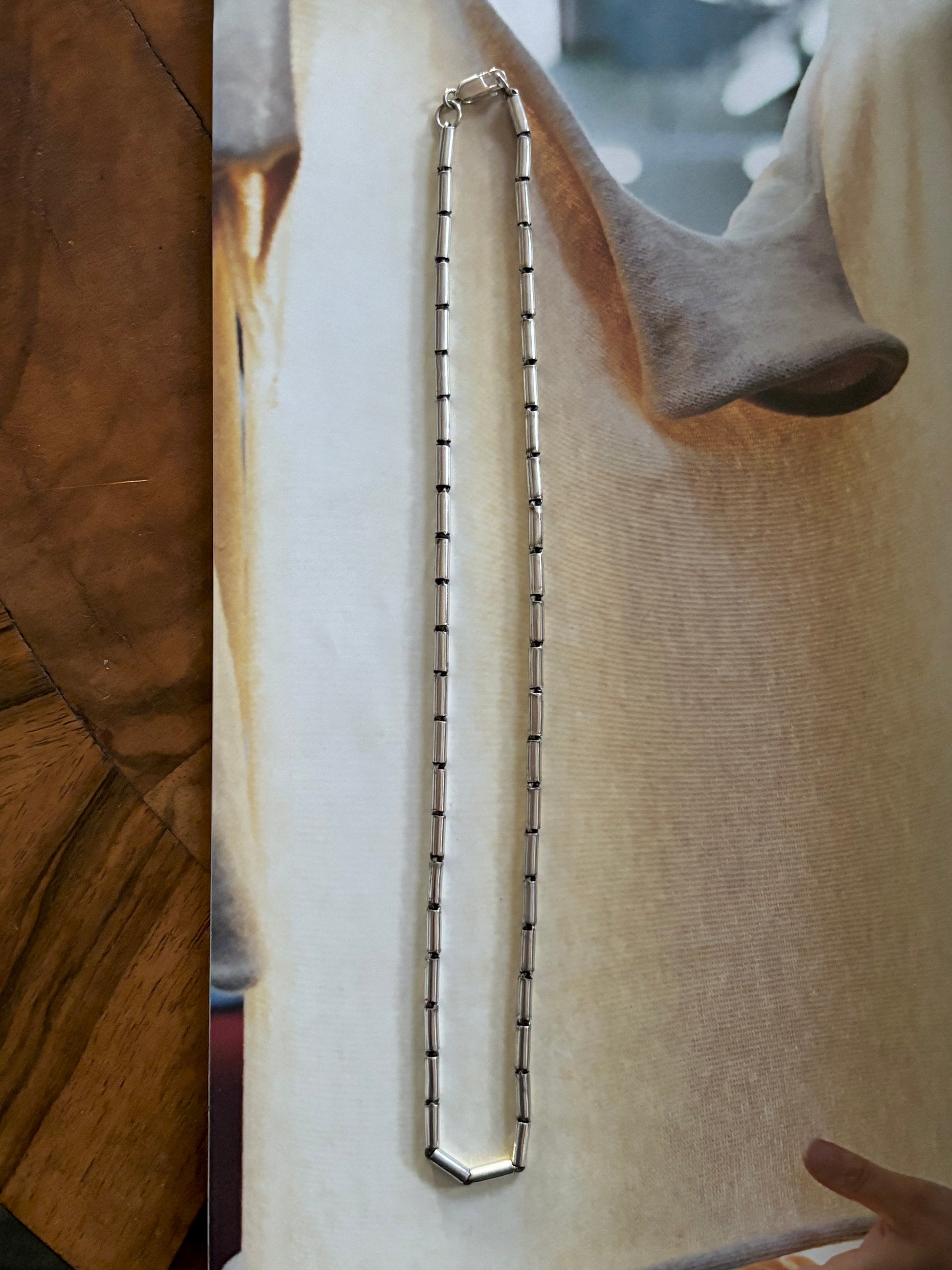 男性的ながらどこか品のある雰囲気で性別を選ばないニュートラルなネックレス。