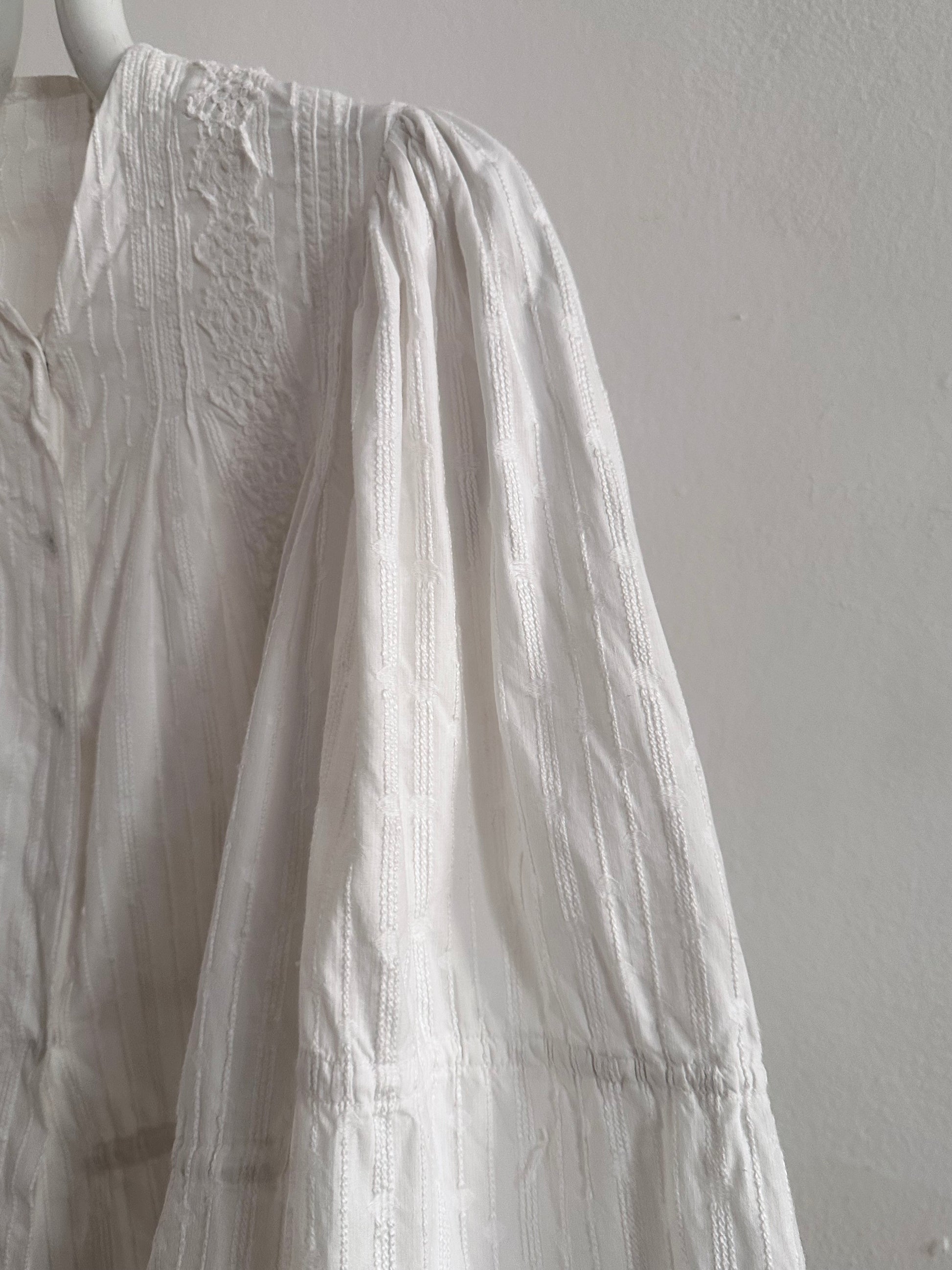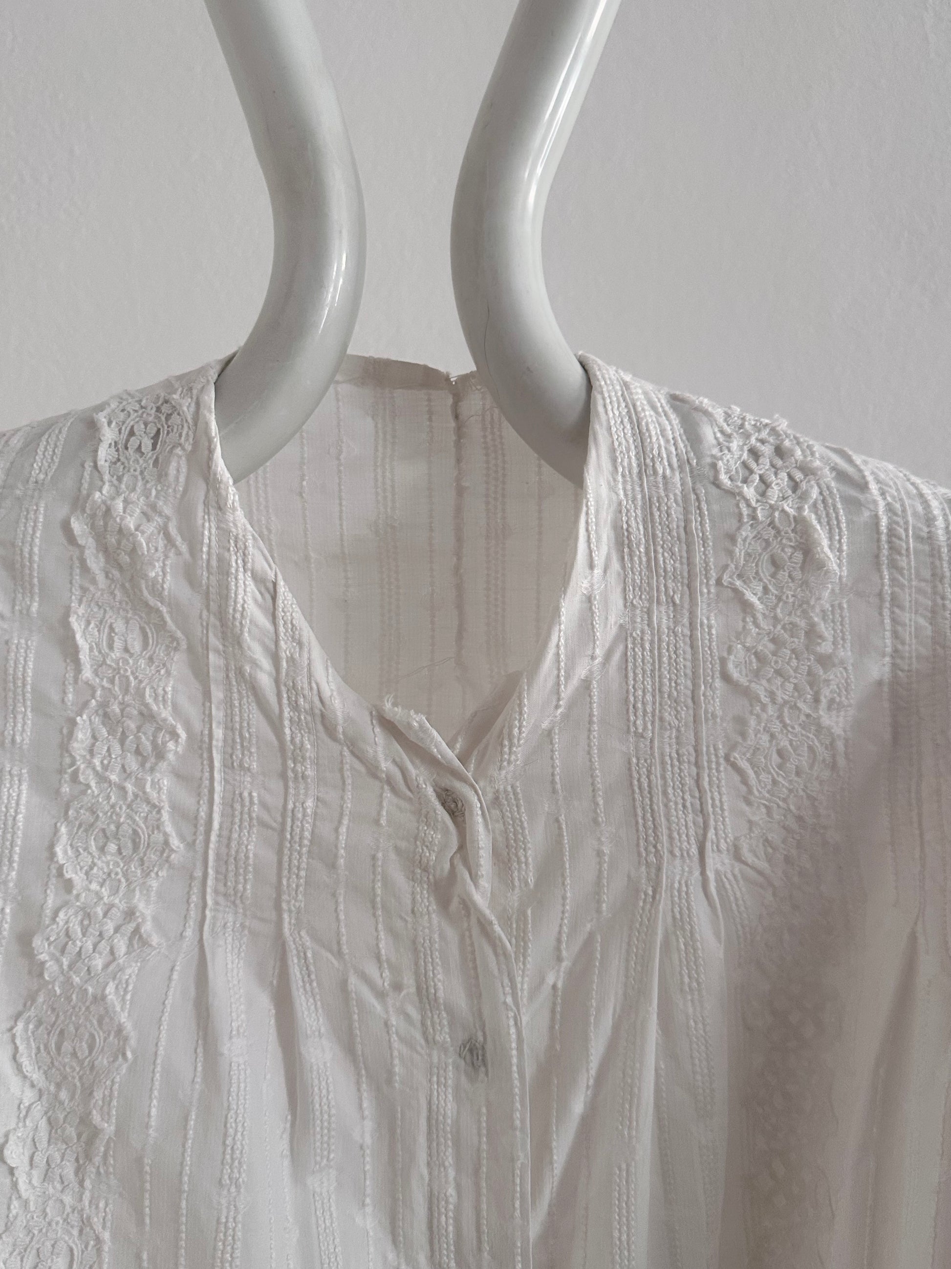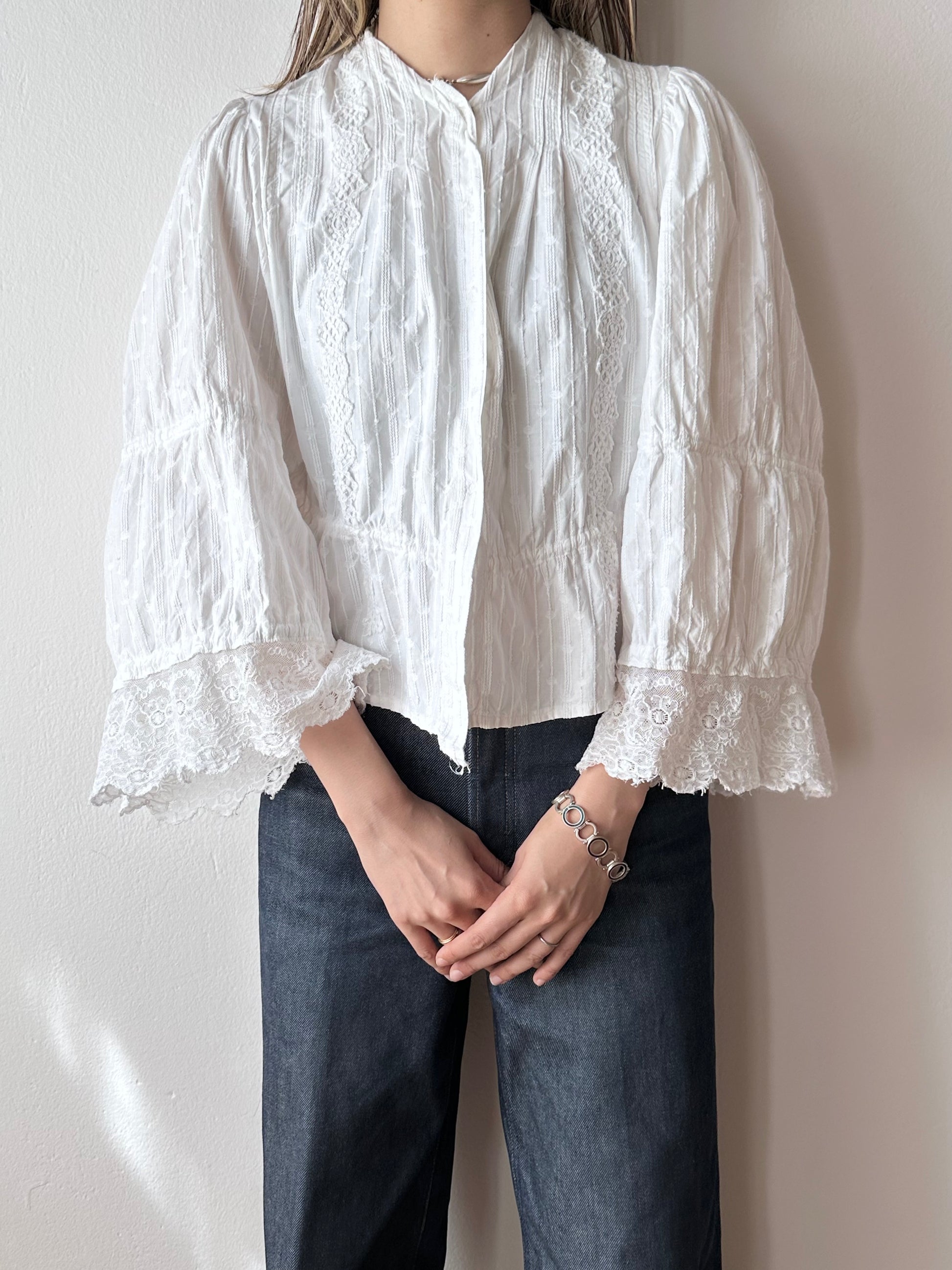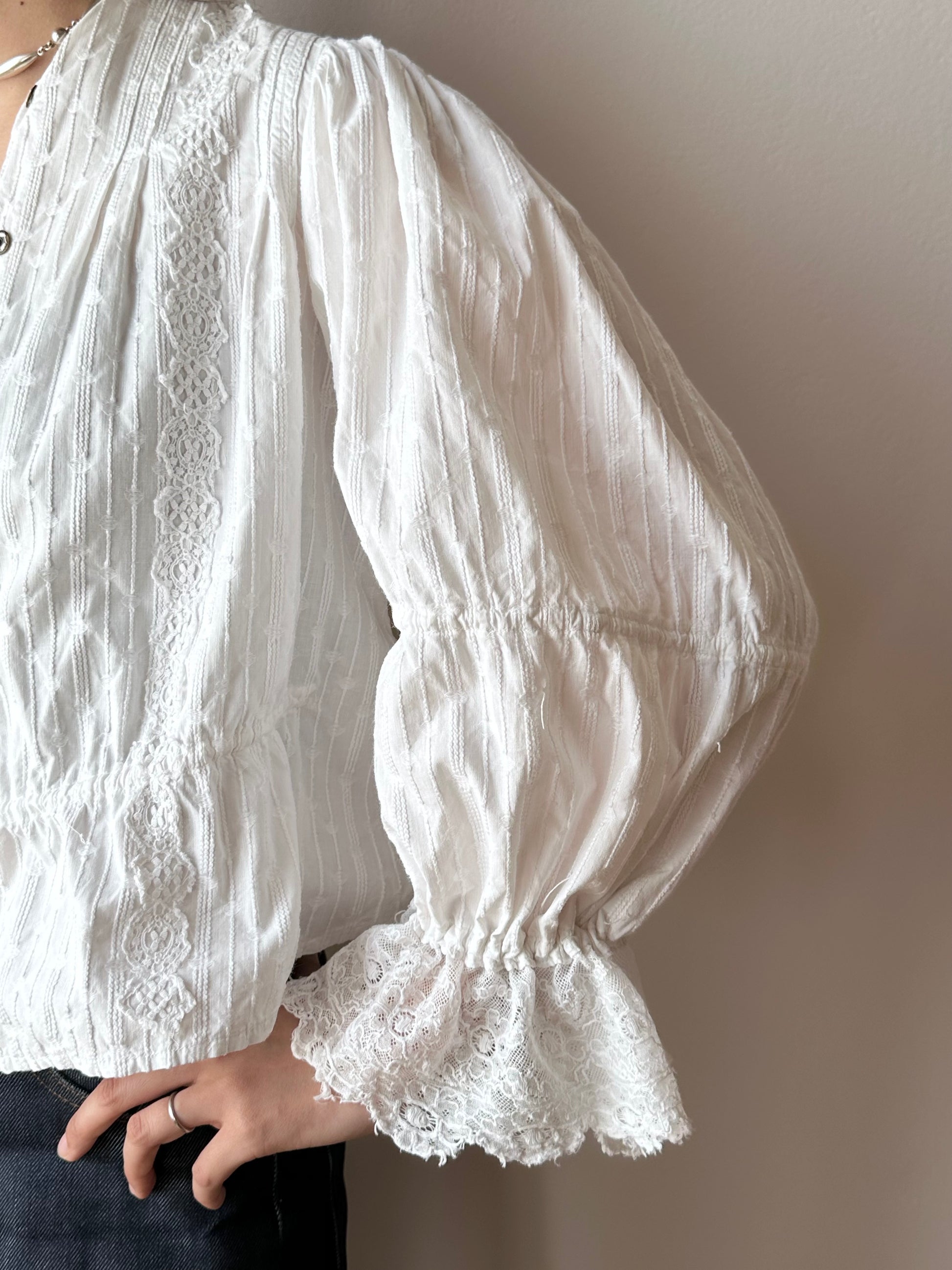 Edwardian-era blouse made from lightweight dobby-woven cotton with subtle texture and hand-finished details. Features handmade bobbin lace inserts and delicate net lace cuffs, finished with fine embroidered tulle that recalls Point de Gaze. The three-tiered gathered sleeves can be shaped beautifully at each section.