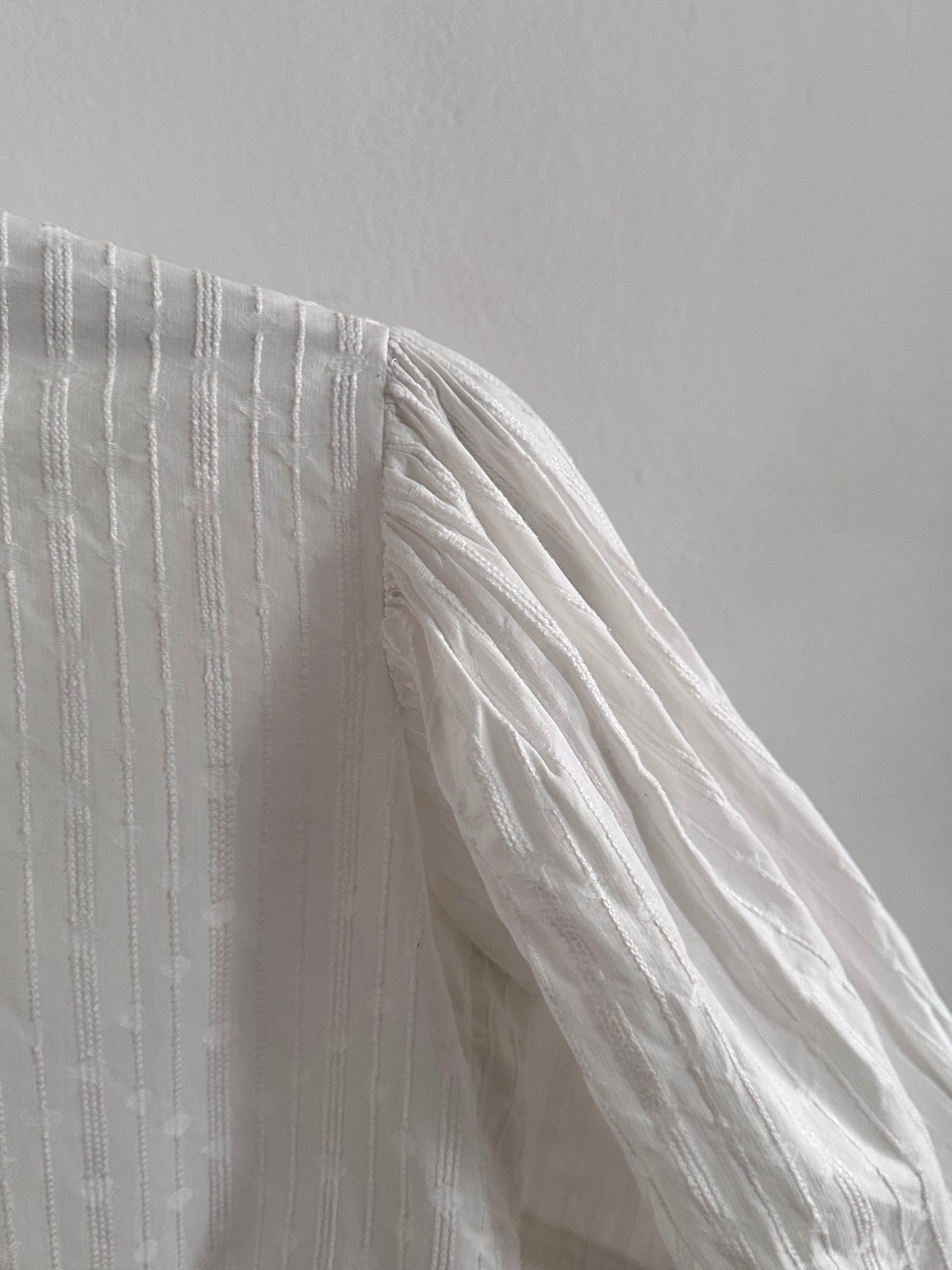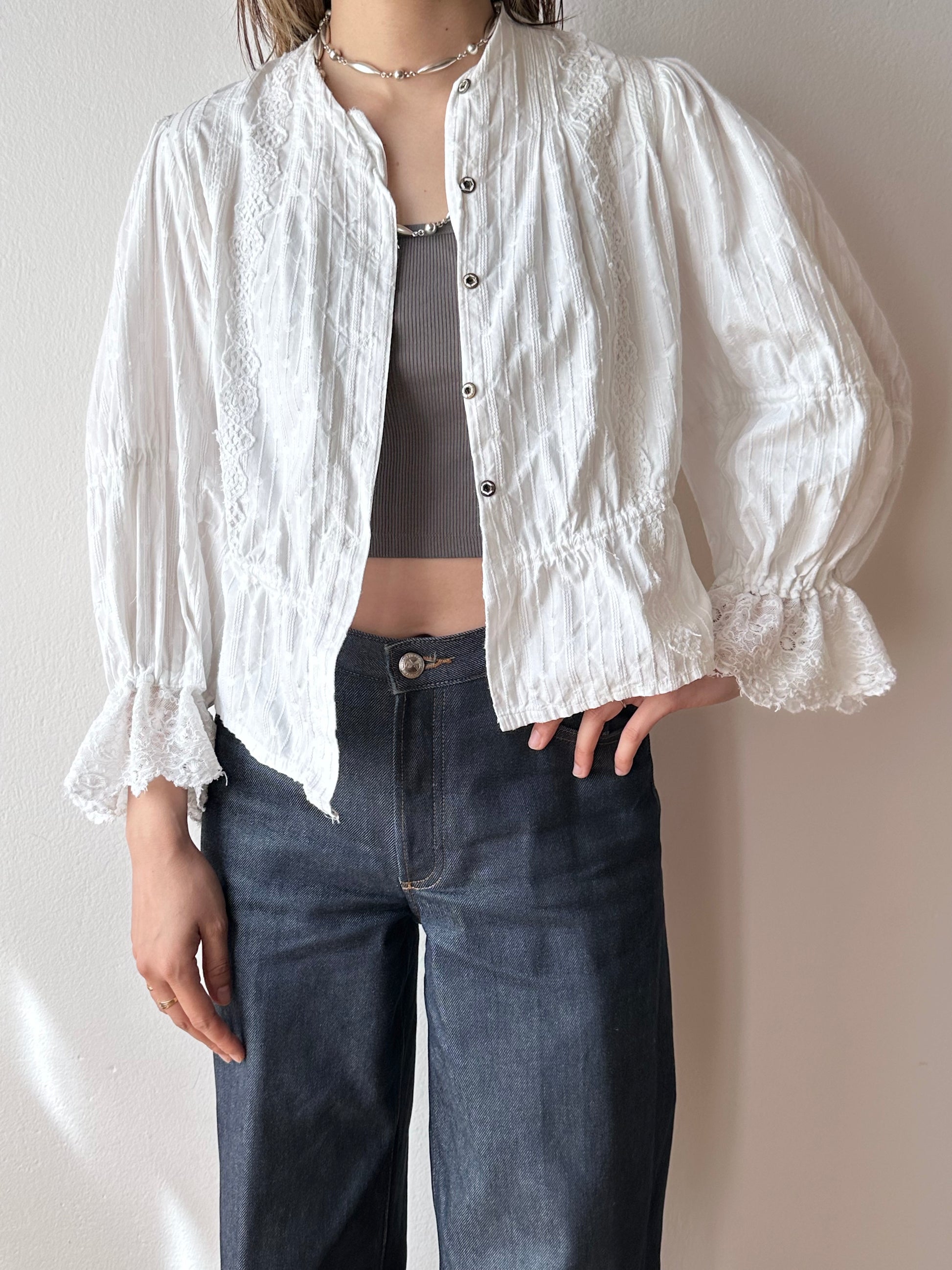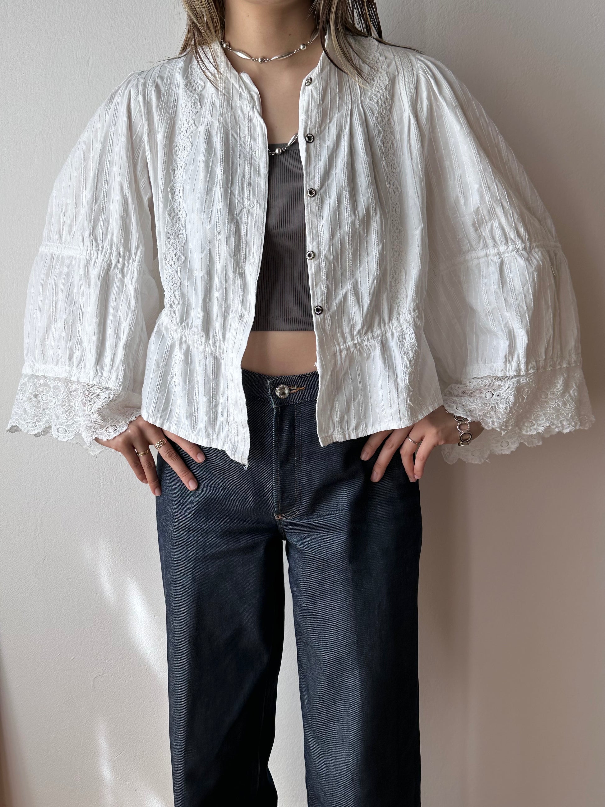 Edwardian-era blouse made from lightweight dobby-woven cotton with subtle texture and hand-finished details. Features handmade bobbin lace inserts and delicate net lace cuffs, finished with fine embroidered tulle that recalls Point de Gaze. The three-tiered gathered sleeves can be shaped beautifully at each section.