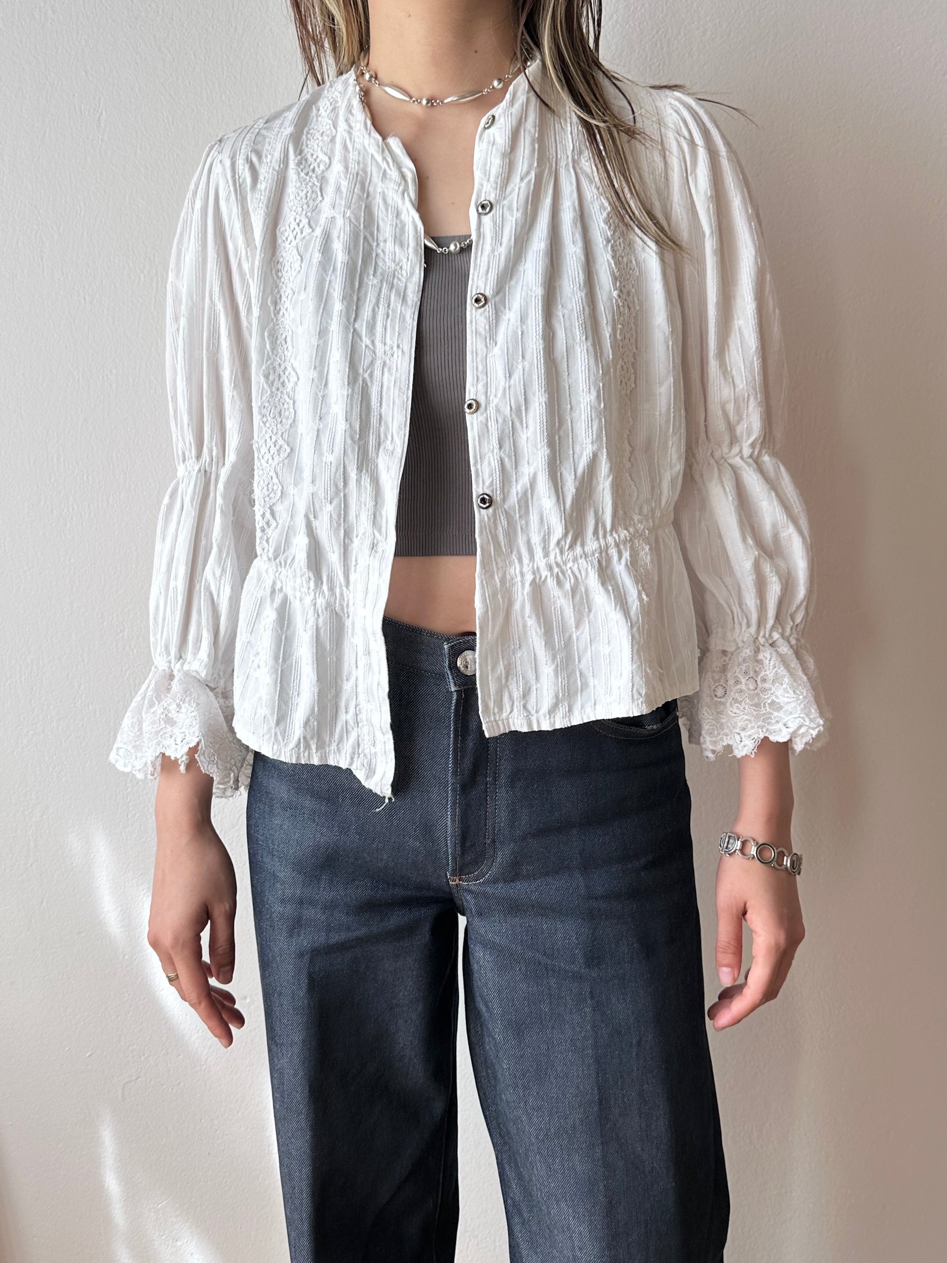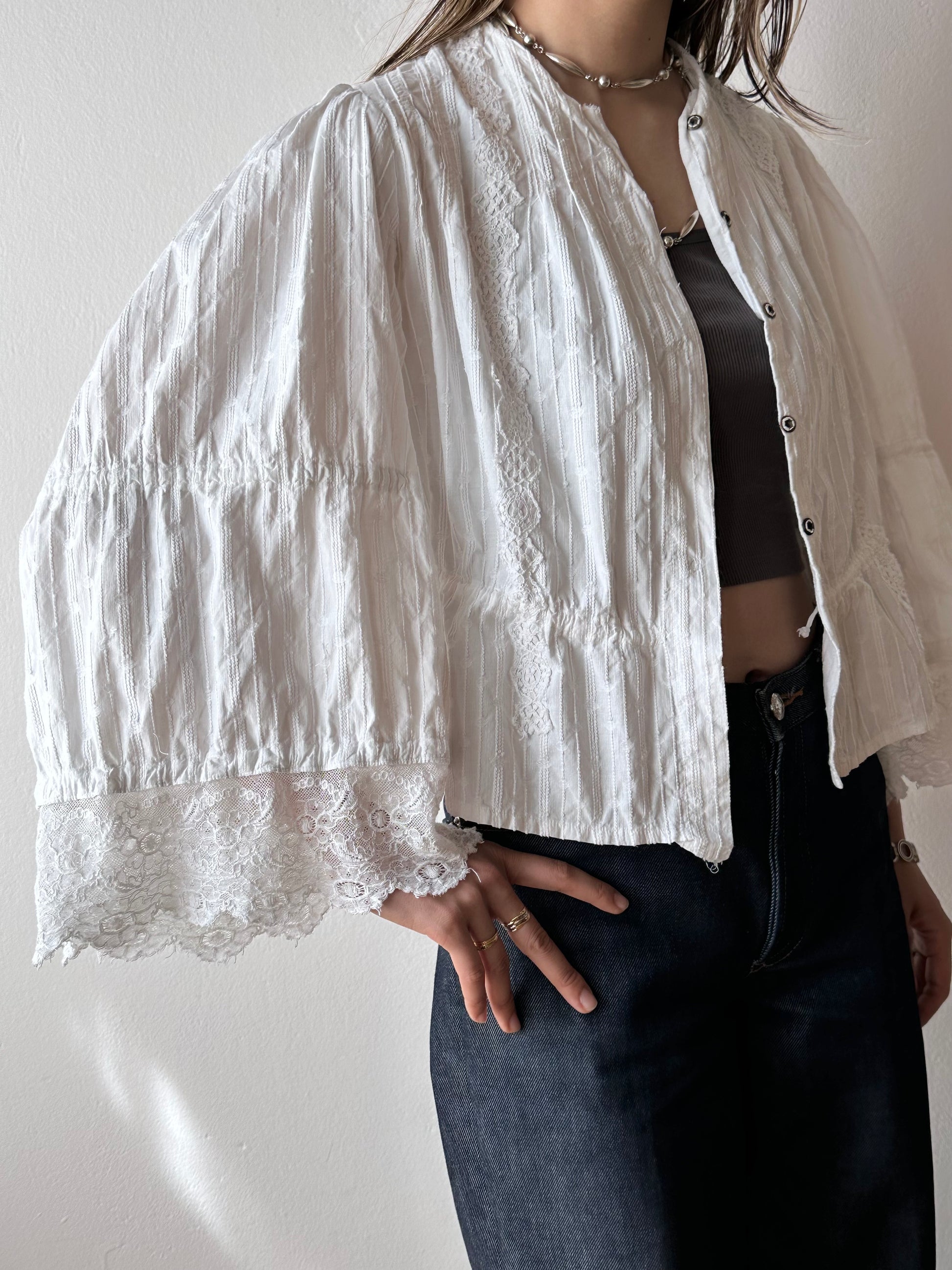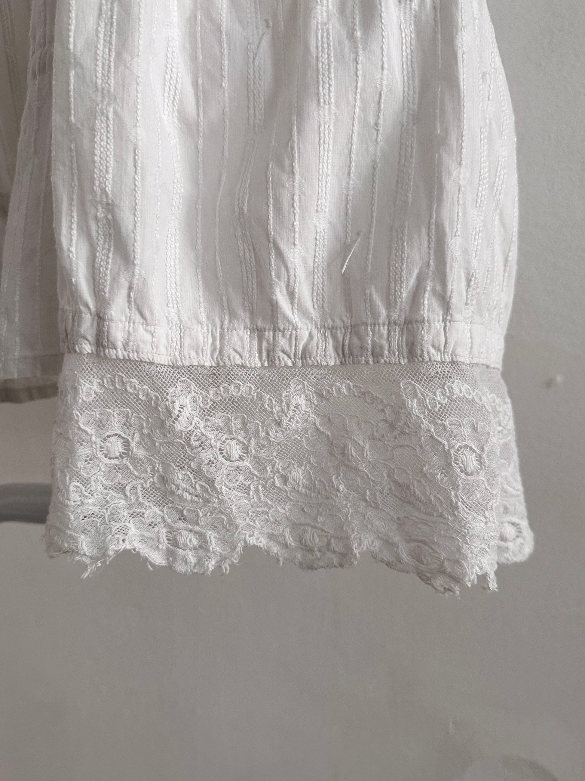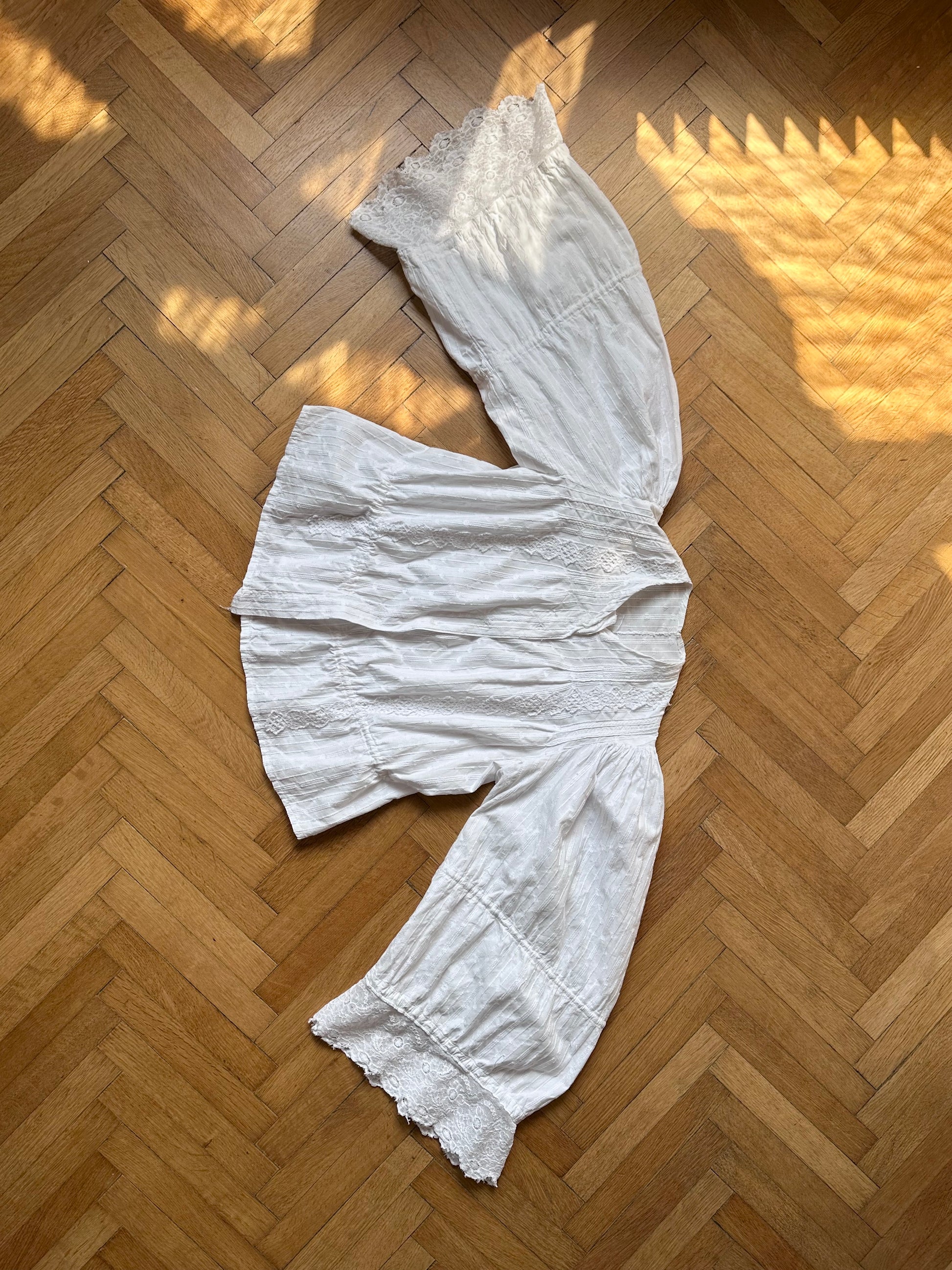 Edwardian-era blouse made from lightweight dobby-woven cotton with subtle texture and hand-finished details. Features handmade bobbin lace inserts and delicate net lace cuffs, finished with fine embroidered tulle that recalls Point de Gaze. The three-tiered gathered sleeves can be shaped beautifully at each section.