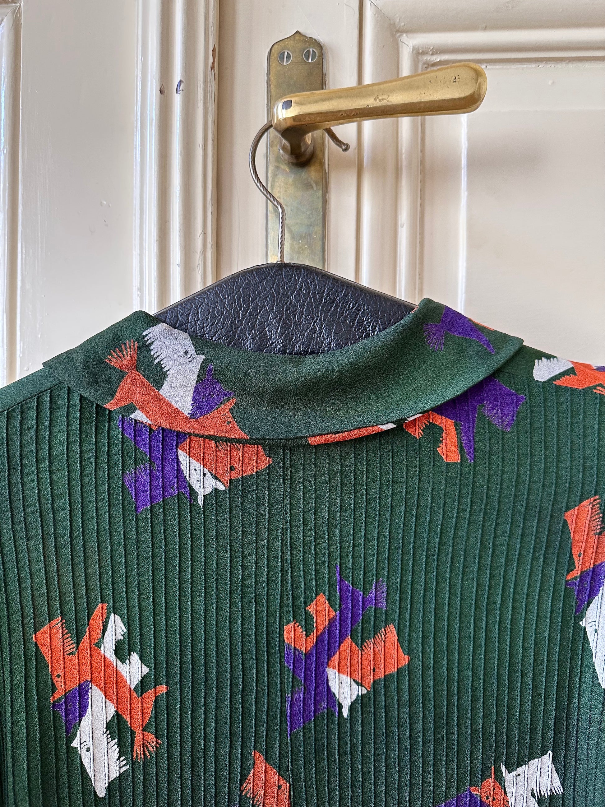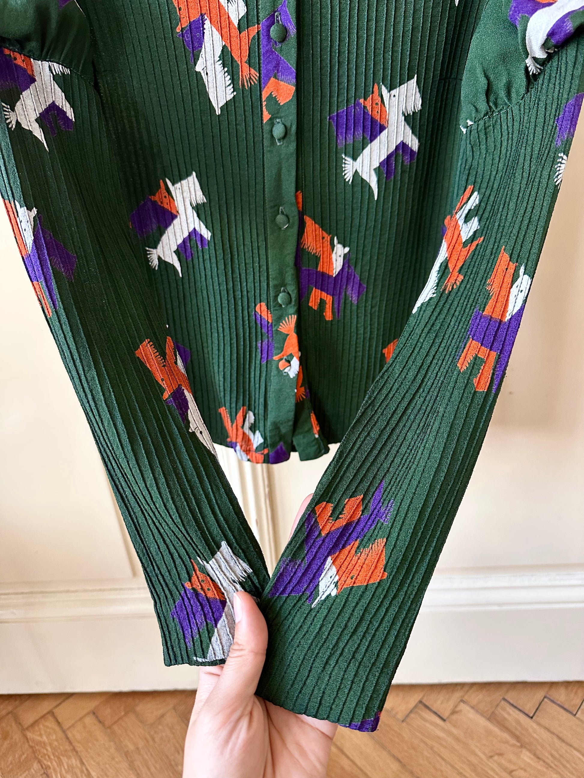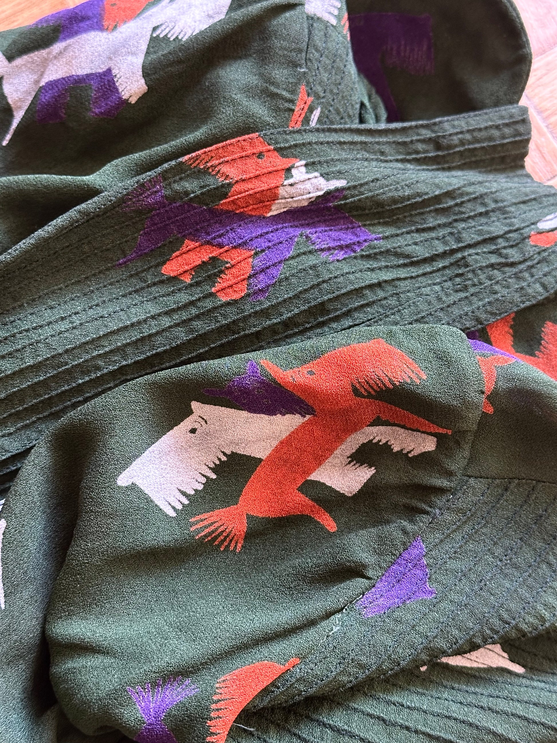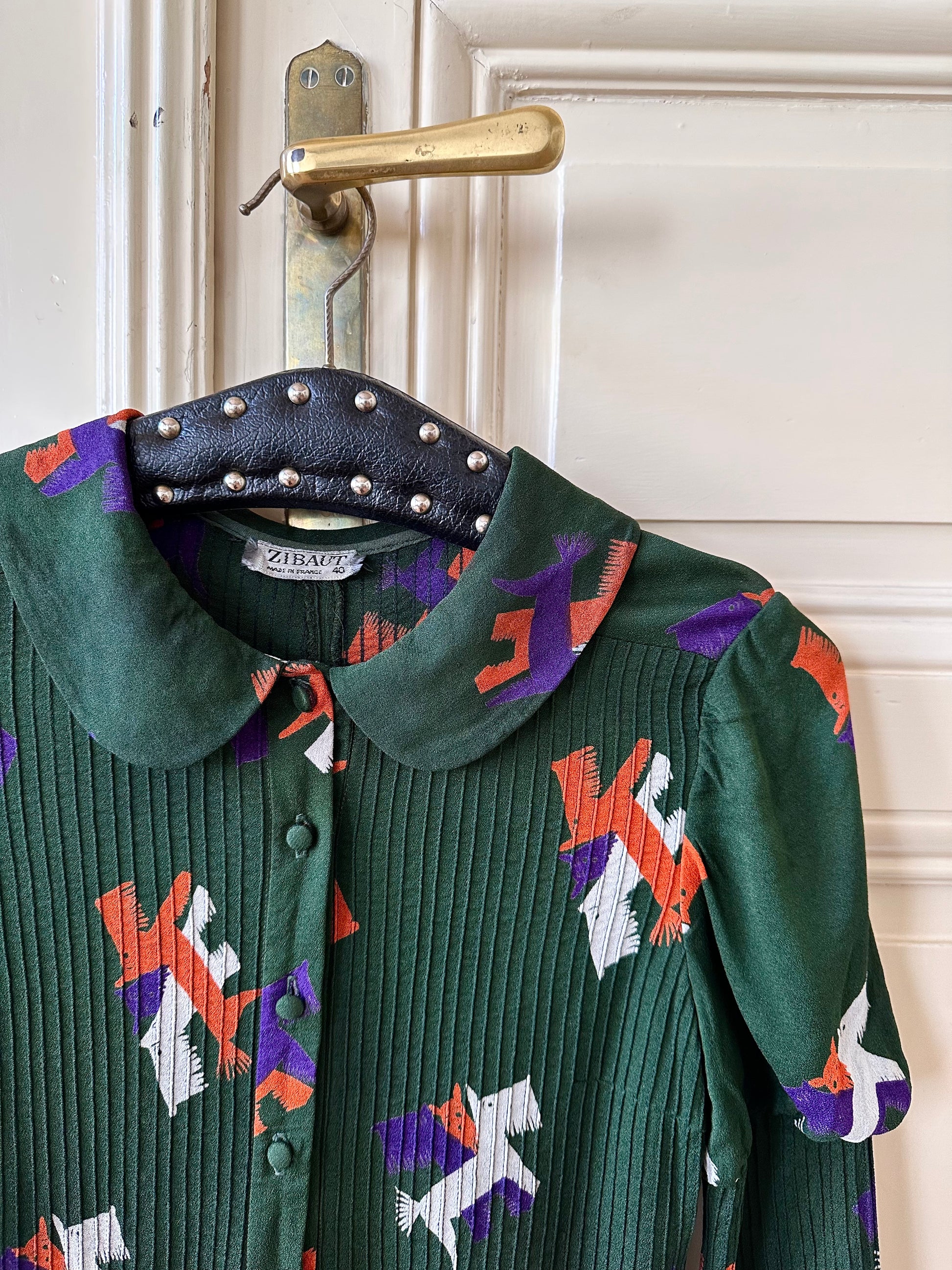 ジョーゼットのようなクレープ生地に、この当時のフランスらしいスコティッシュテリアの可愛いプリント。史上最高にファブリック。