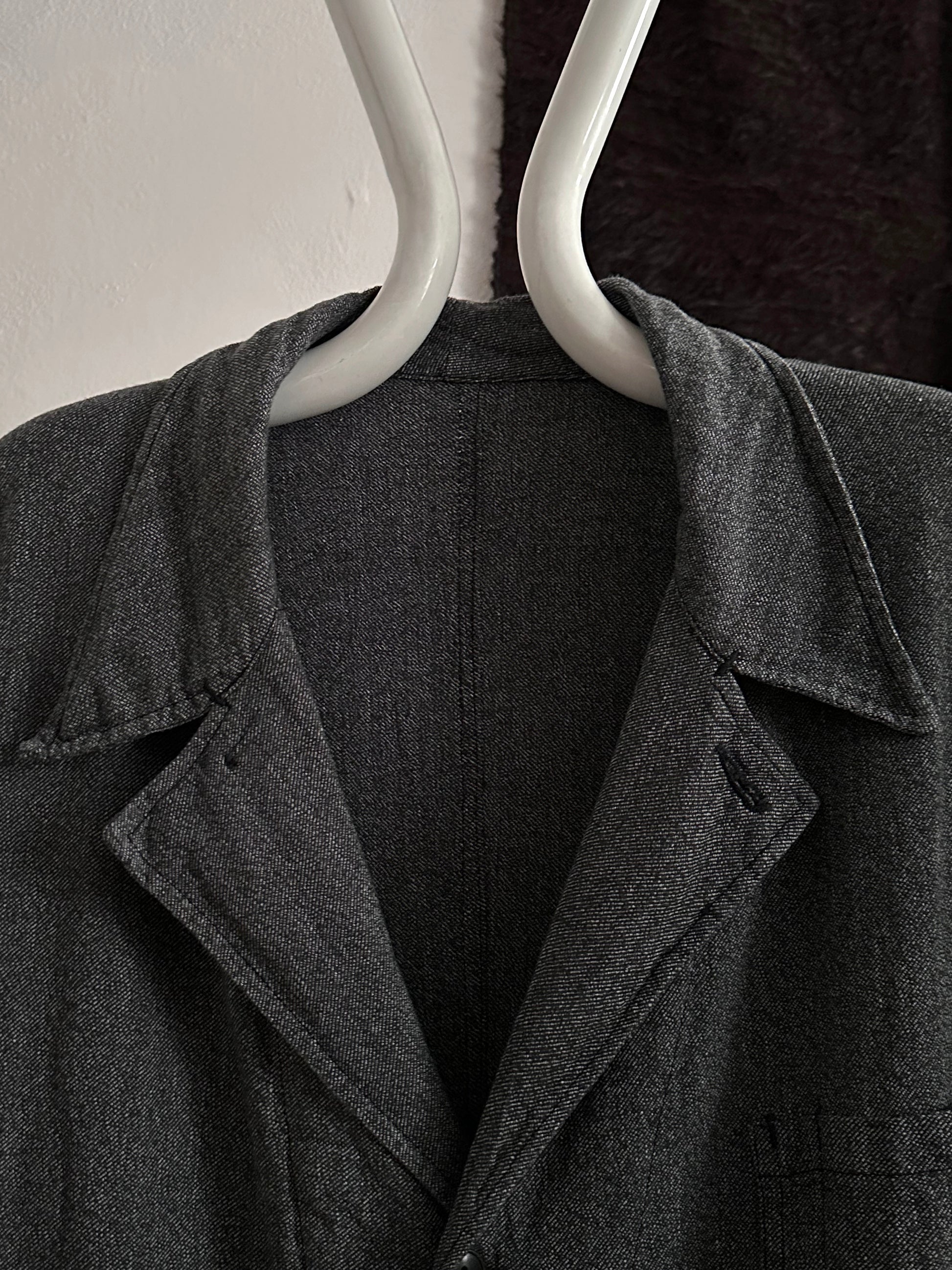 細かいところですが、袖丈は短め・太めで、フレンチヴィンテージならではの立体的な筒袖、腰骨に近いところにつくポケットなので手を入れた時のたっぷり横に長いシルエット、などなど最高です。笑 着用写真でご覧いただきたいです。