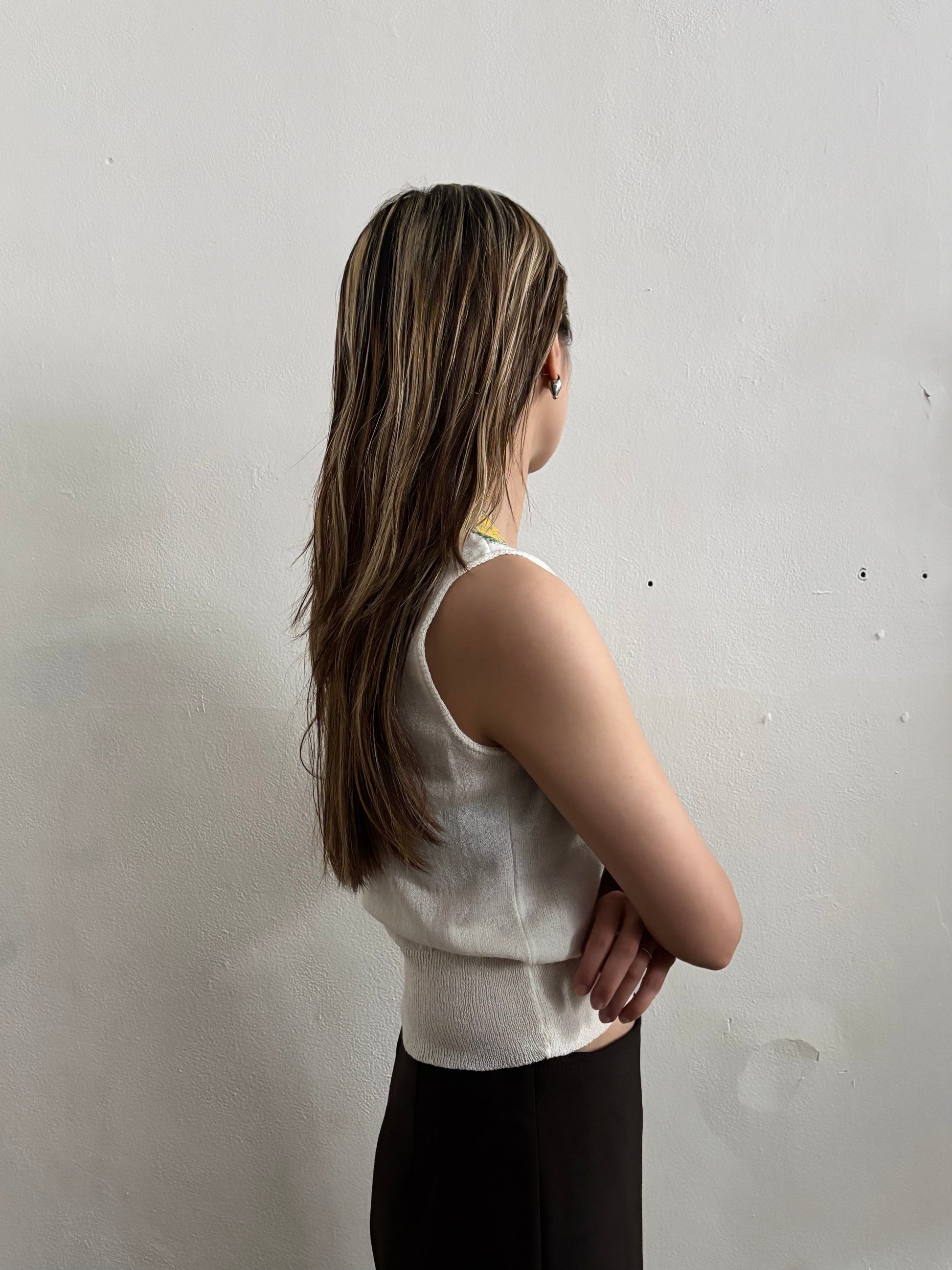 サマーニット素材に、フロントチェストの部分がお花柄のメッシュレースデザイン。