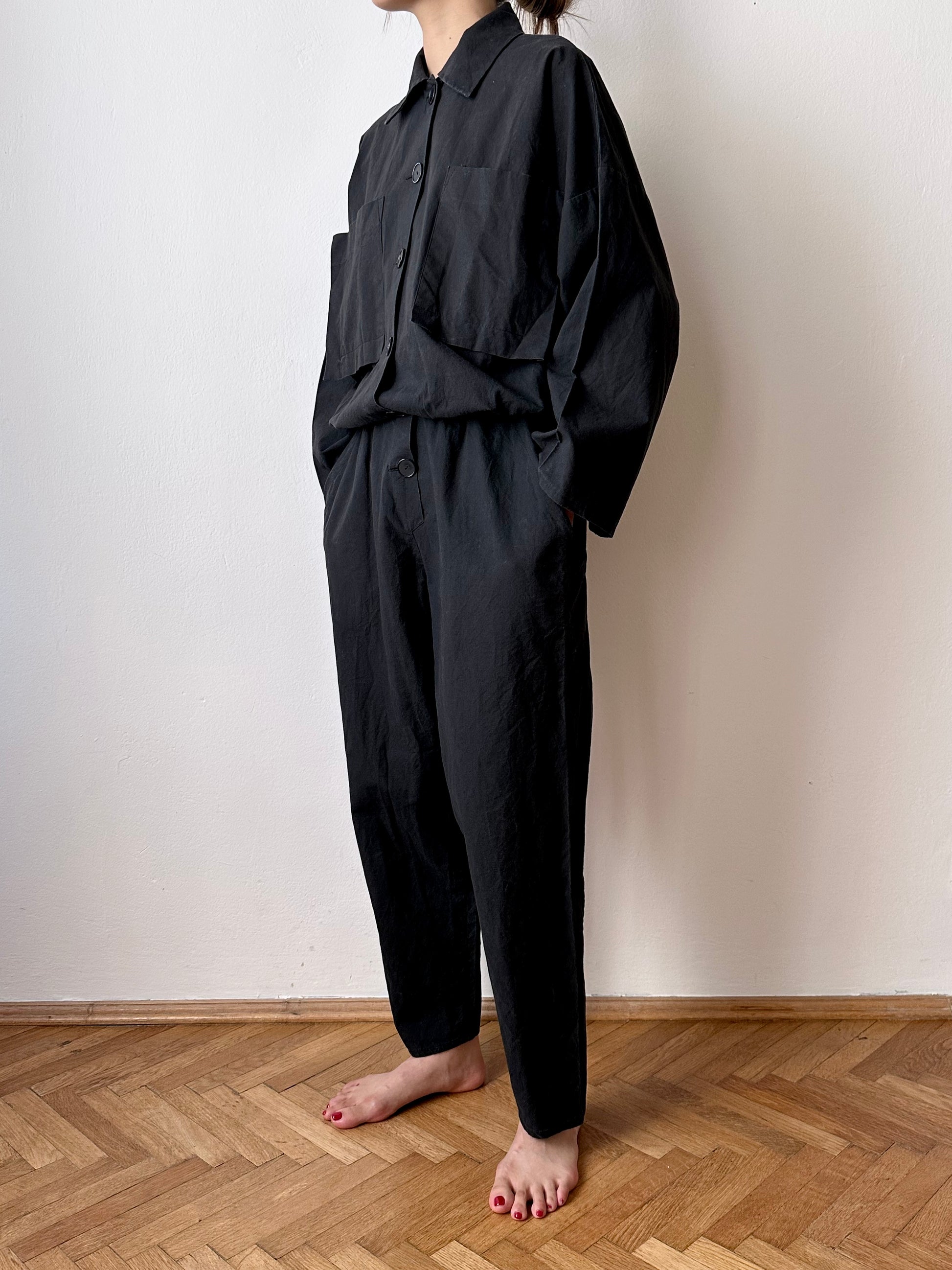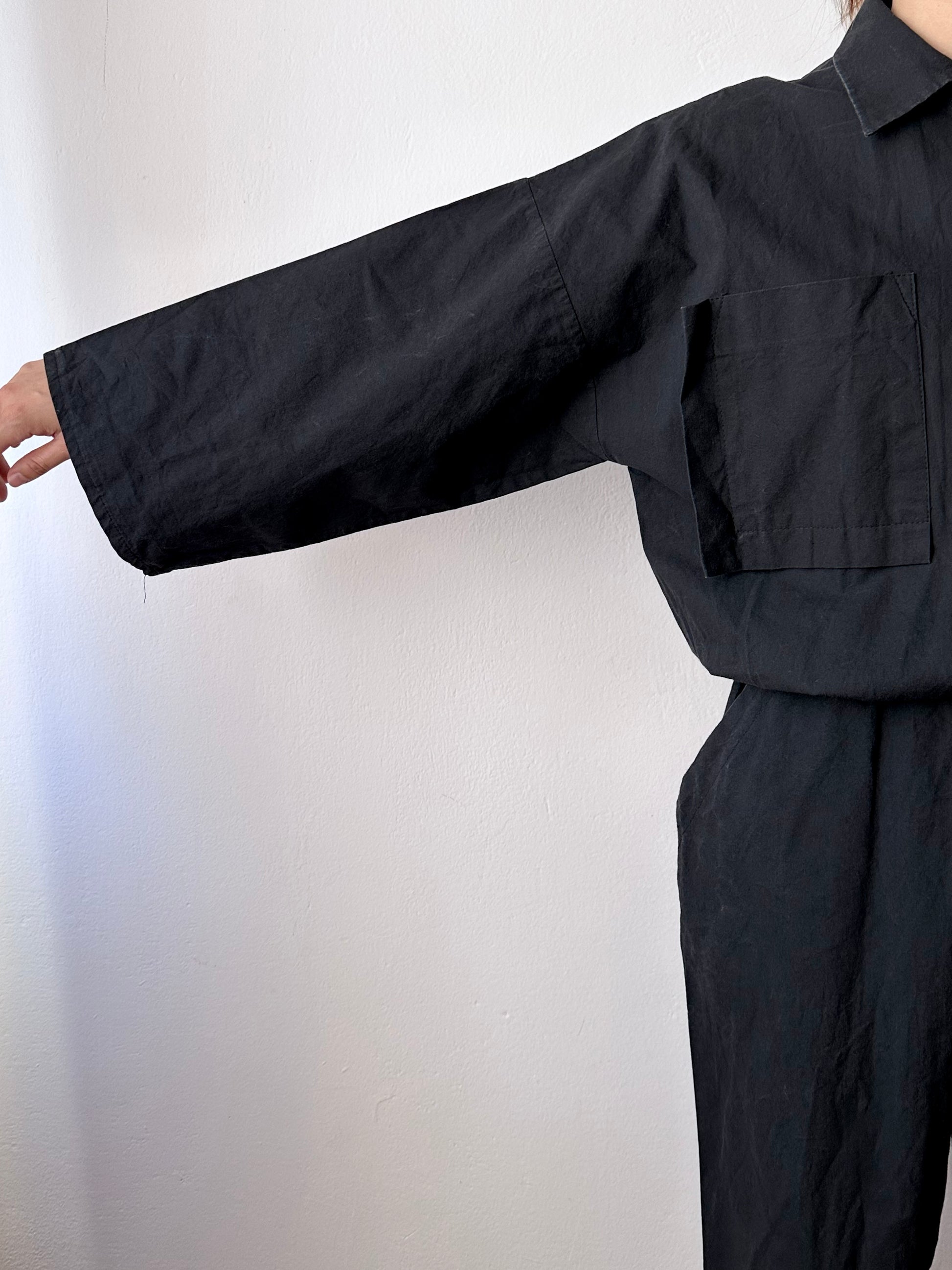 そんな硬めの風合いのあるブラックコットン、着てる自分自身もパリッとさせてくれるような格好良いジャンプスーツです。