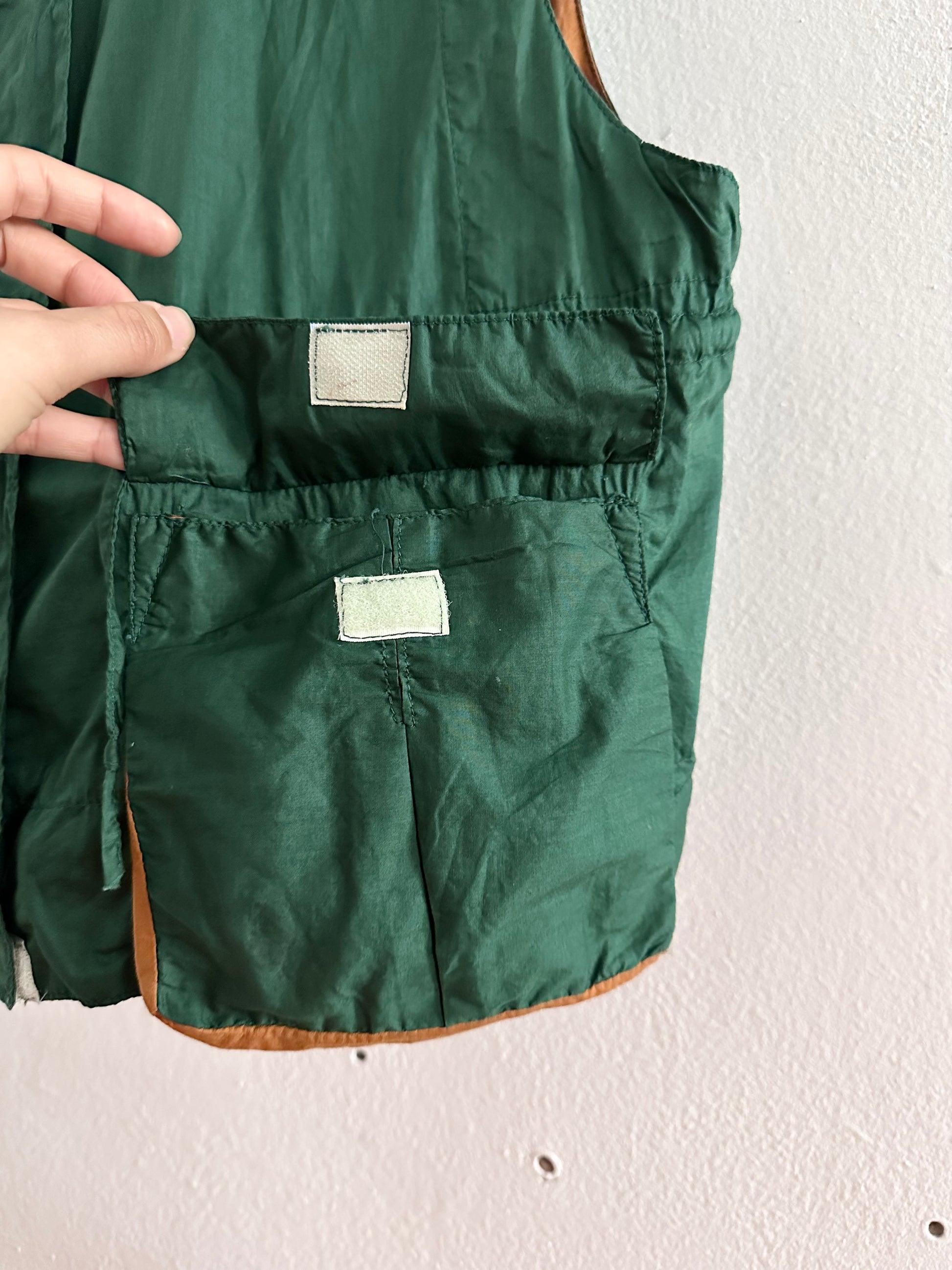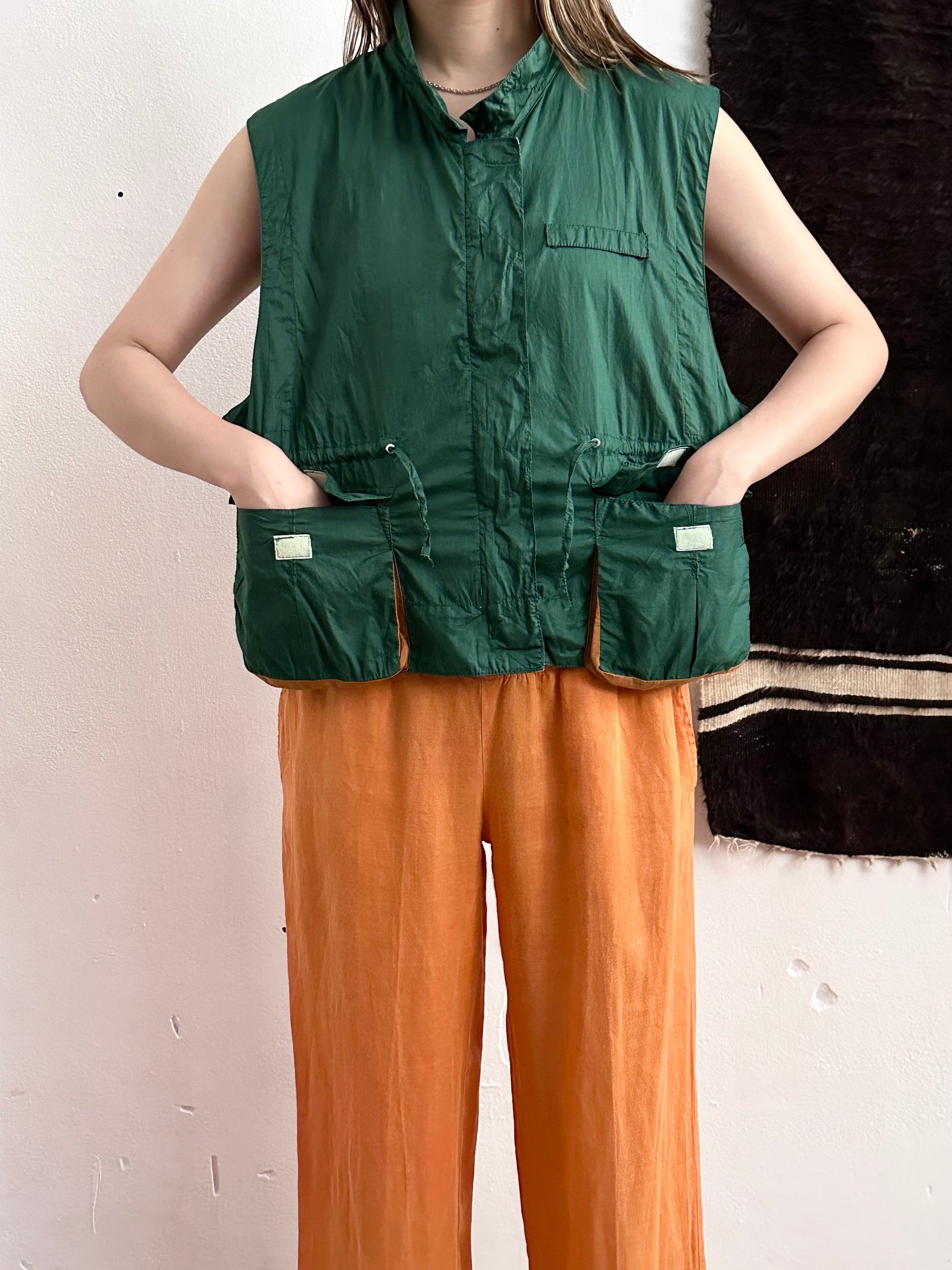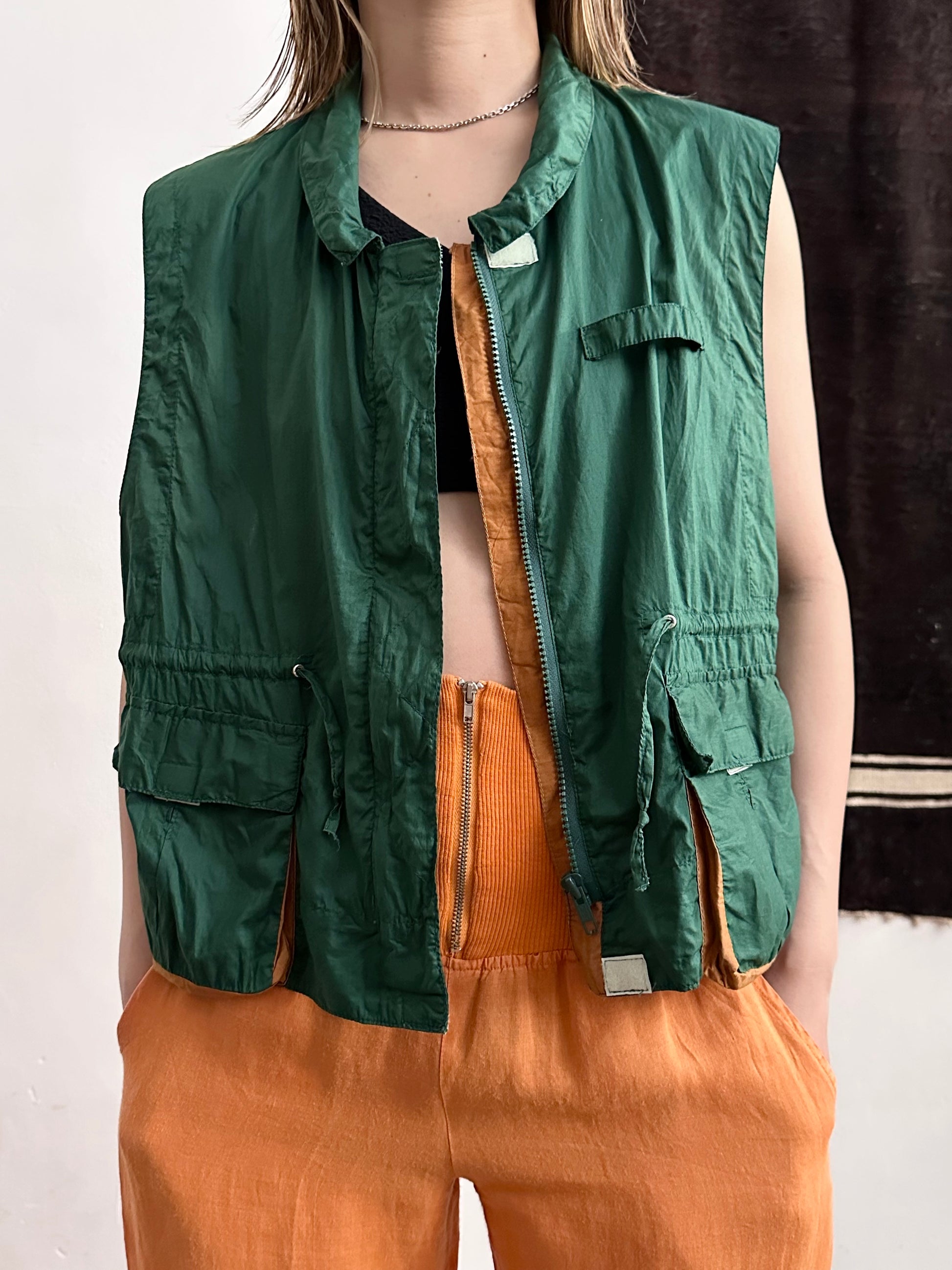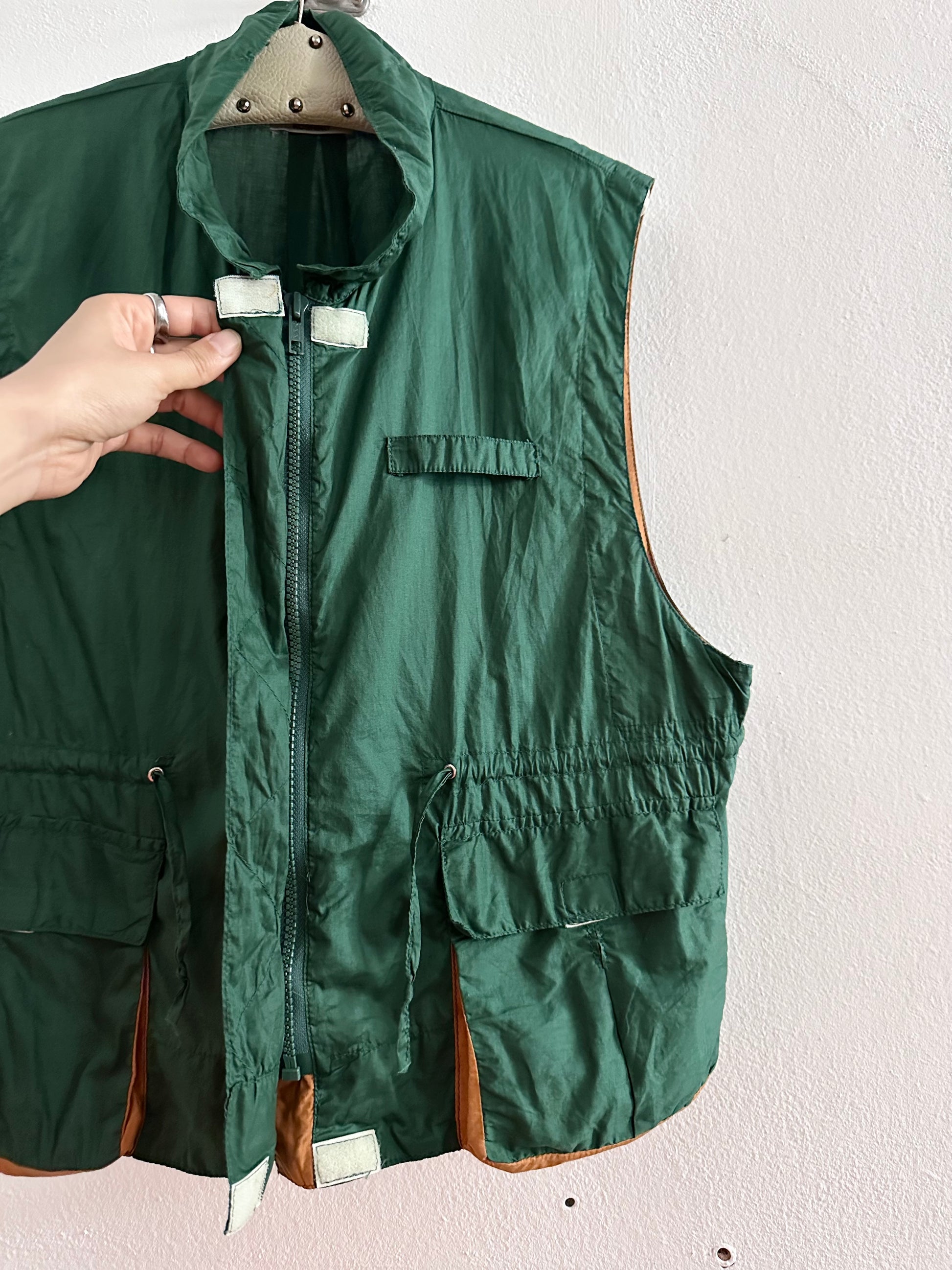 深いフォレストグリーンとオレンジブラウンの、ドラゴンボールのセルみたいなカラーリングで、フィッシャーマンベストにインスパイアされつつストリートに昇華したみたいなクールなベスト。