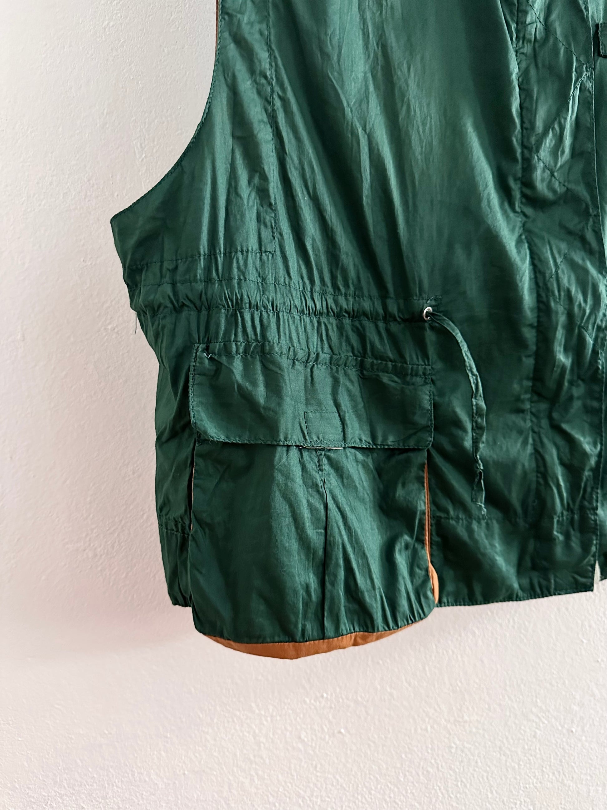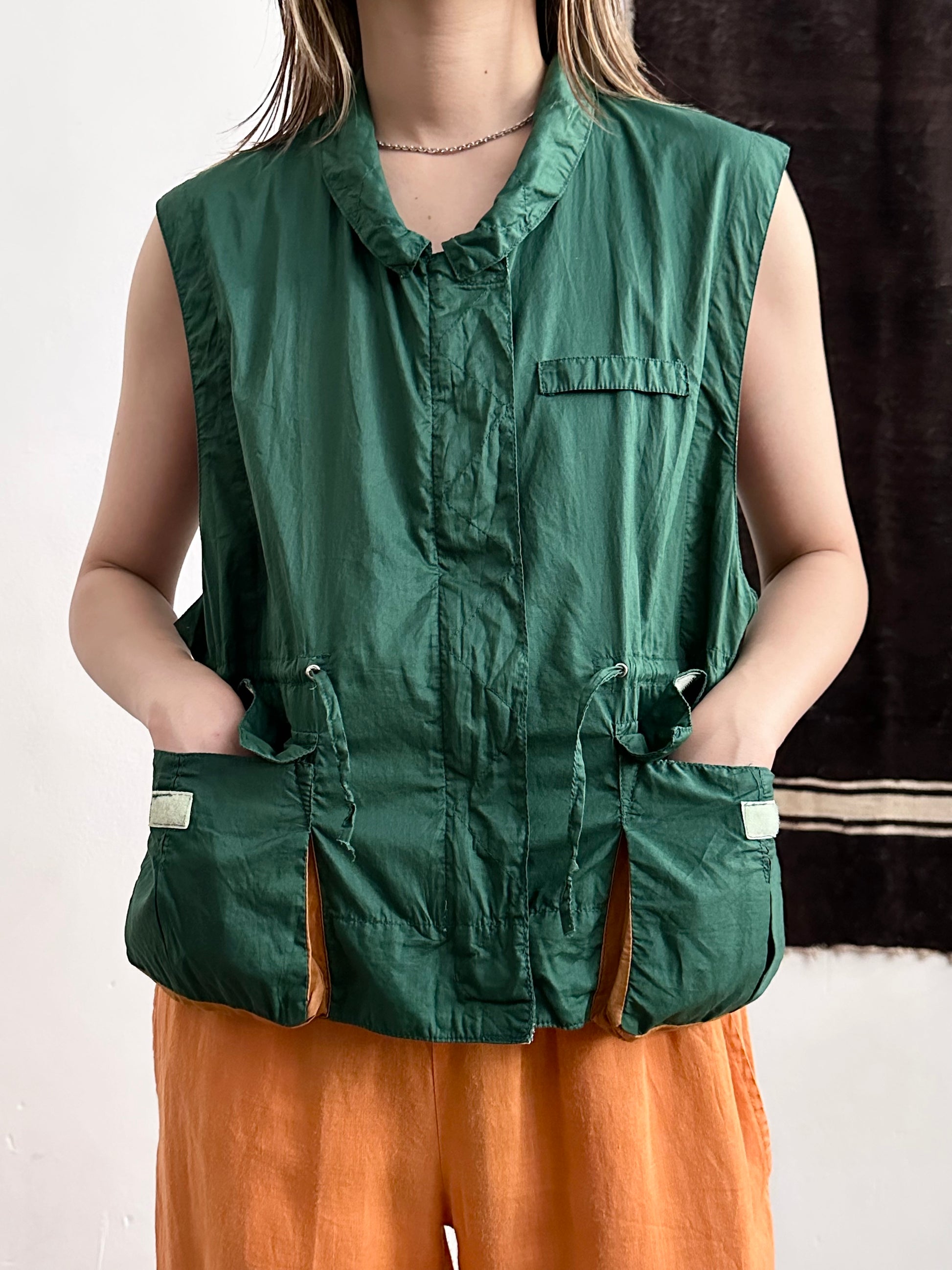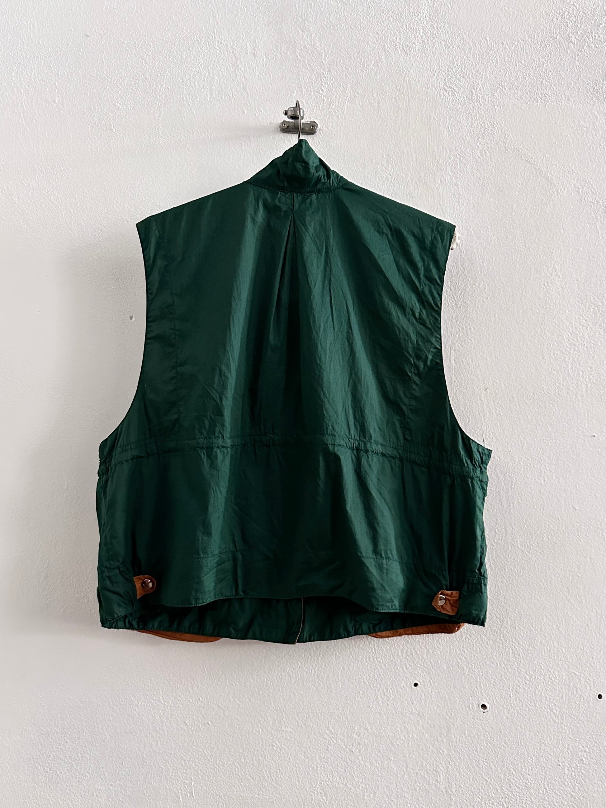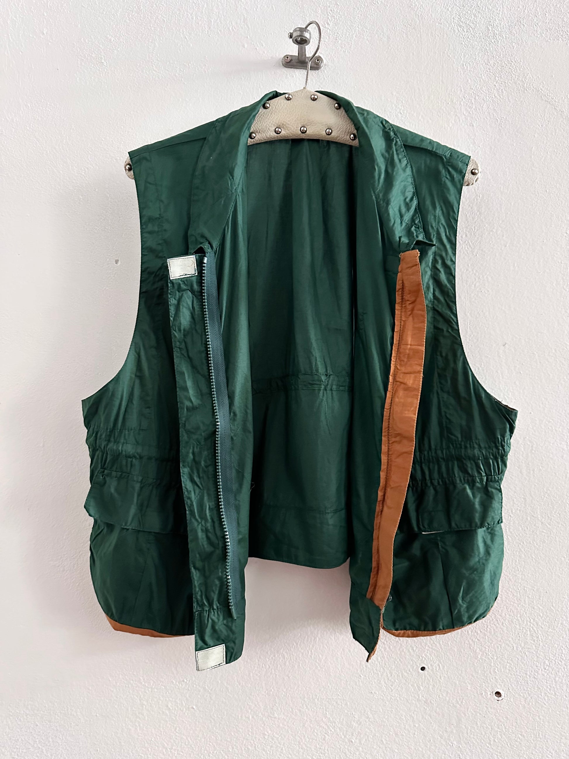 深いフォレストグリーンとオレンジブラウンの、ドラゴンボールのセルみたいなカラーリングで、フィッシャーマンベストにインスパイアされつつストリートに昇華したみたいなクールなベスト。