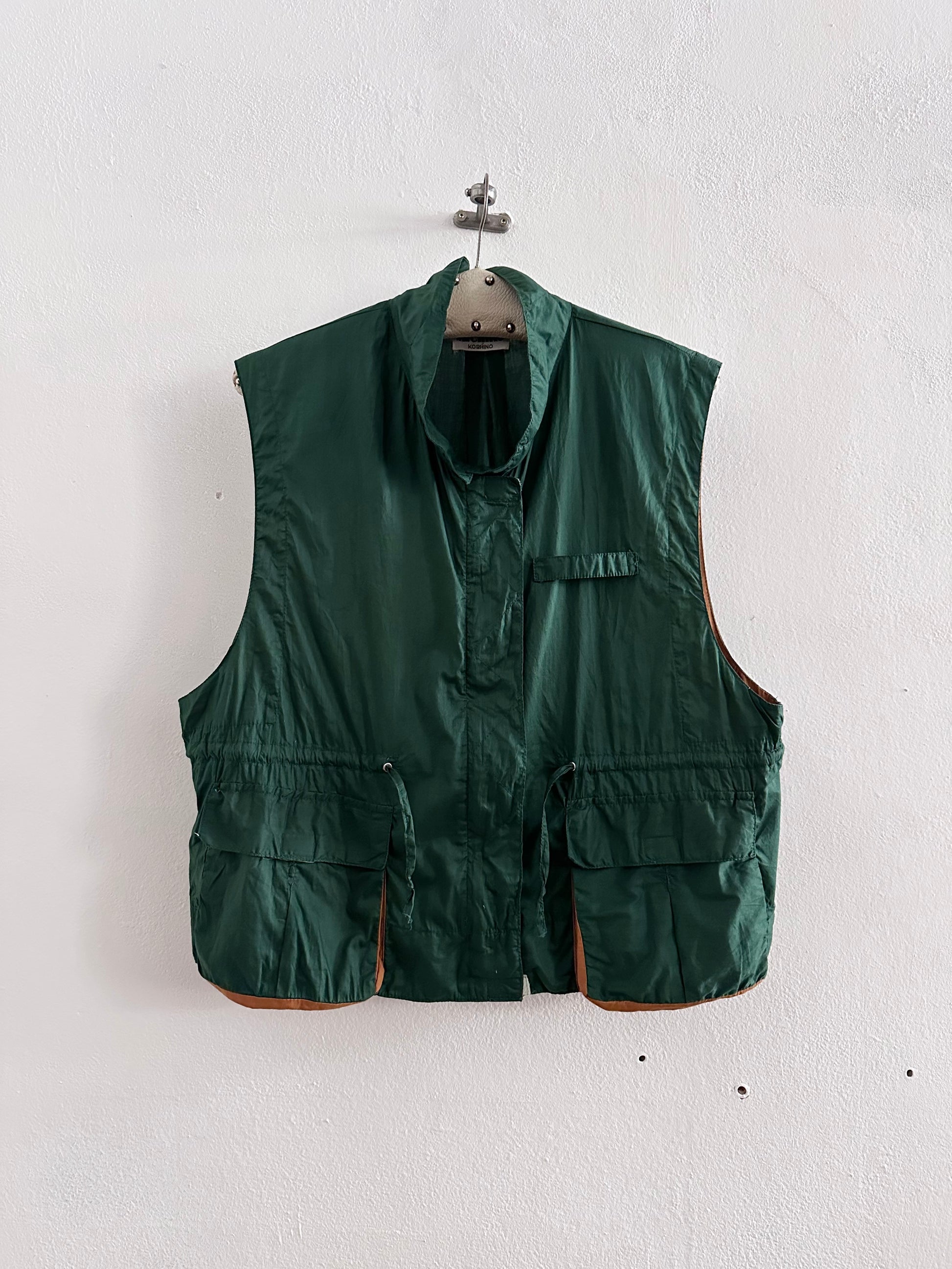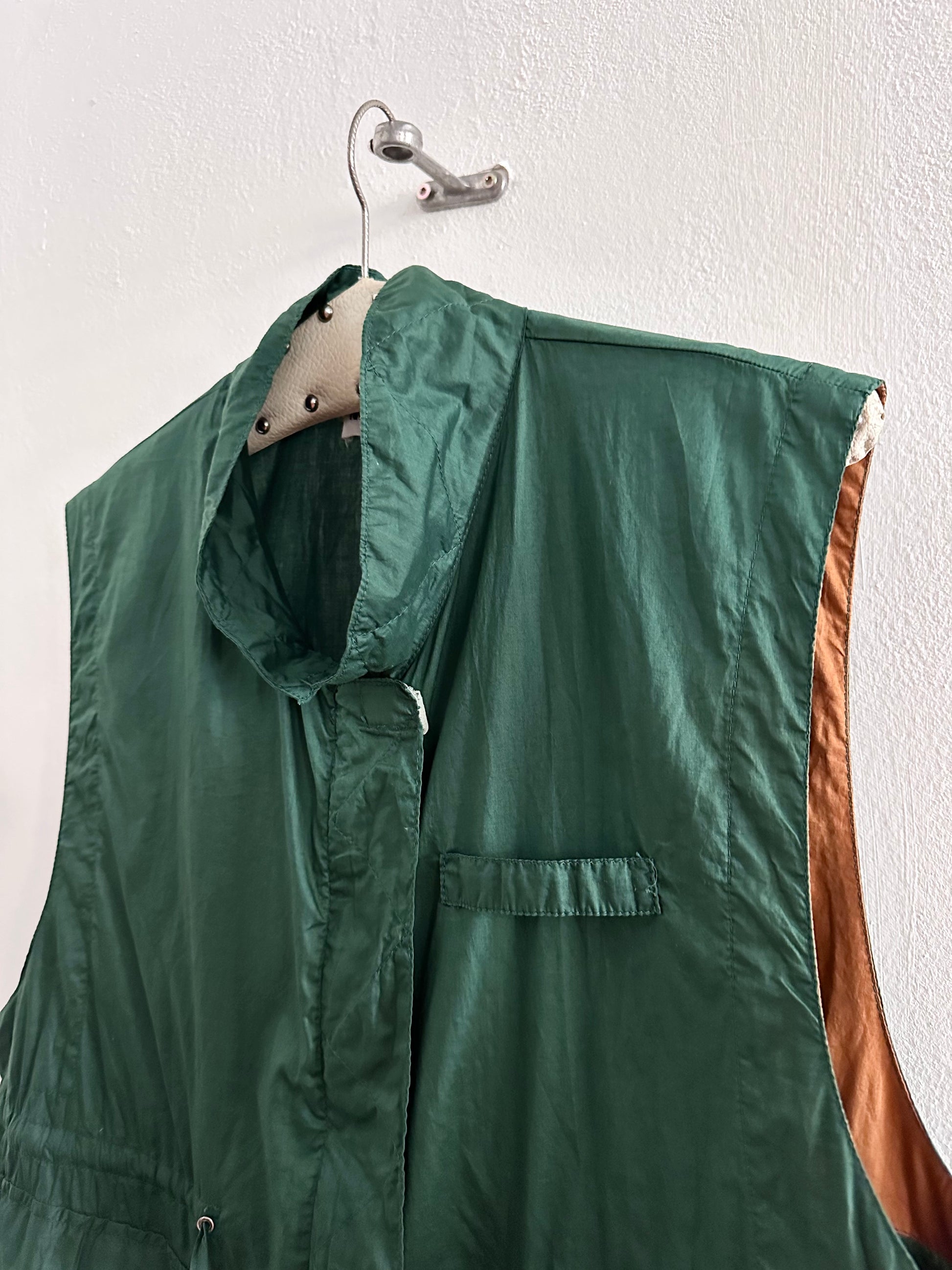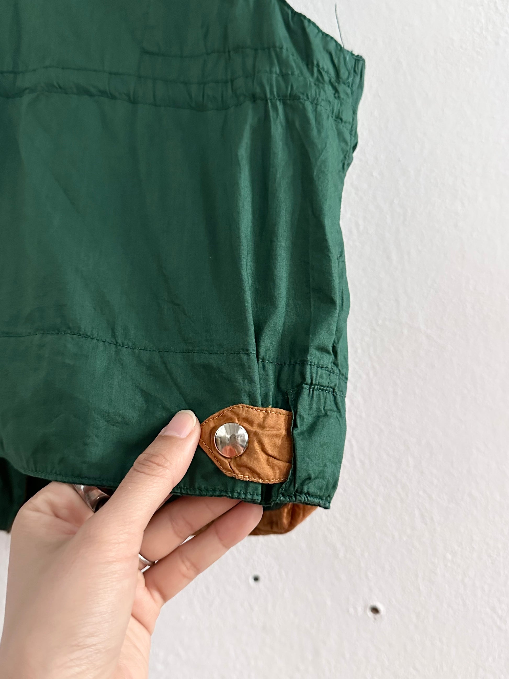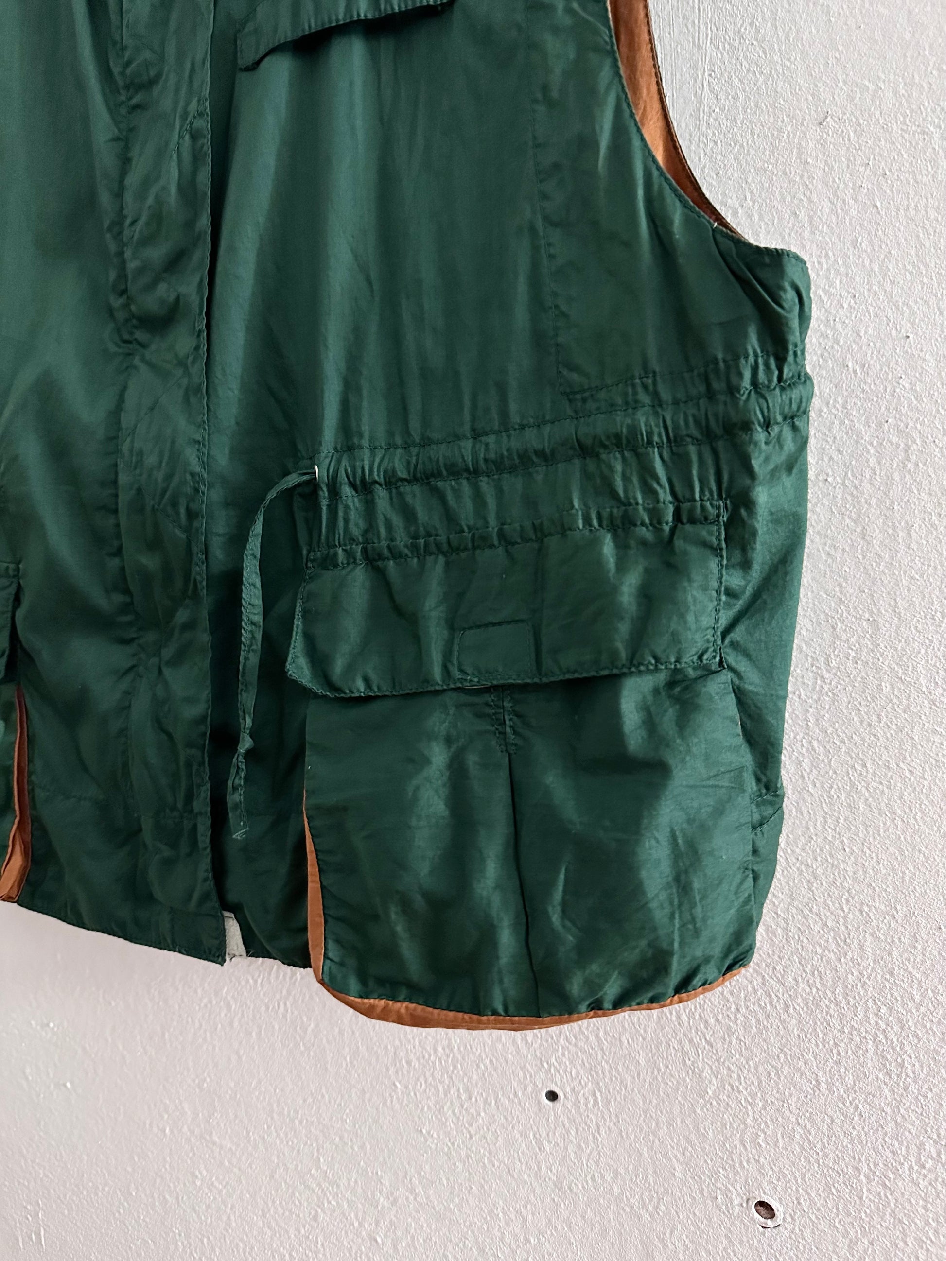深いフォレストグリーンとオレンジブラウンの、ドラゴンボールのセルみたいなカラーリングで、フィッシャーマンベストにインスパイアされつつストリートに昇華したみたいなクールなベスト。