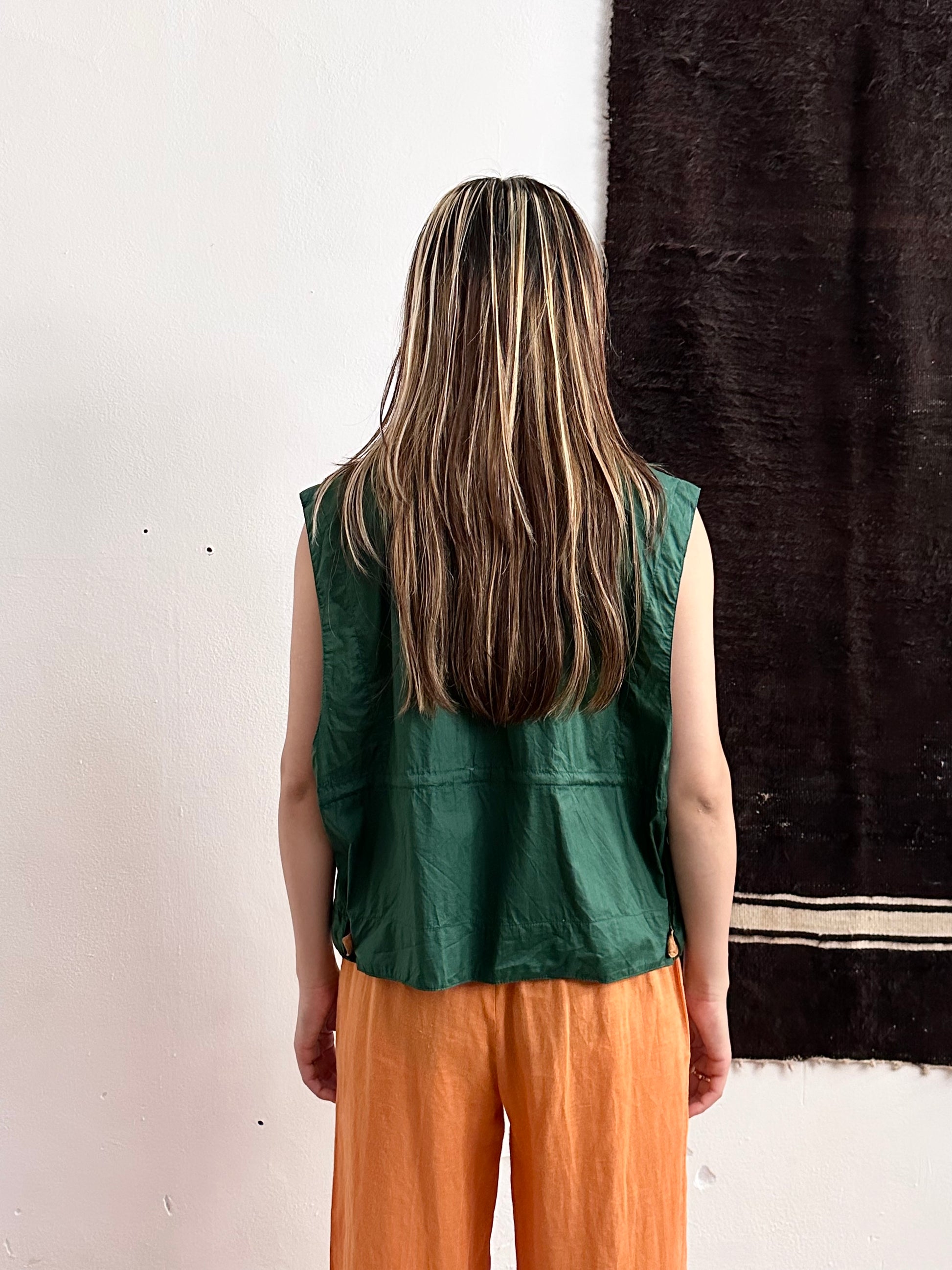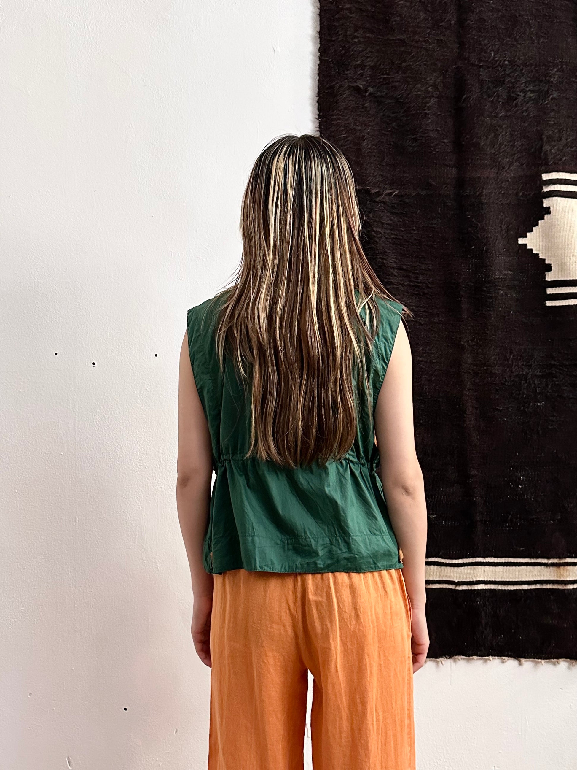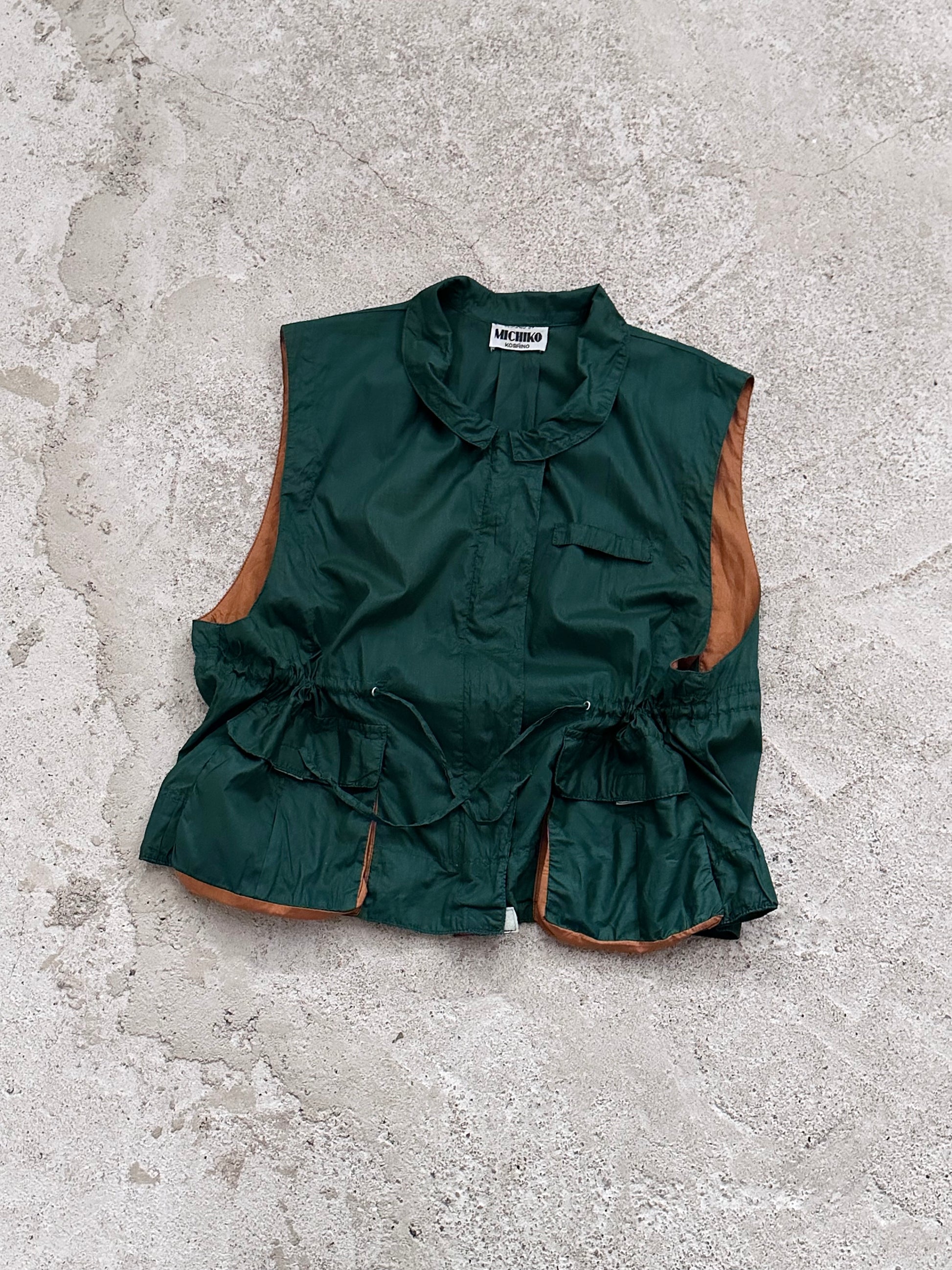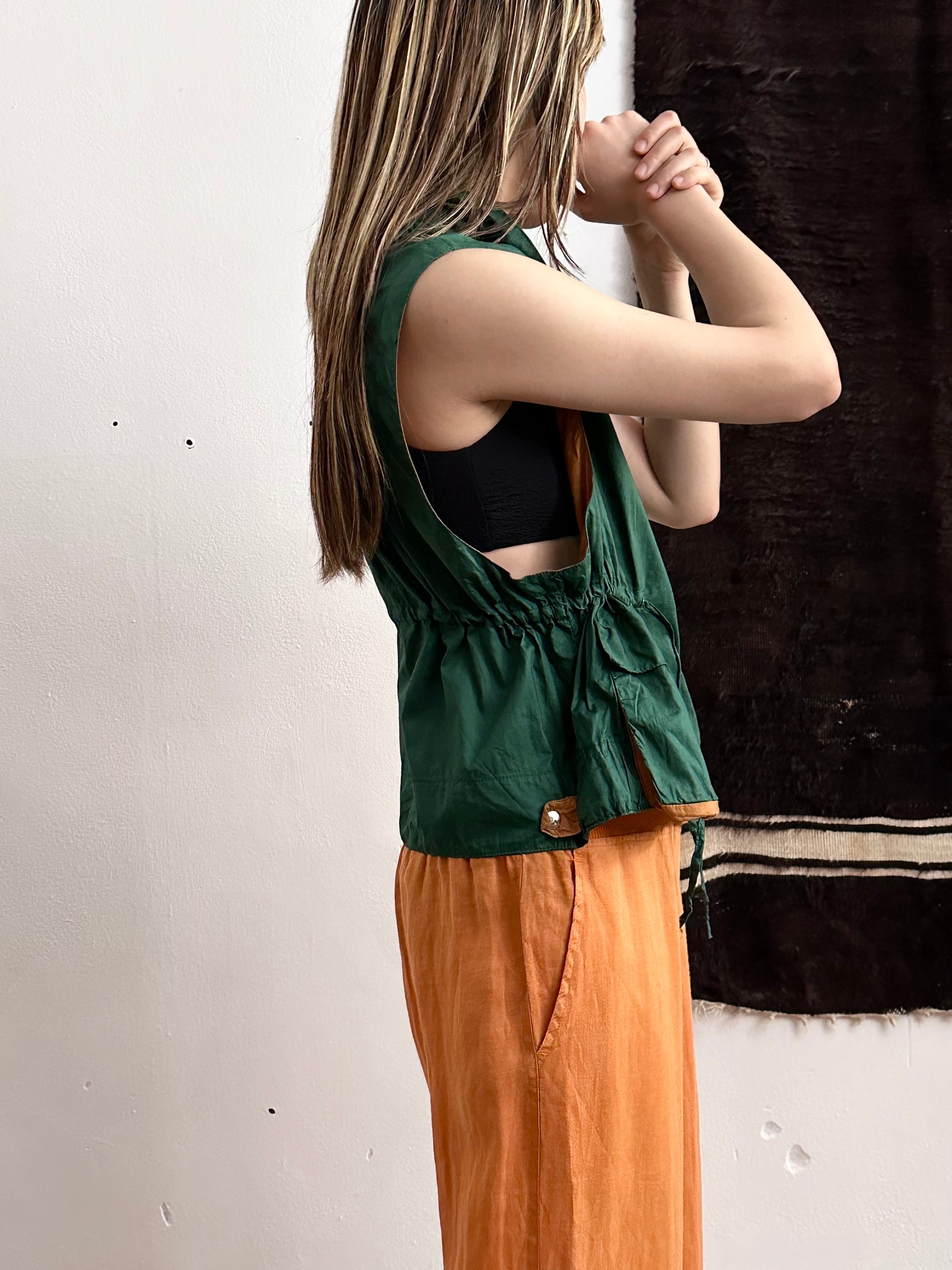 深いフォレストグリーンとオレンジブラウンの、ドラゴンボールのセルみたいなカラーリングで、フィッシャーマンベストにインスパイアされつつストリートに昇華したみたいなクールなベスト。