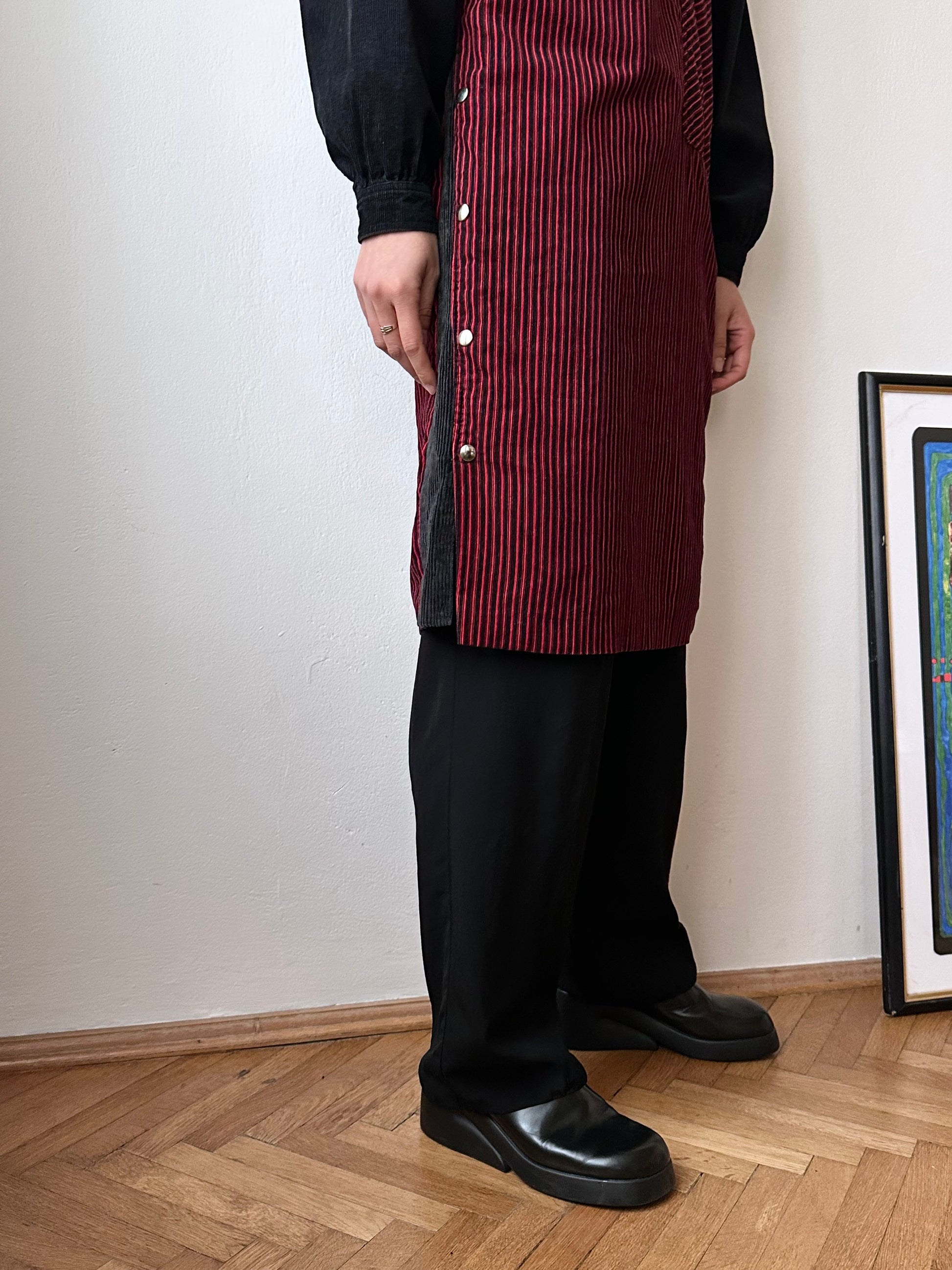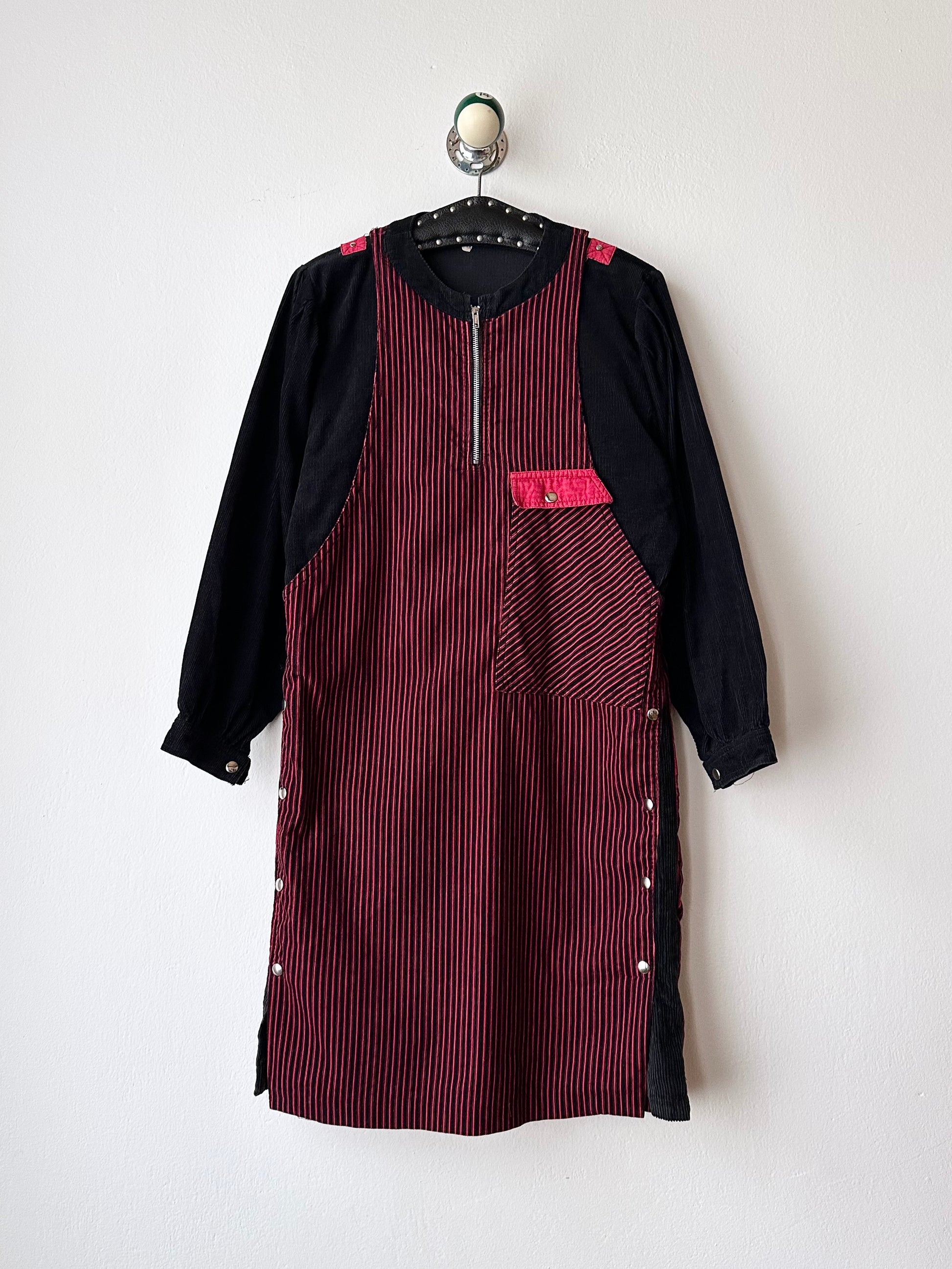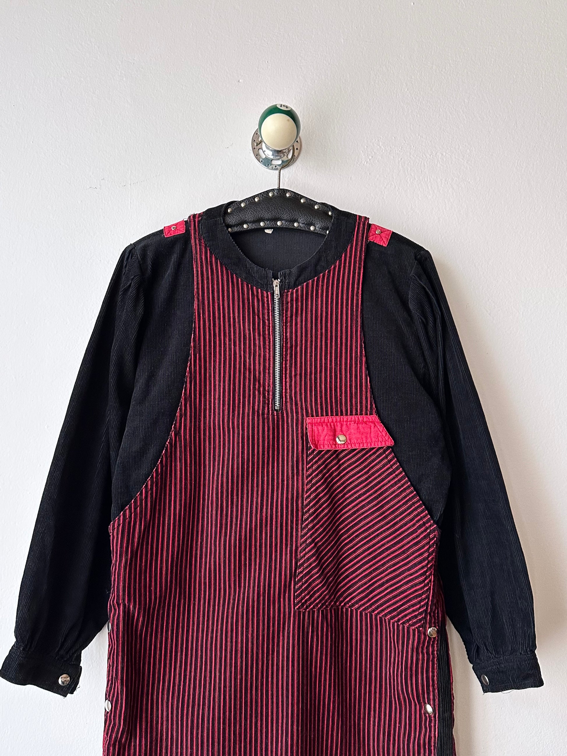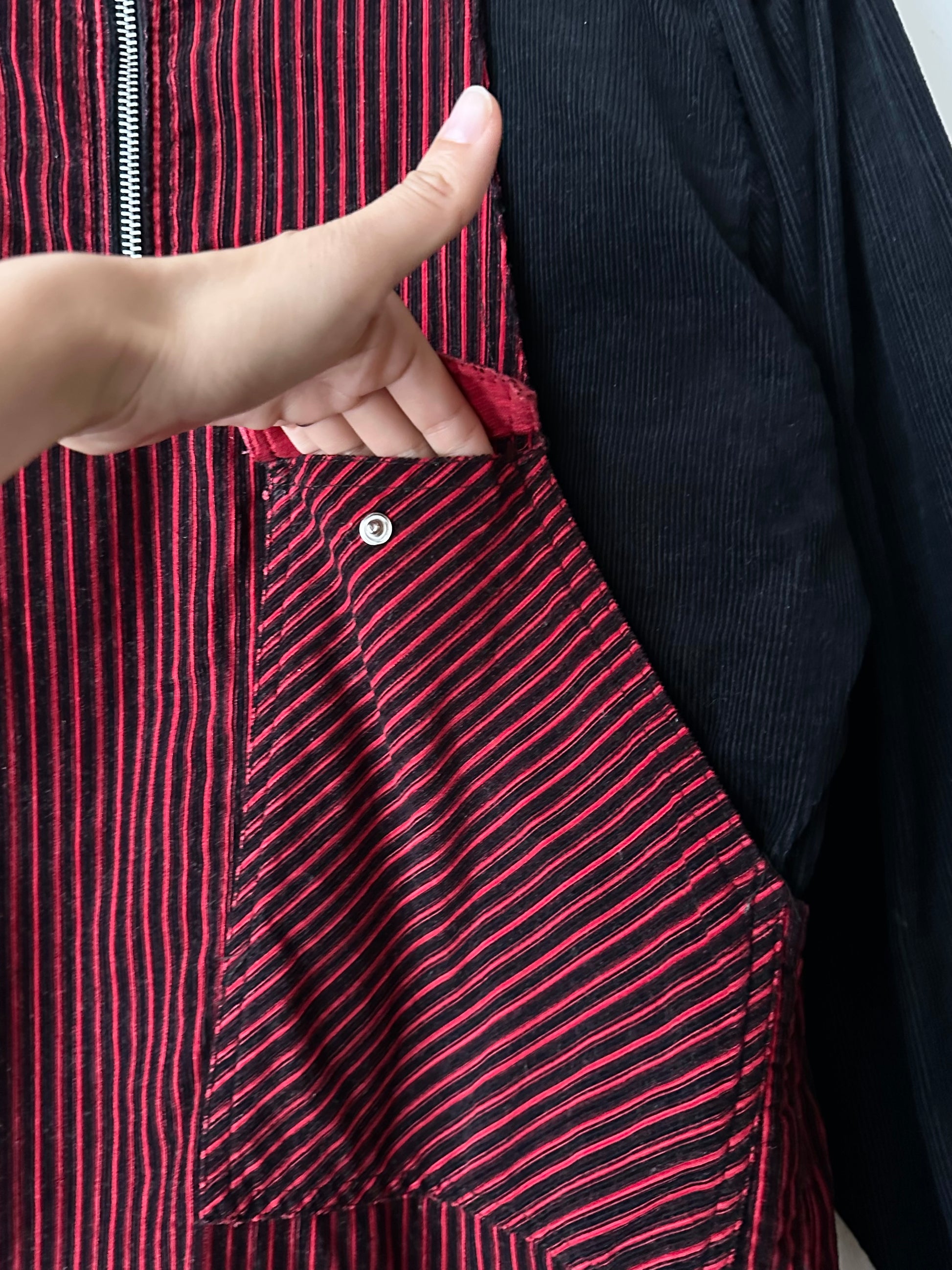 ブラックと、赤黒ストライプの細畝コーデュロイをドッキング、