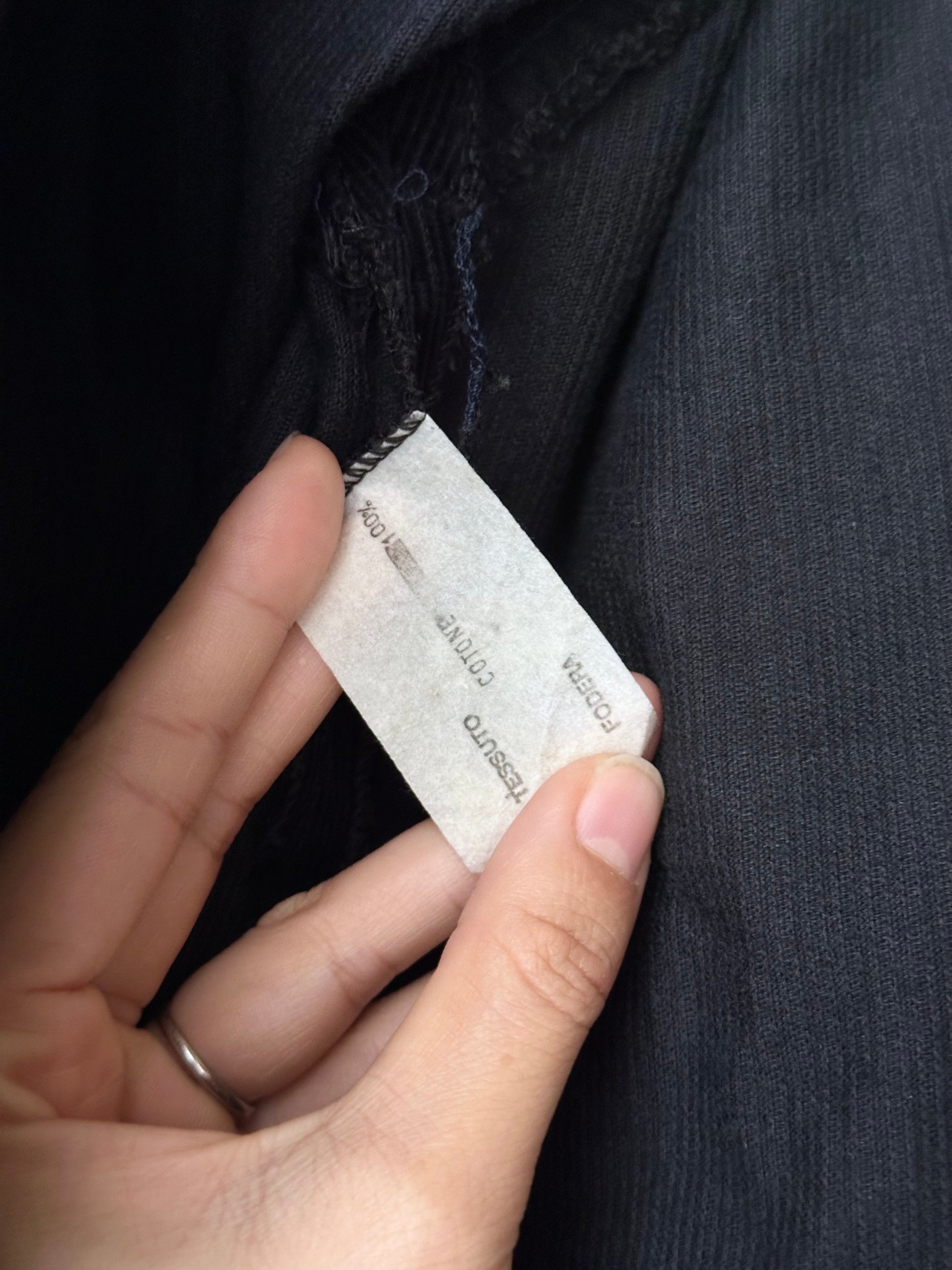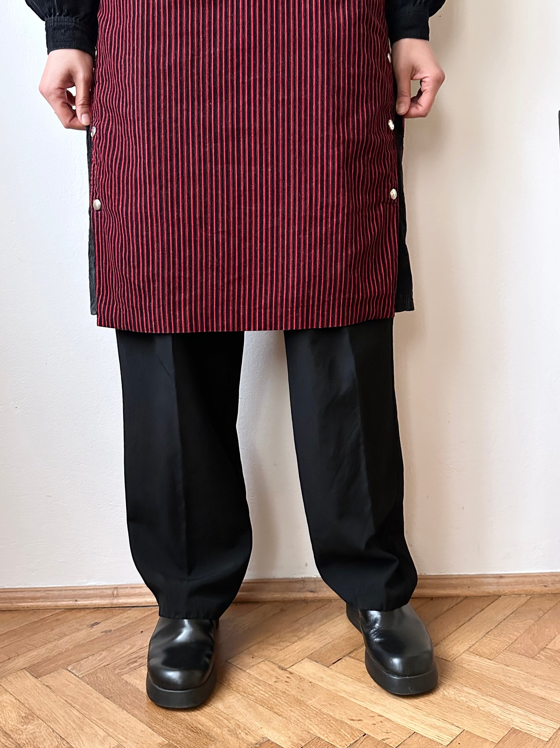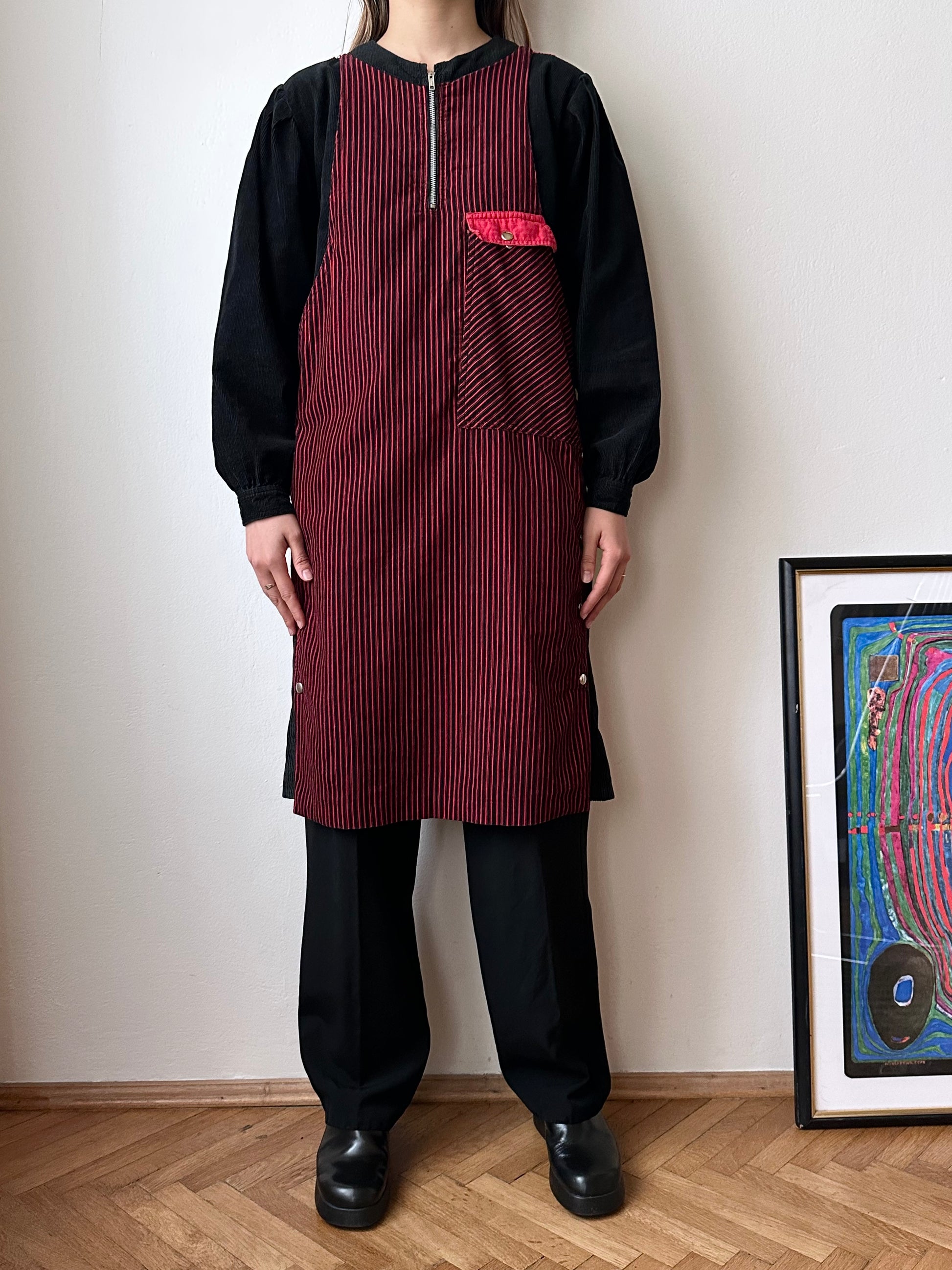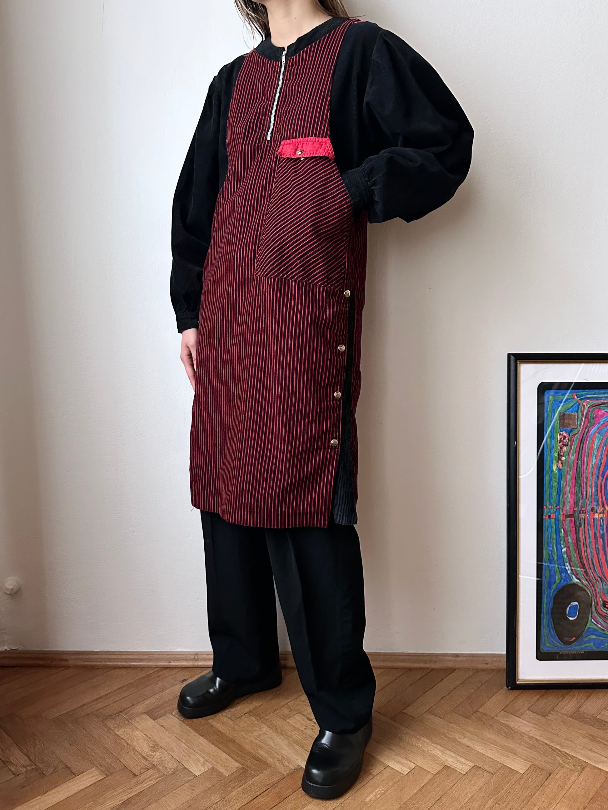 ブラックと、赤黒ストライプの細畝コーデュロイをドッキング、