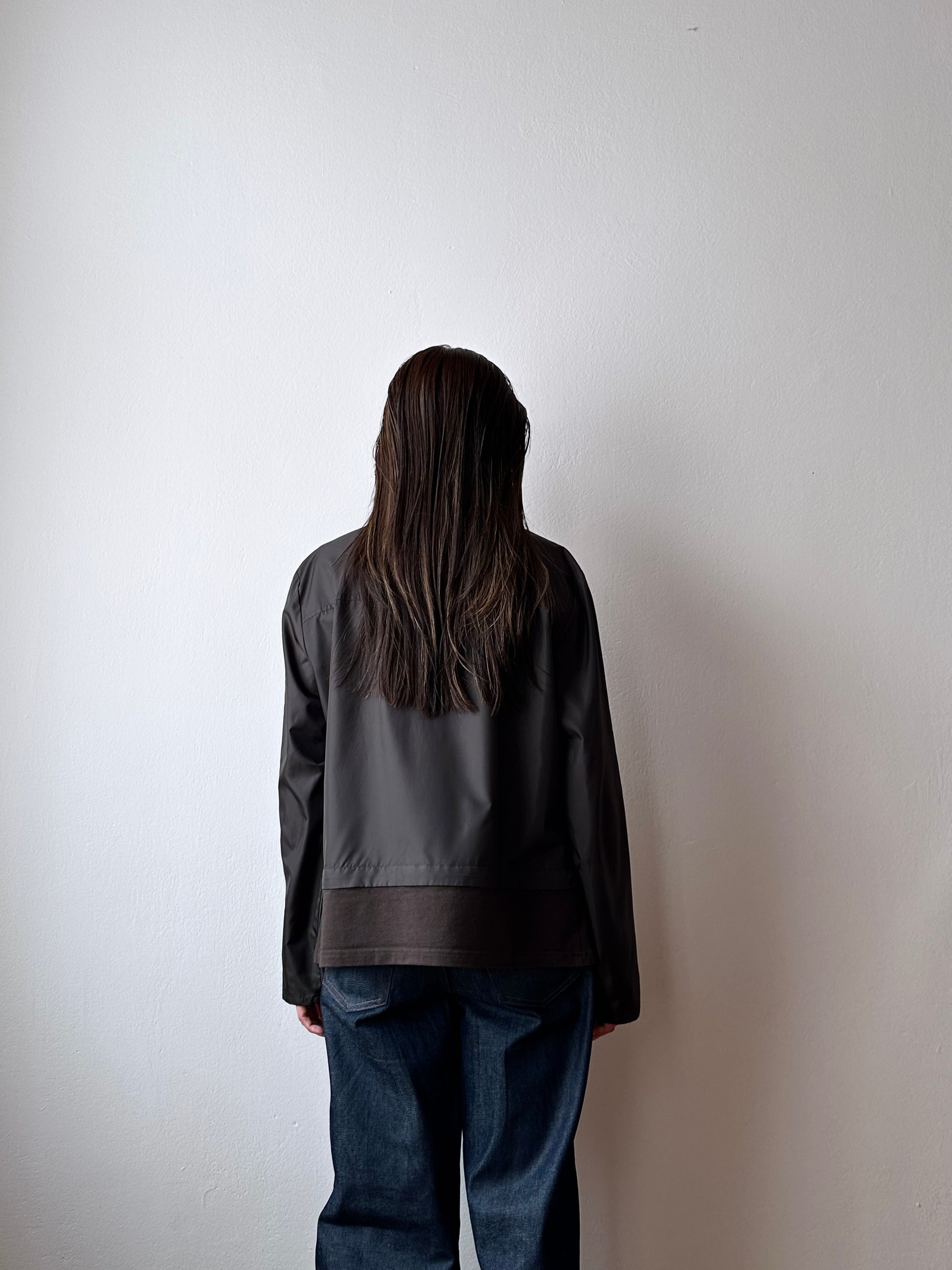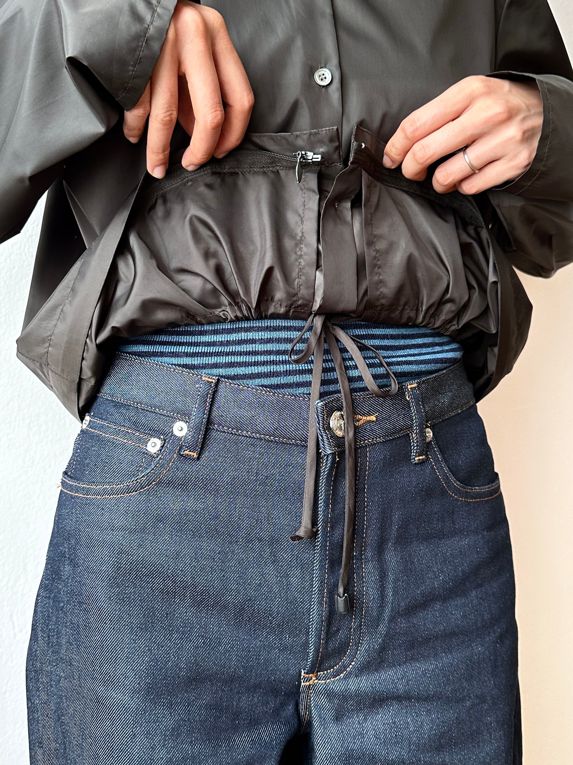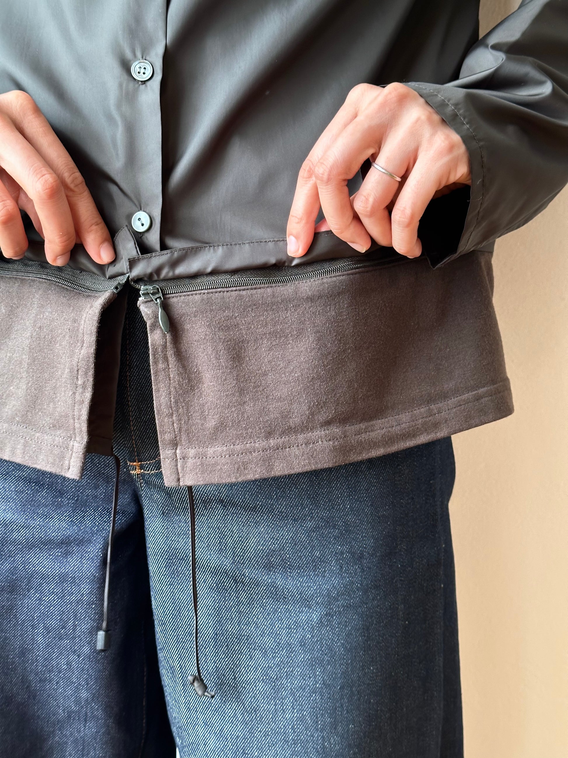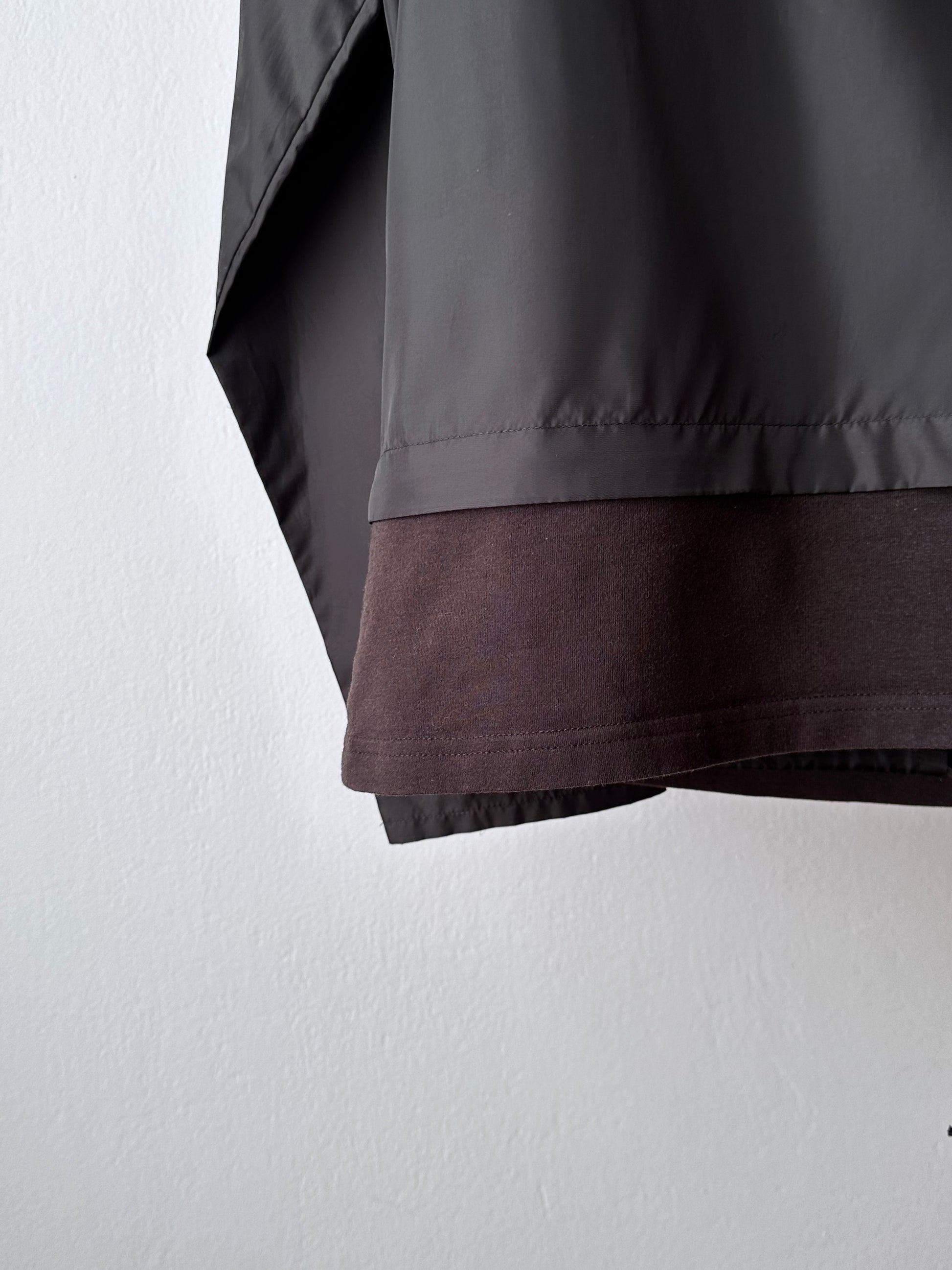 ジップで外すことができて、その下には同じポリーの素材付き。ドローコードを縛ると隠れて、上部だけの丈感になります。