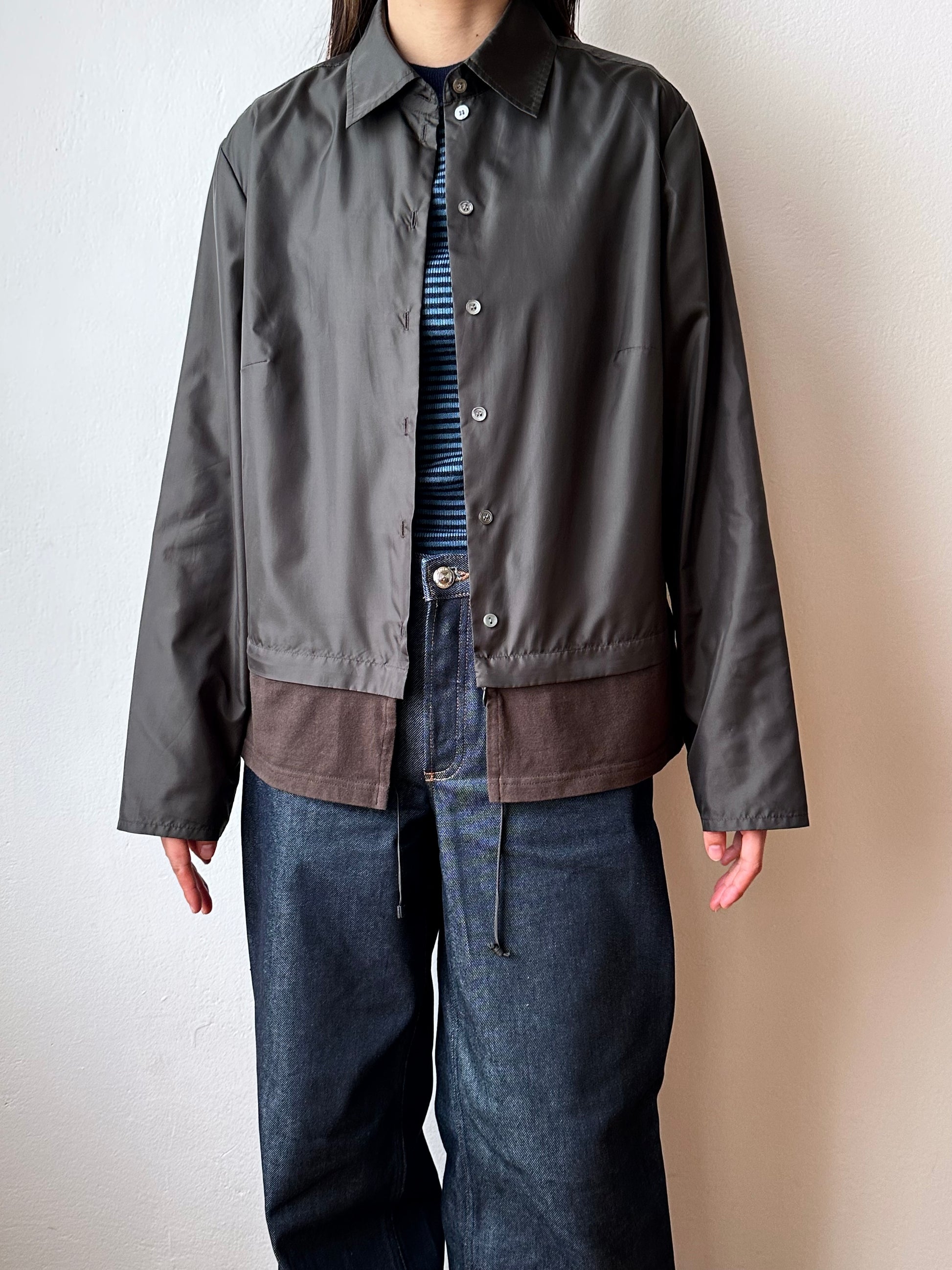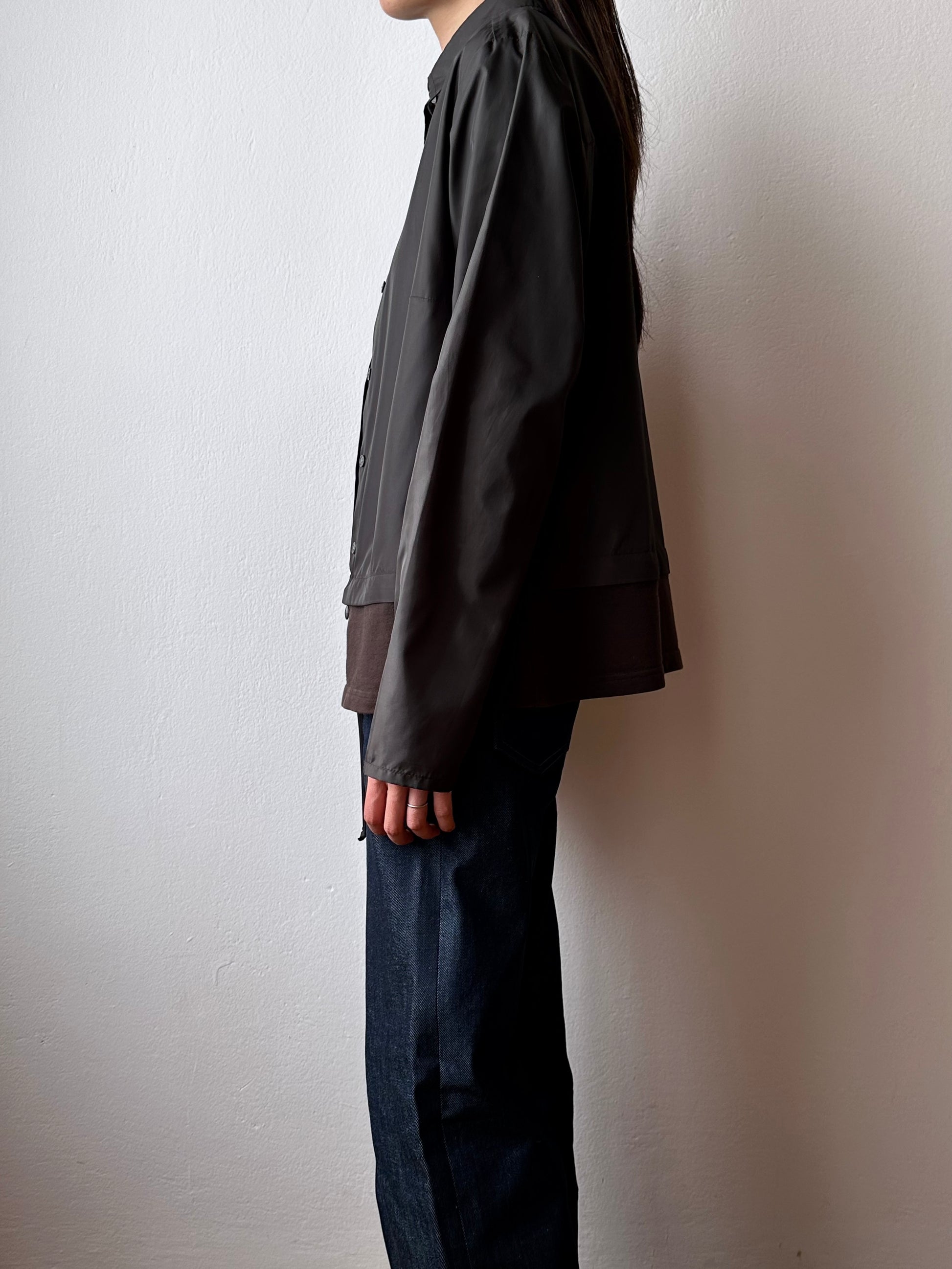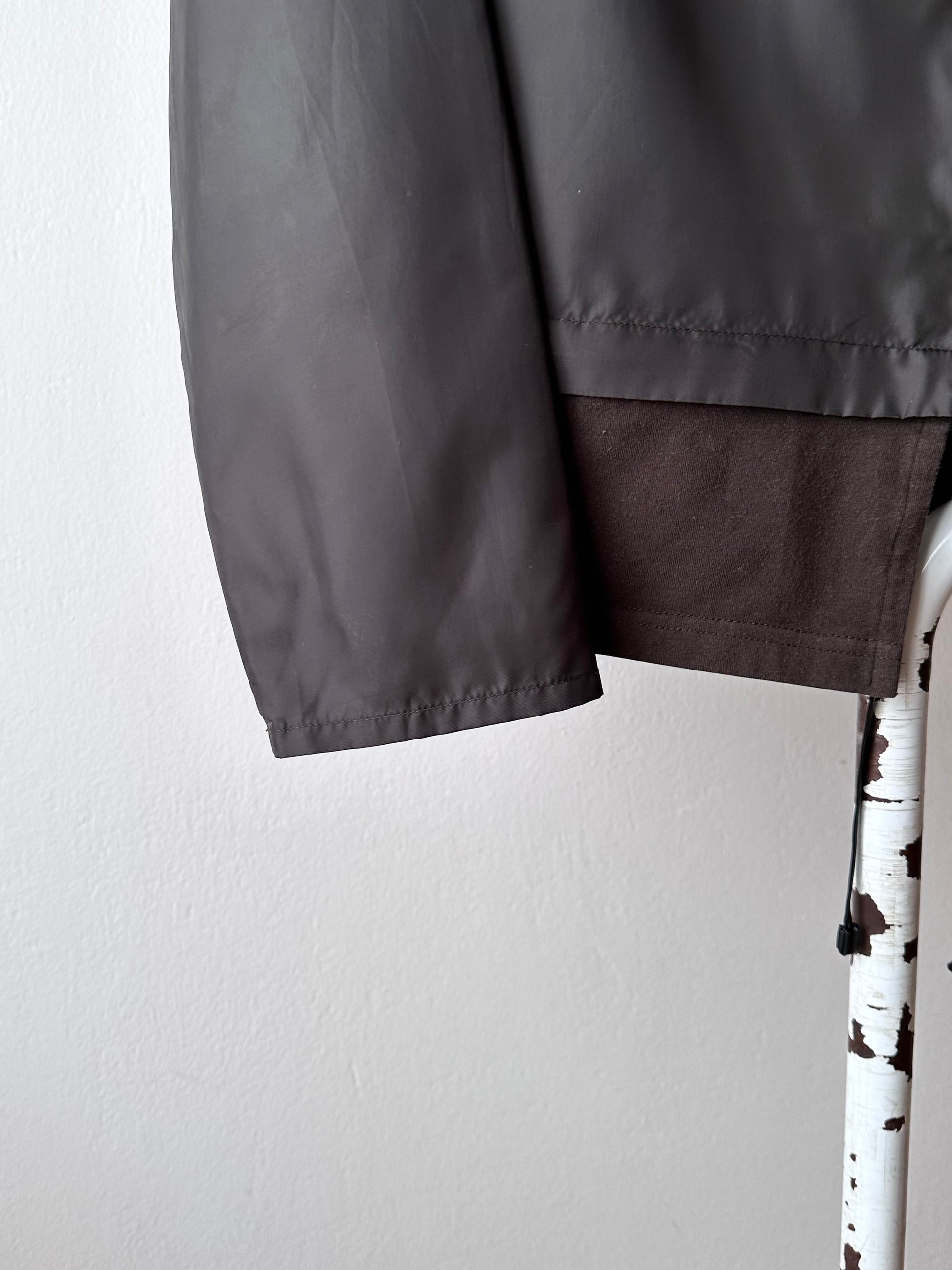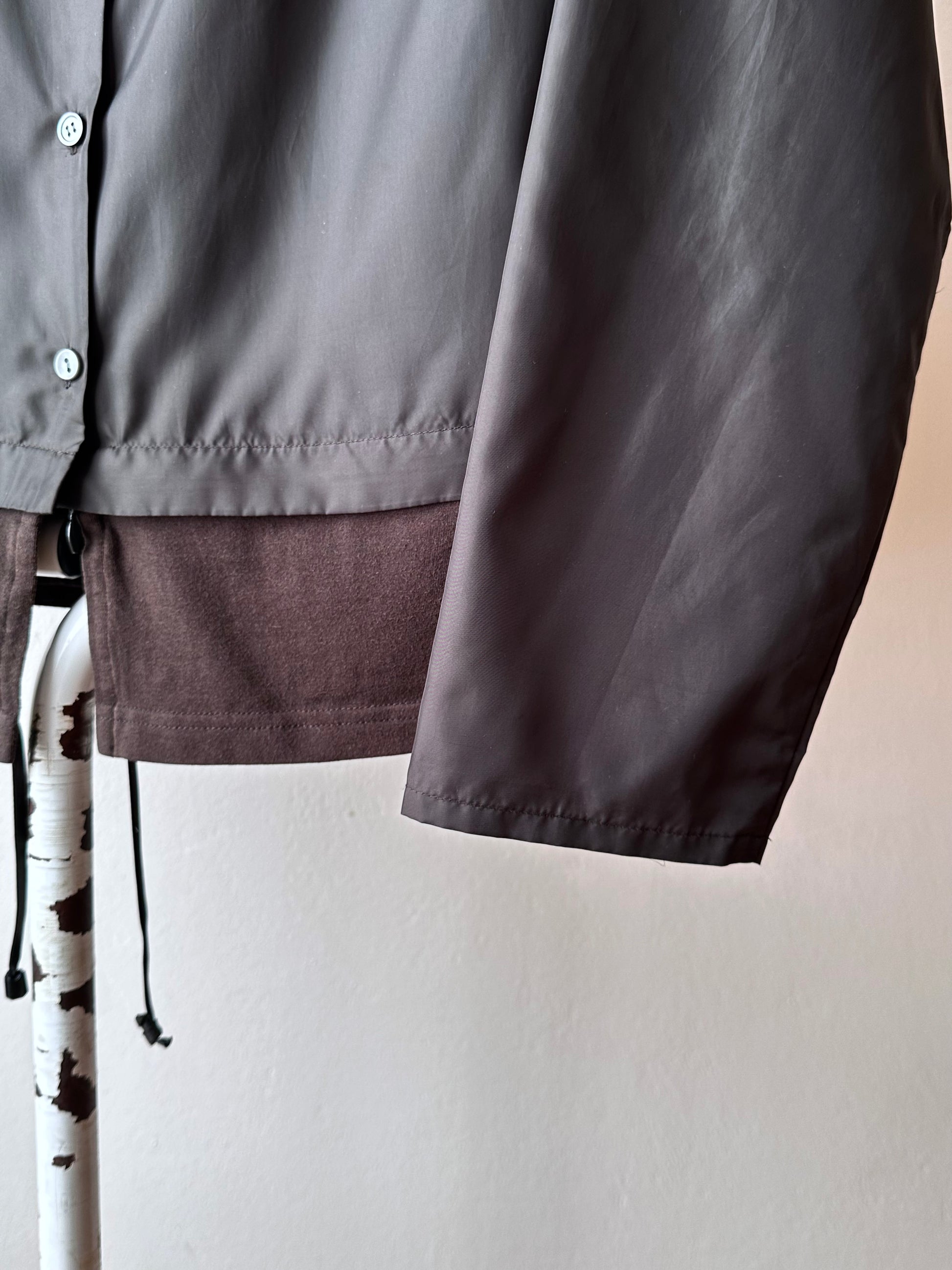ジップで外すことができて、その下には同じポリーの素材付き。ドローコードを縛ると隠れて、上部だけの丈感になります。