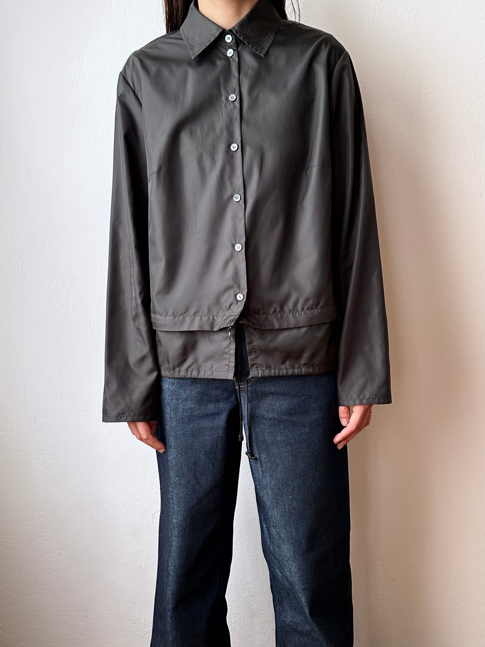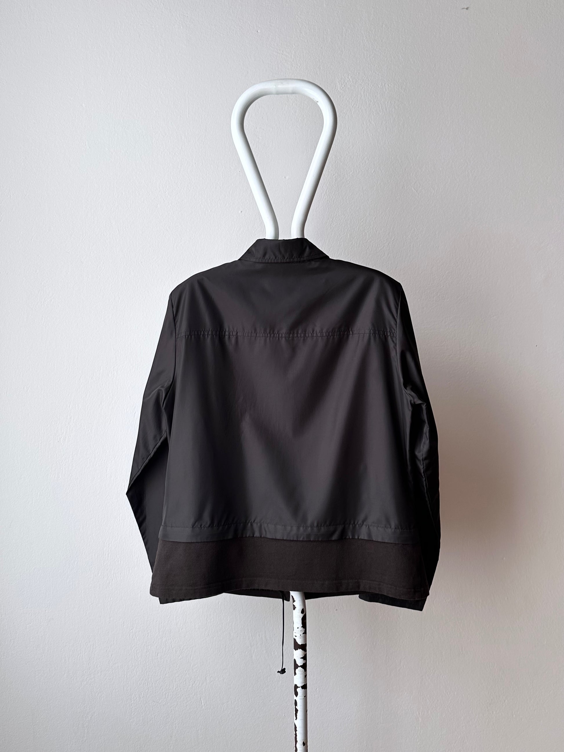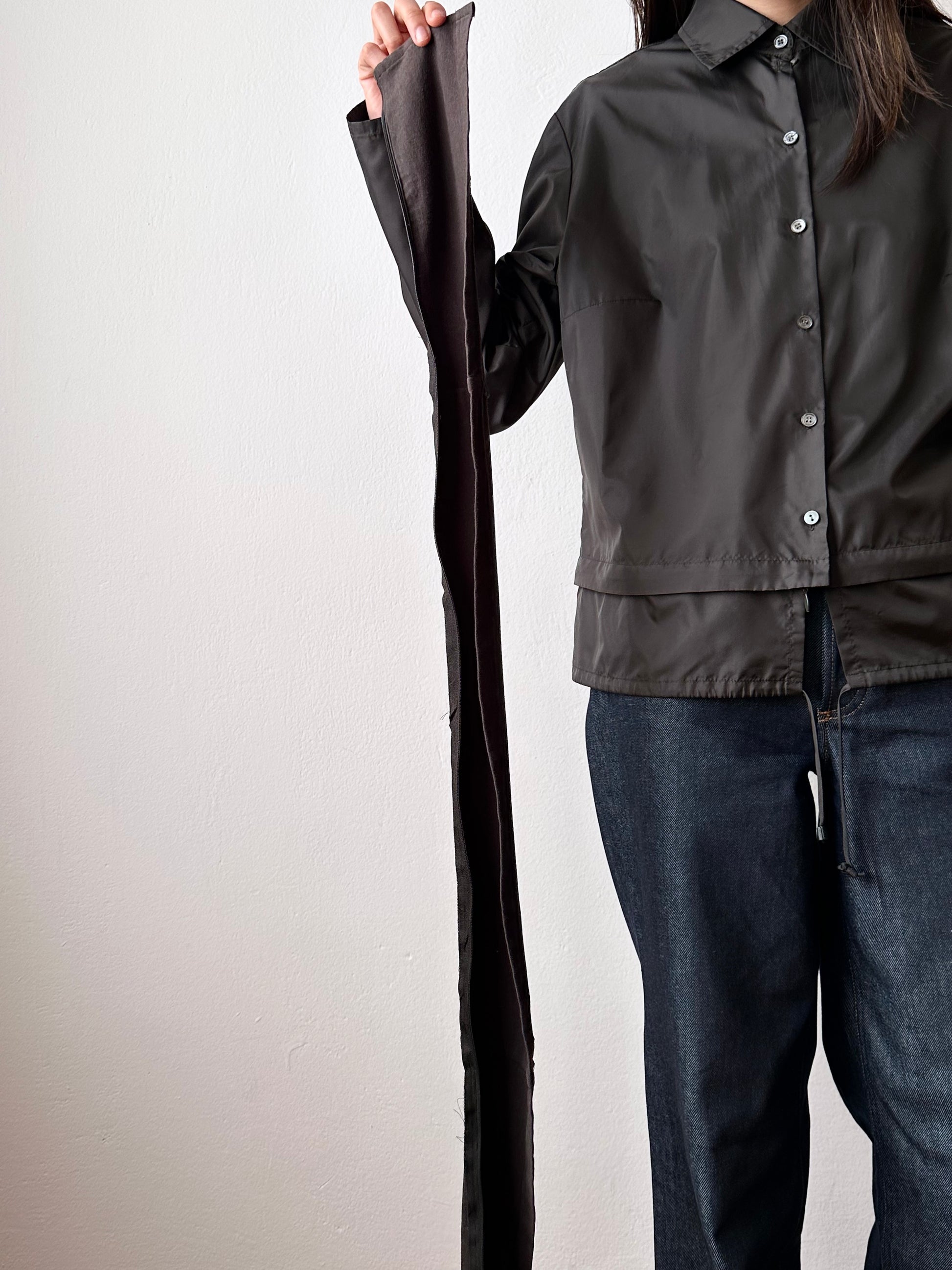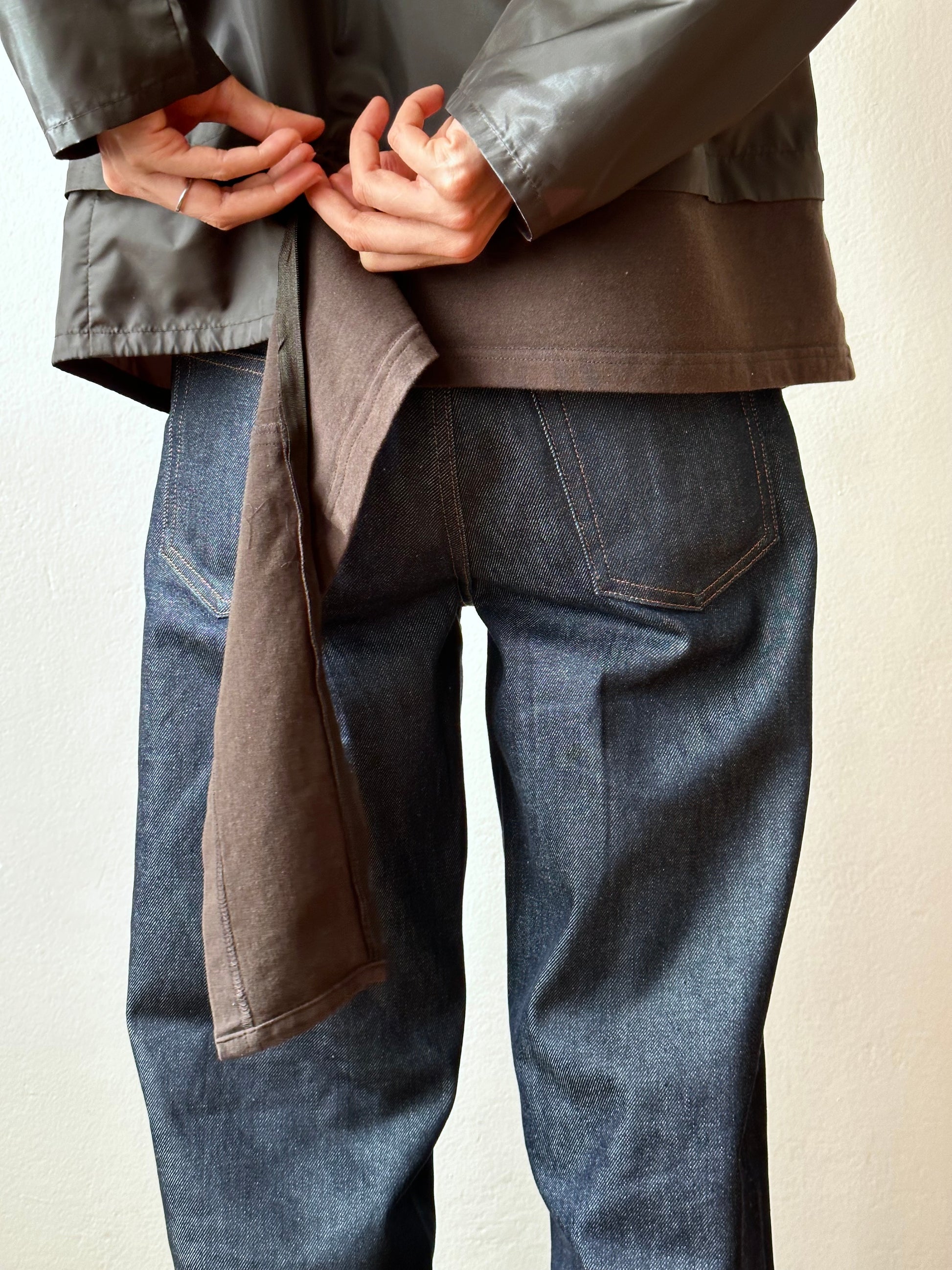 ジップで外すことができて、その下には同じポリーの素材付き。ドローコードを縛ると隠れて、上部だけの丈感になります。