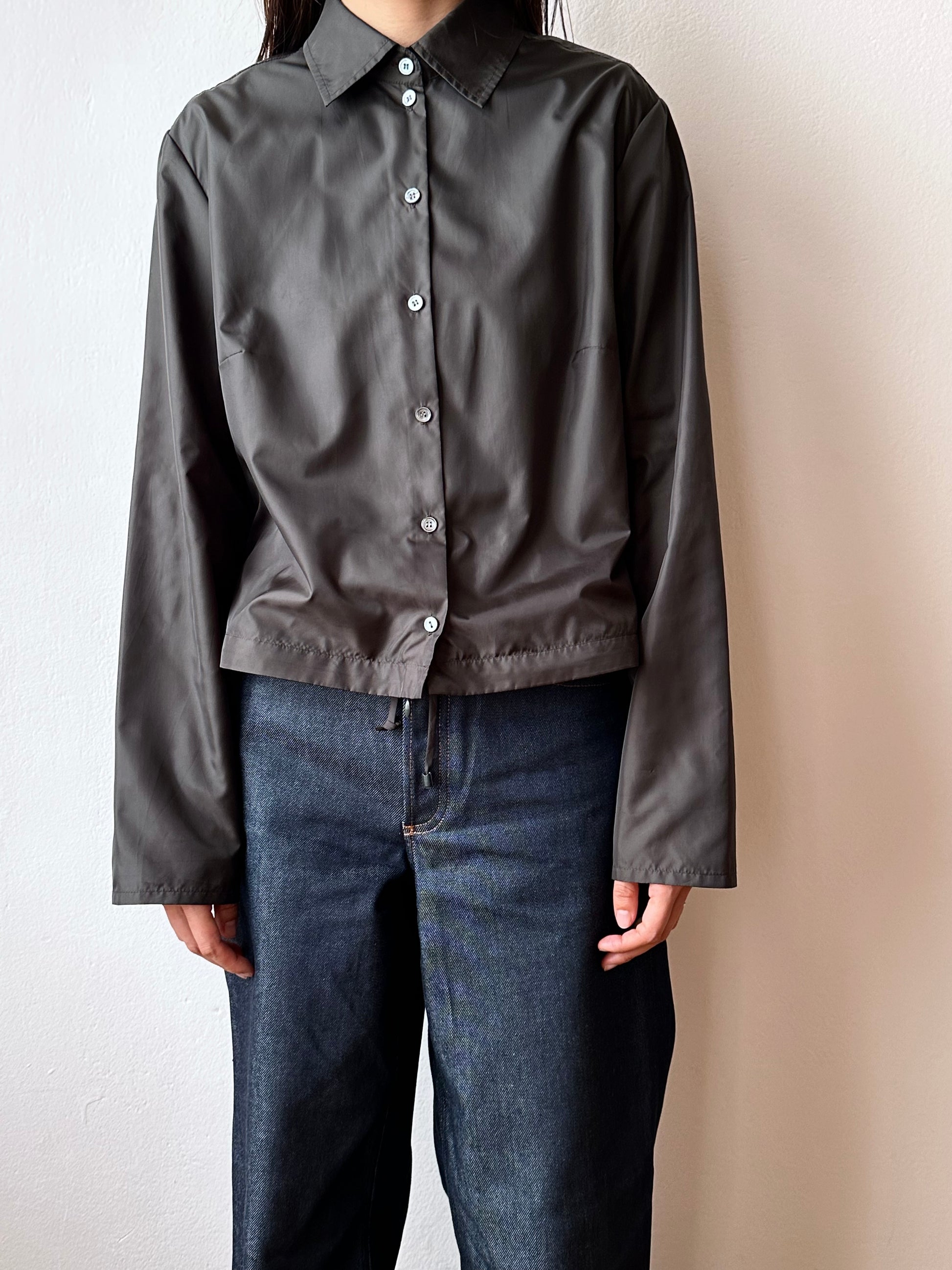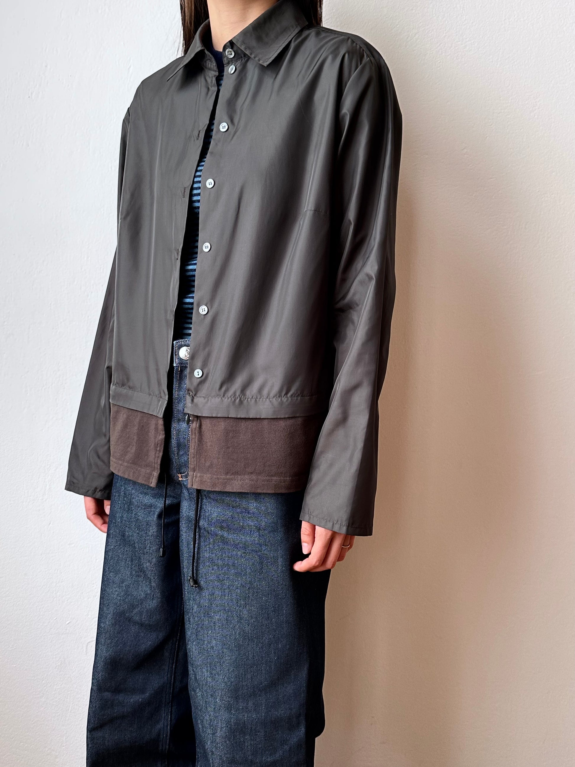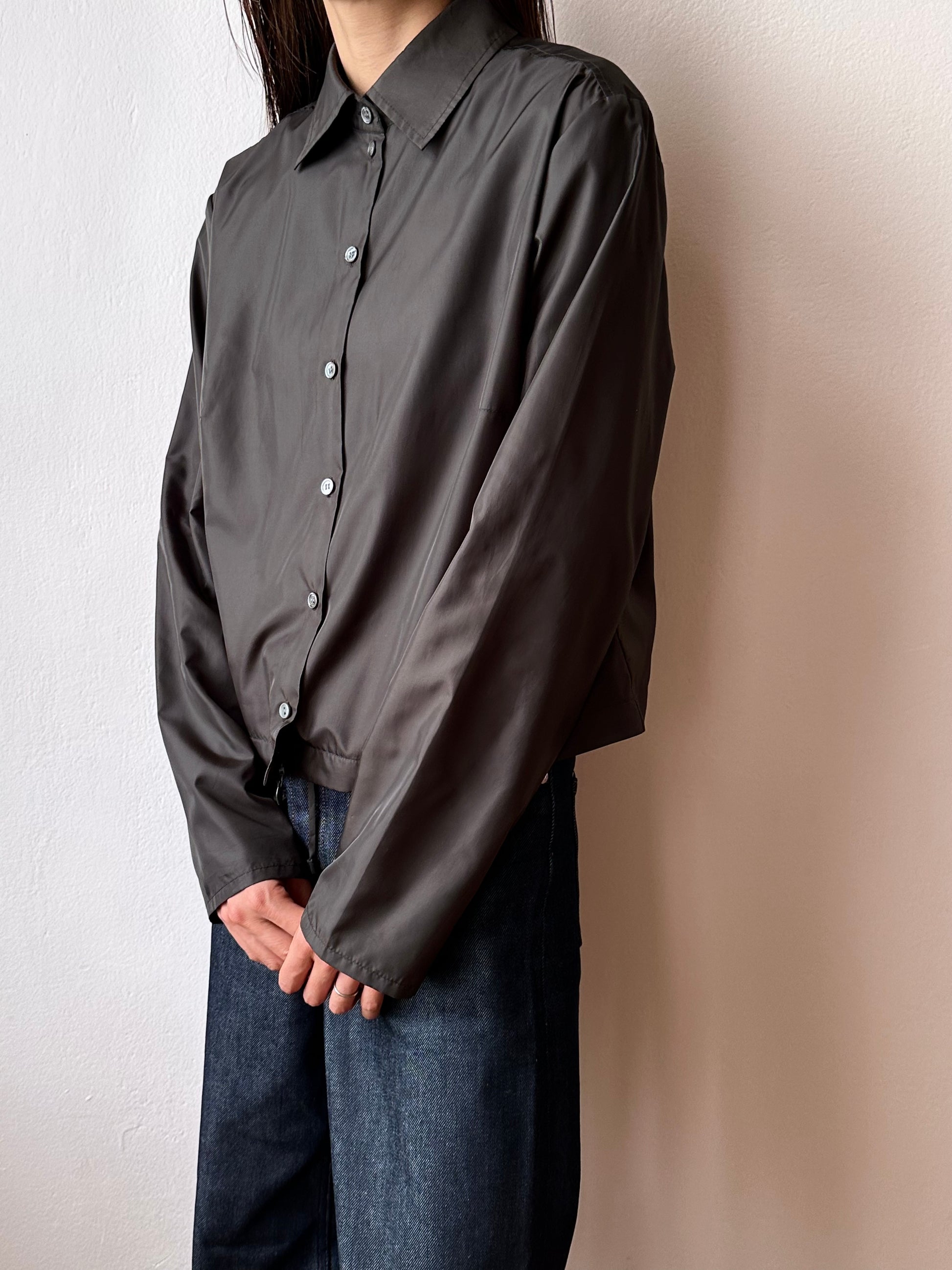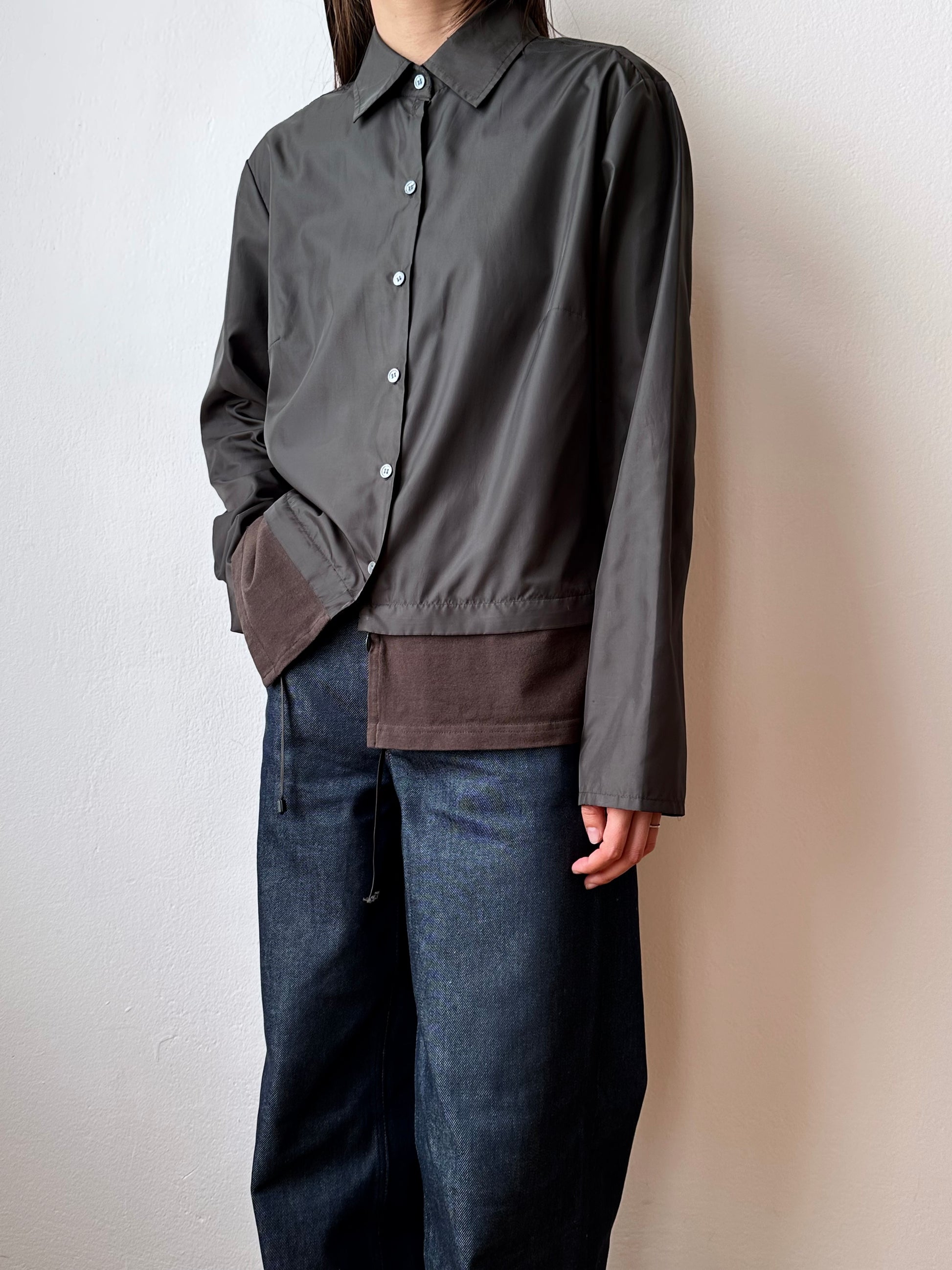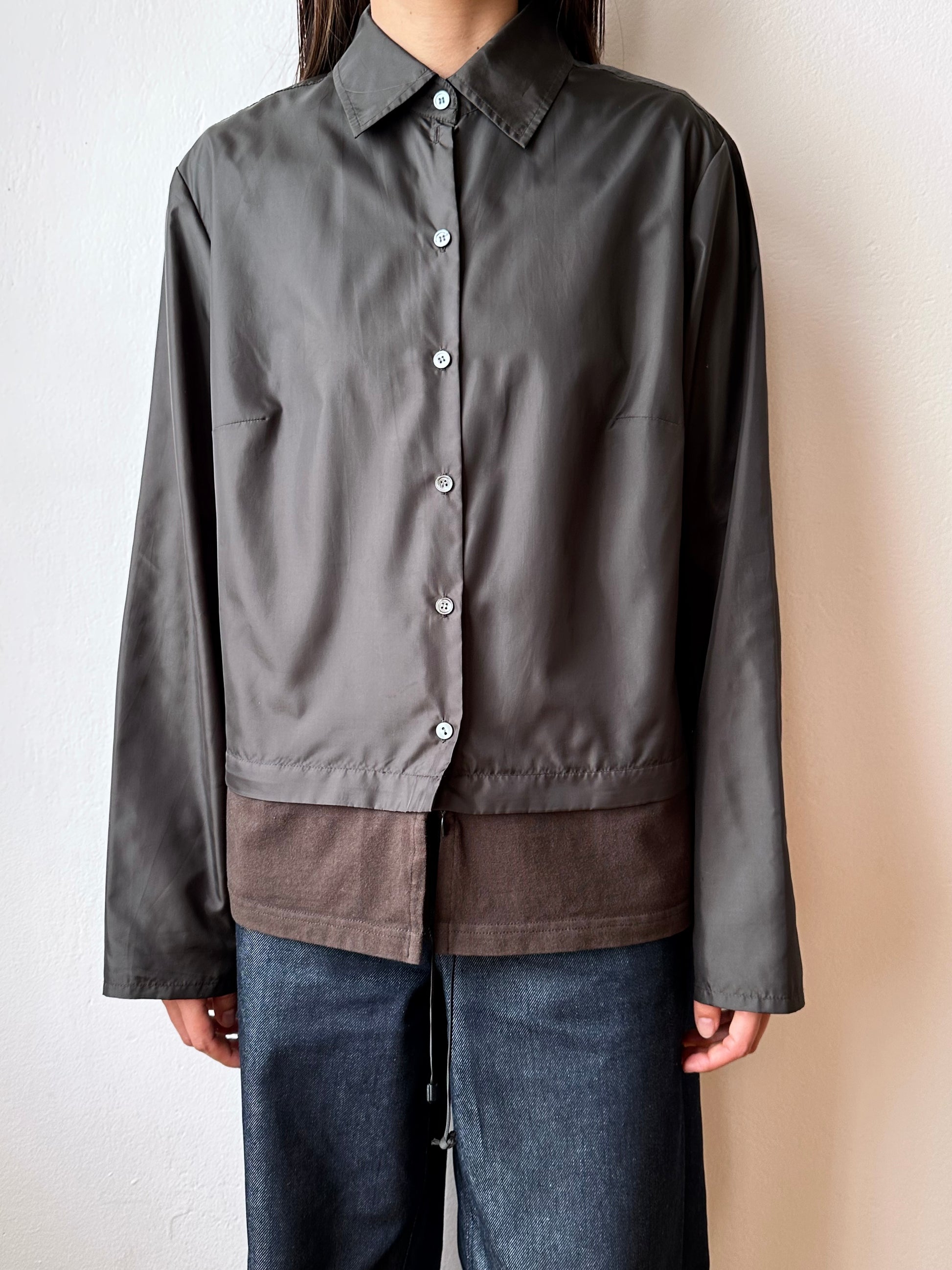 肌触りが最高なさらさらの薄いポリー素材のシャツに、下部に切り替えでコットン布がついています。