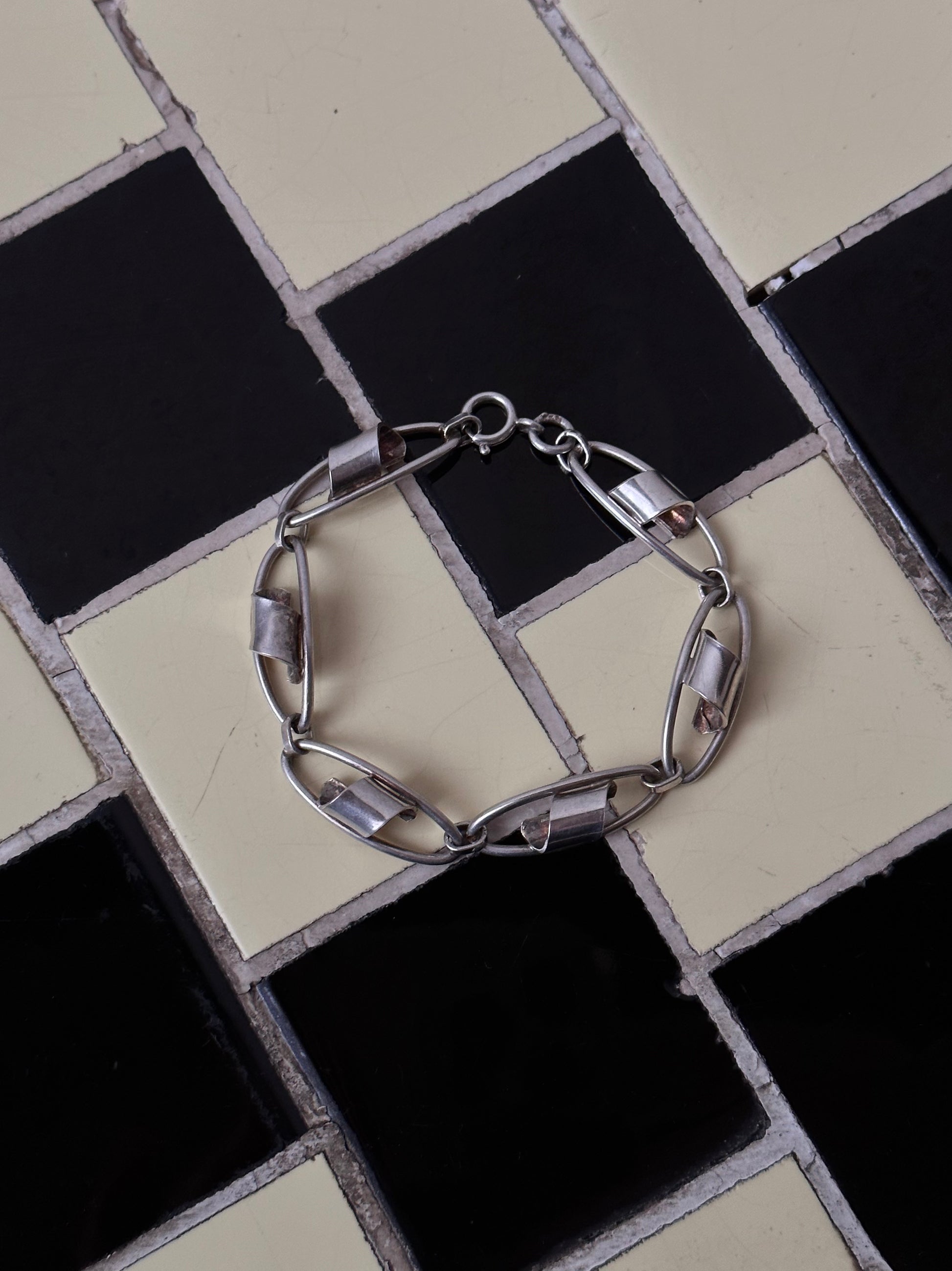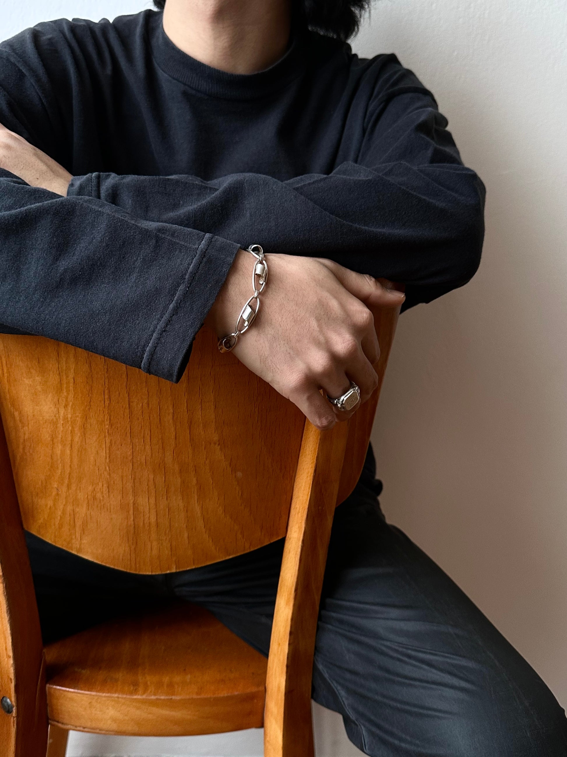 太すぎず細すぎない、程よい存在感でオケージョンやスタイル問わずつけられる万能なシルバーブレスレット。
