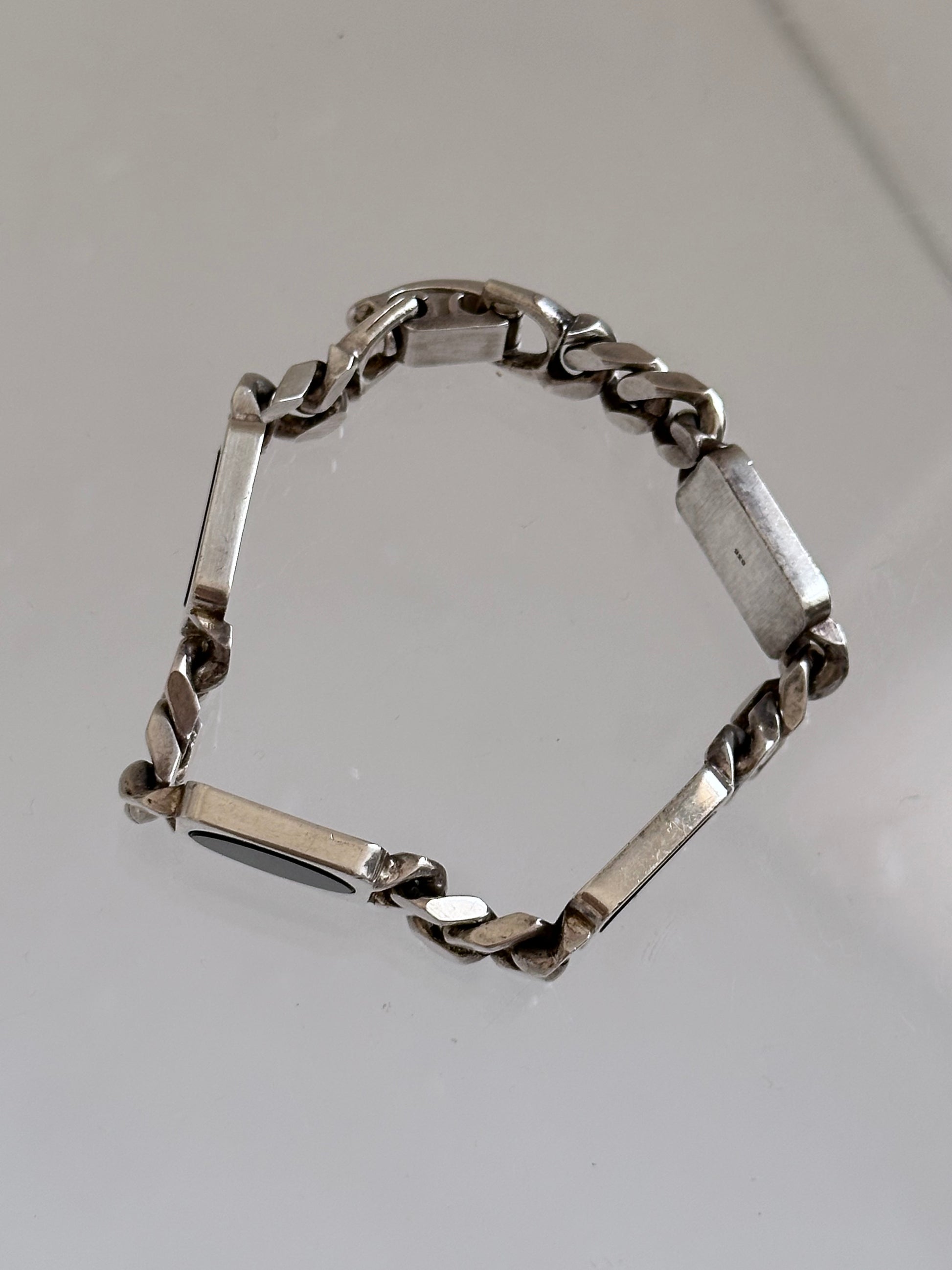 剛健なフォルム、太いカーブチェーンの合間にシルバーに映えるブラックのタイル。