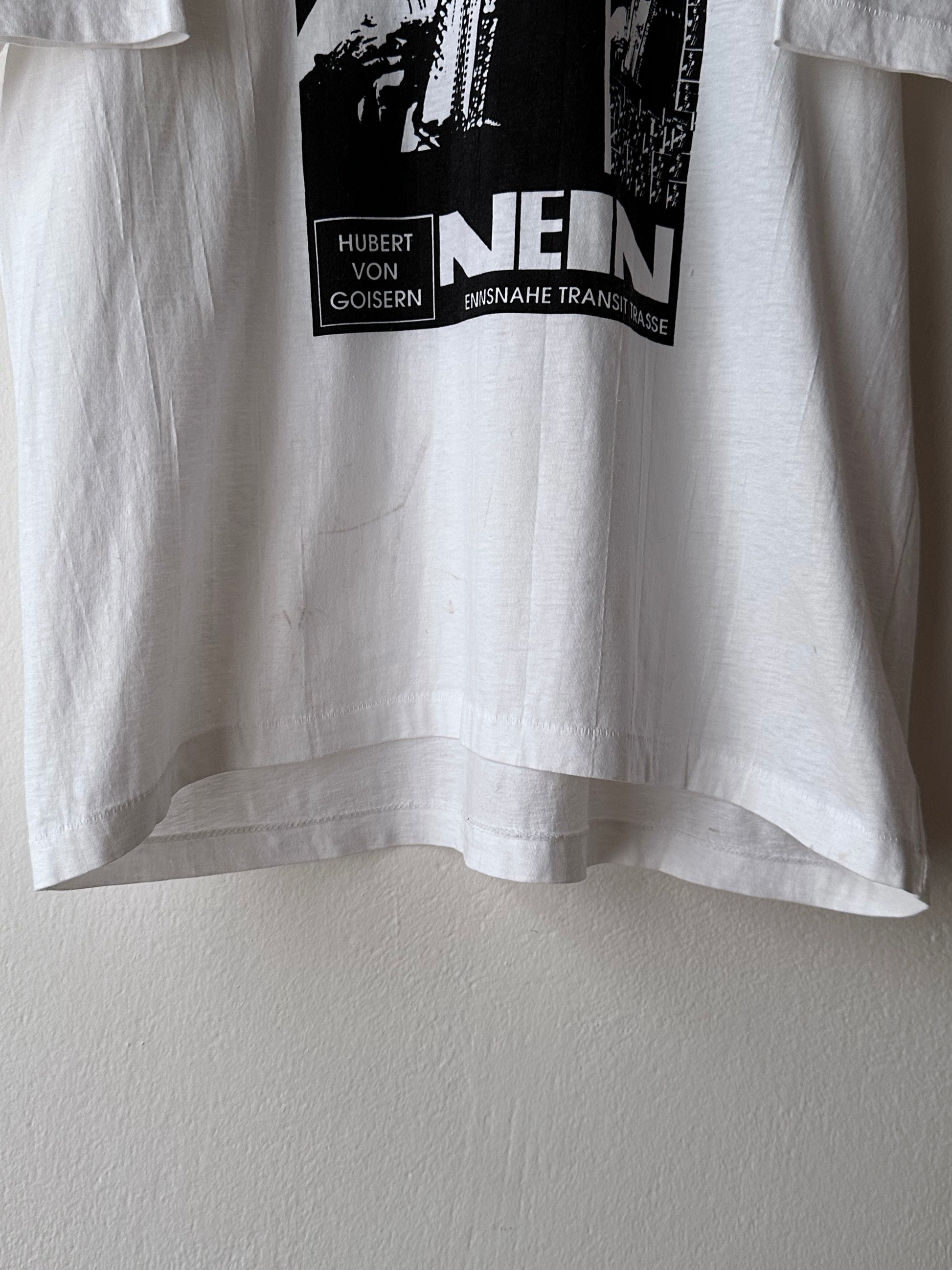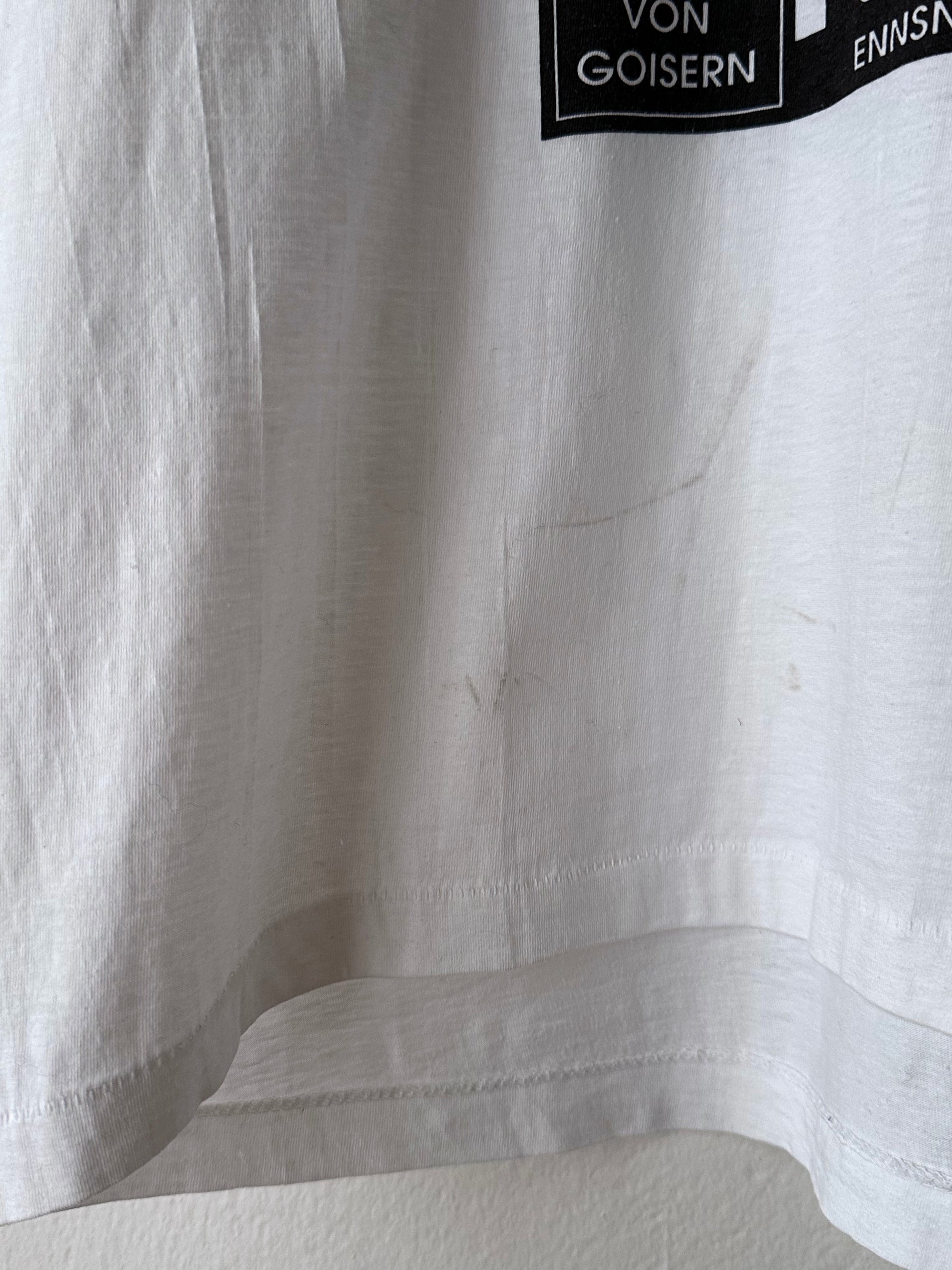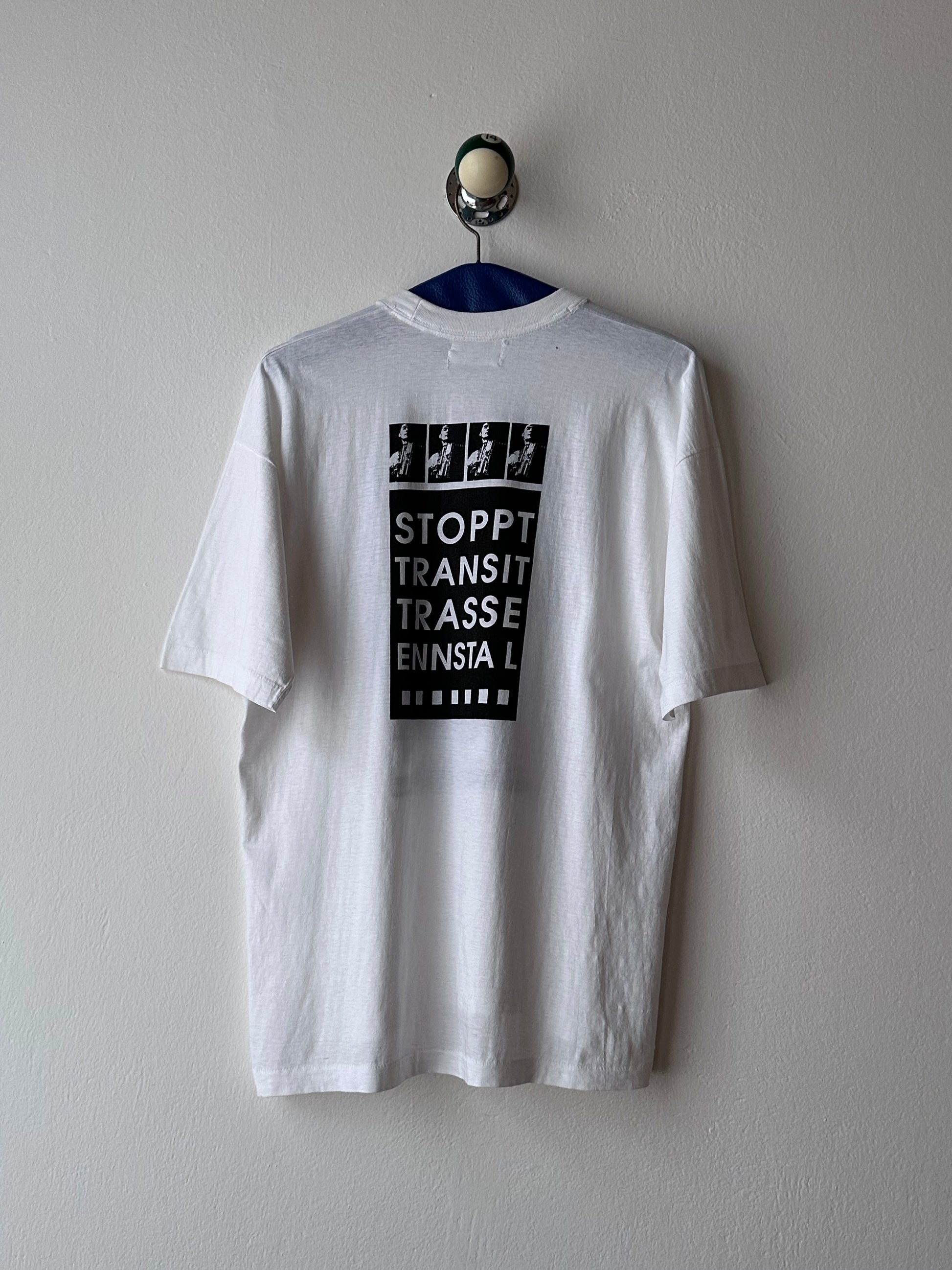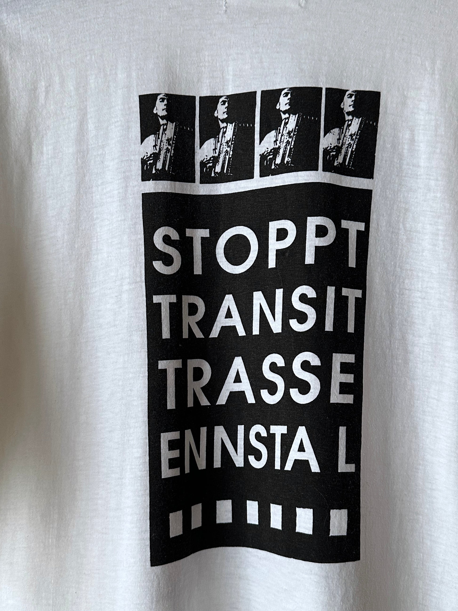 長くなりそうなので手短に説明します、この音楽家は民族系のアーティストらしく当時観客問題や社会問題に積極的に関わる方だったらしく、このTシャツはそのアーティストさんの、オーストリアにある川沿いに巨大な道路が建設される事に対した反対活動のTシャツみたいです。