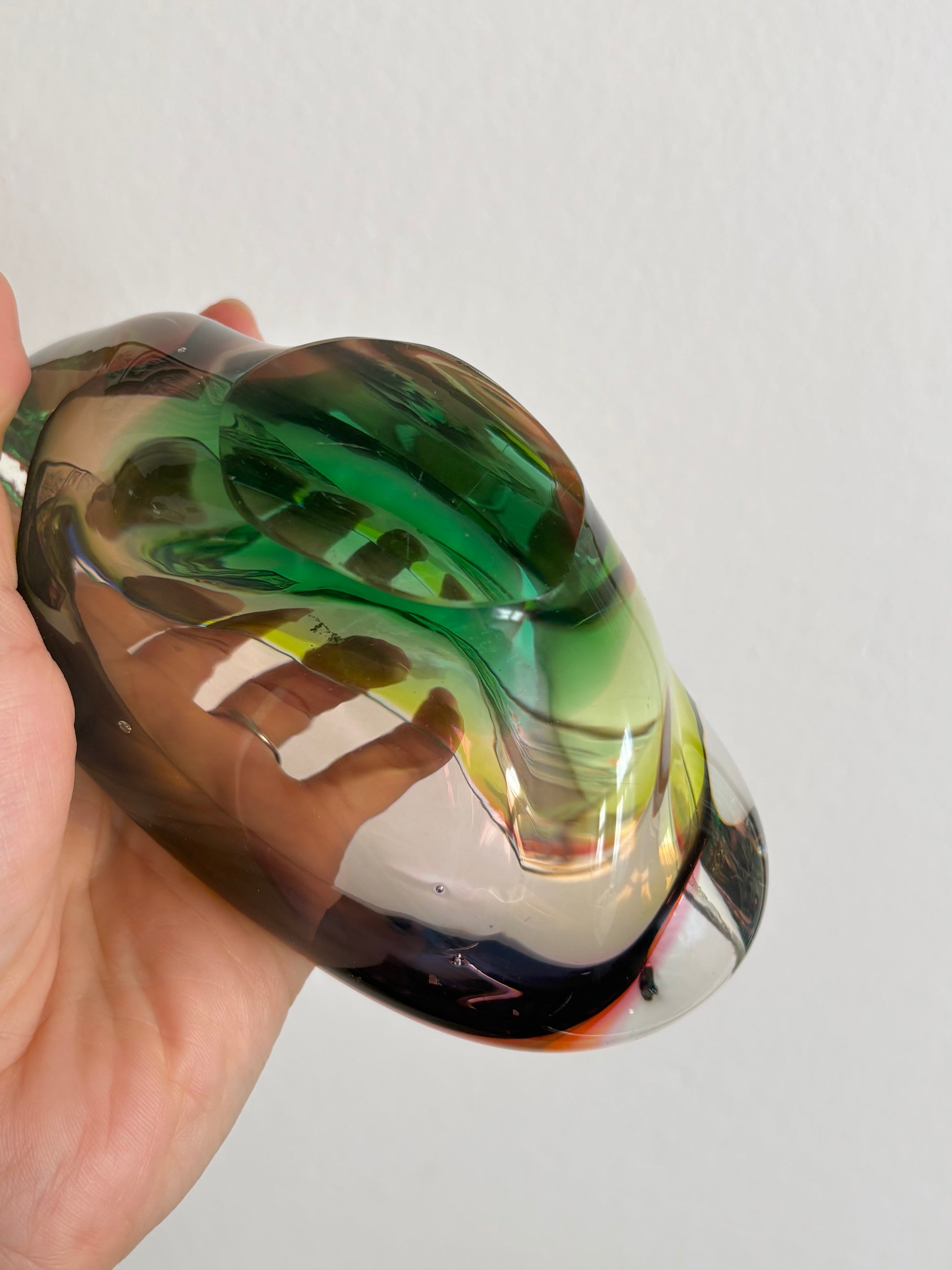 不均一な曲線と厚みのあるグラスに色が入っているので、見る角度、光の当たり方によって様々な表情を見せる美しいオブジェ。
