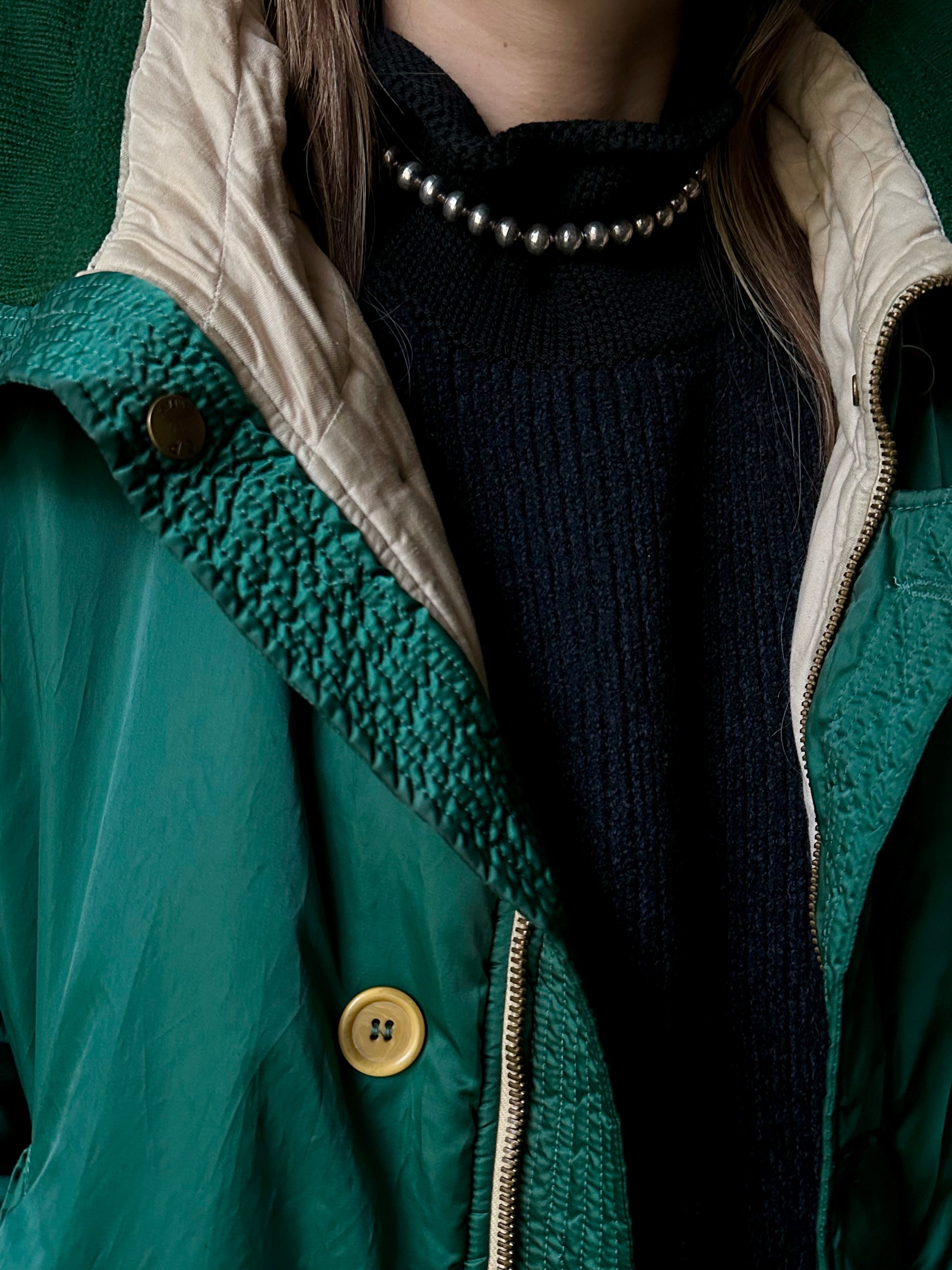 毛足の長いニットから覗かせたり、タートルネックの上に光らせたり、、
