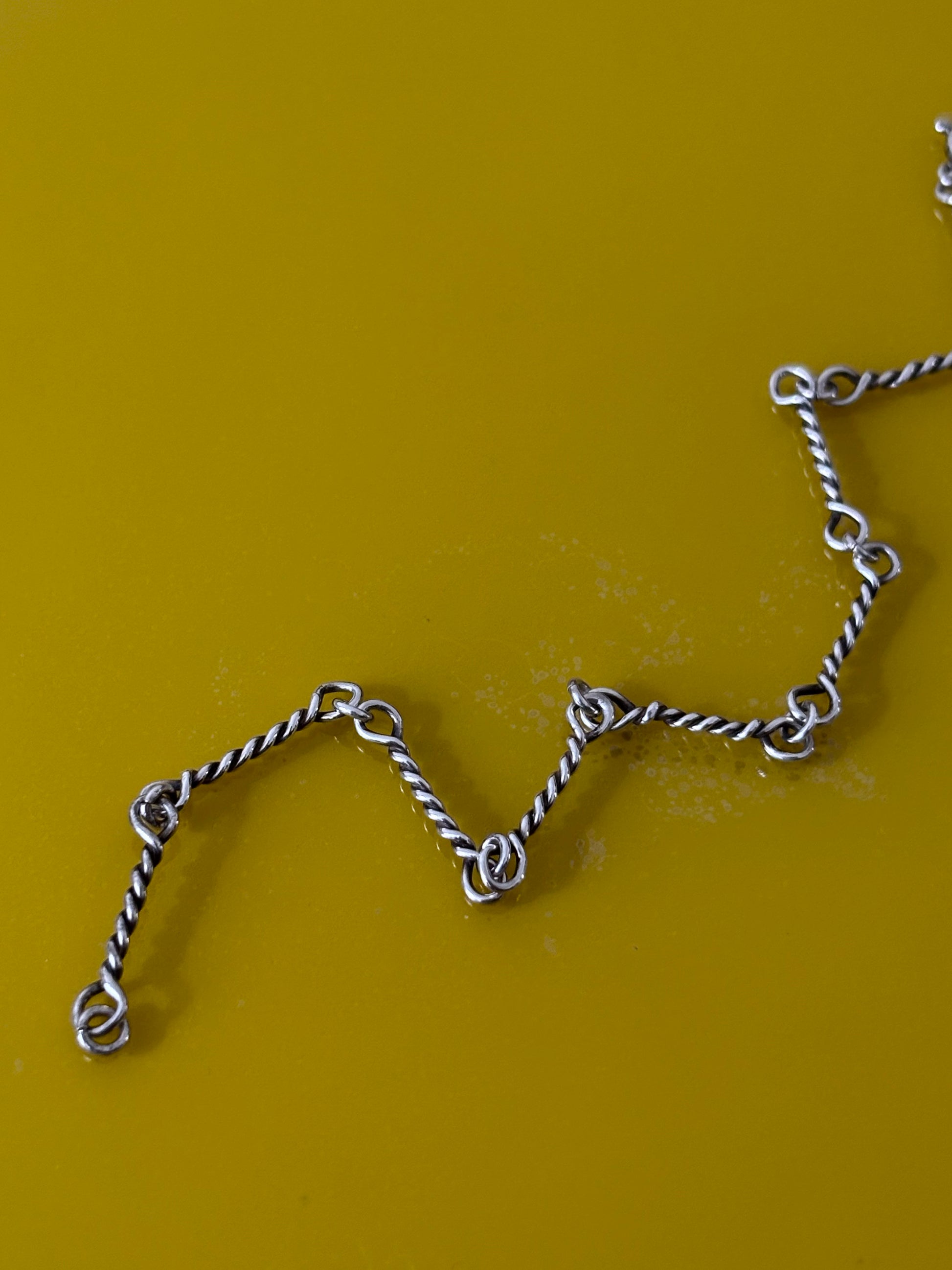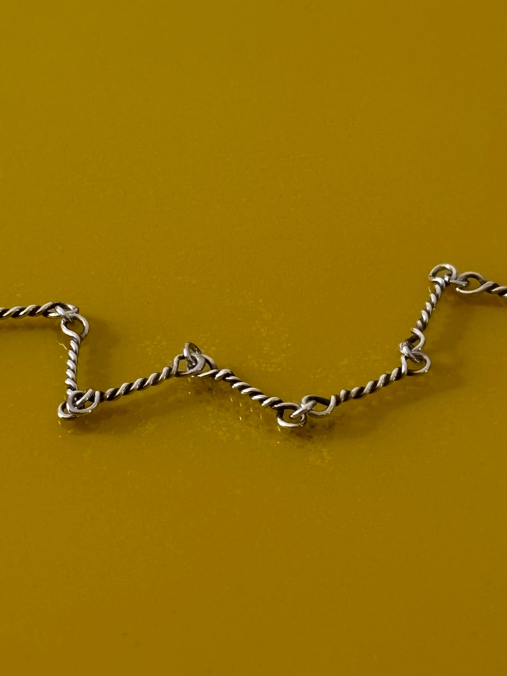 The twisted wire chain carries a hard, punk attitude, yet its delicate thinness creates striking contrast!