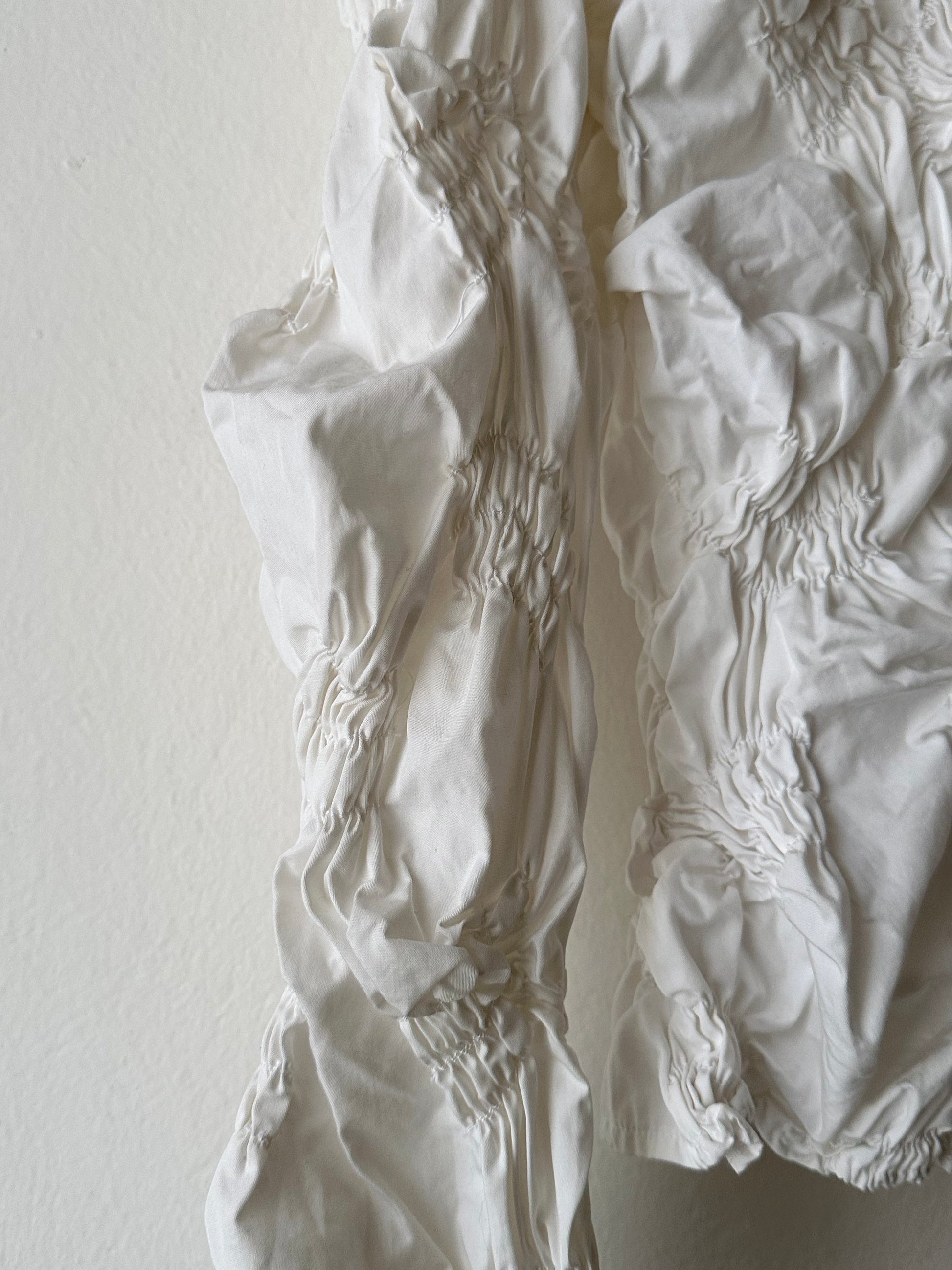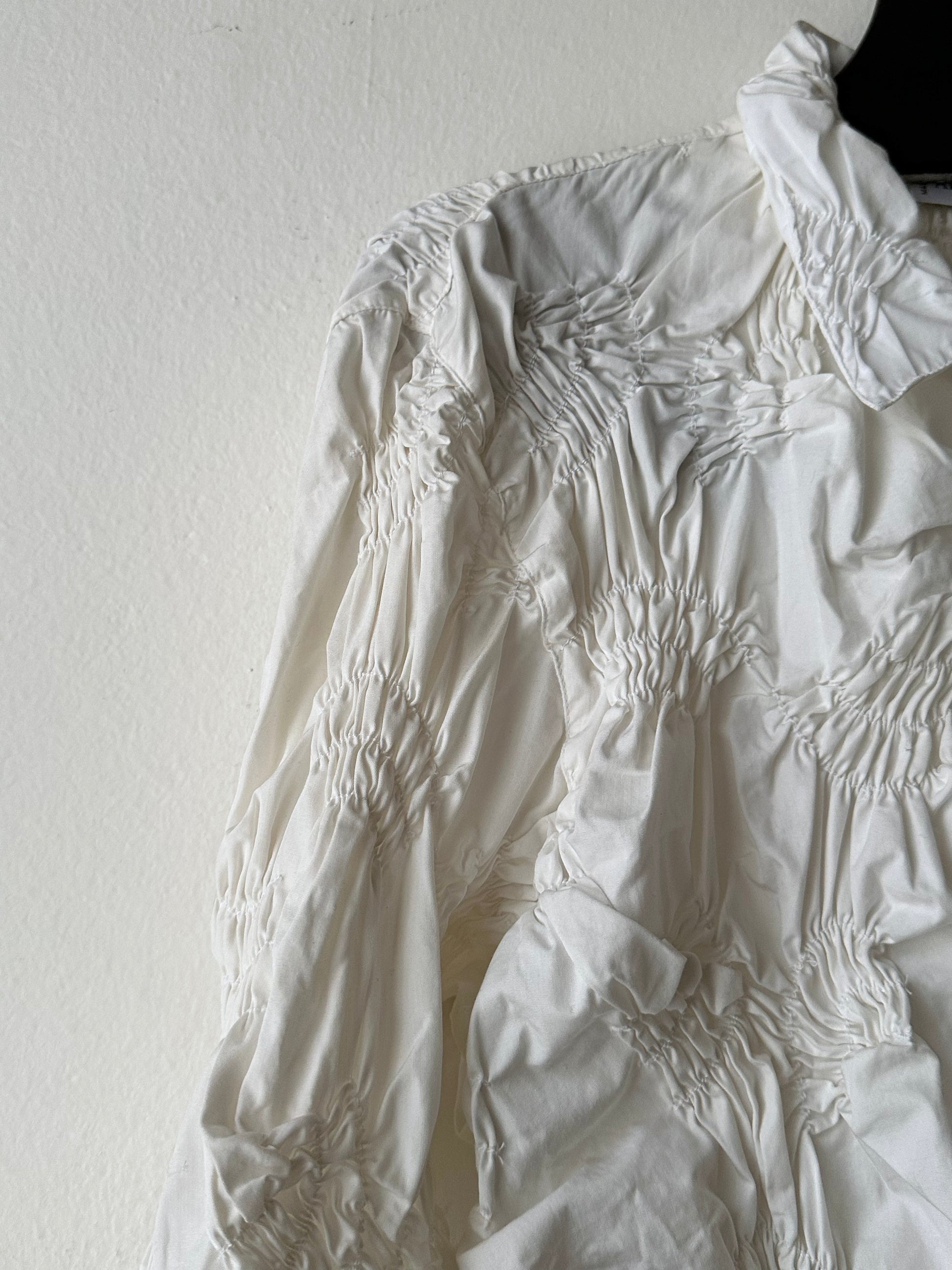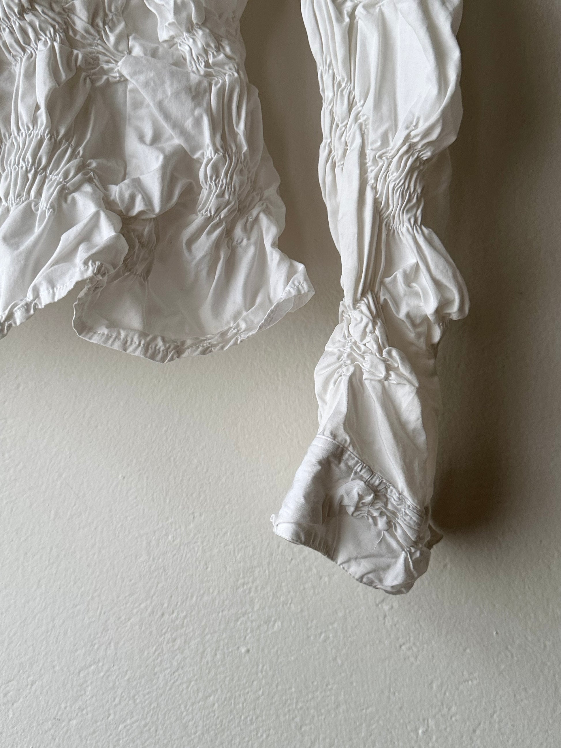 生地に皺を寄せてギャザーを寄せているので伸縮性があり、ポップコーンシャツのように小さく見えて着ると身体にフィットします。