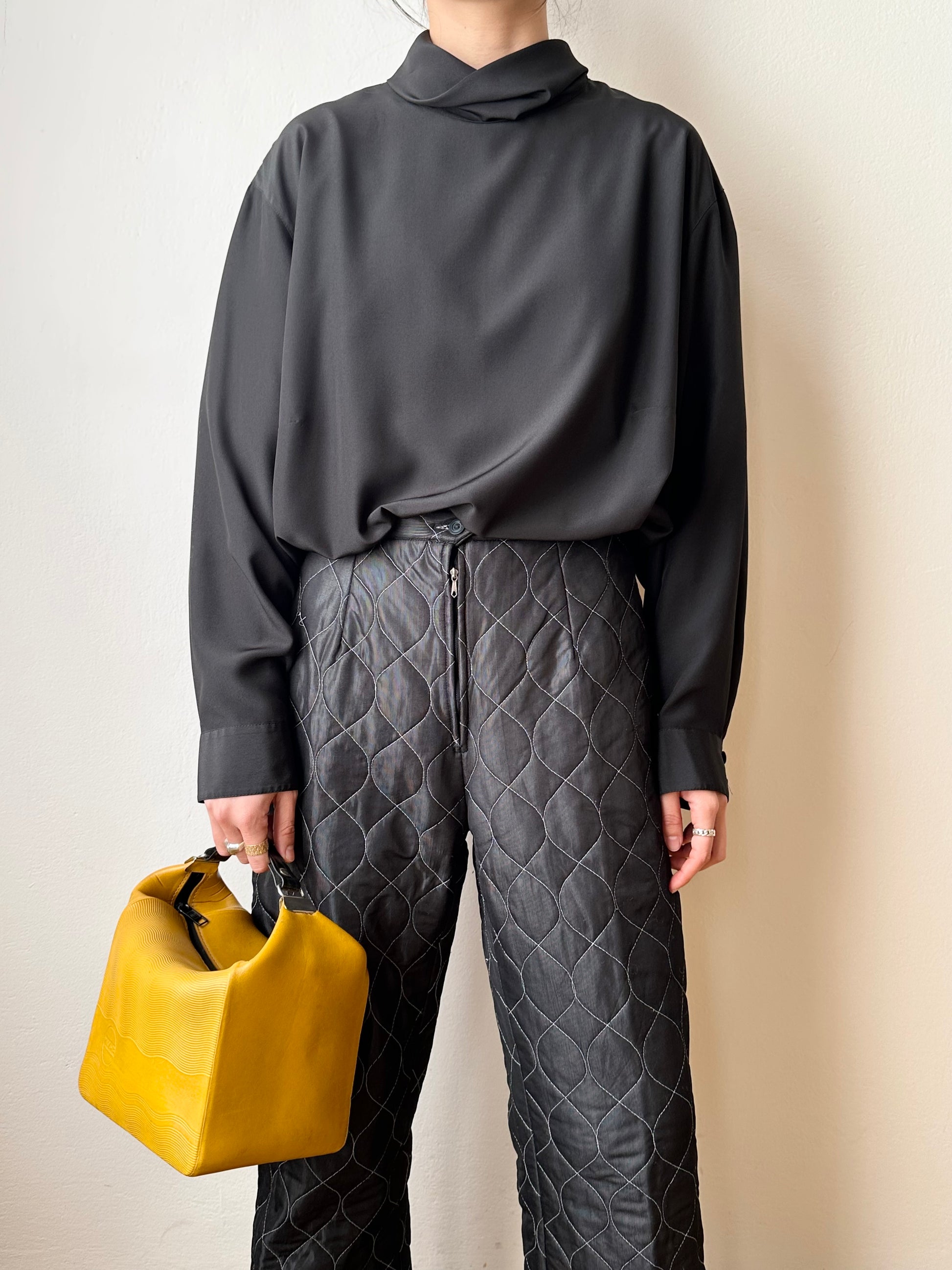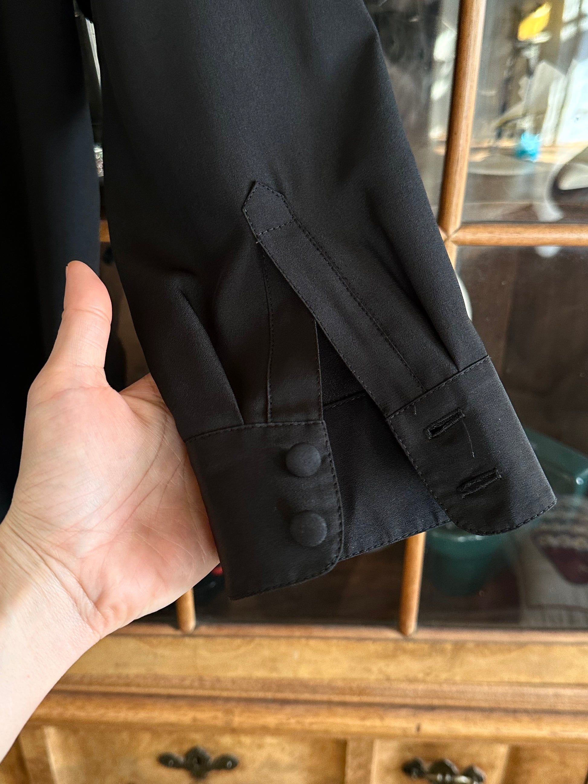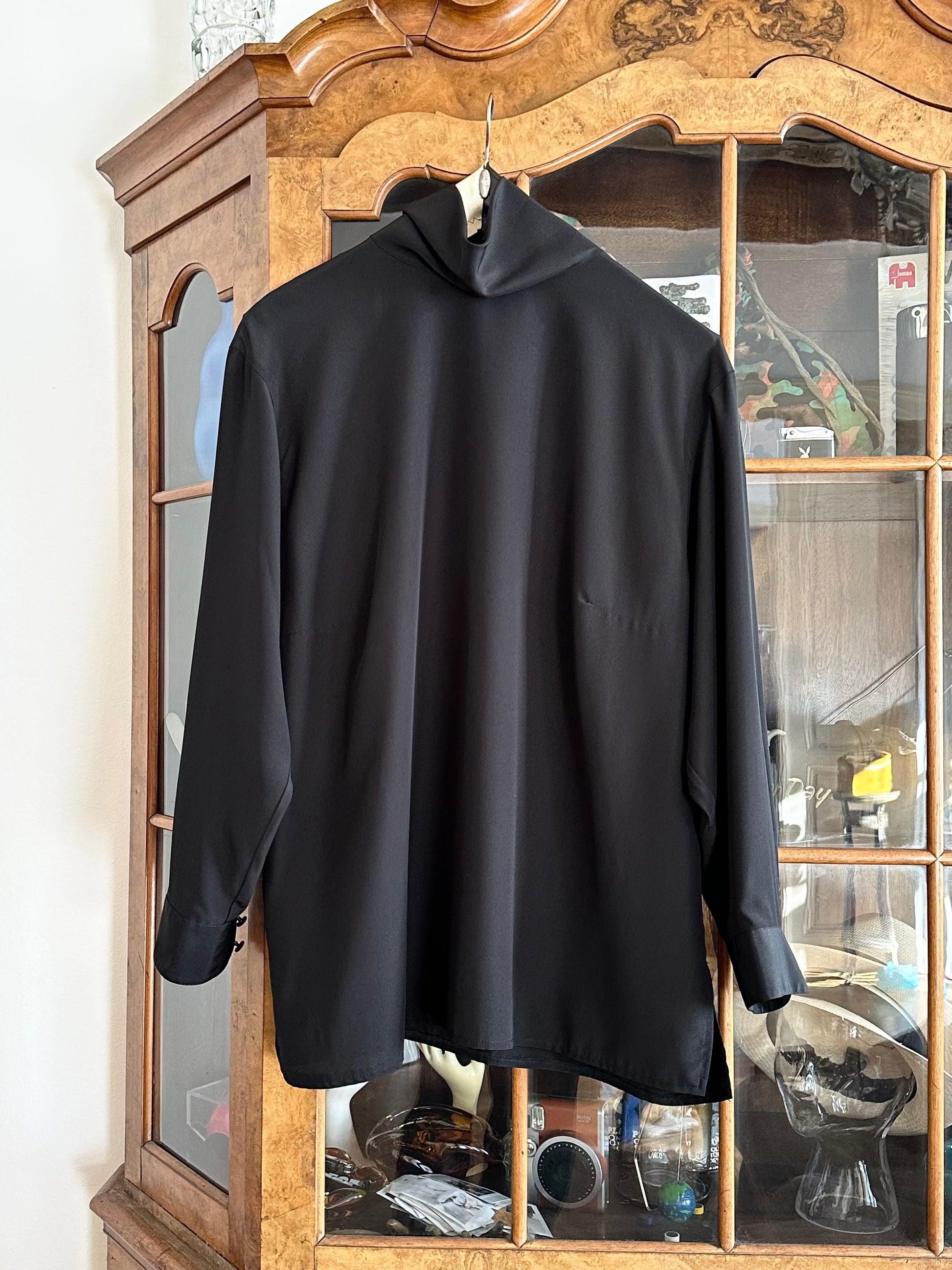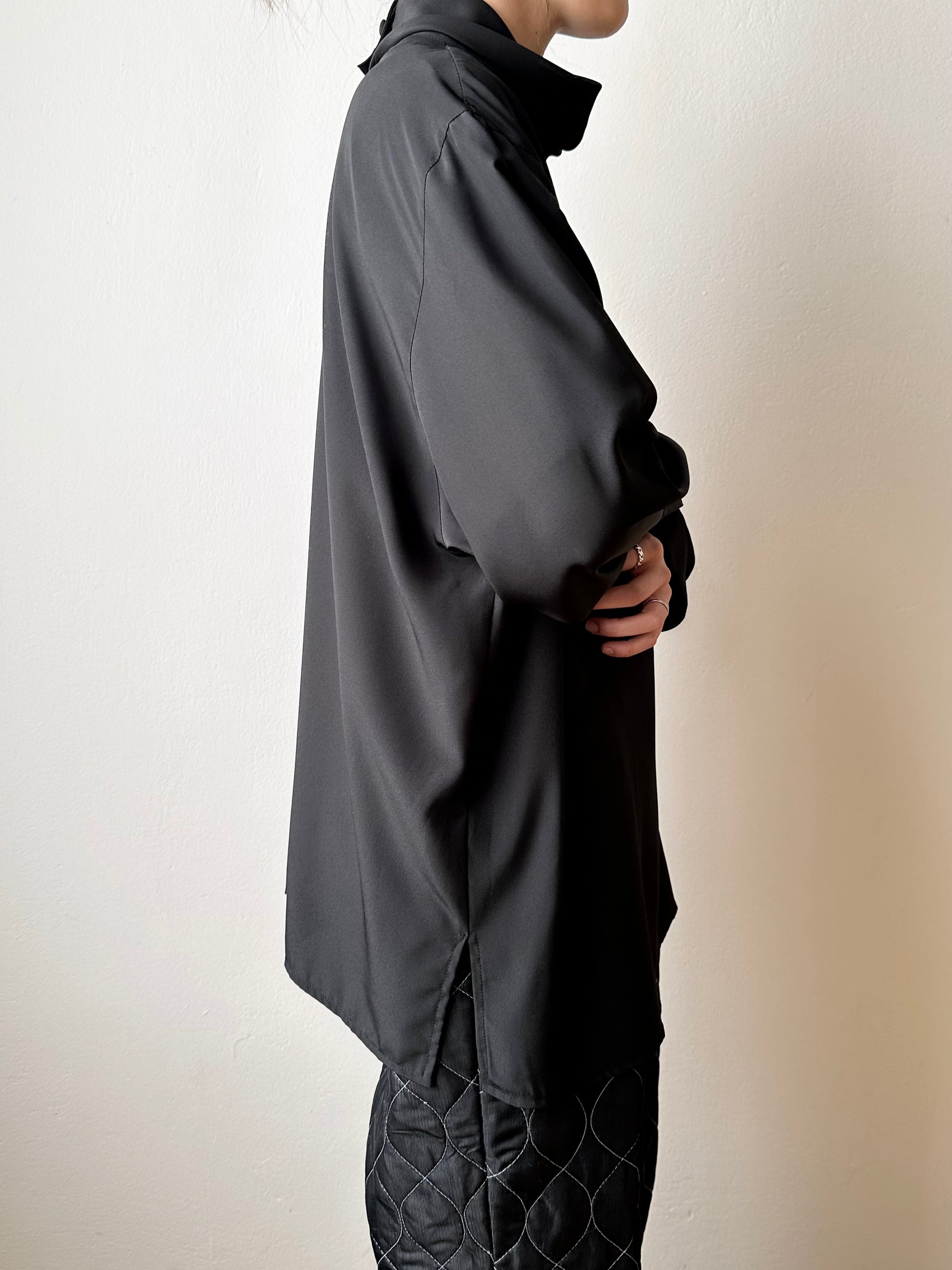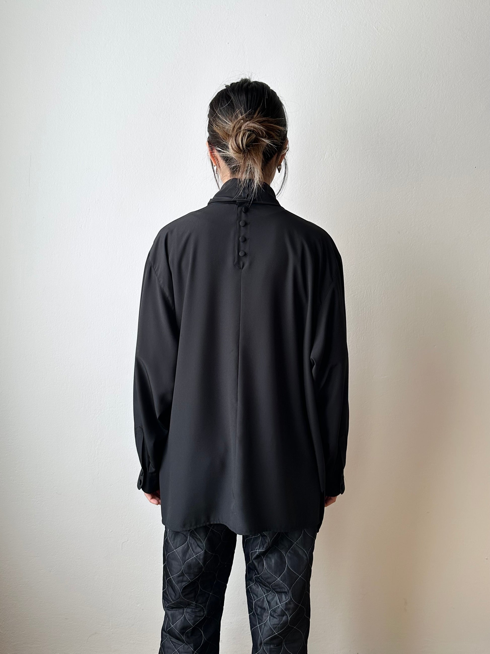 さりげなくお気に入り。シルキーなポリーのブラックシャツ。