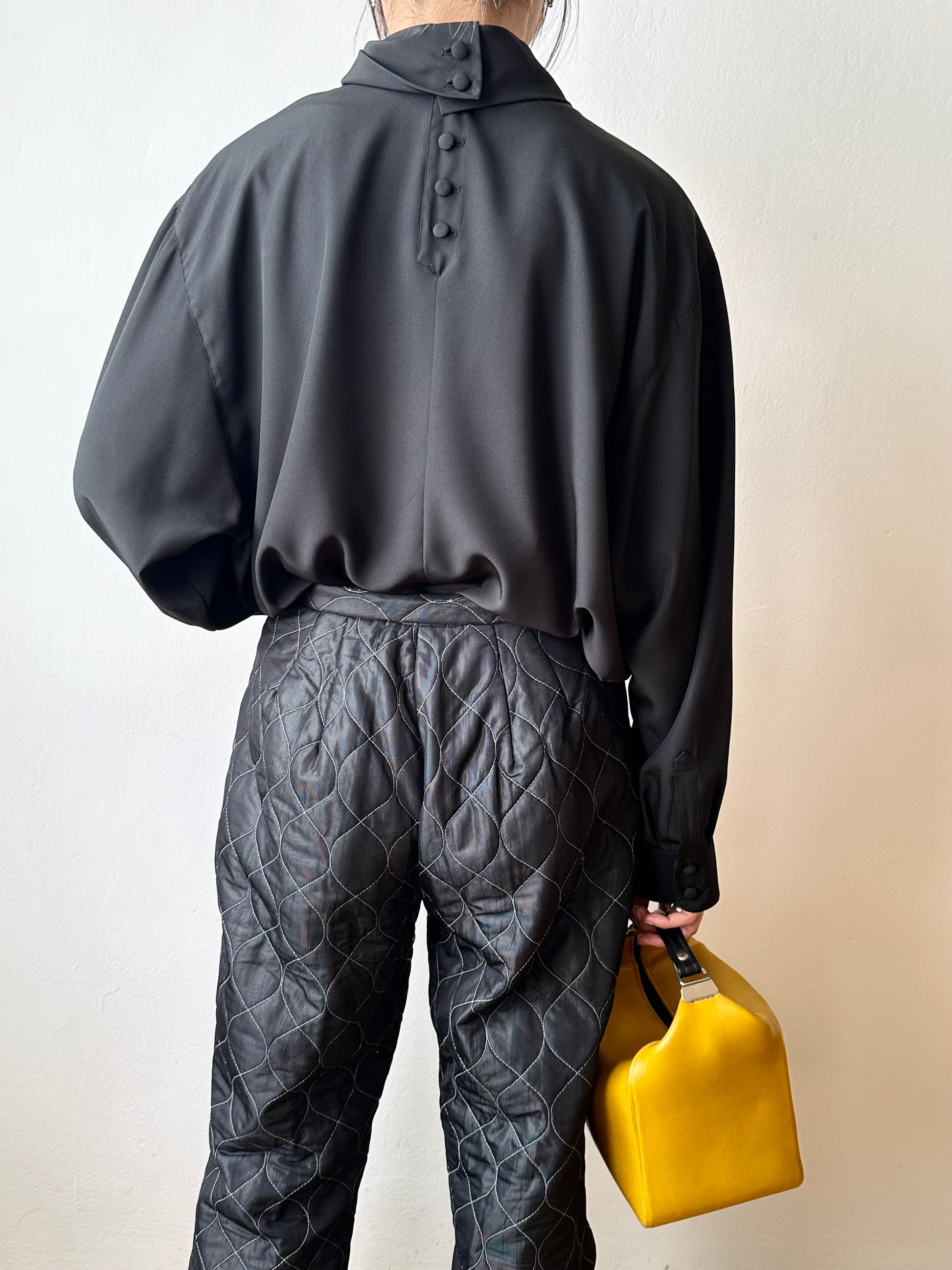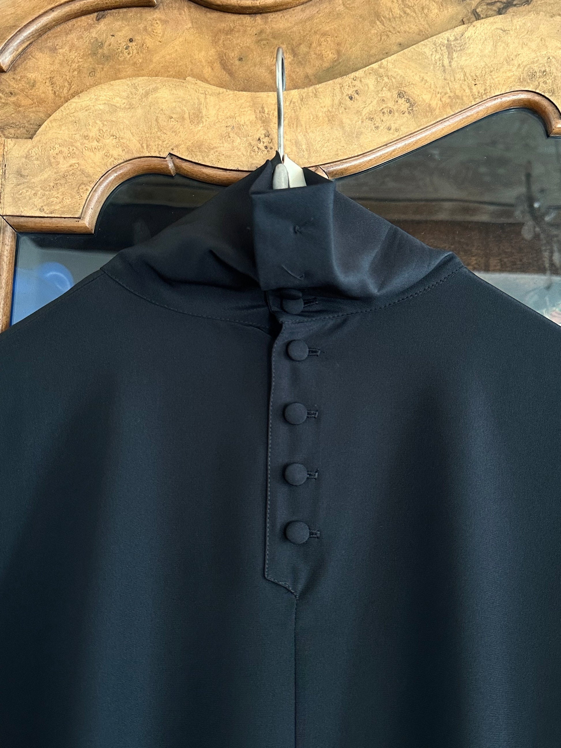 ミニマルなデザイン。くしゅっと倒れるスタンドカラーと後ろのくるみボタンが素敵。