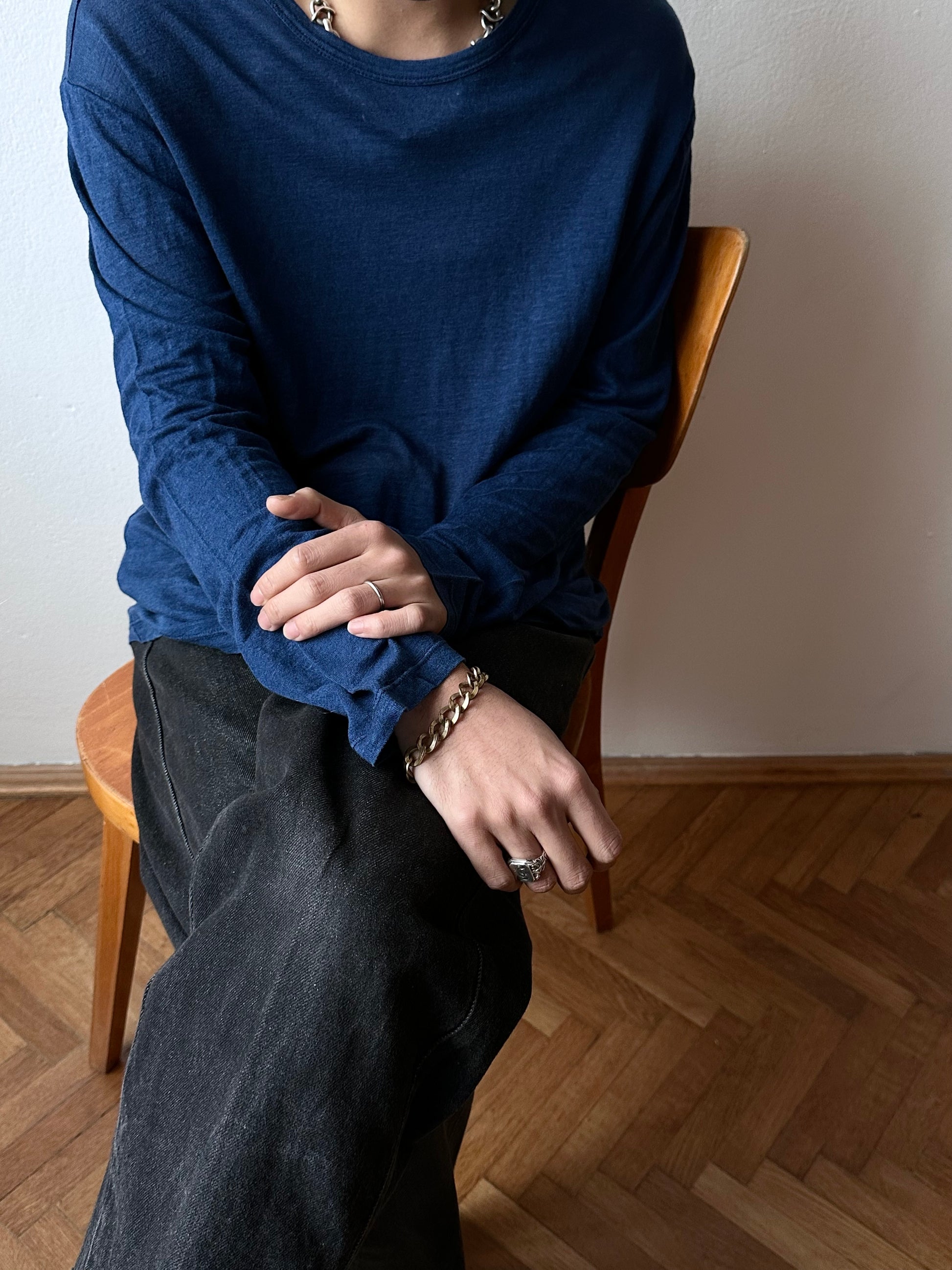 メンズモデルが着用している alexander wangのトップスも販売中。色気あるリネンシルクのブルー、薄いオンス。