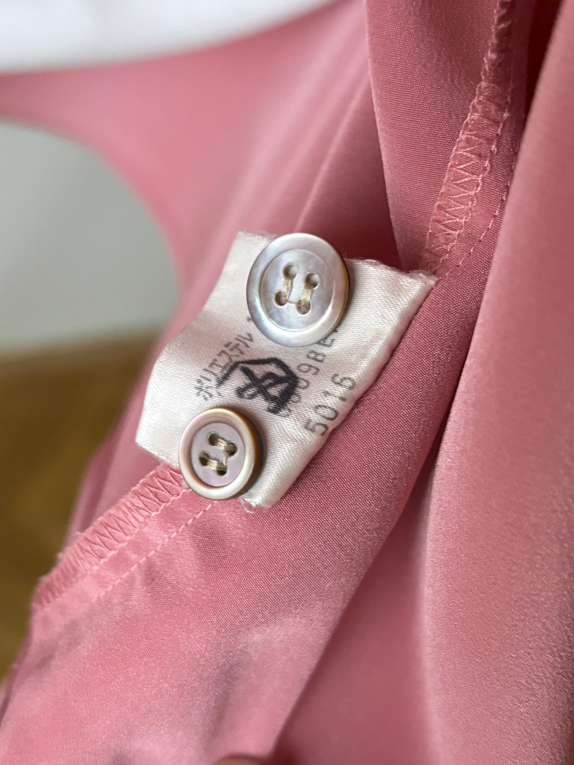 綺麗で均等なシェルボタンがフロントとカフスに使われていて、替えボタンがタグについています。