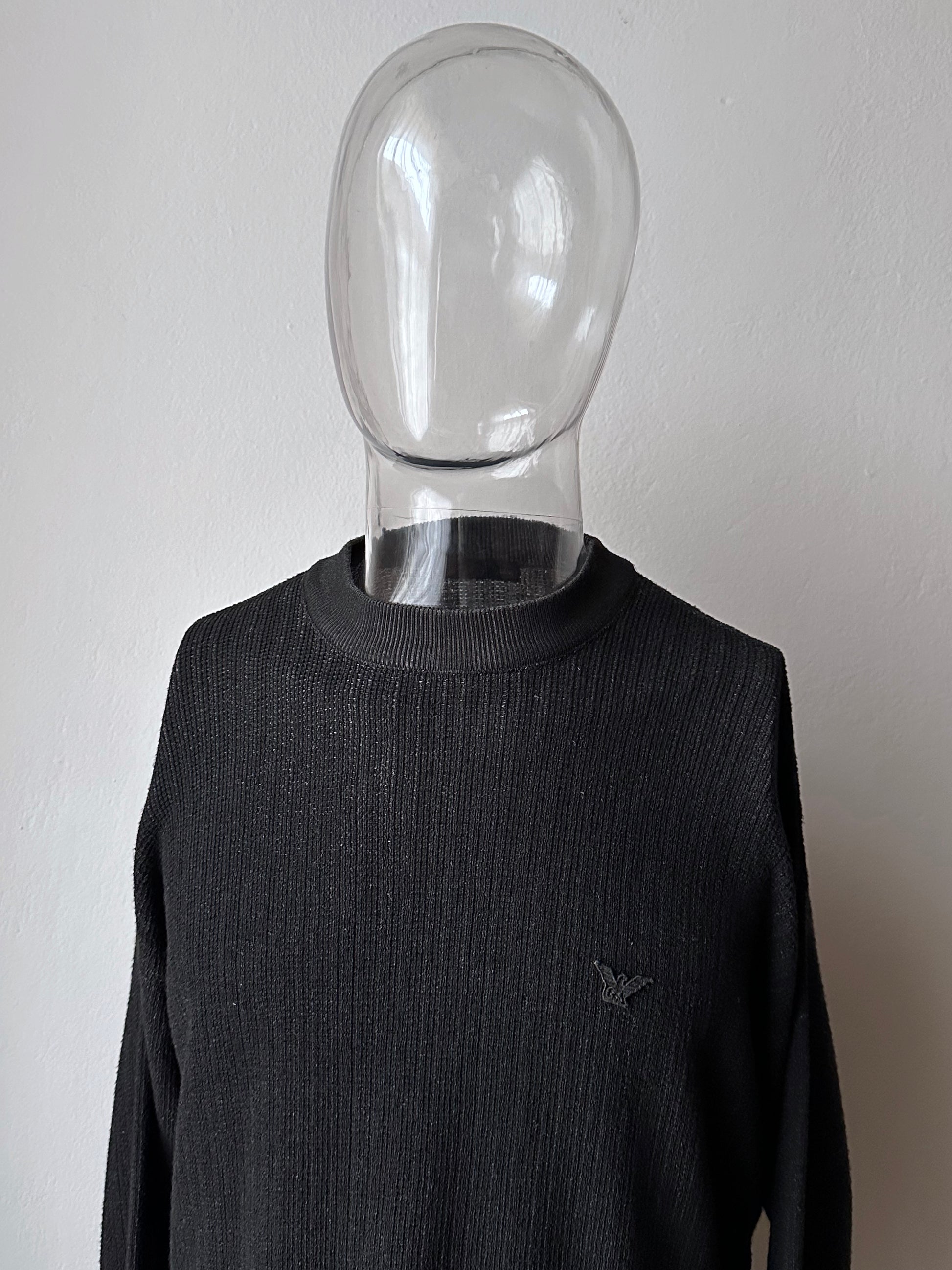 これ元々色々私物で白色の薄手のニットだったんですが、ガーメントダイして黒にしました。先日入荷したジャケットがあるんですが、あのジャケットを染める前に数回テストで自分たちの私物の色々な物を染めてもらってタンですが、そのテストとして染めた1枚。