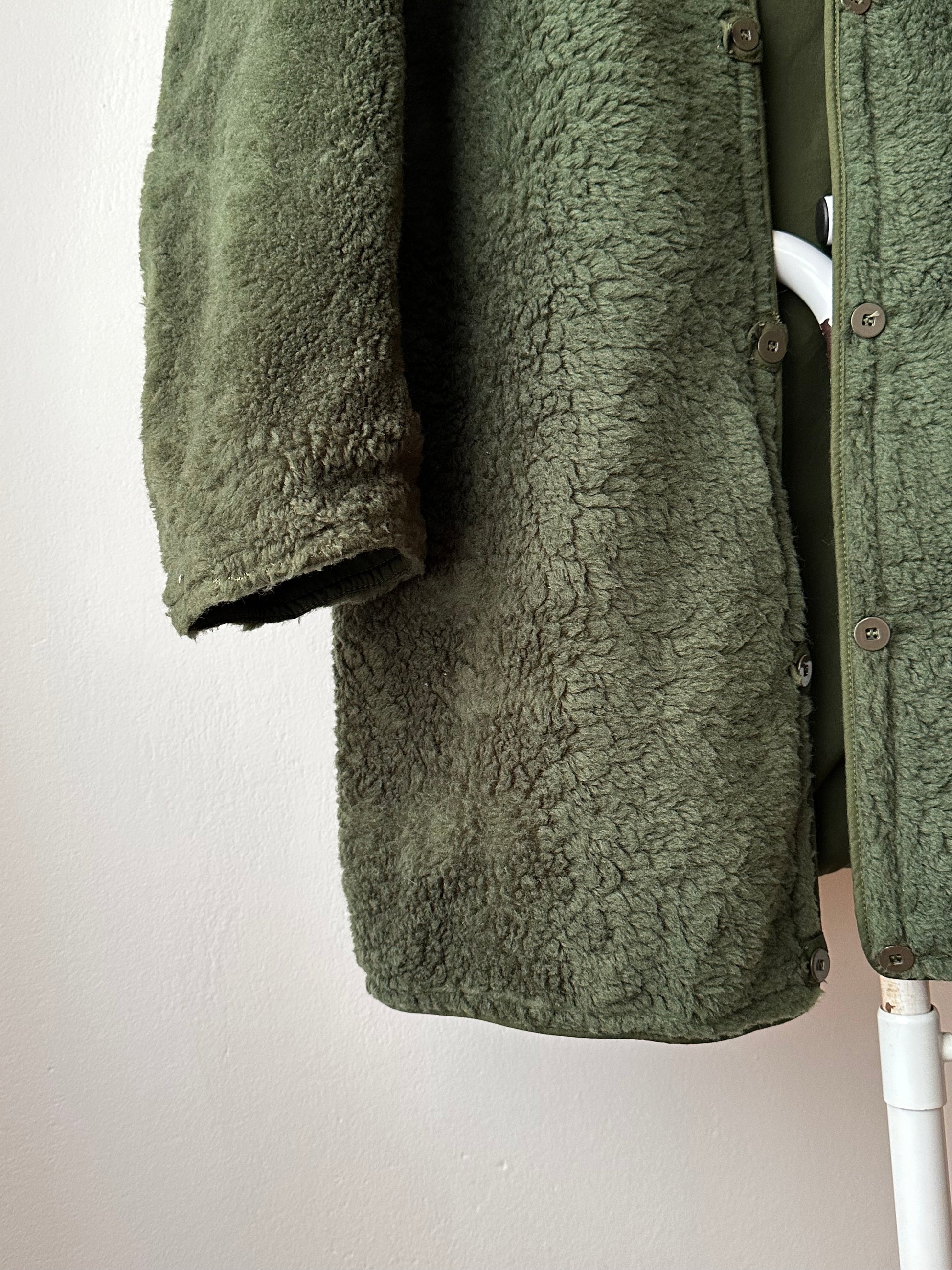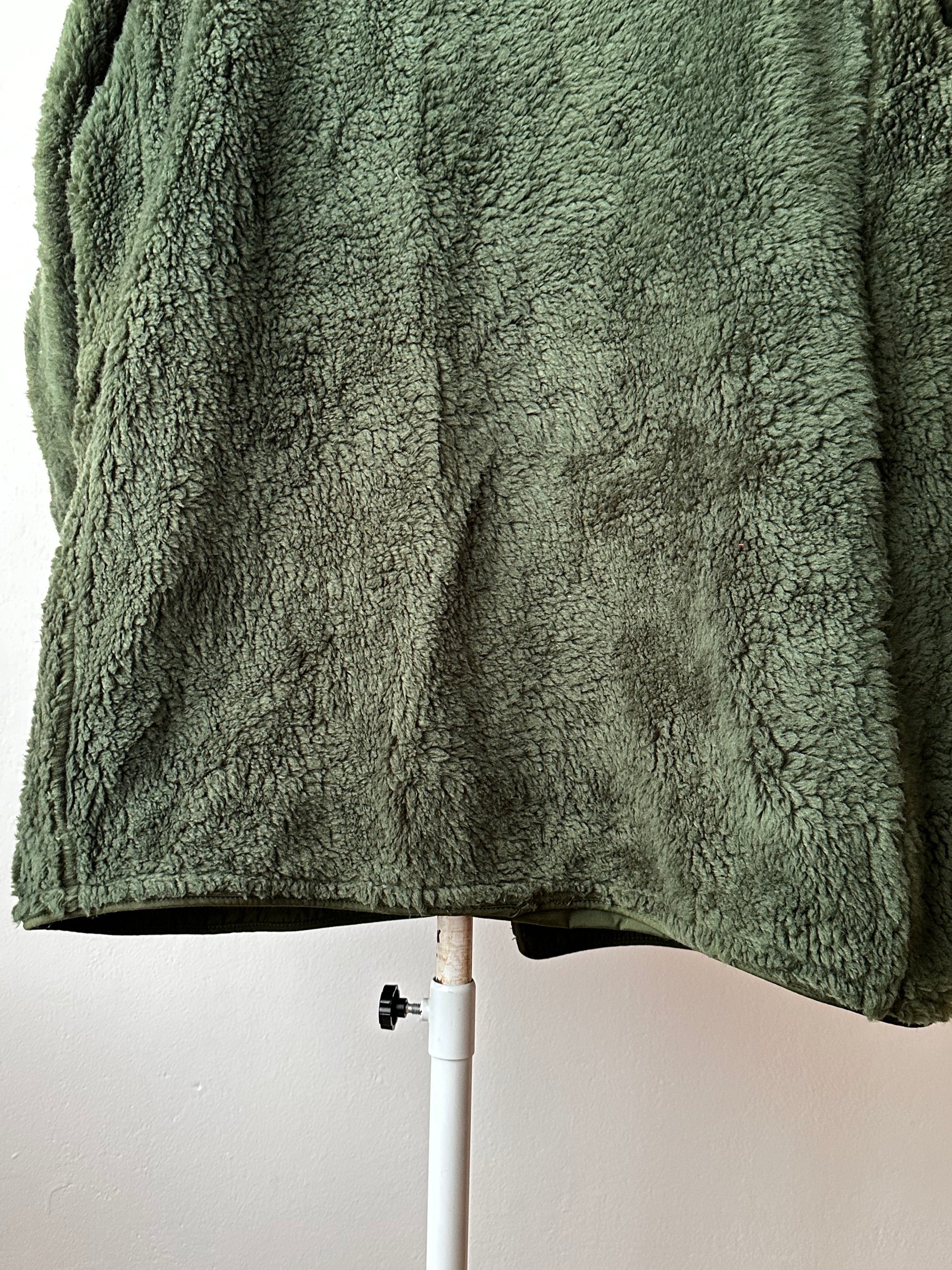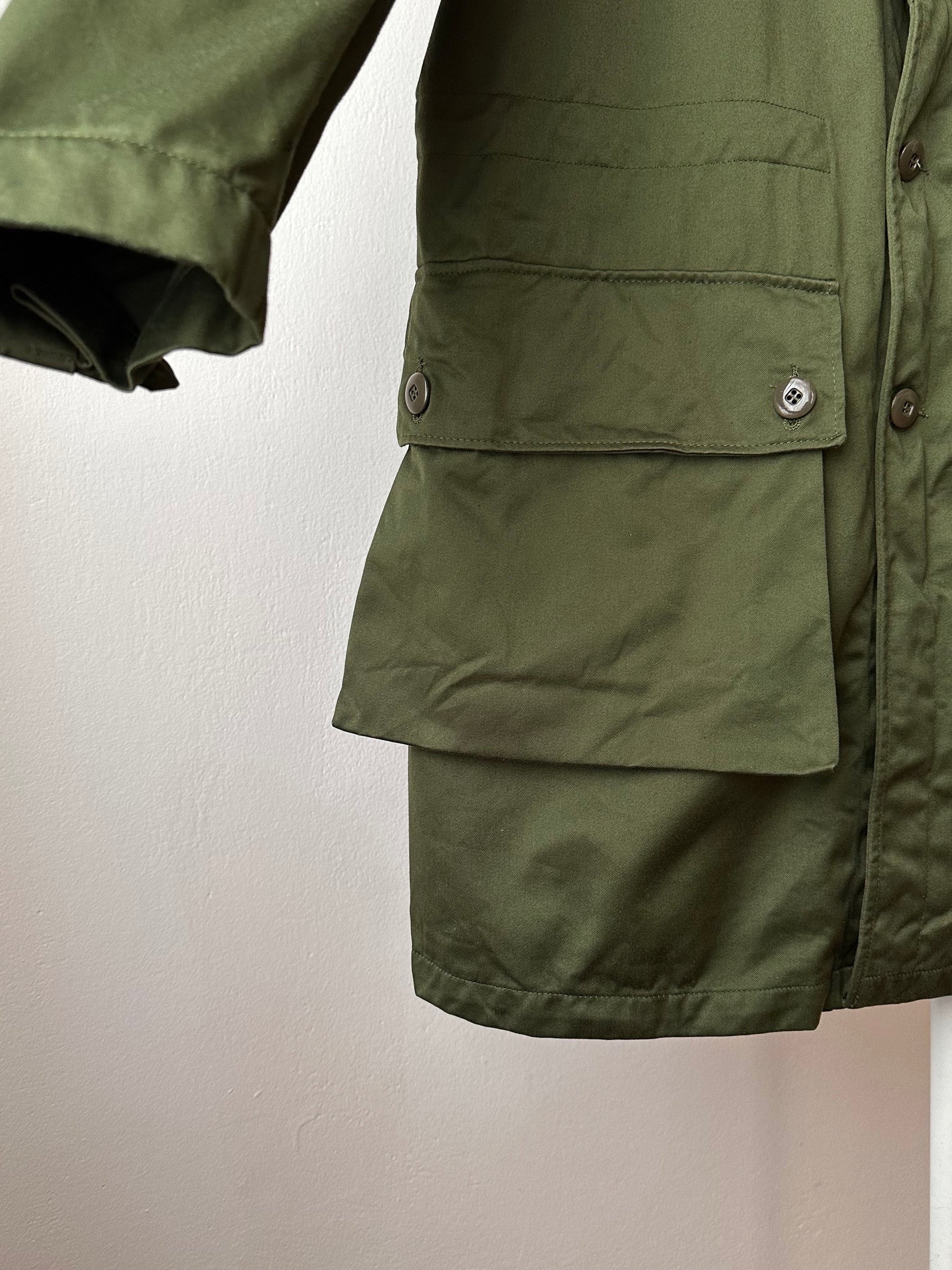 表面のシェ ルは柔らかいけど丈夫なコットン素材、大きいポッケがフロントに2つあって綺麗なミドリ色で可愛いです。