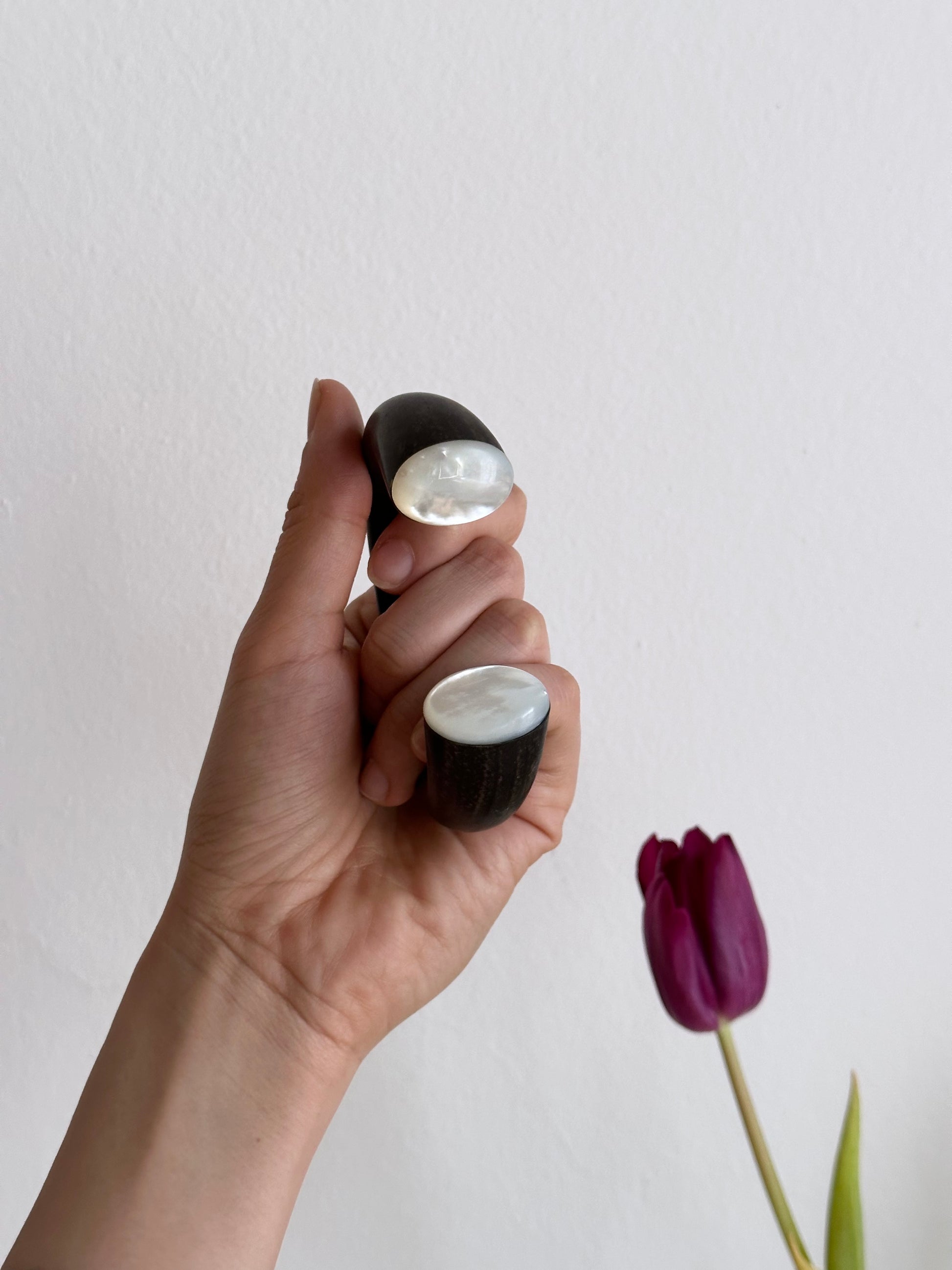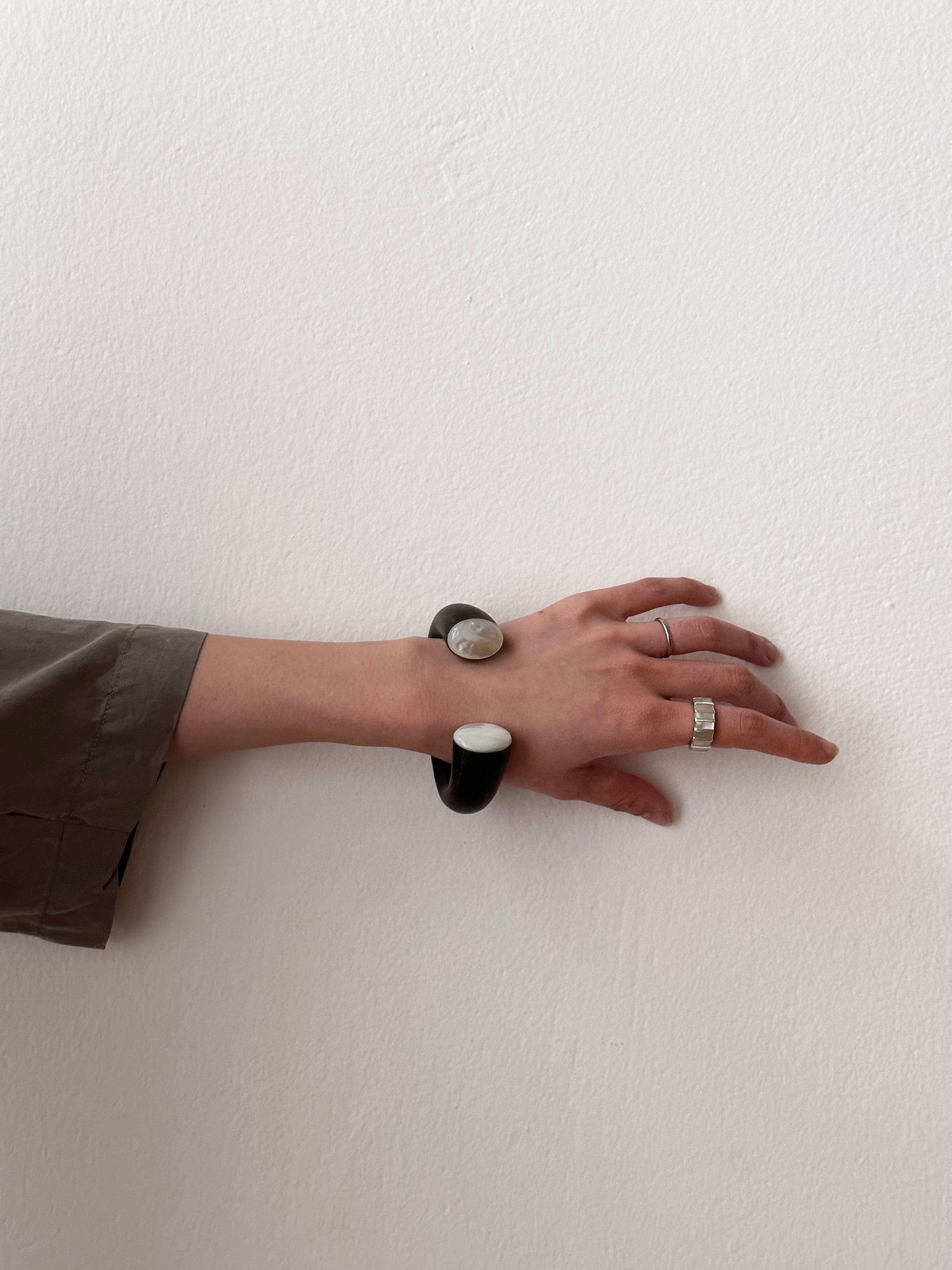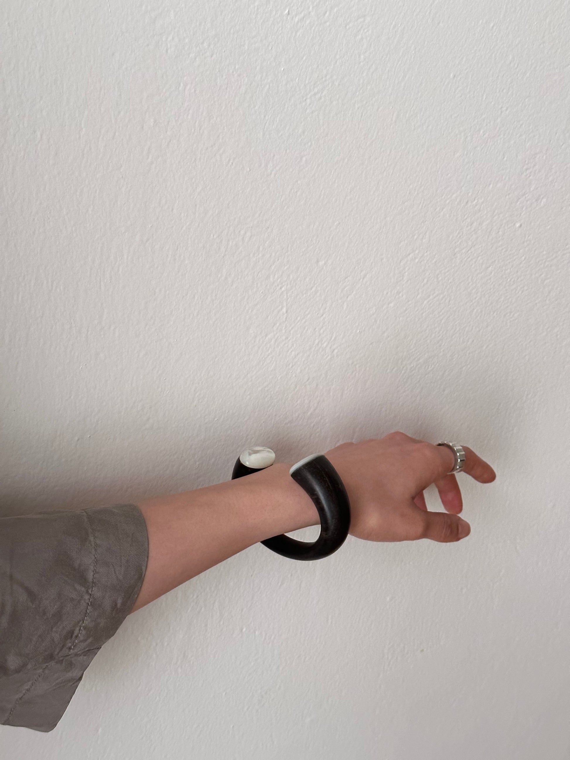 この艶やかなパールホワイトと、木のマットな質感のある黒、