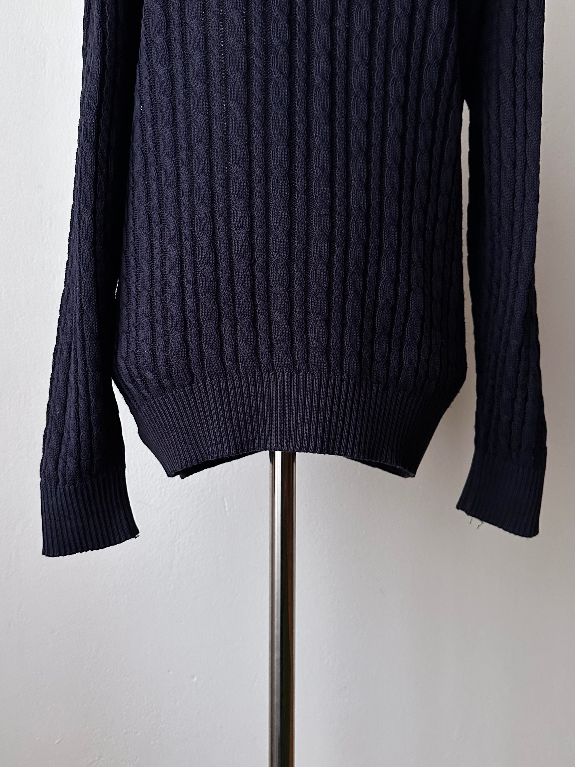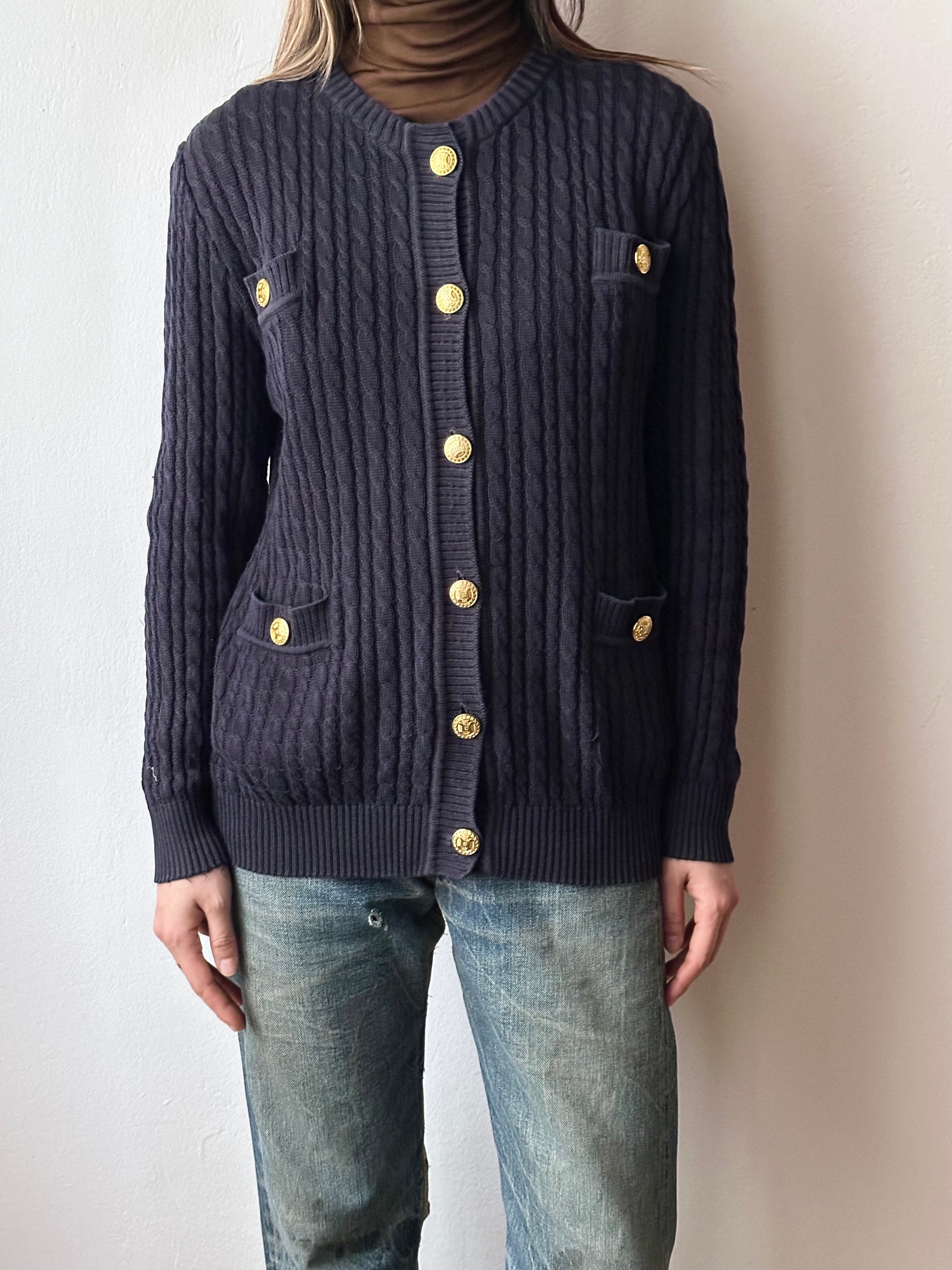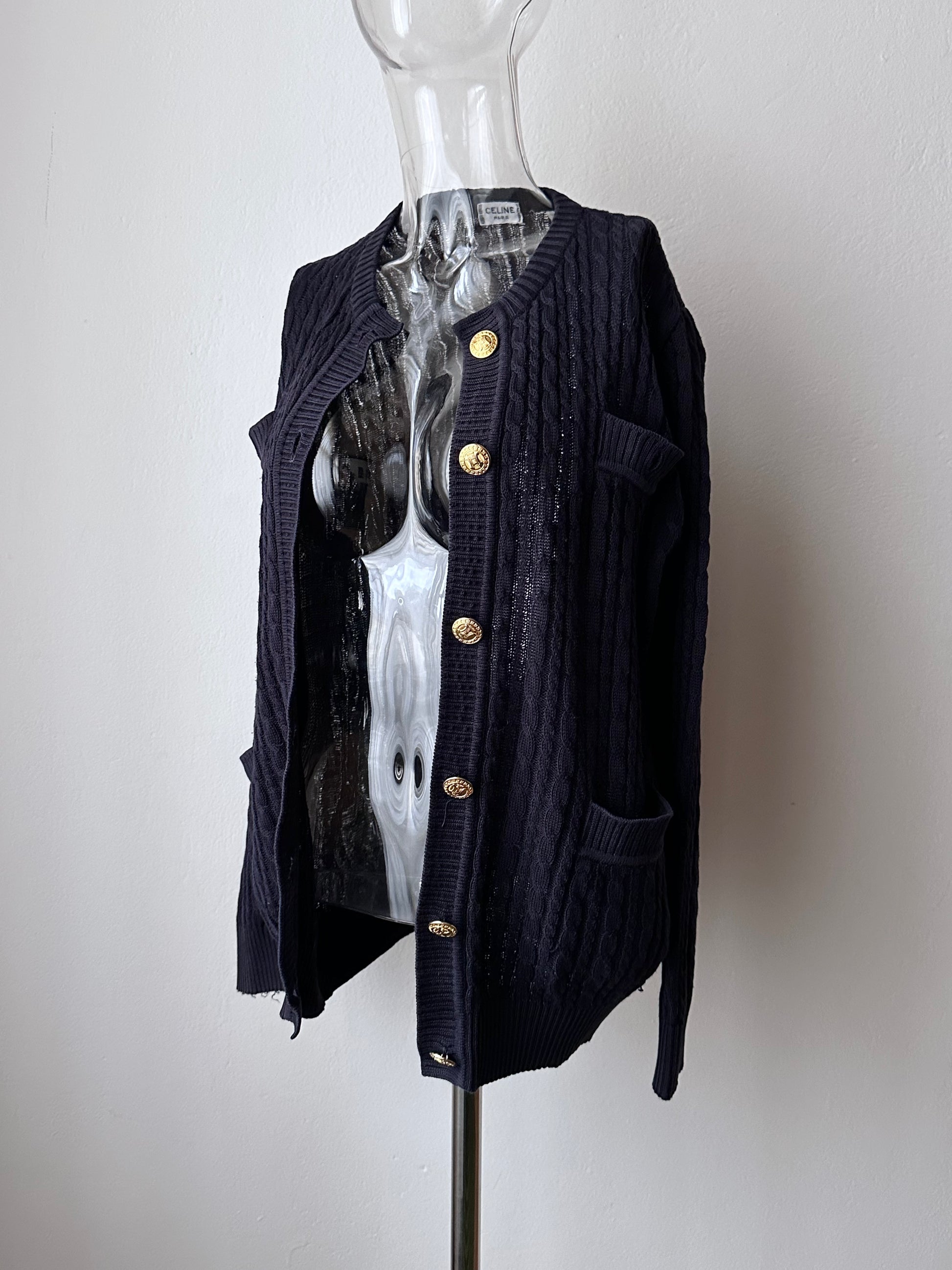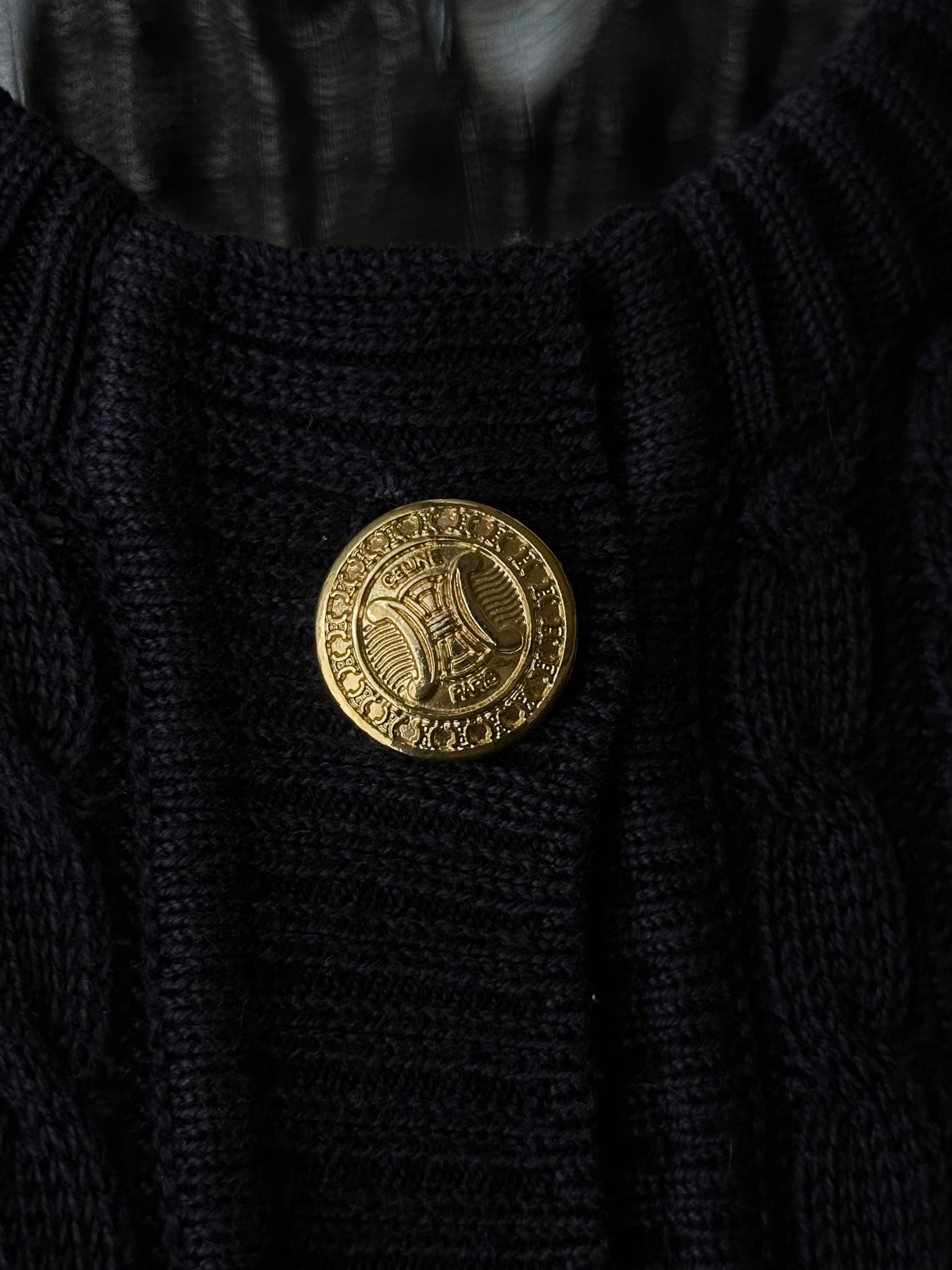 コットンニットのケーブル編みで色はネイビー、セリーヌのロゴが綺麗に彫られたゴールドボタンがプレッピーな雰囲気。