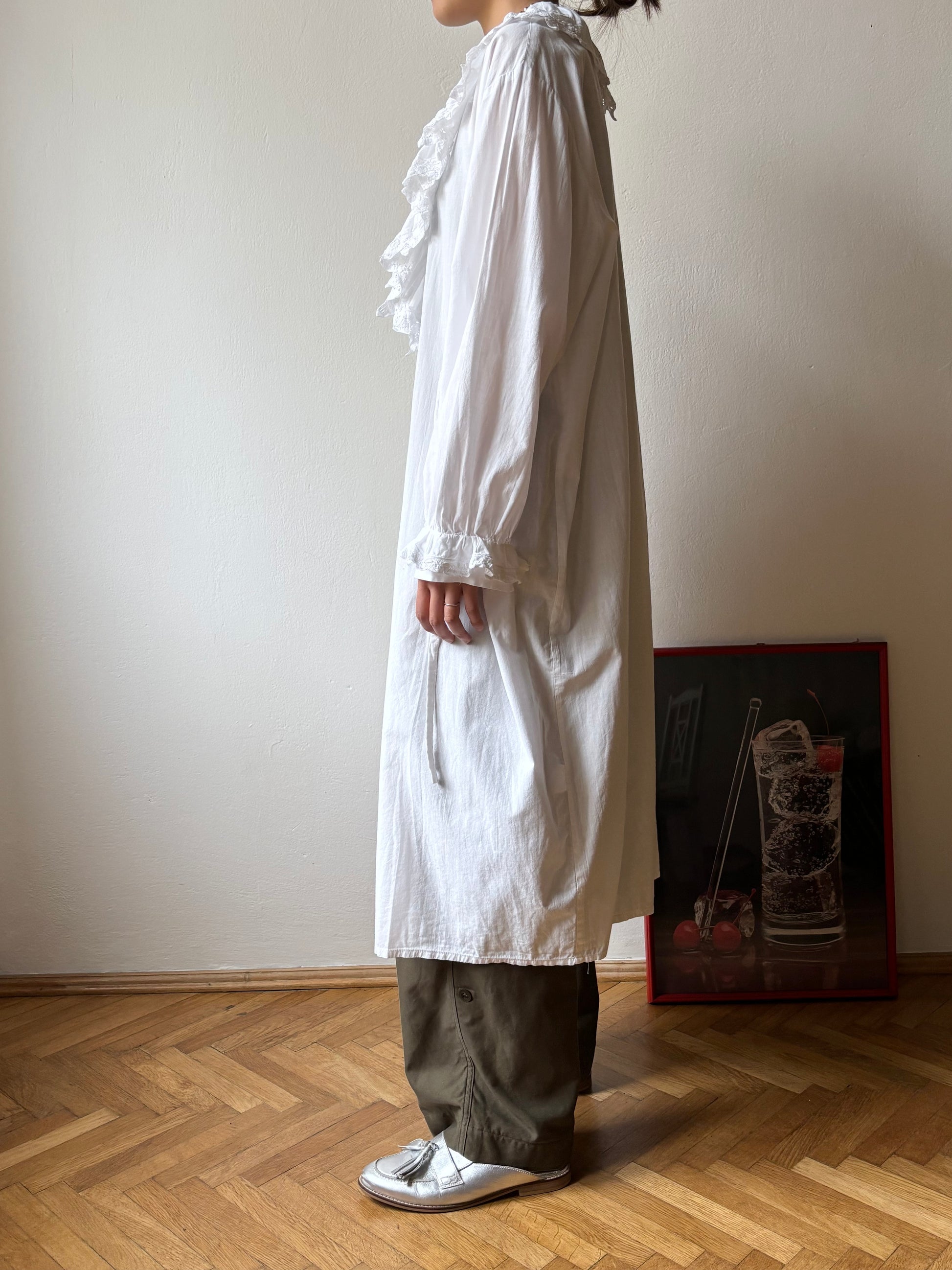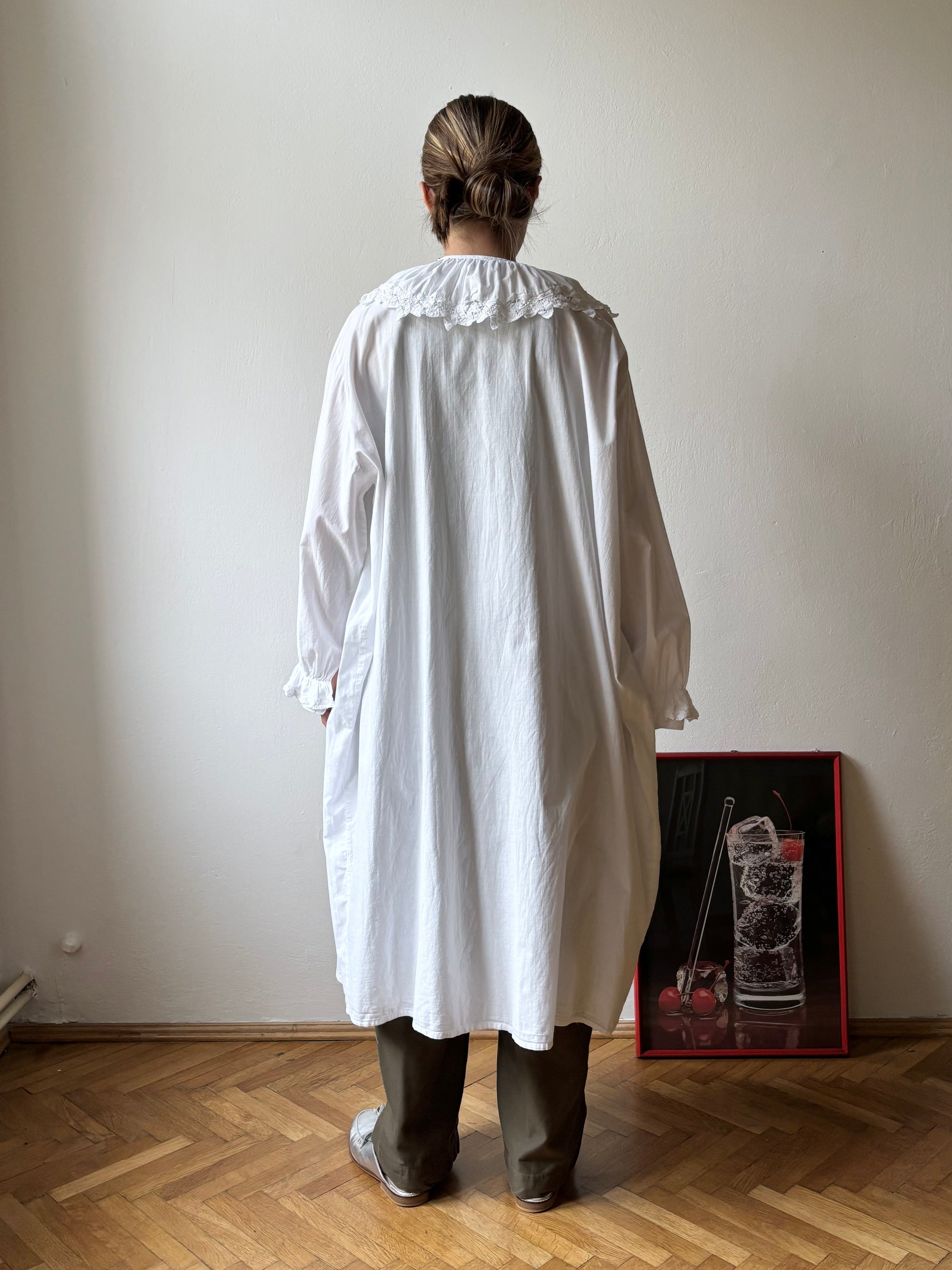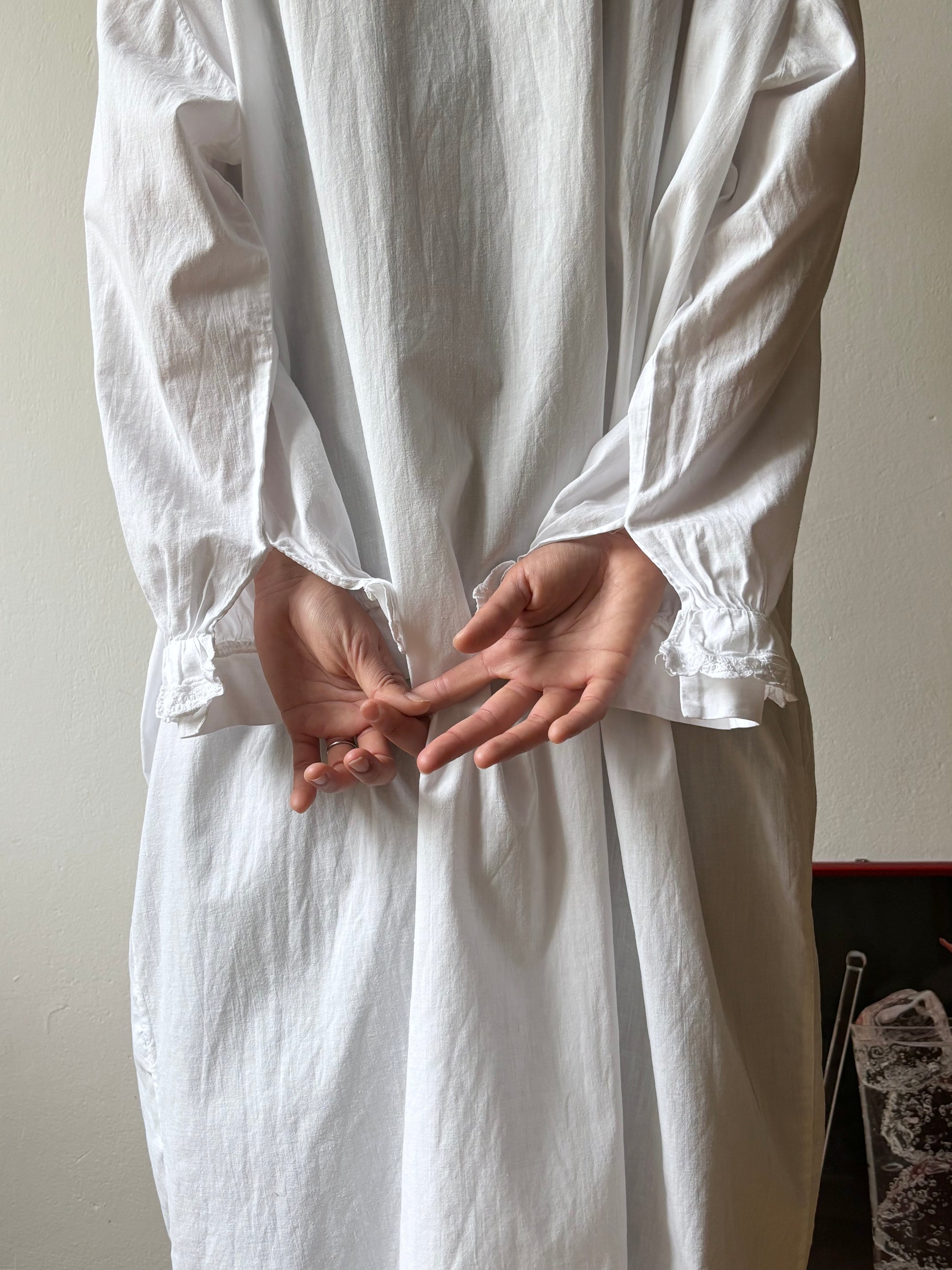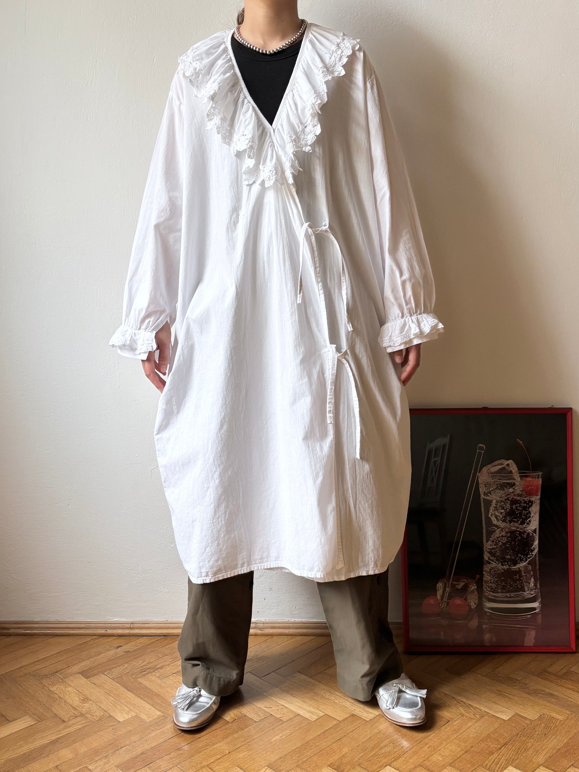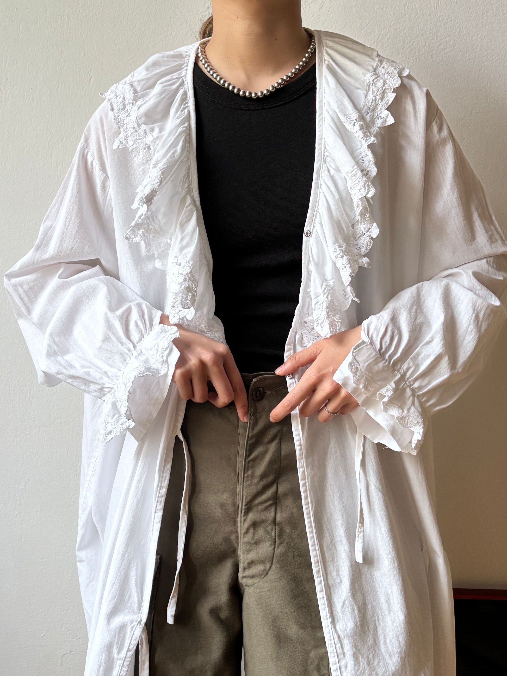ホスピタルガウン風の紐付きのフロントに、襟をぐるりと囲むたっぷりのバテンレースのフリル。