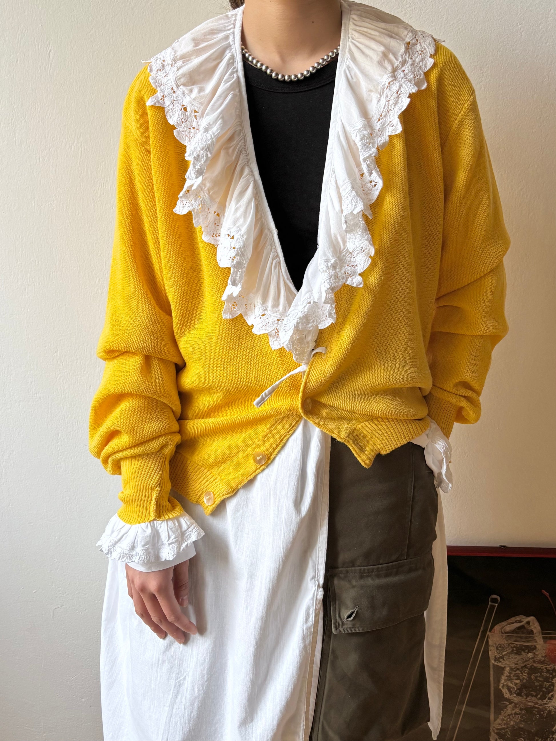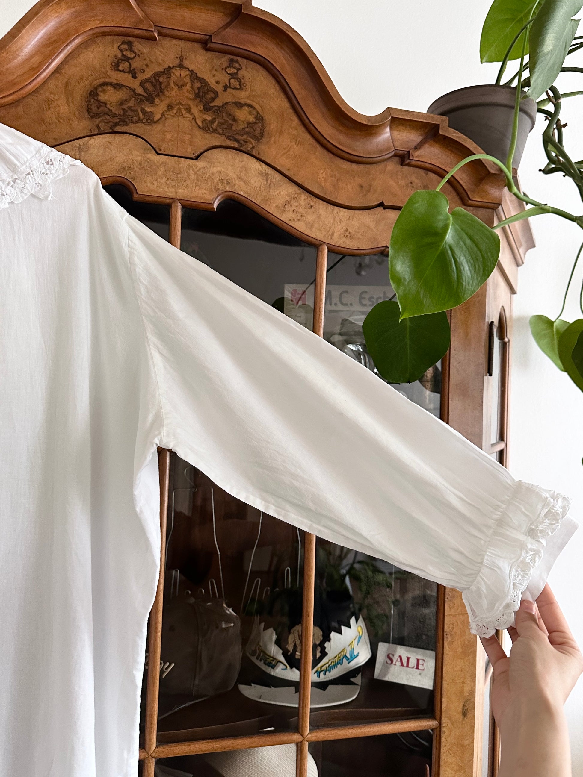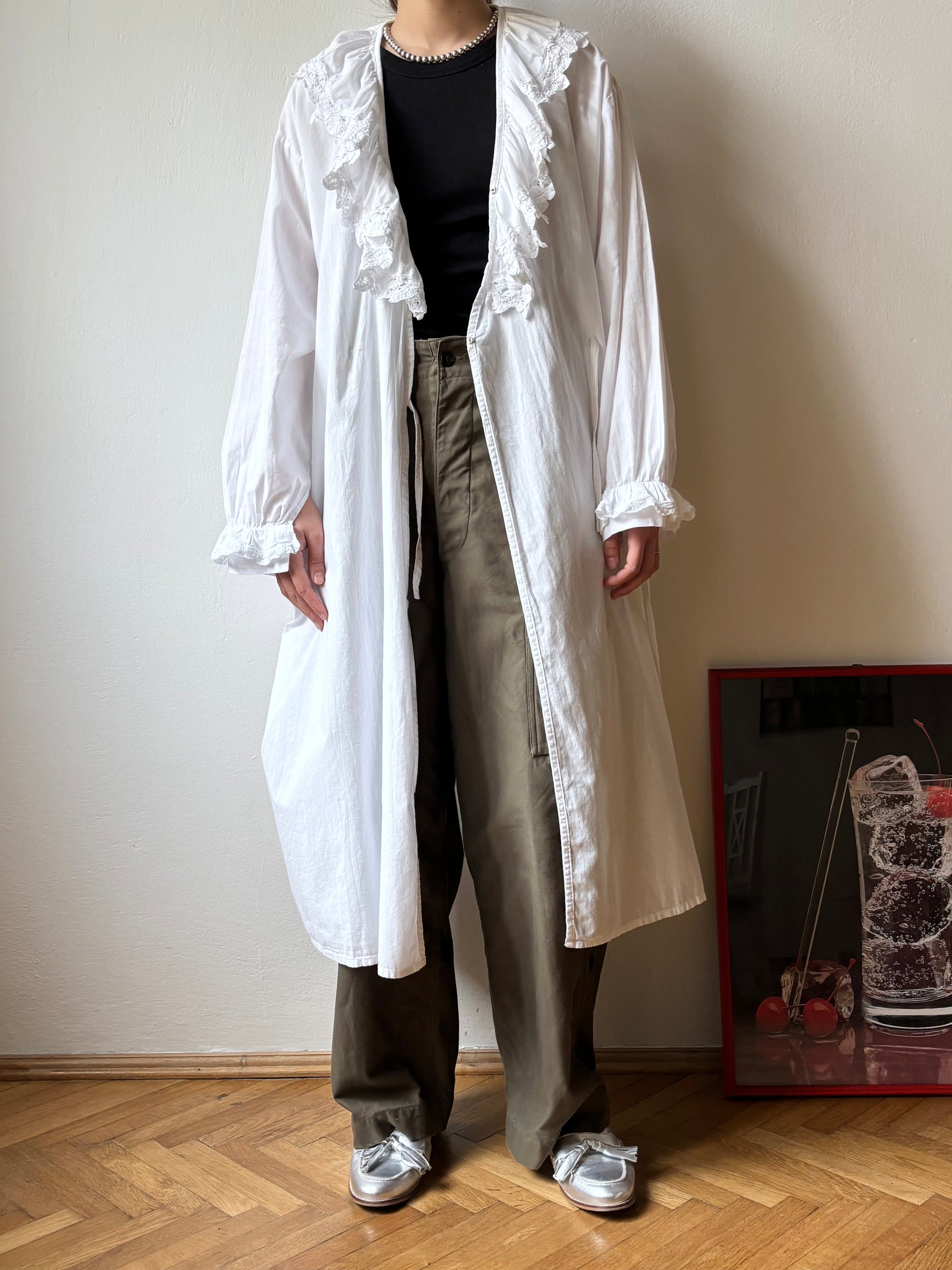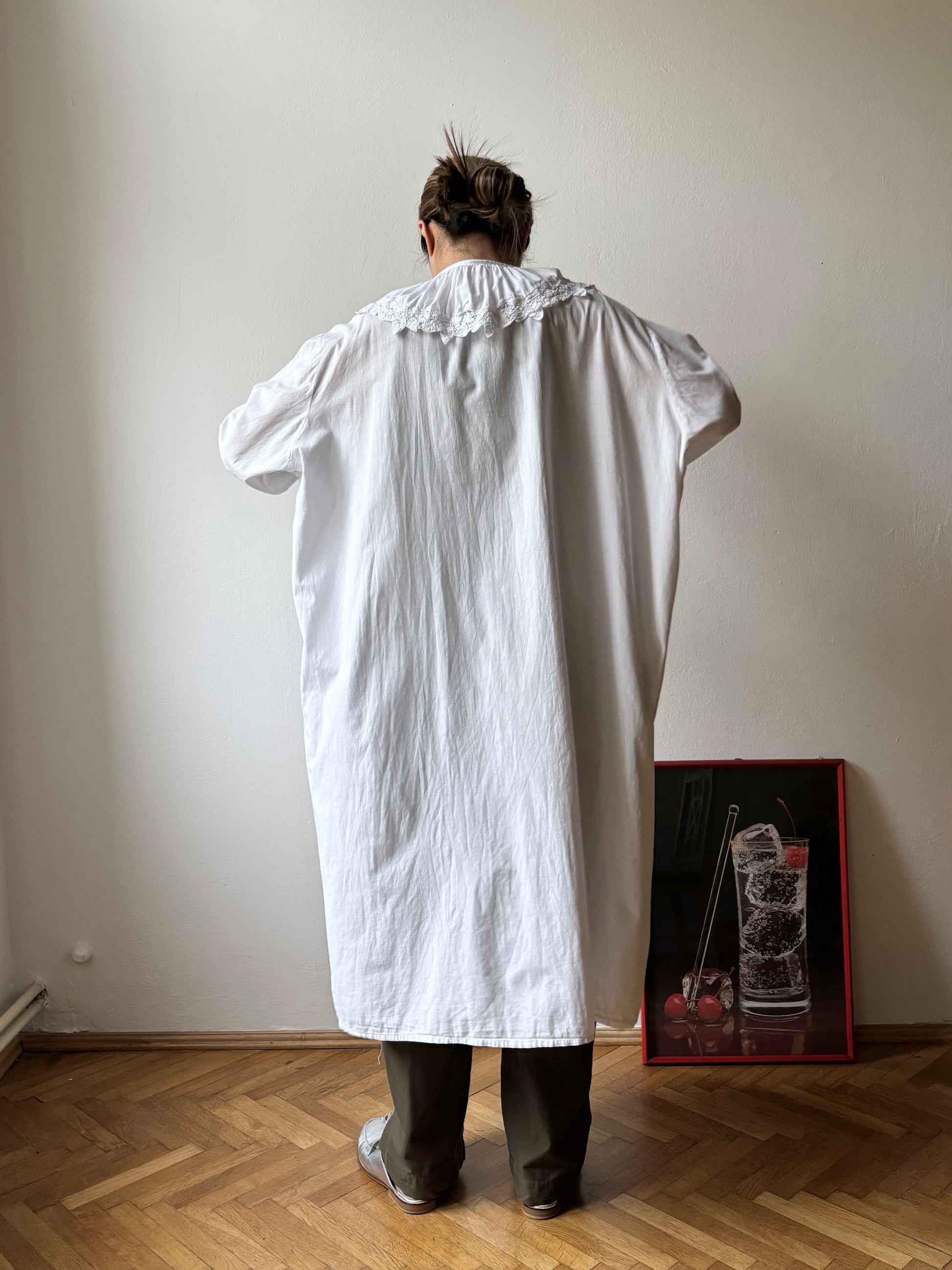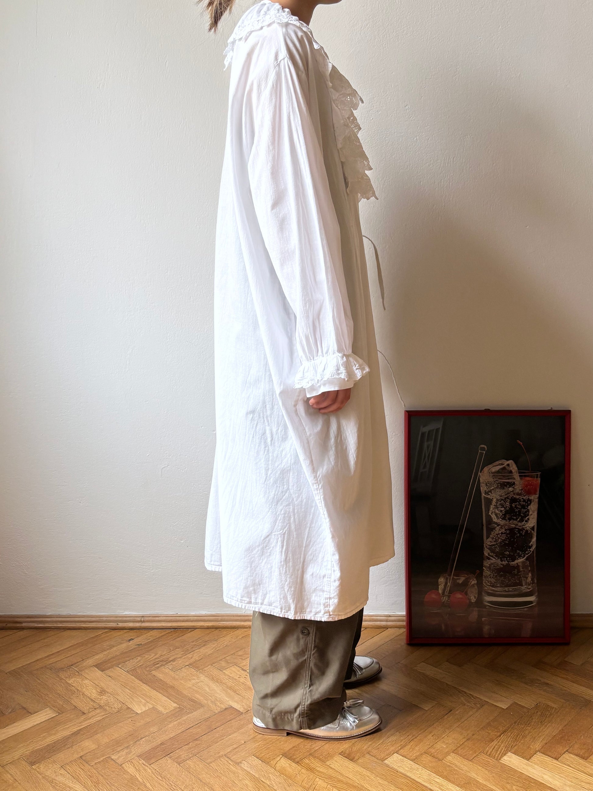 ホスピタルガウン風の紐付きのフロントに、襟をぐるりと囲むたっぷりのバテンレースのフリル。
