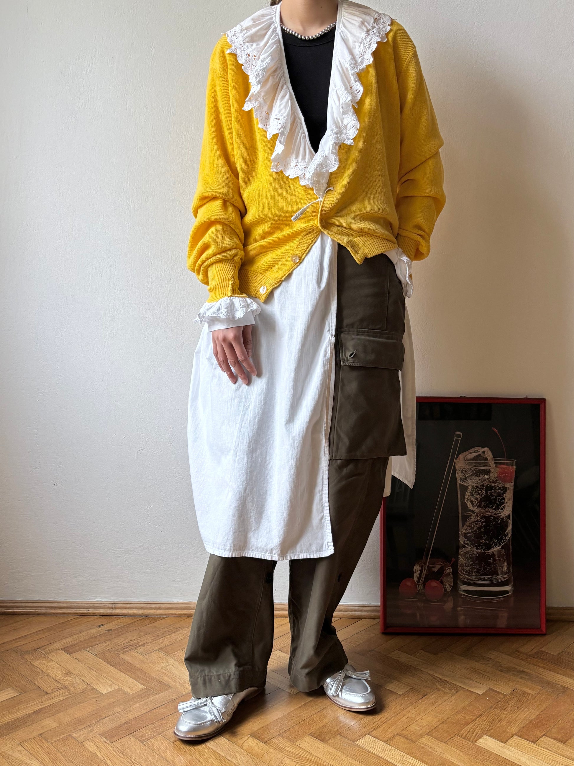 ワーク服サンプリングなレースをあしらったハンドメイドって初めて出会いました。