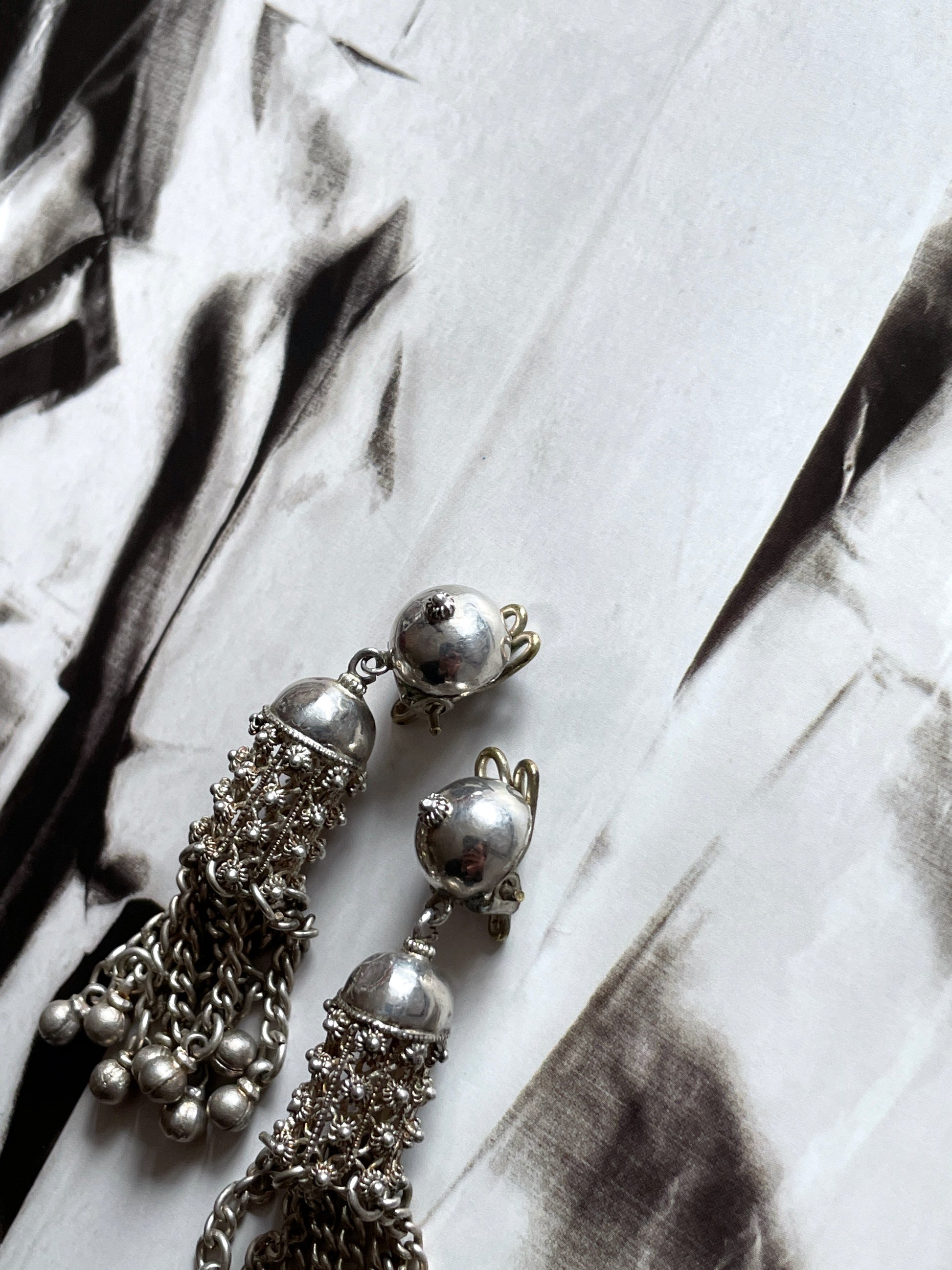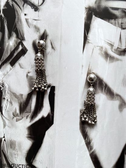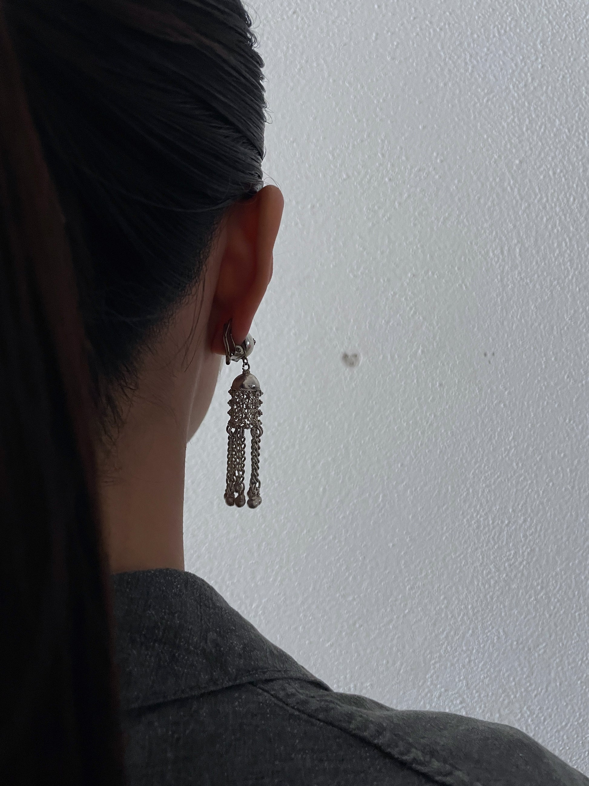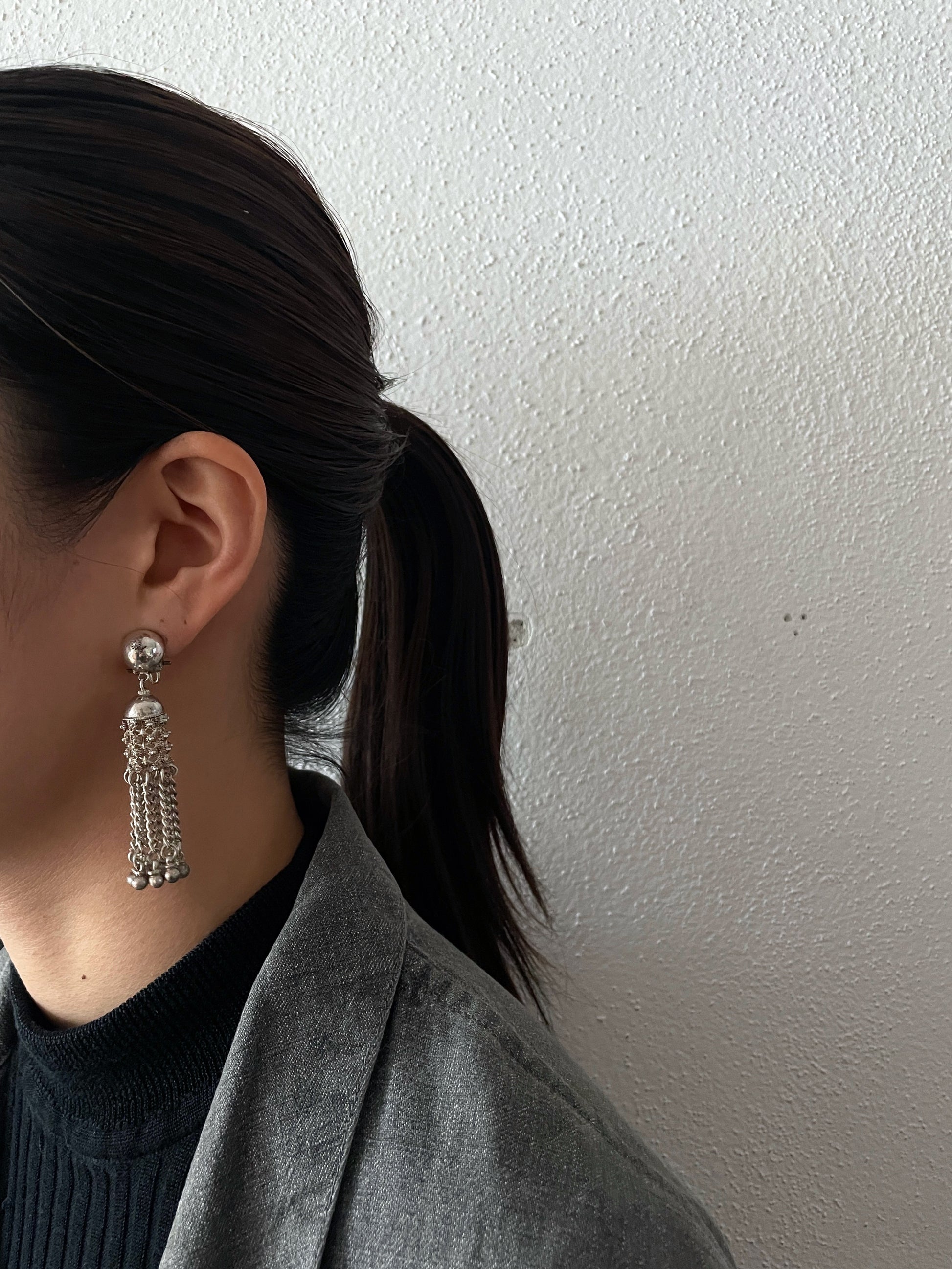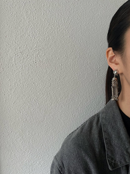Material - 素材 刻印がなく詳細不明ですが、恐らく耳につける土台部分はシルバーだと思います。揺れるフリンジ部分は軽い鉄素材になります。