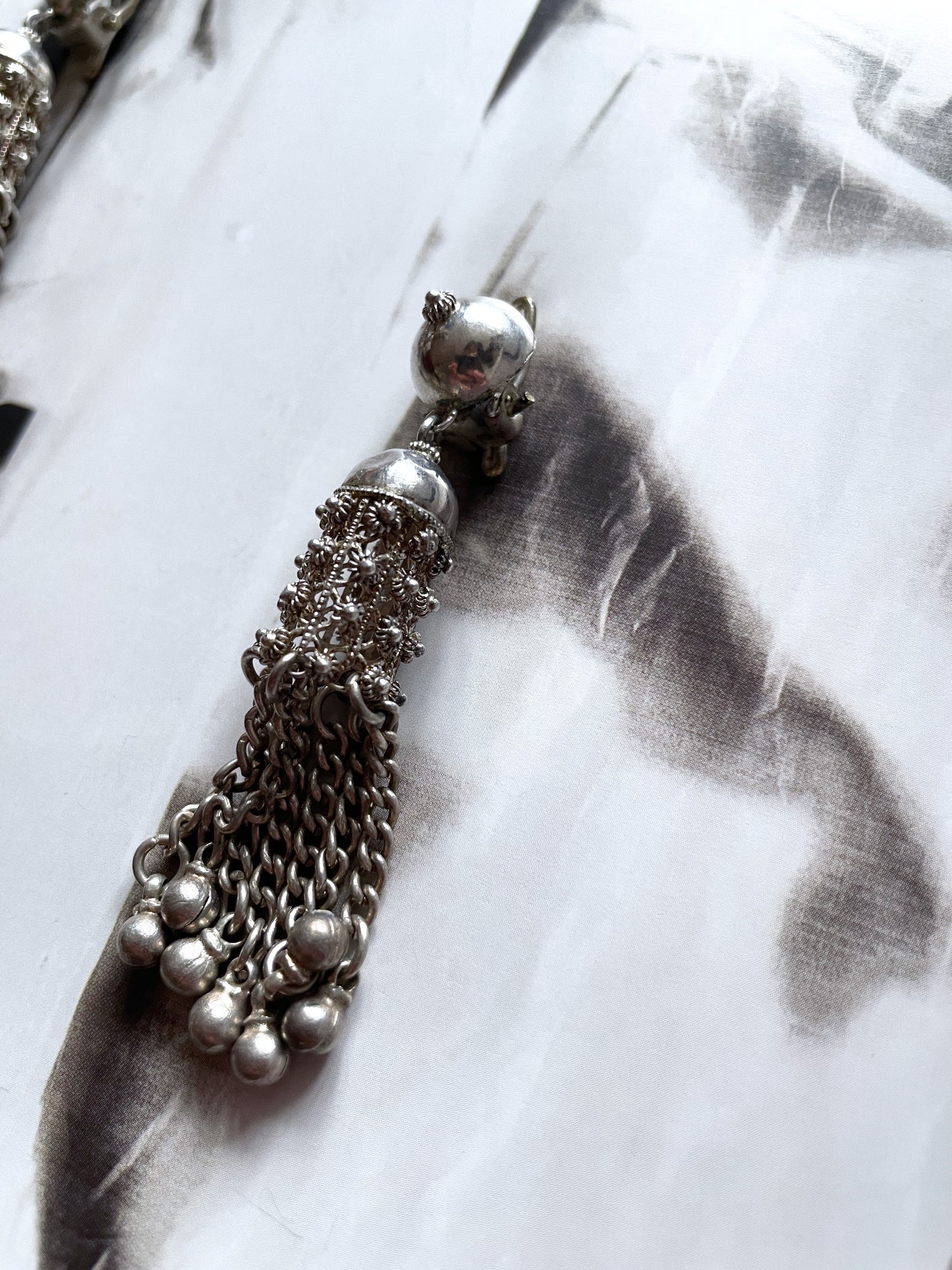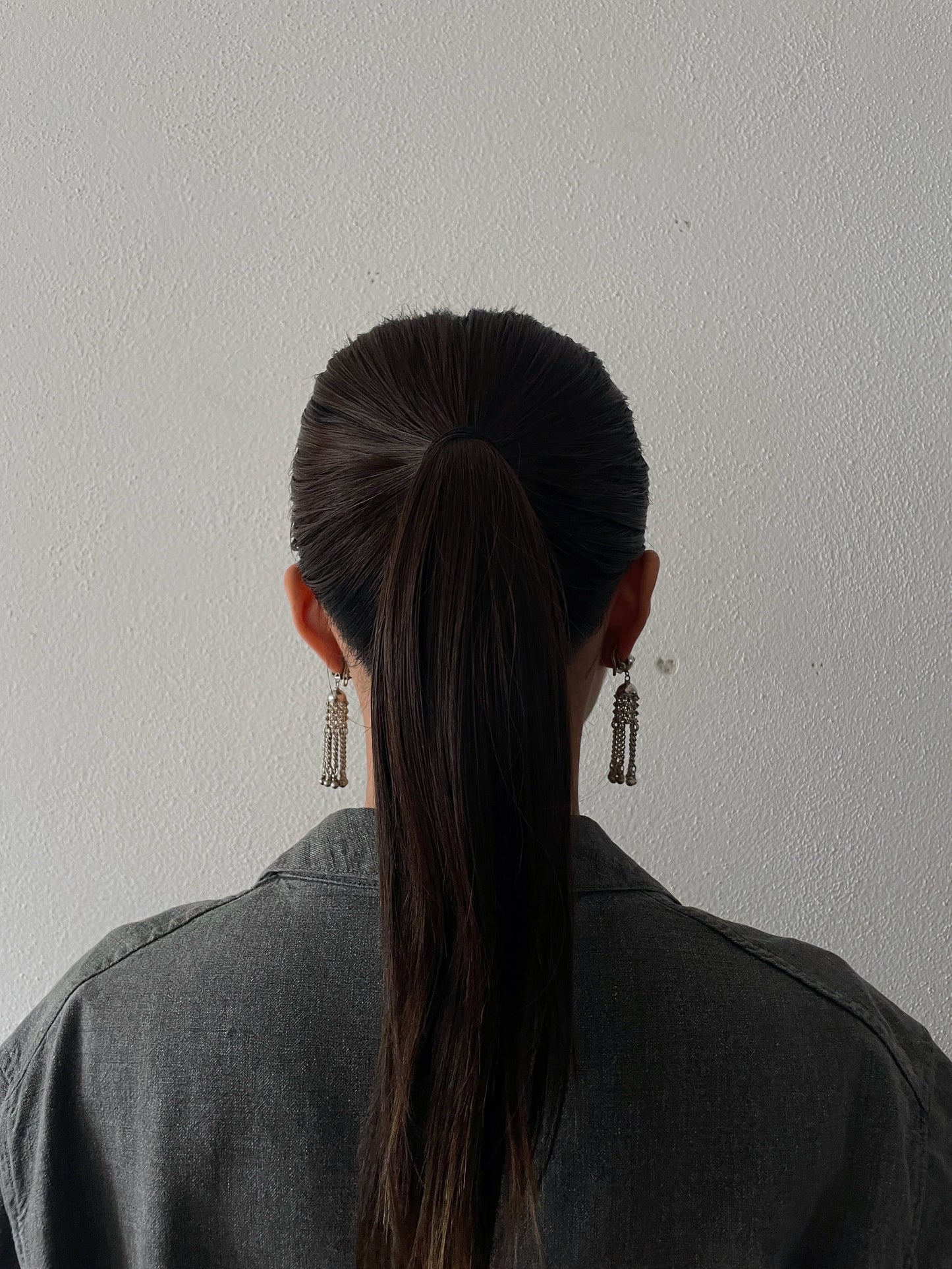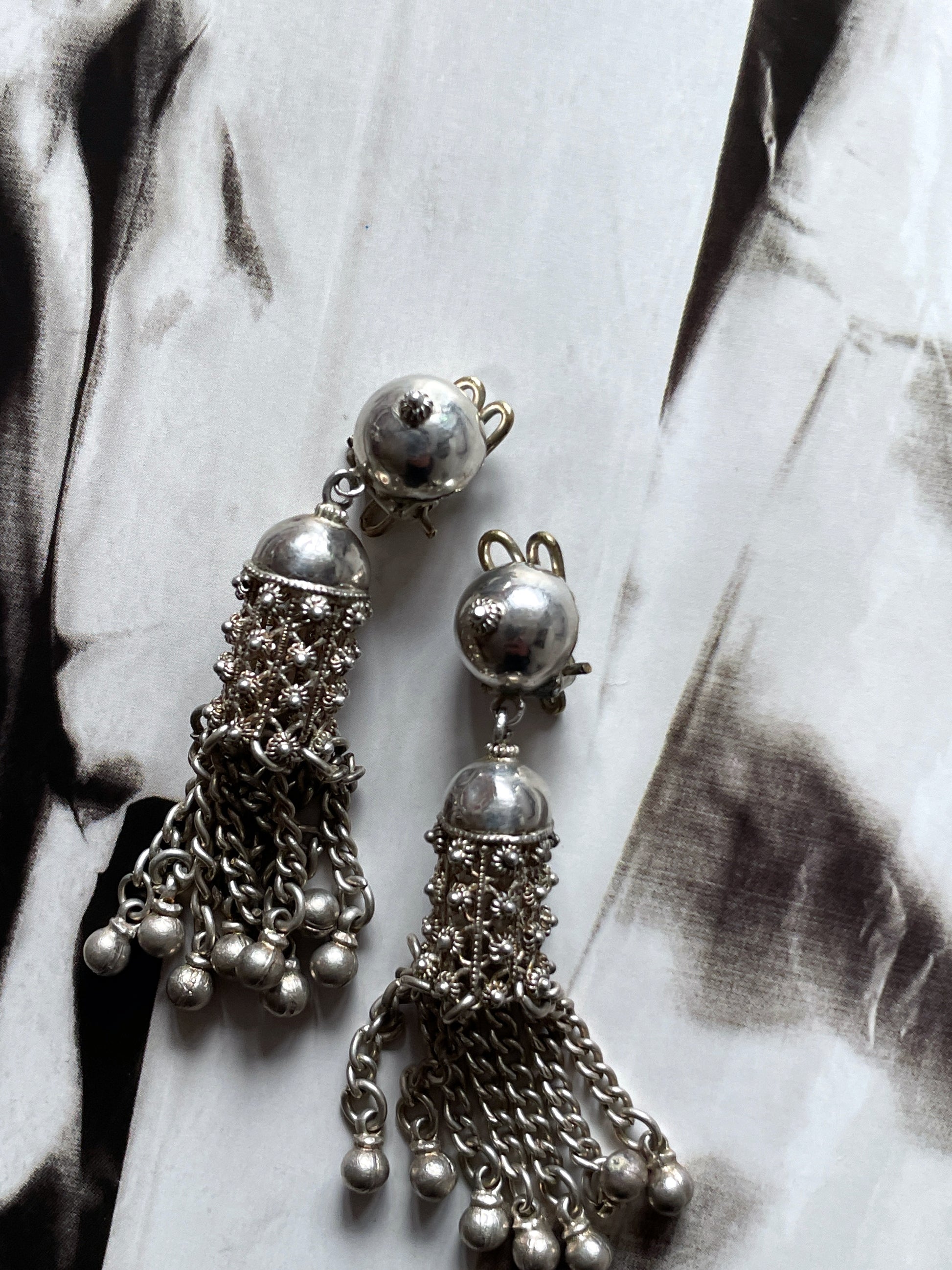 Material - 素材 刻印がなく詳細不明ですが、恐らく耳につける土台部分はシルバーだと思います。揺れるフリンジ部分は軽い鉄素材になります。