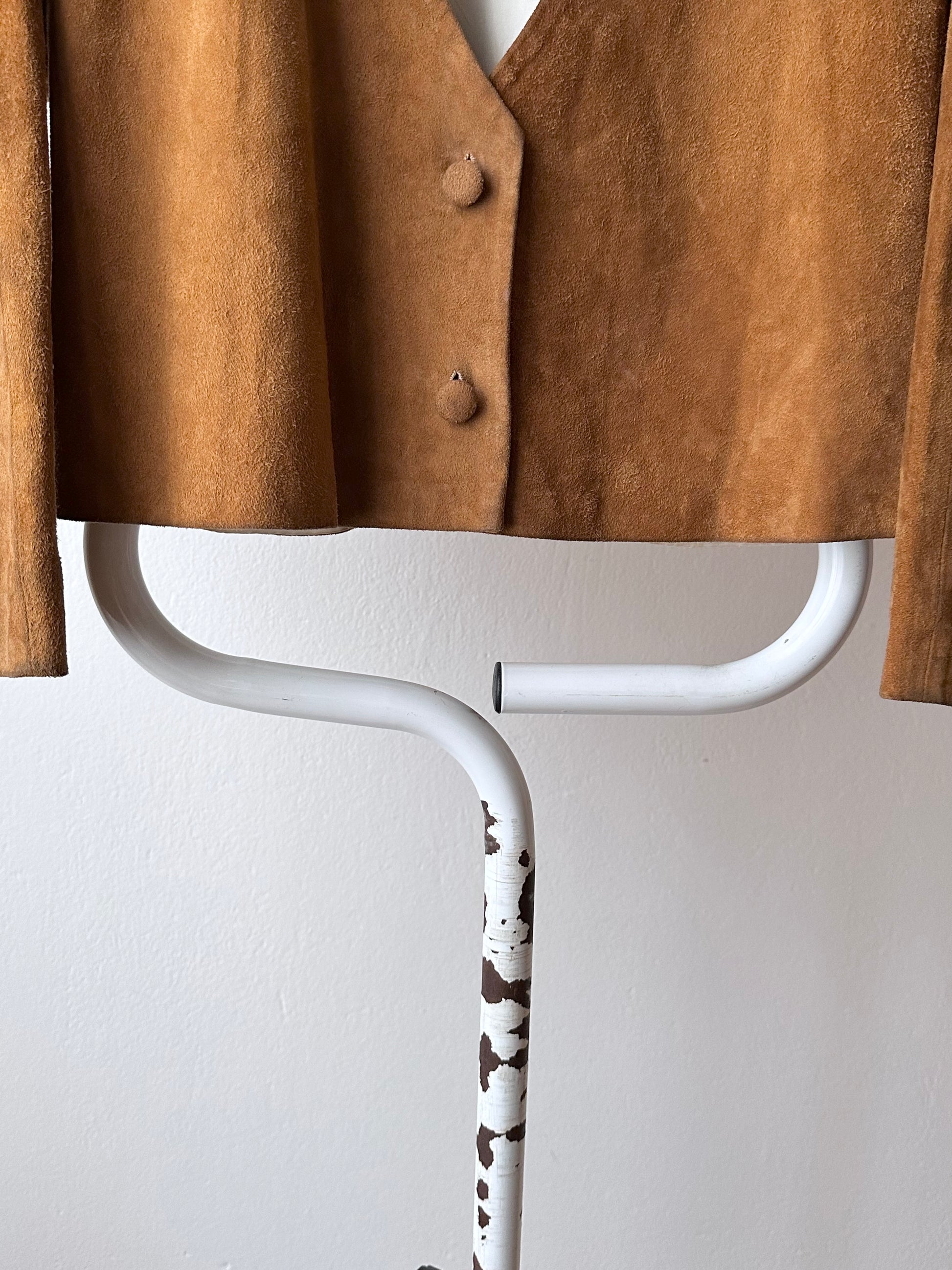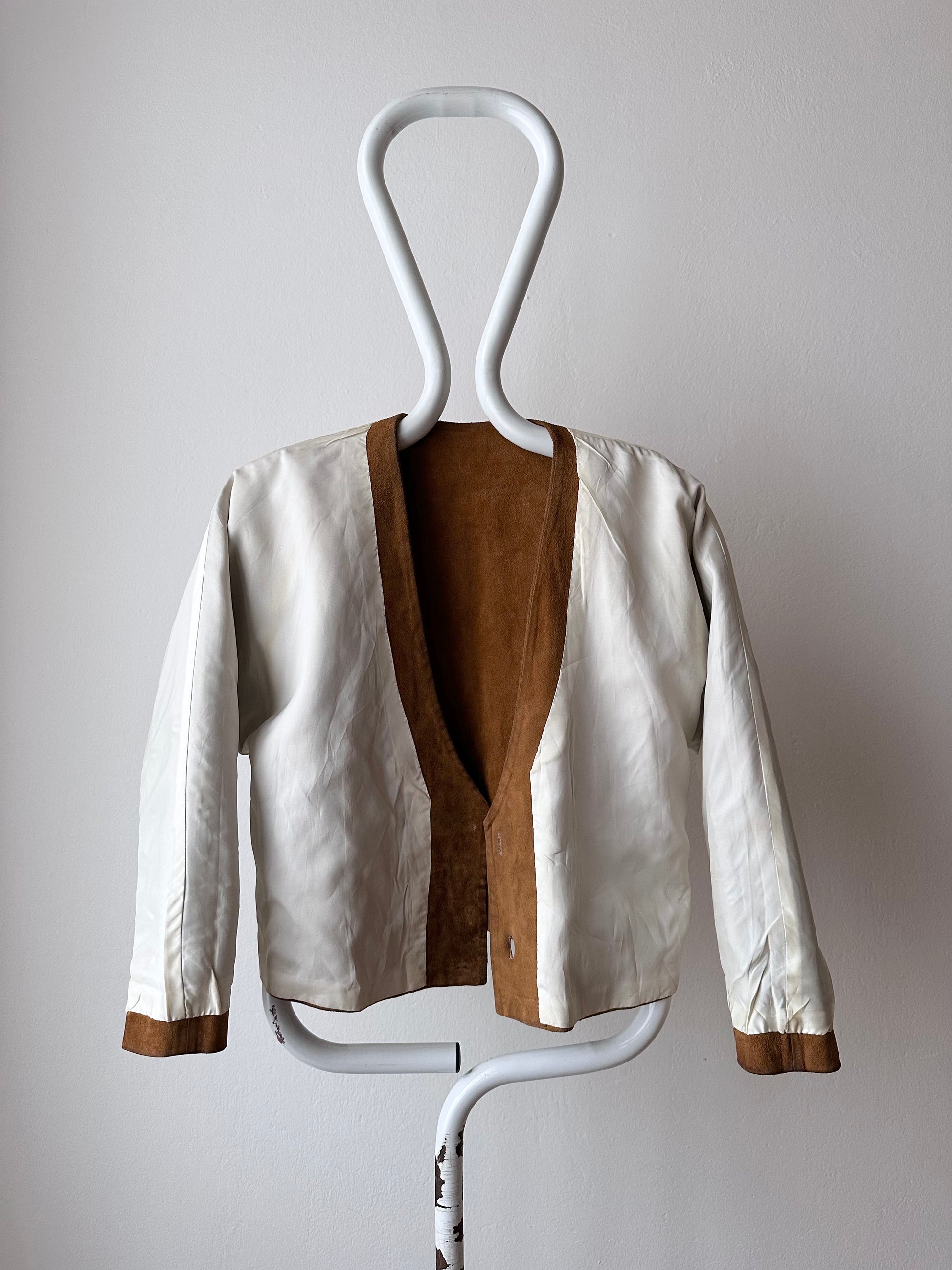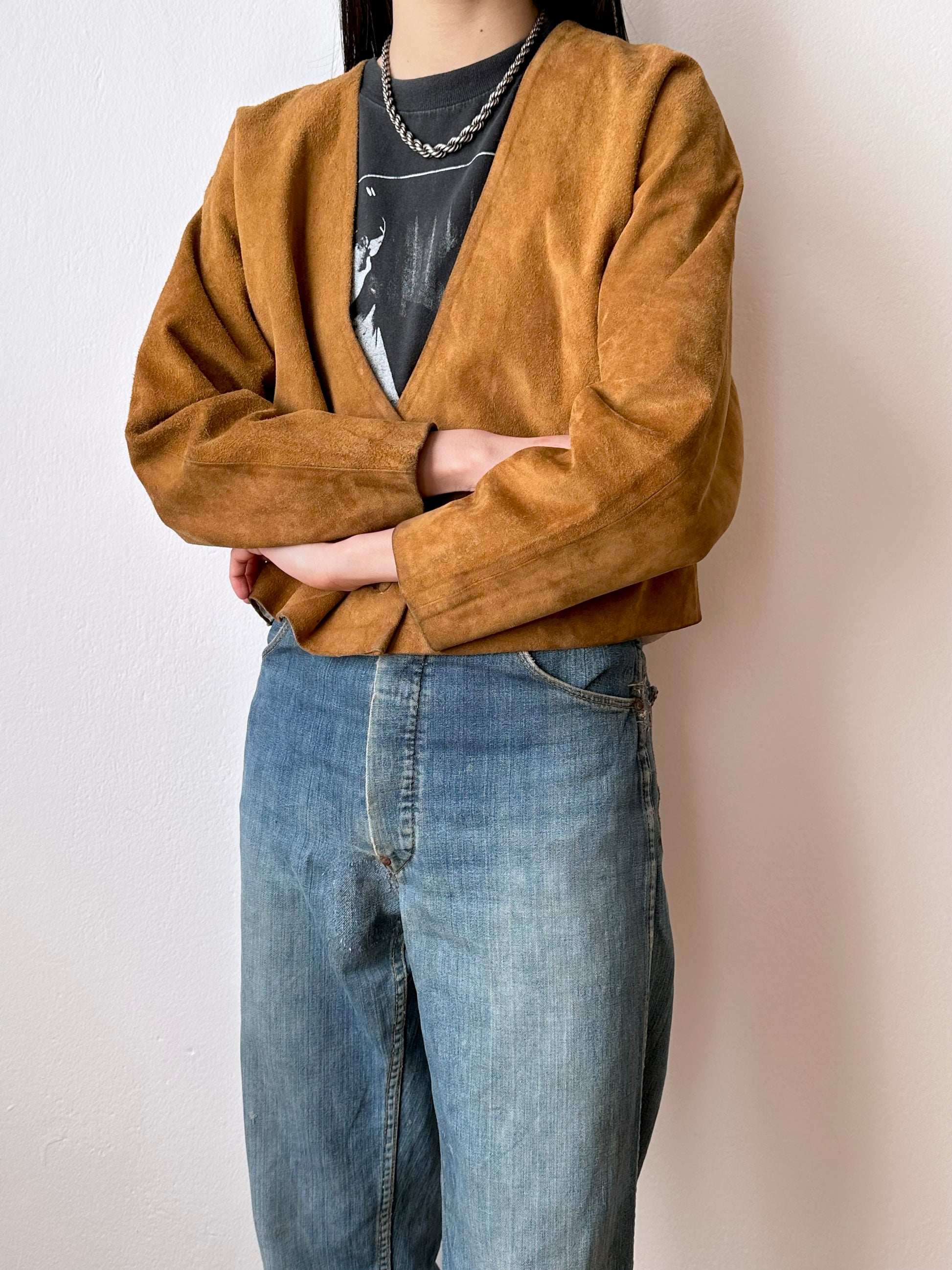 一枚革のドルマンスリーブで短丈、2つのくるみボタンなど
