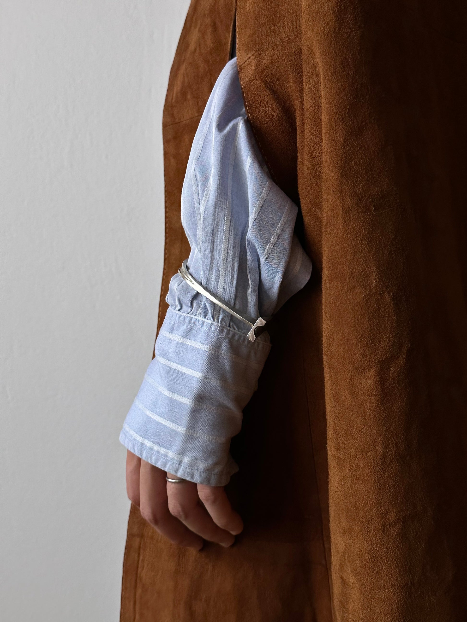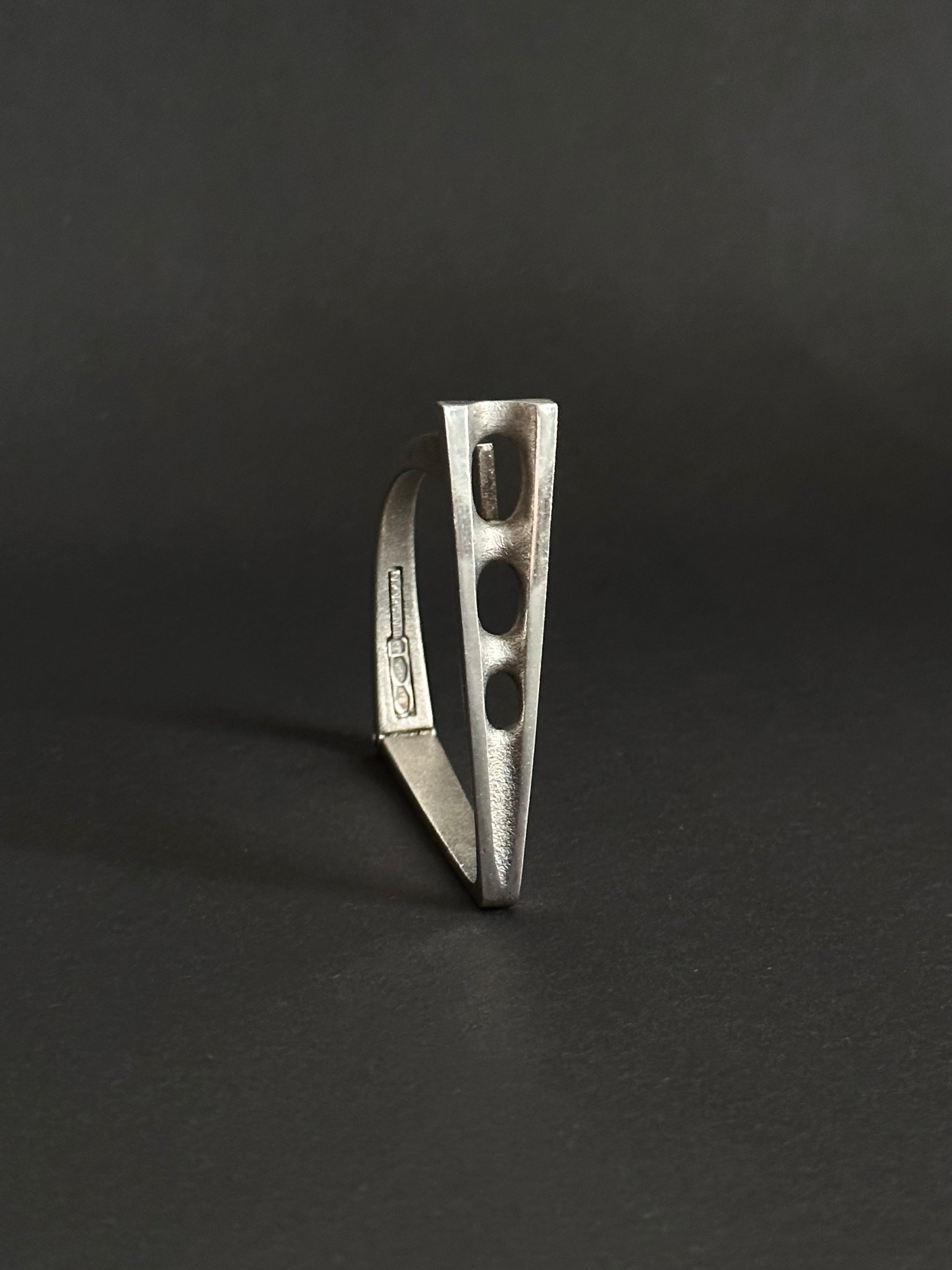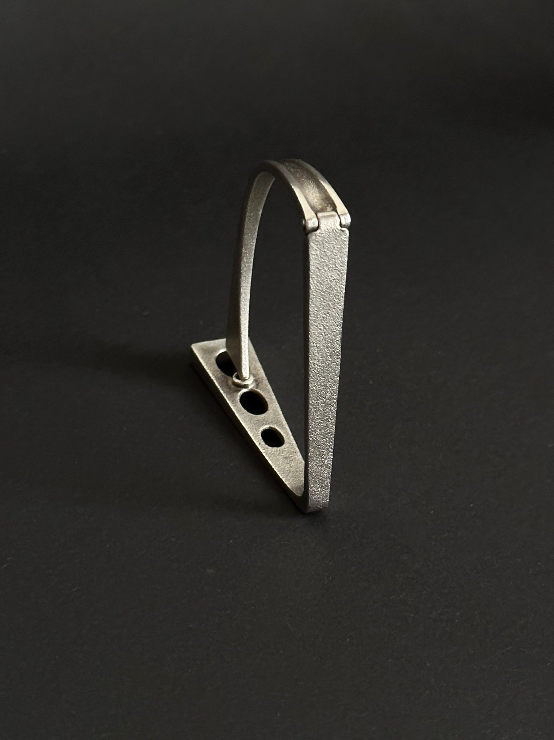 ざらっとした表面のマットなシルバーと、ツルッと磨き上げたシルバーの2面の組み合わせ、
