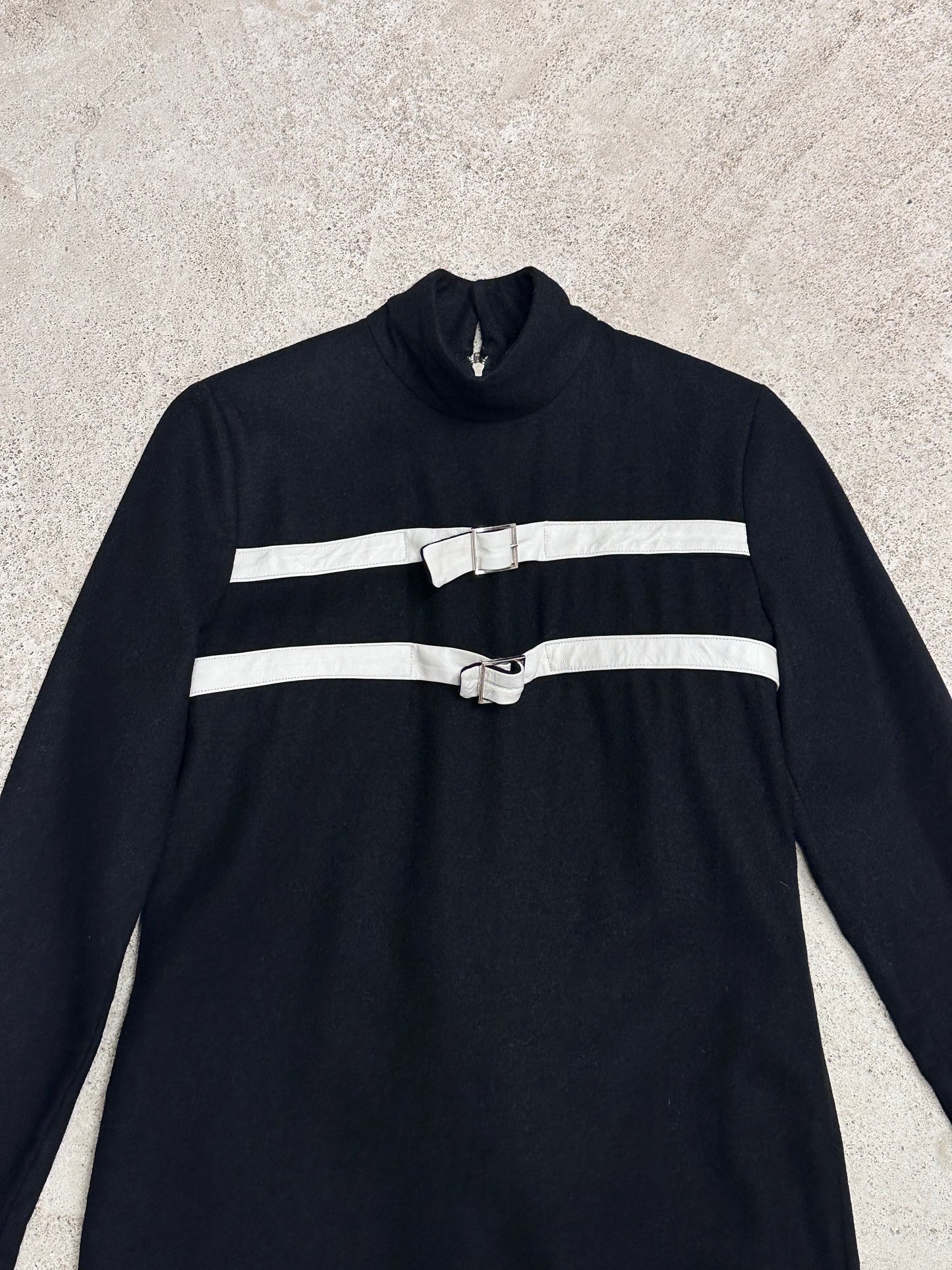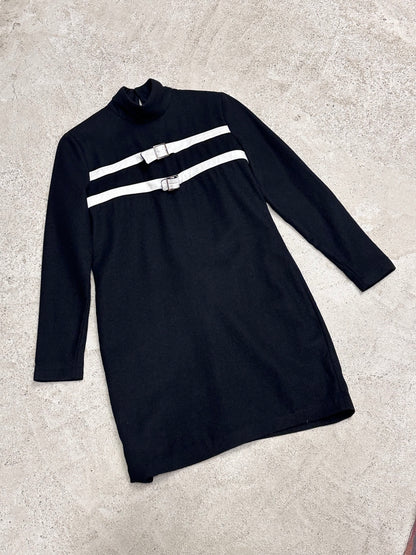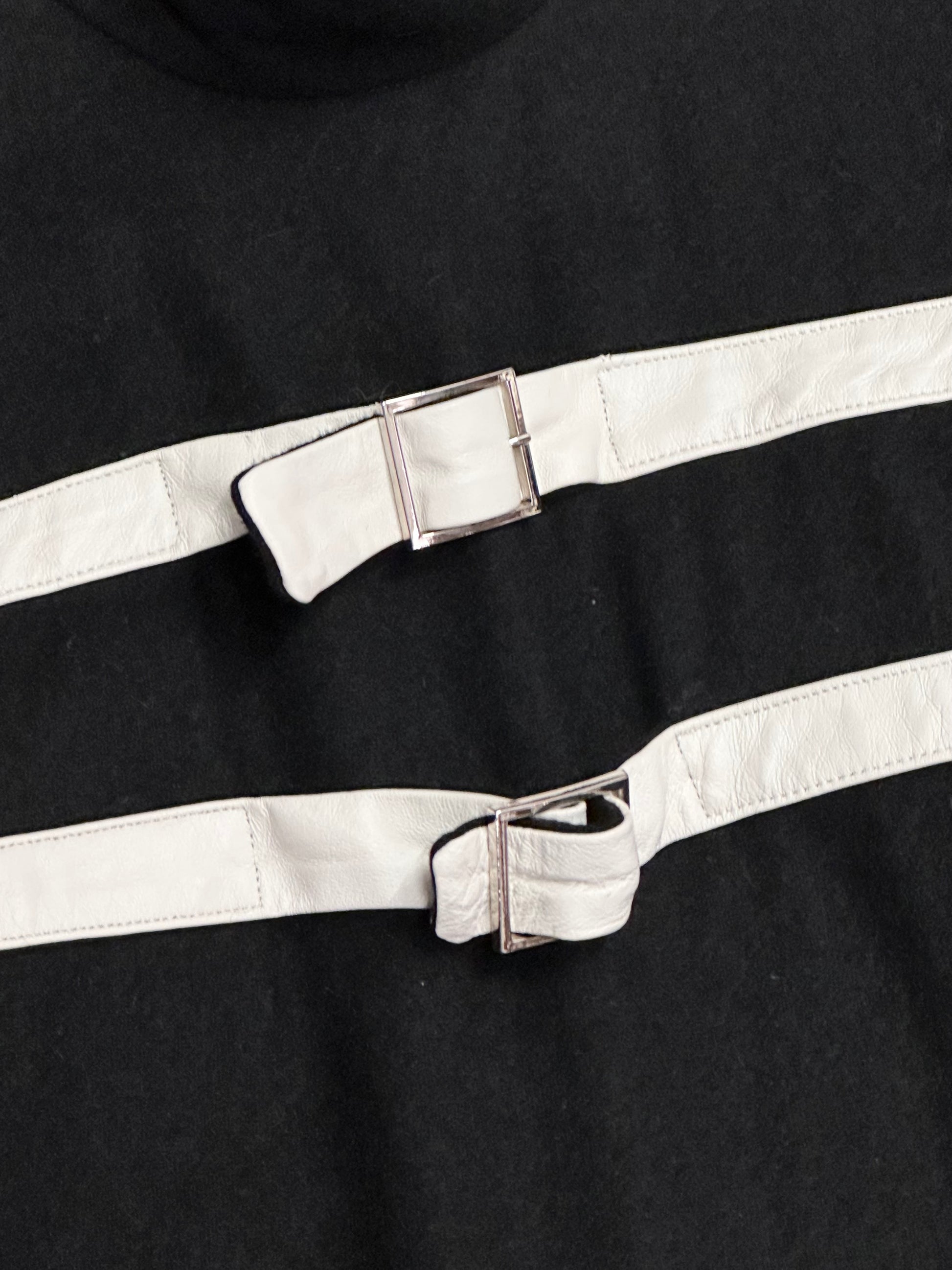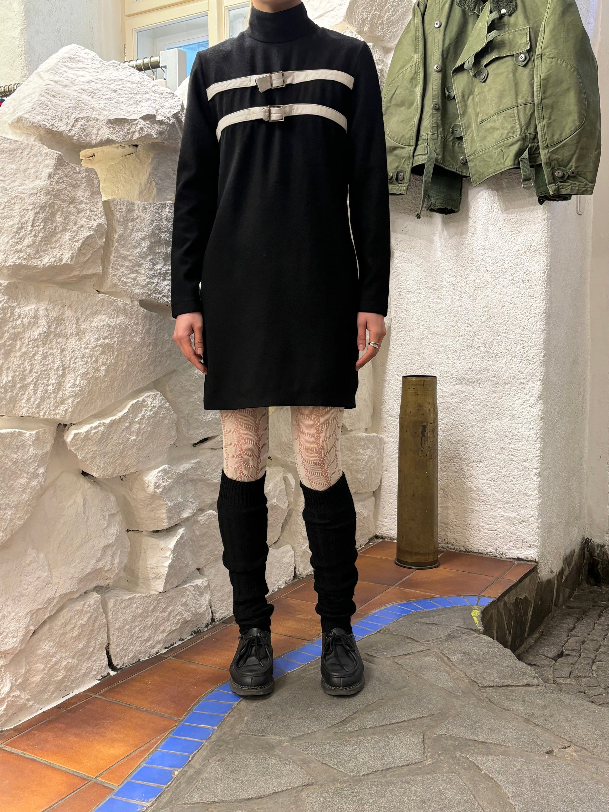 タイトめなミニドレス、胸に2本のレザーベルト(恐らく合皮)が走っています。