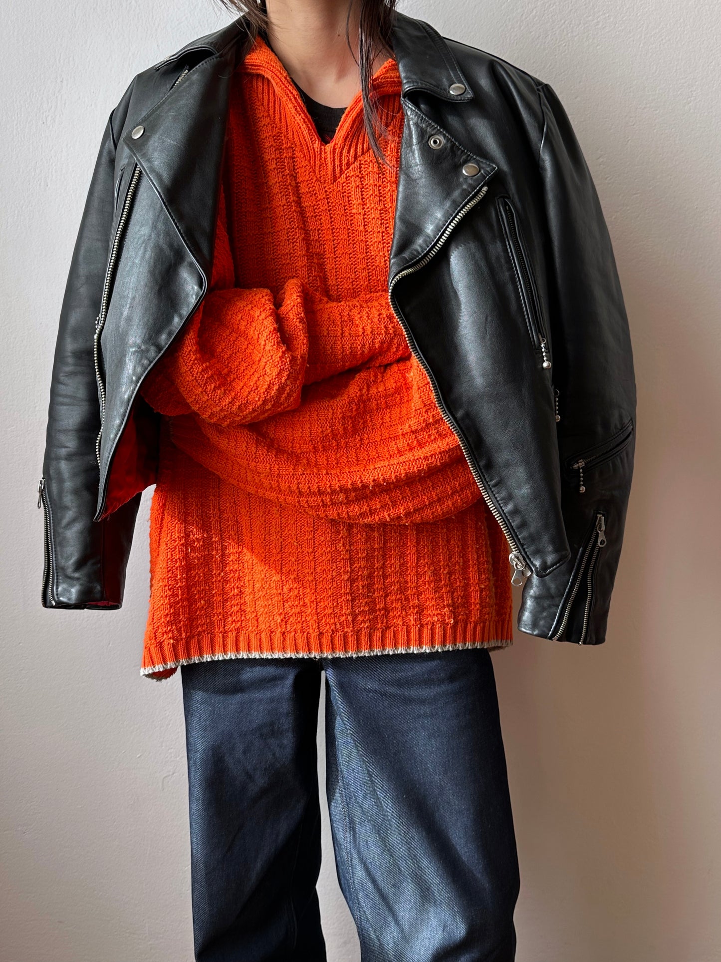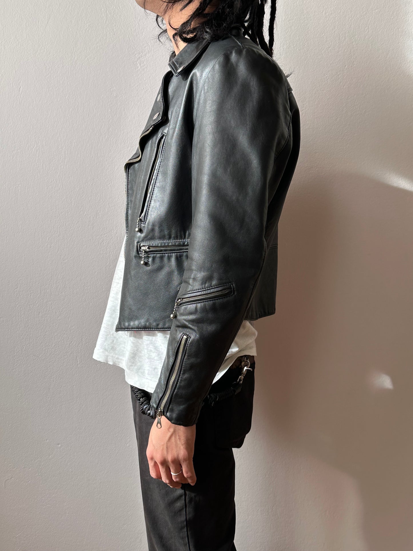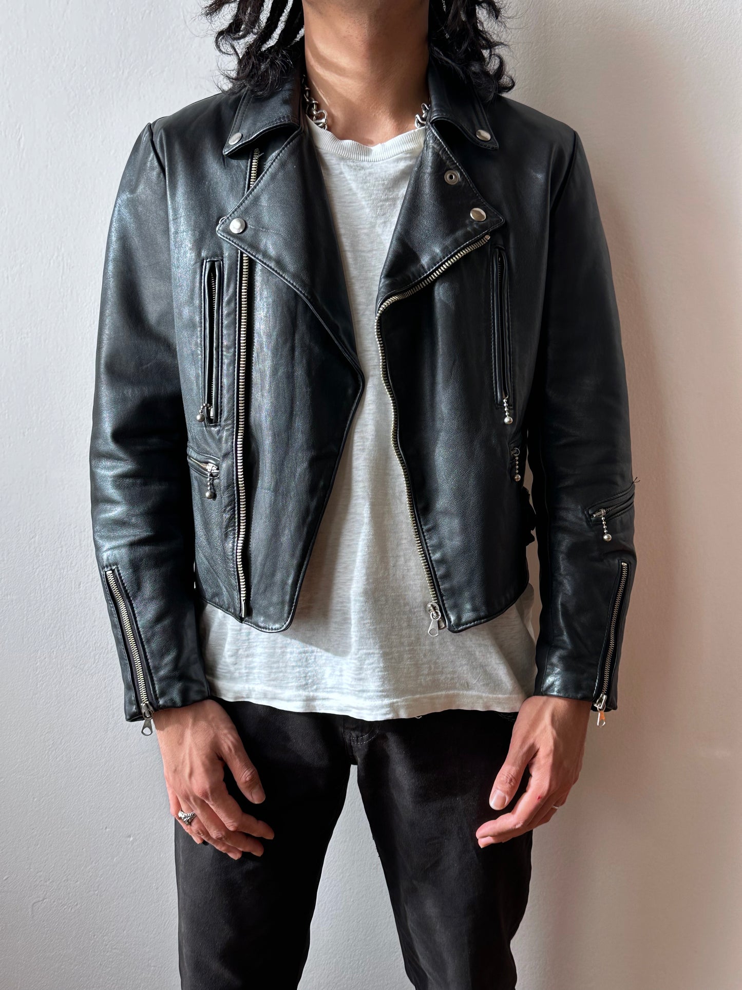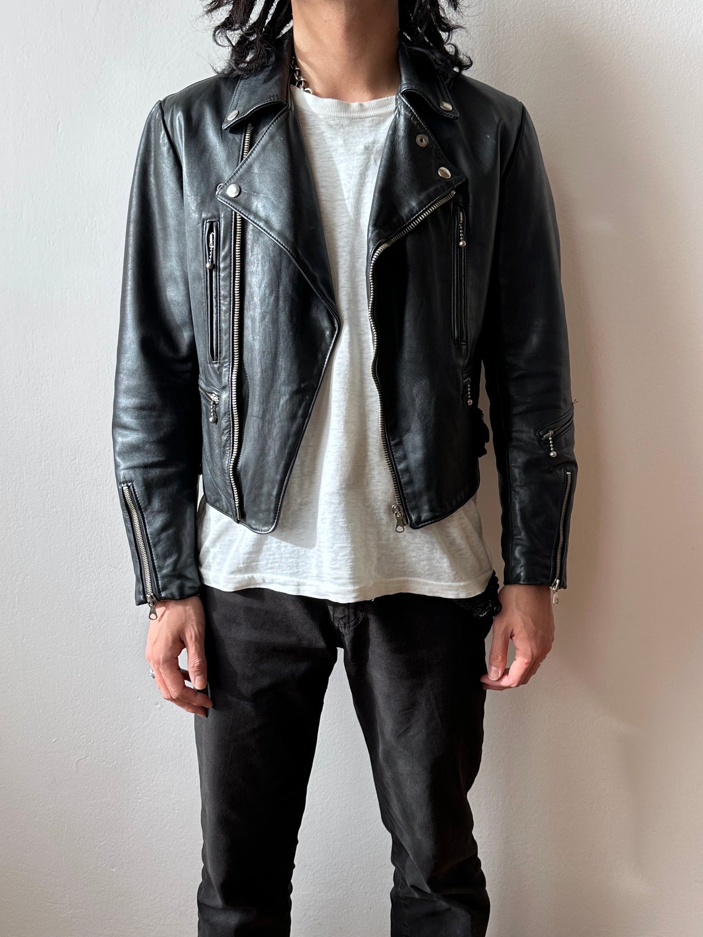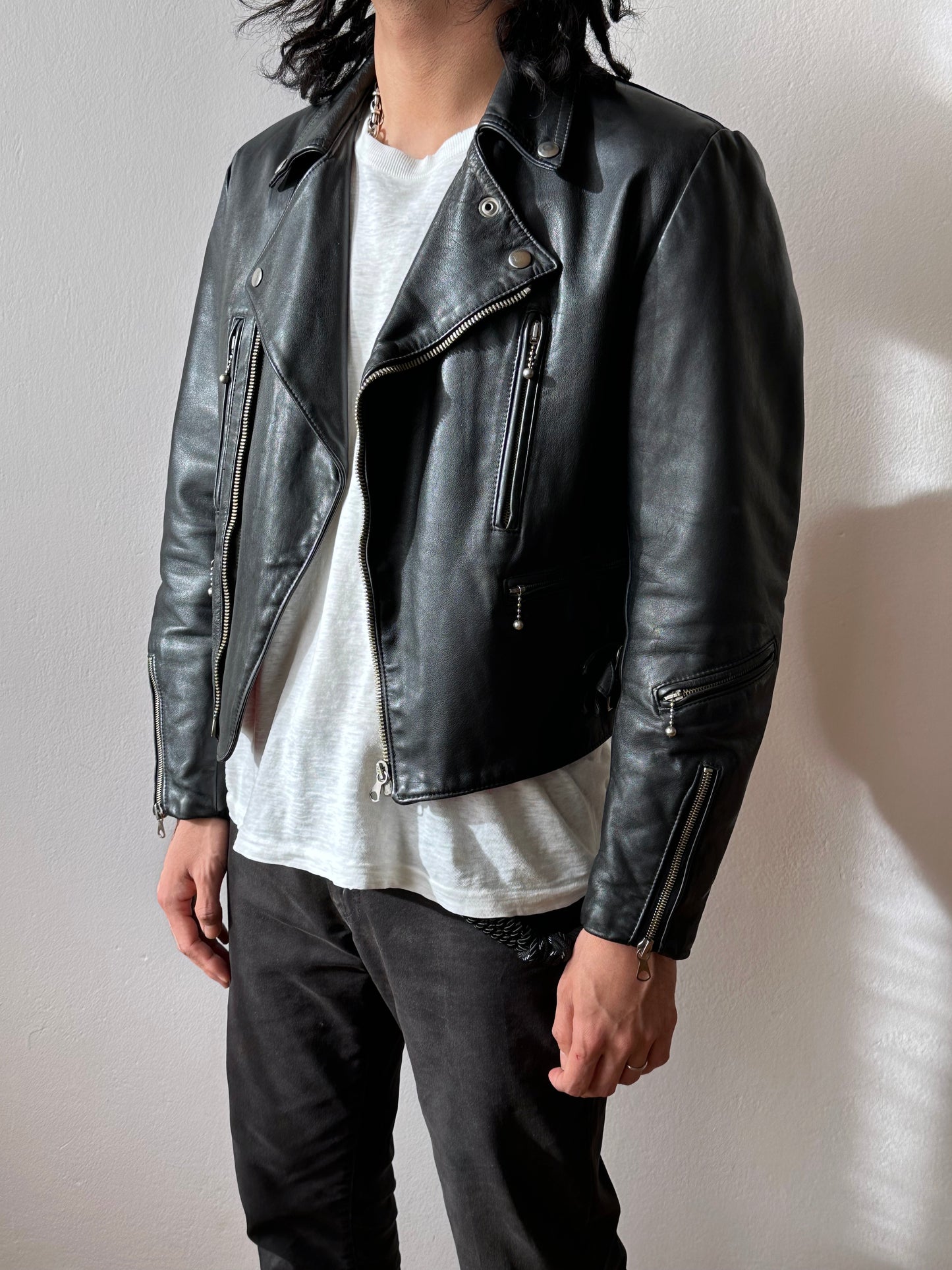 やはり70年代のライダースは革の質もシルエットもずば抜けてかっこいいです、毎度撮影で着用する度に思います。