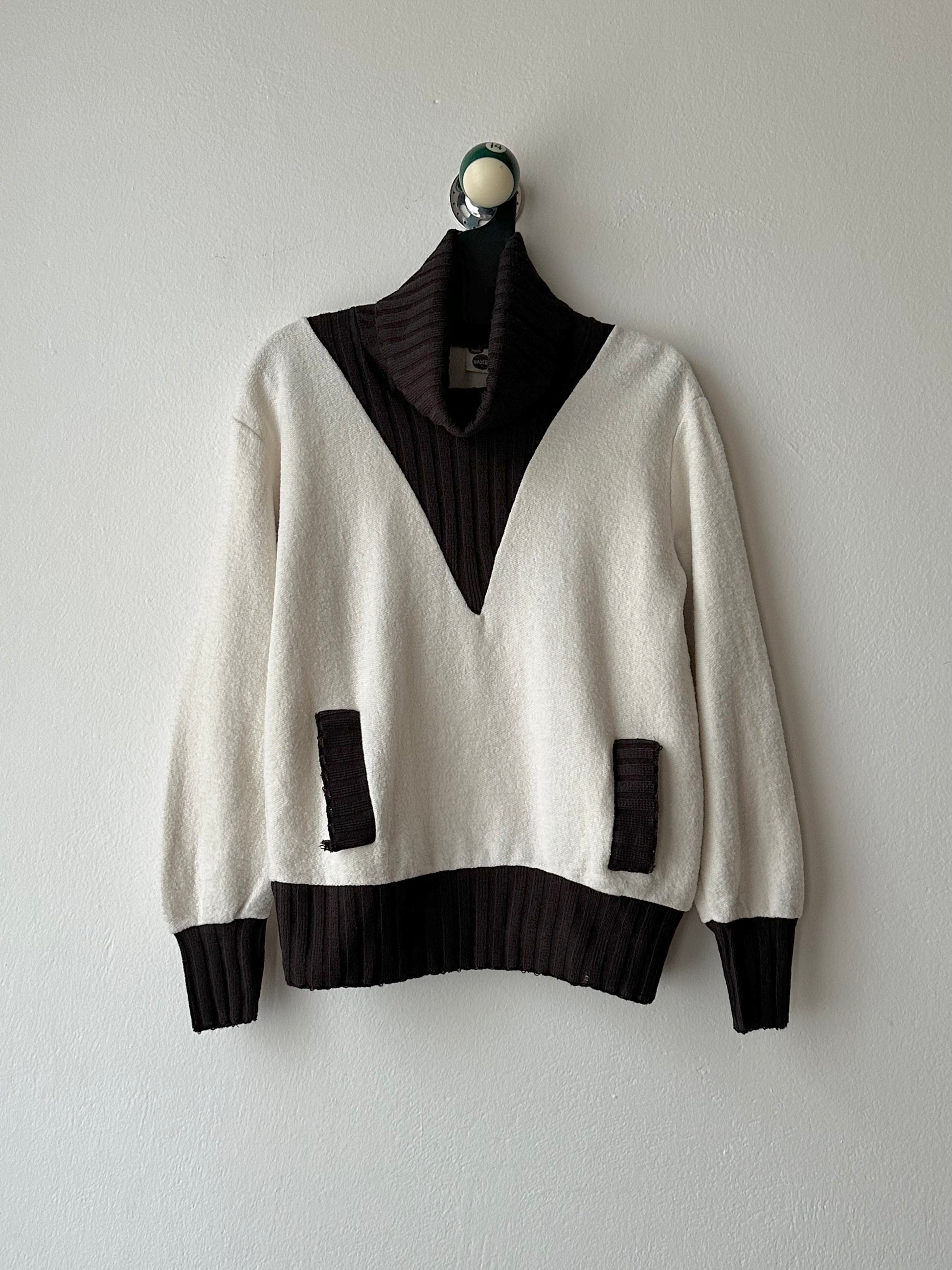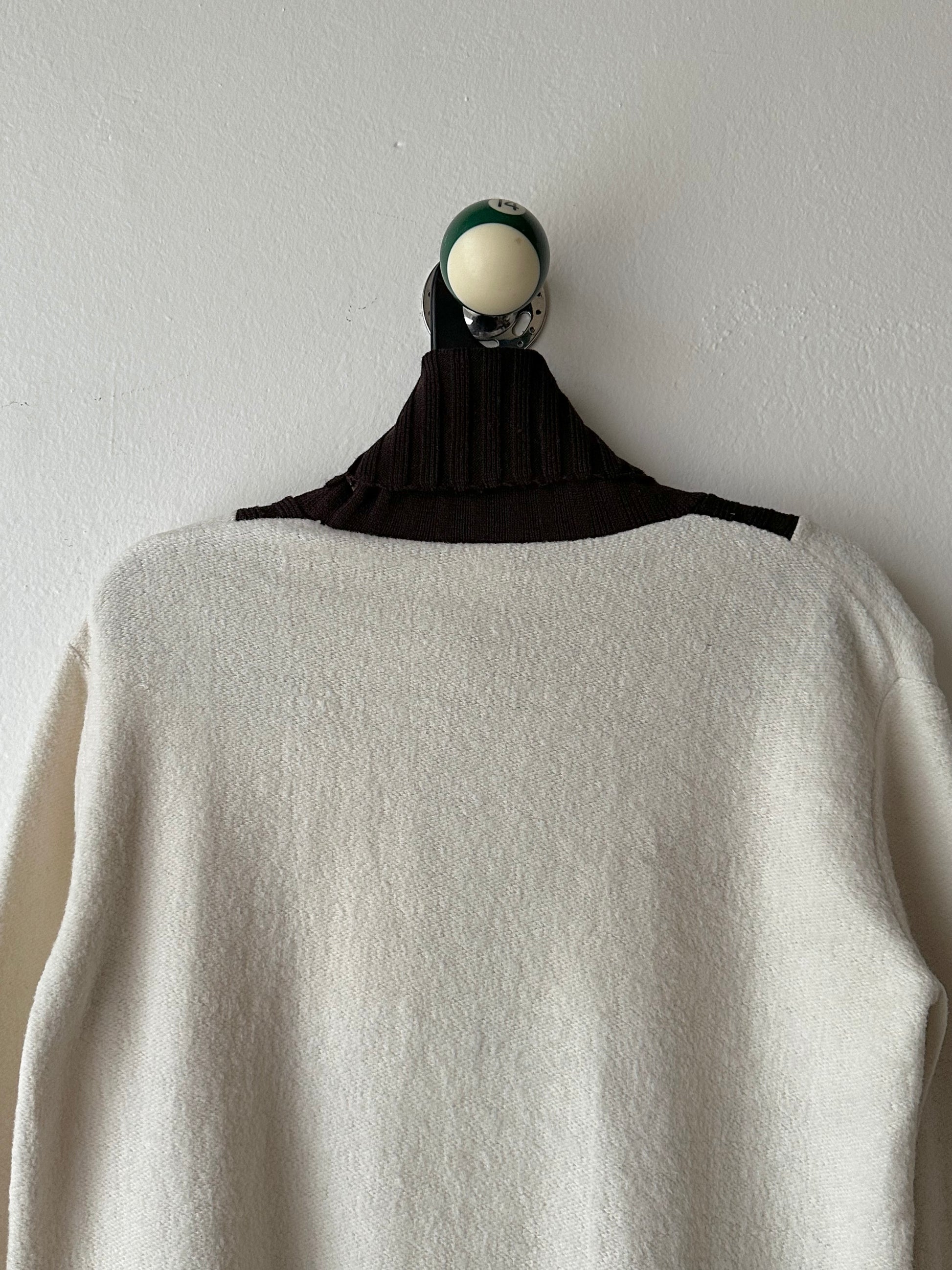 ダークブラウンの襟と袖は柔らかいリブ素材、V字が50-60年代のヴィンテージを彷彿としてまた可愛い。