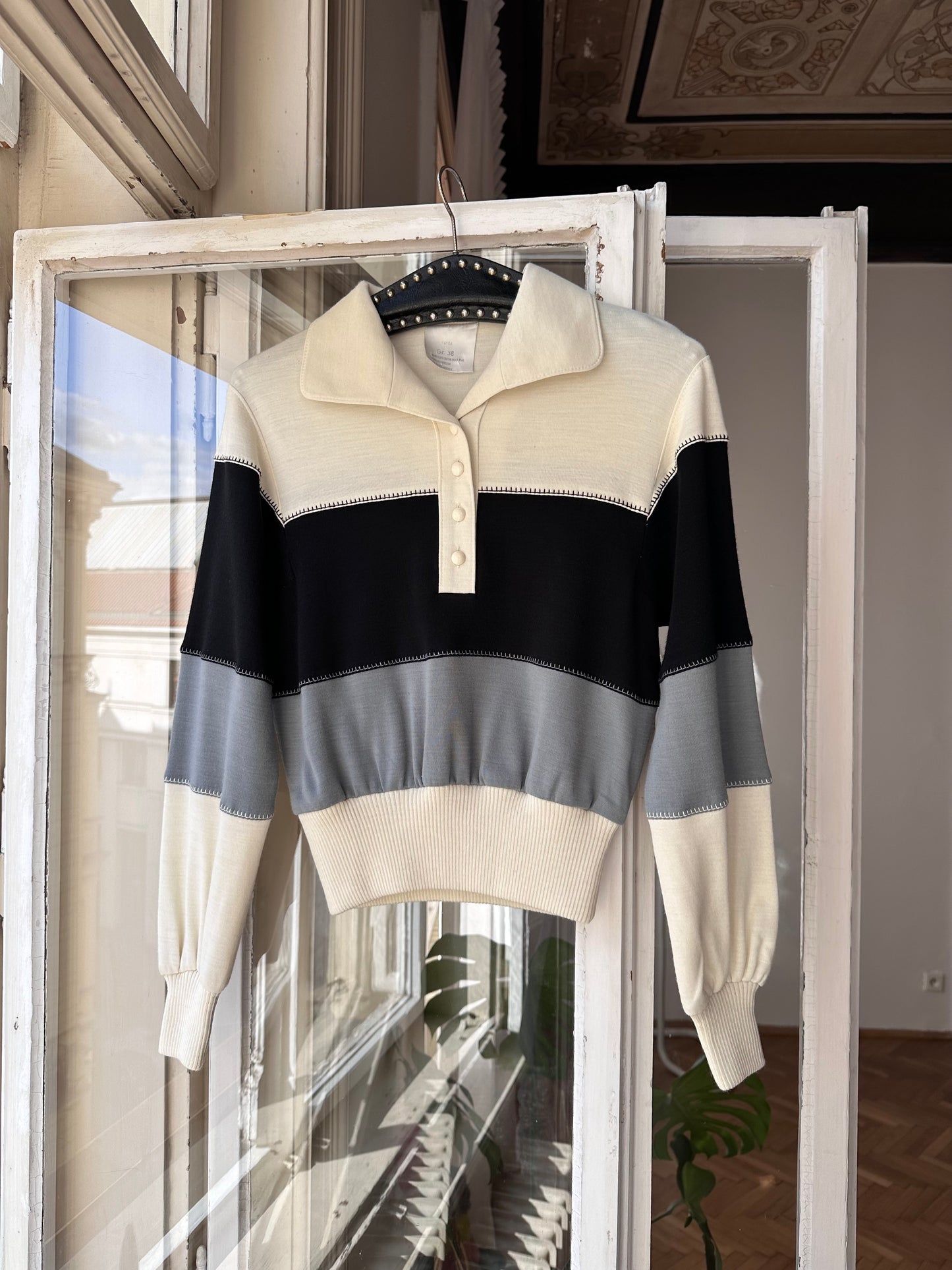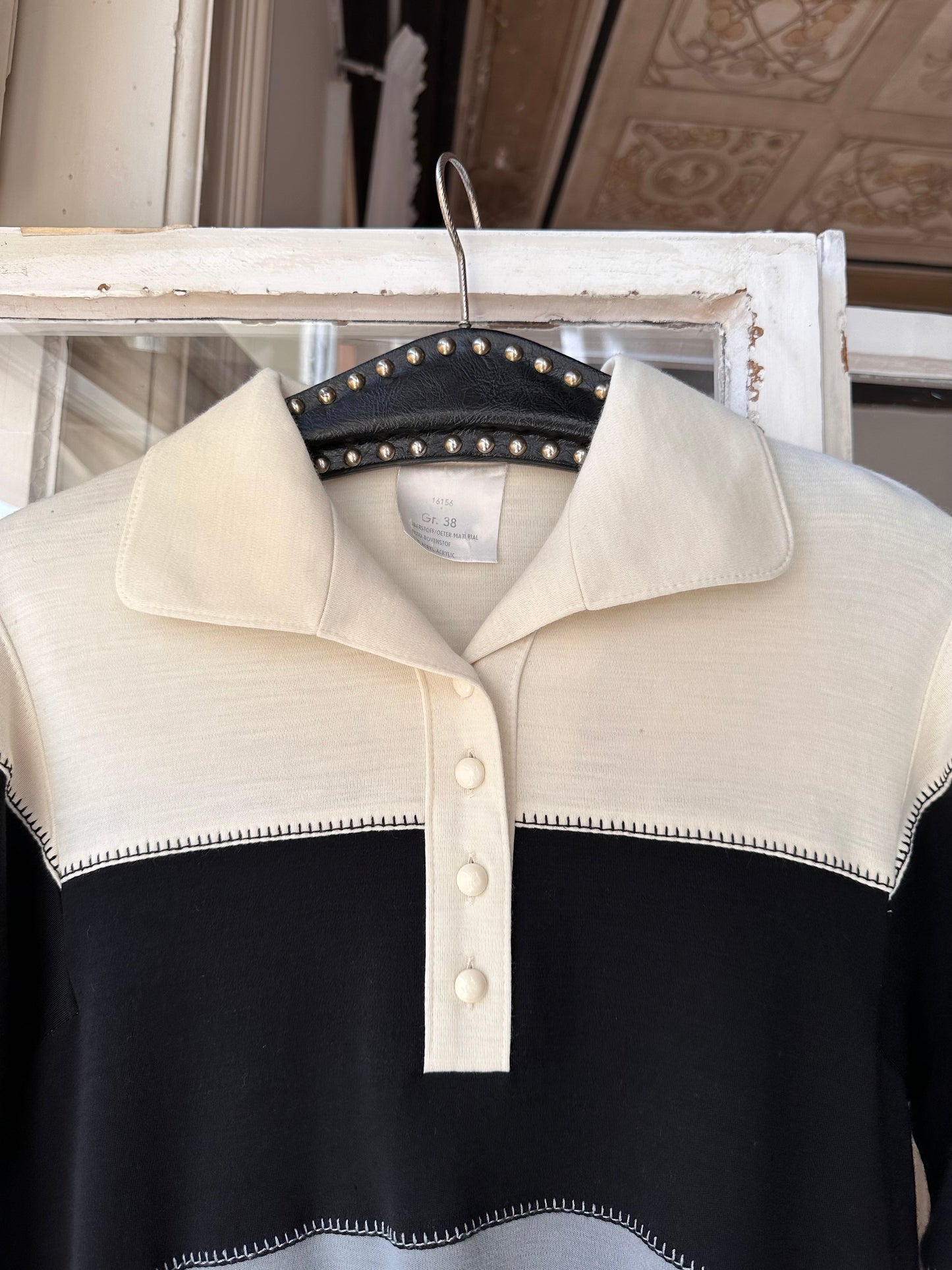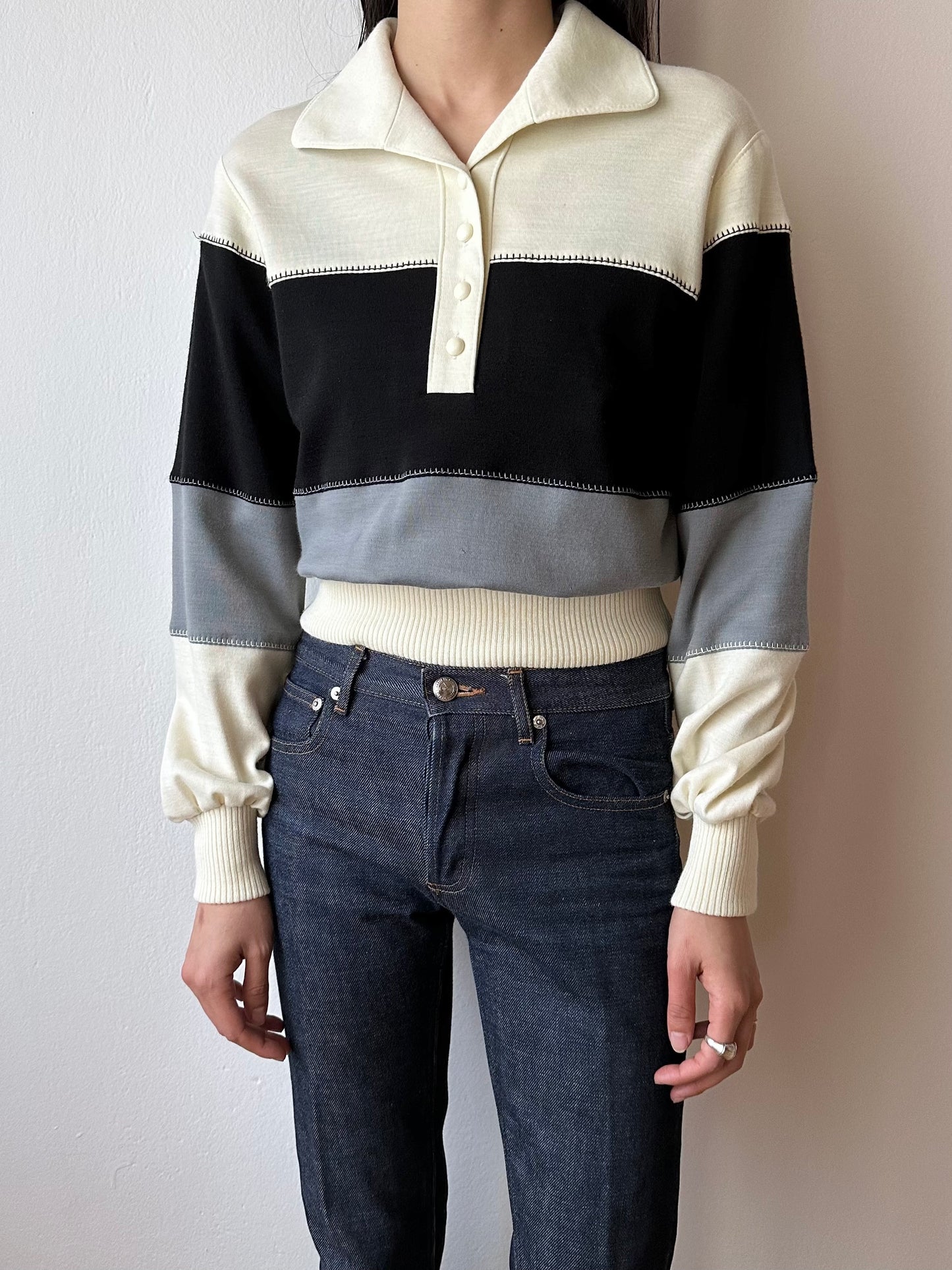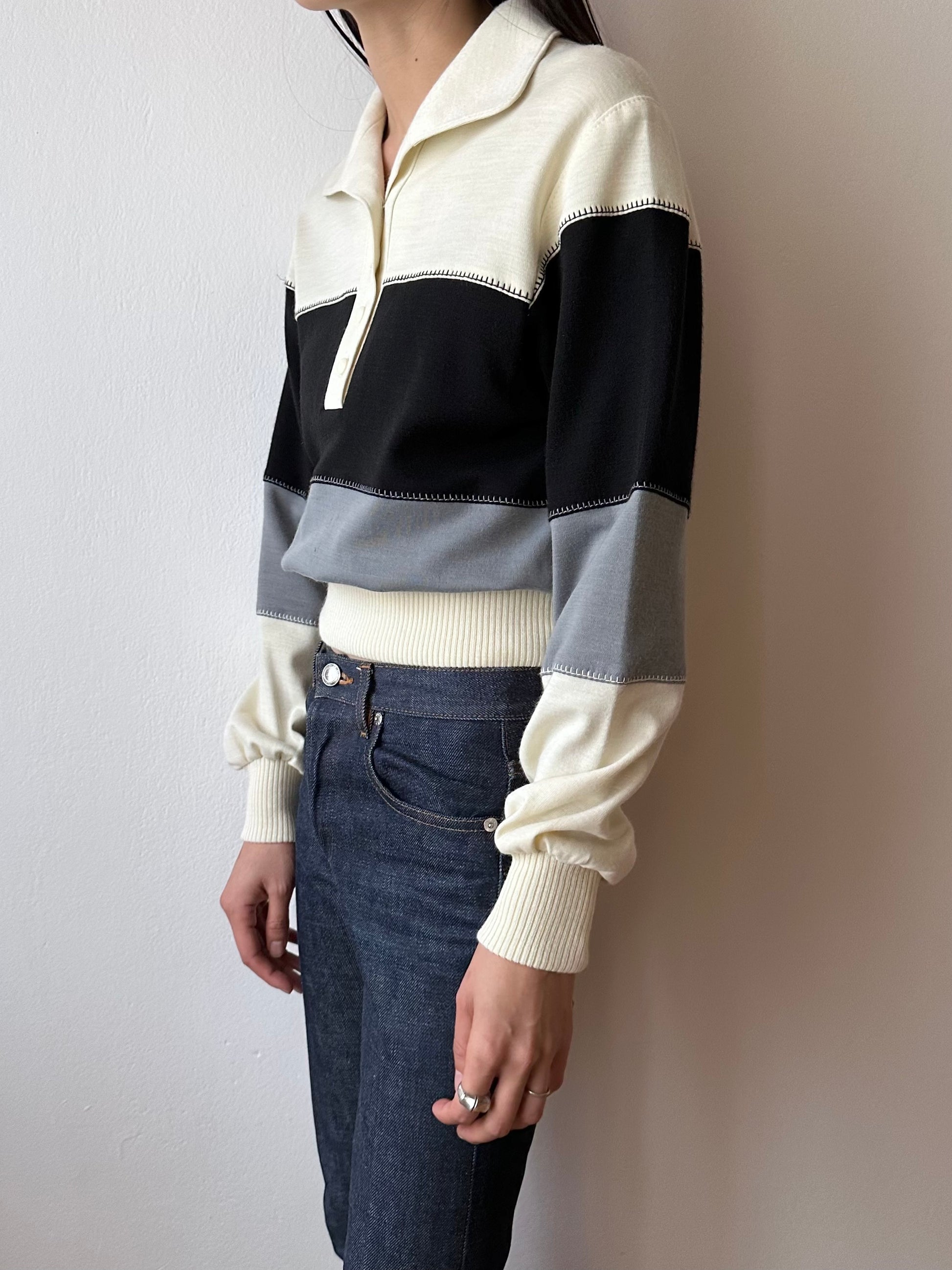 見たまんま可愛いです。モノトーンの太いボーダーと、清楚な襟付きプルオーバー。